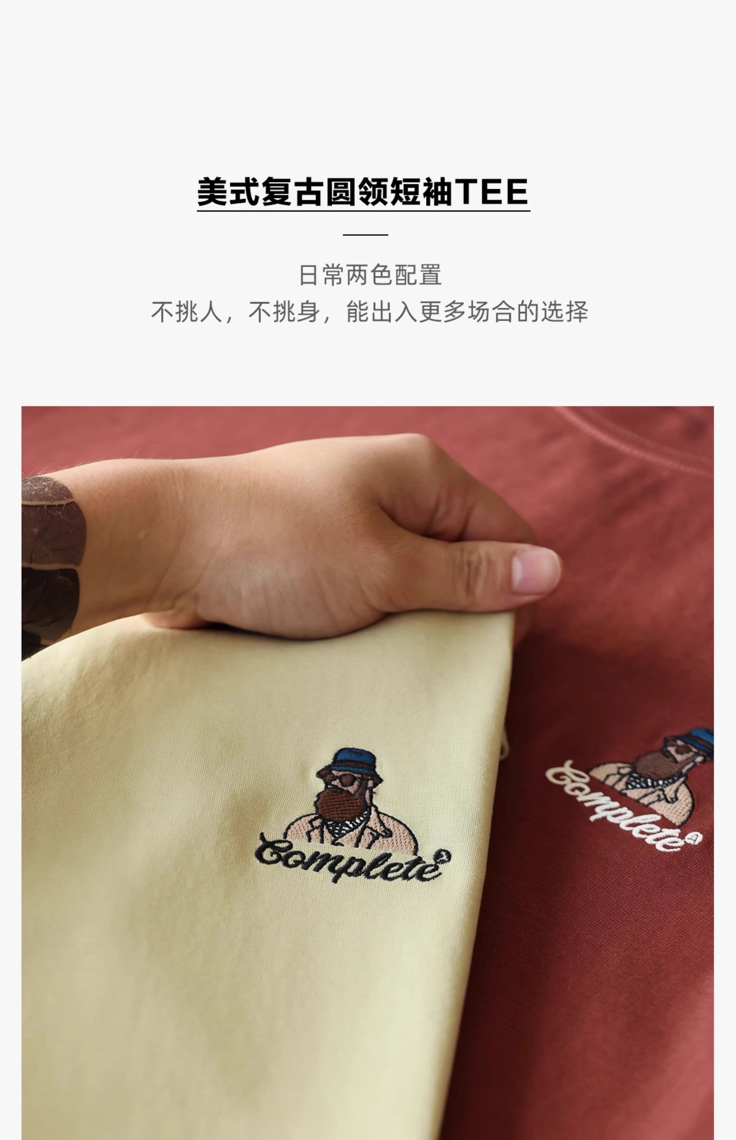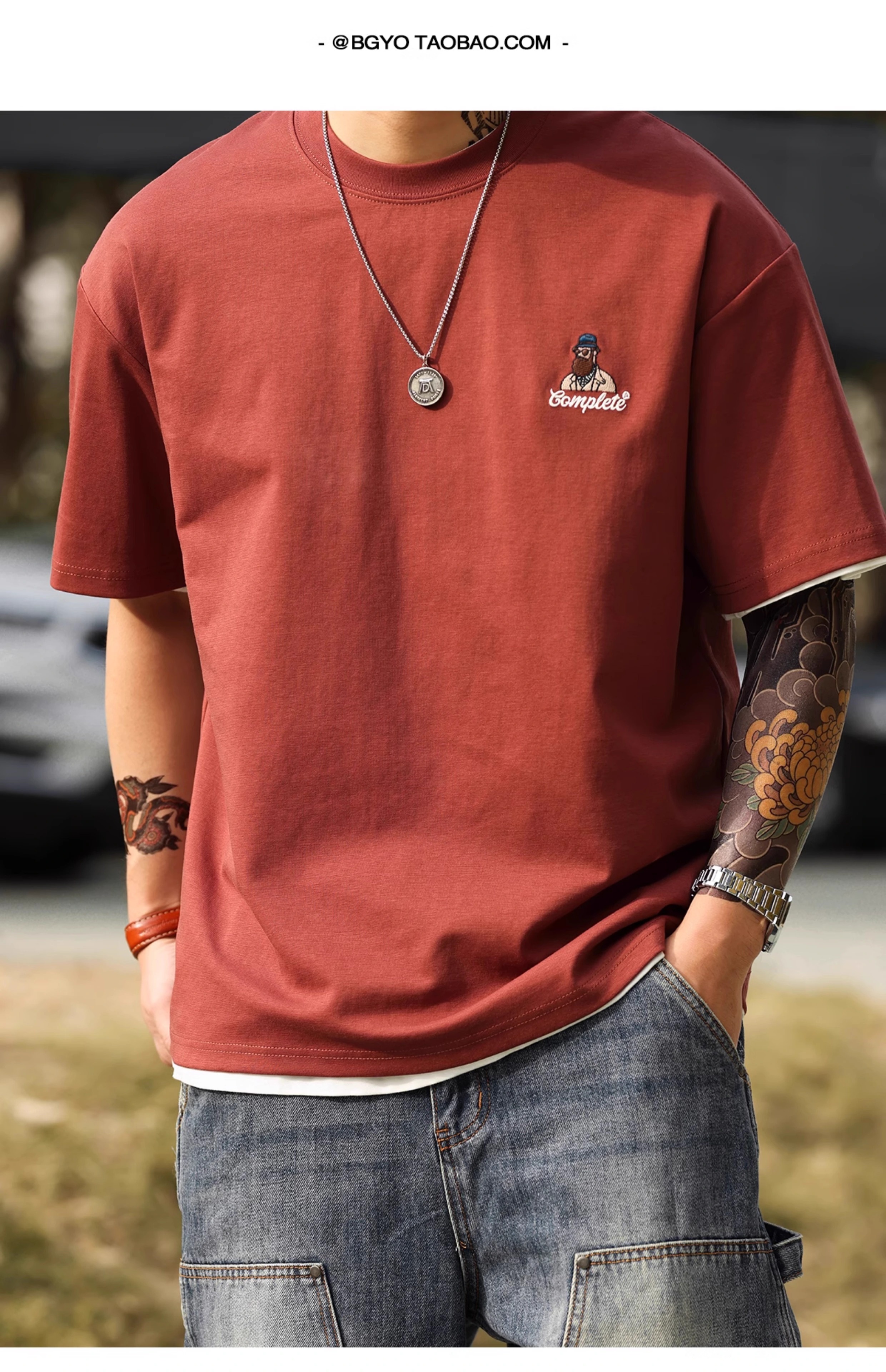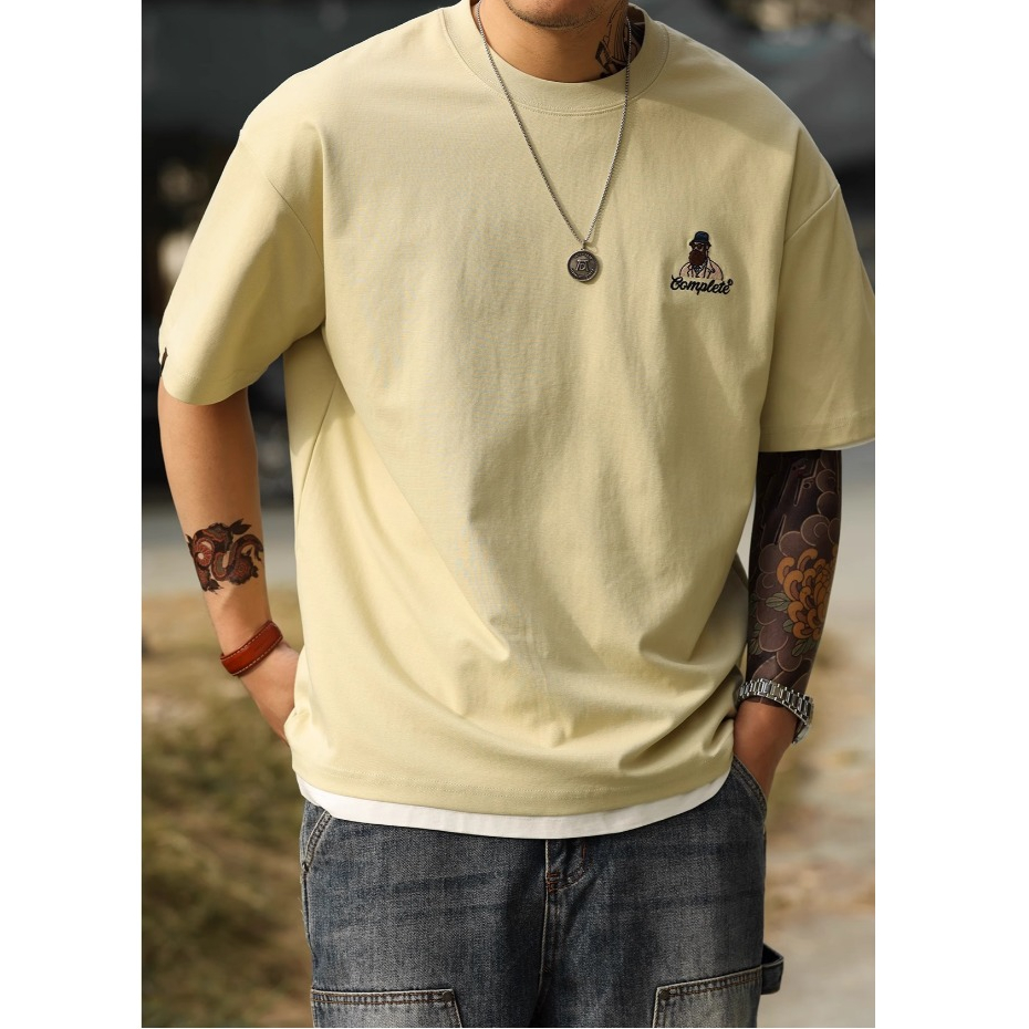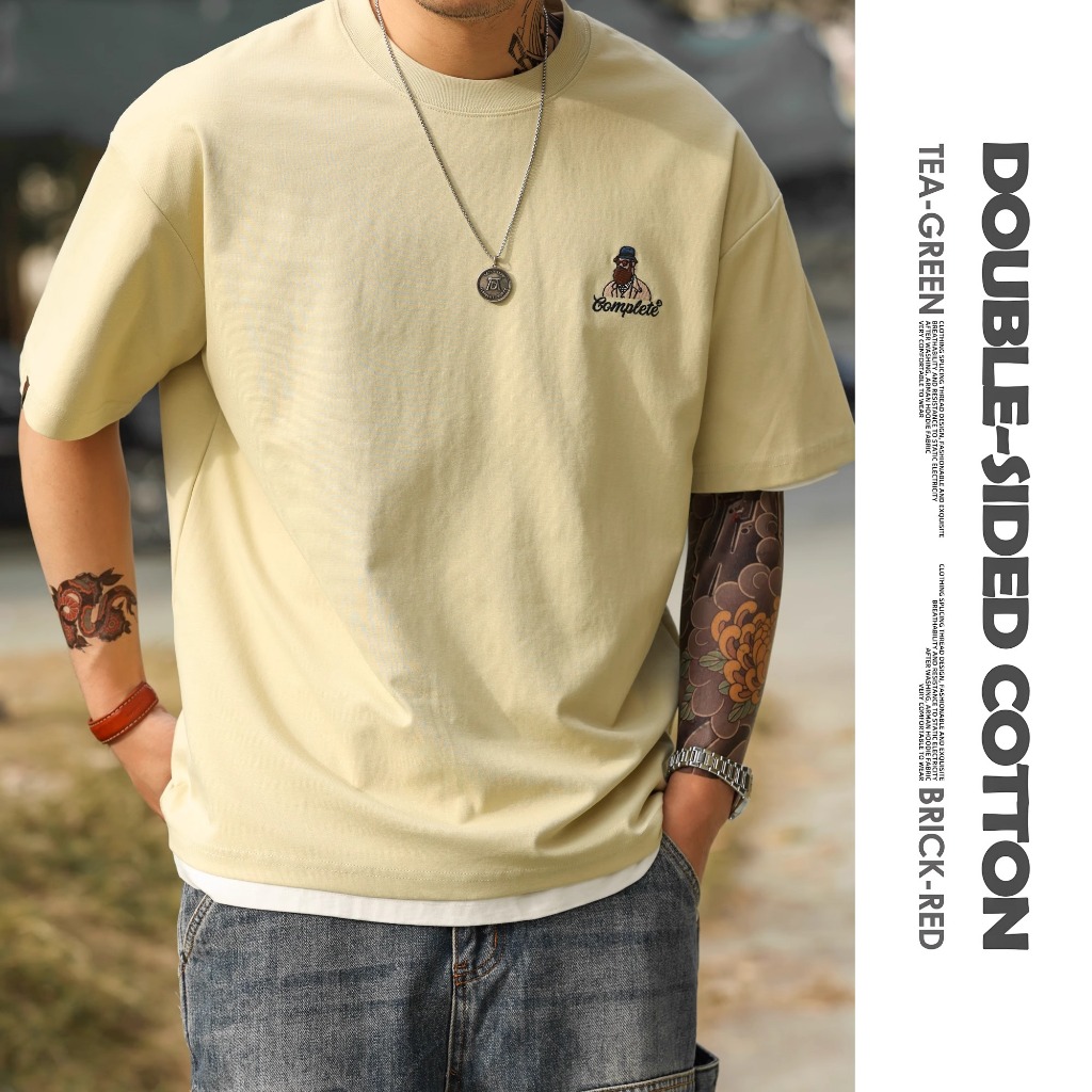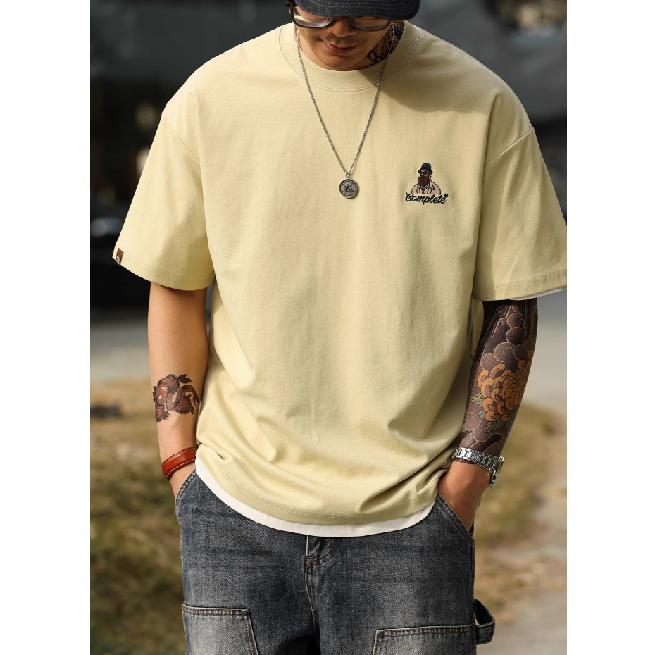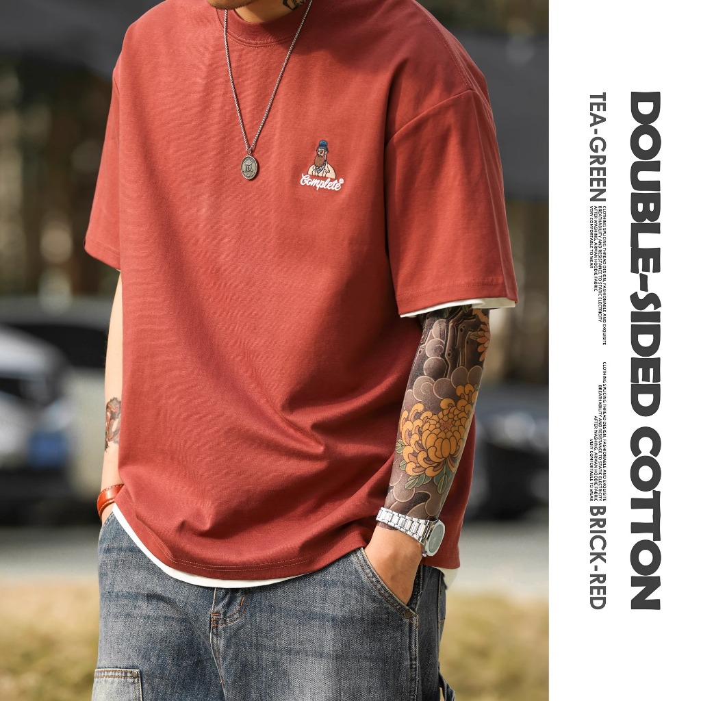 American Casual Fun Embroidered Short-Sleeved T-Shirt Men 210g Double-Sided Cotton Encore Red Bottoming Shirt