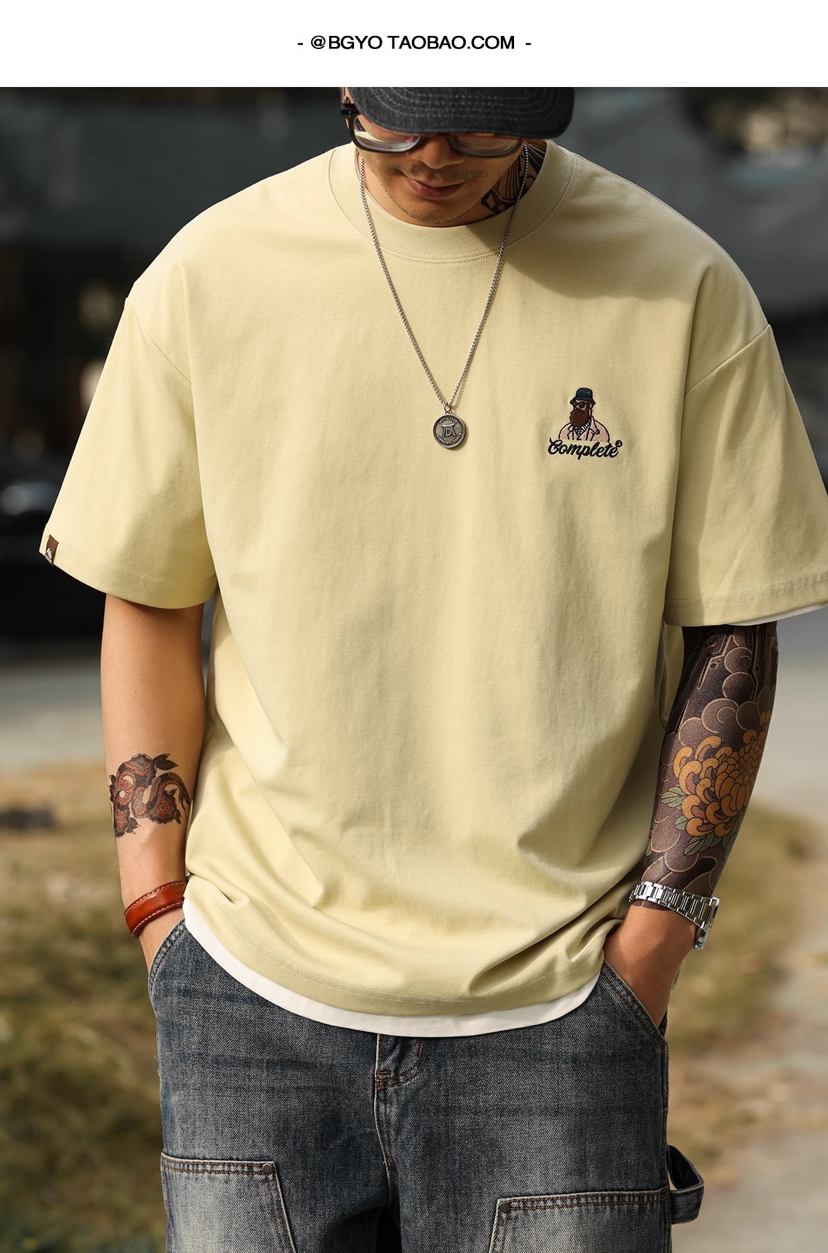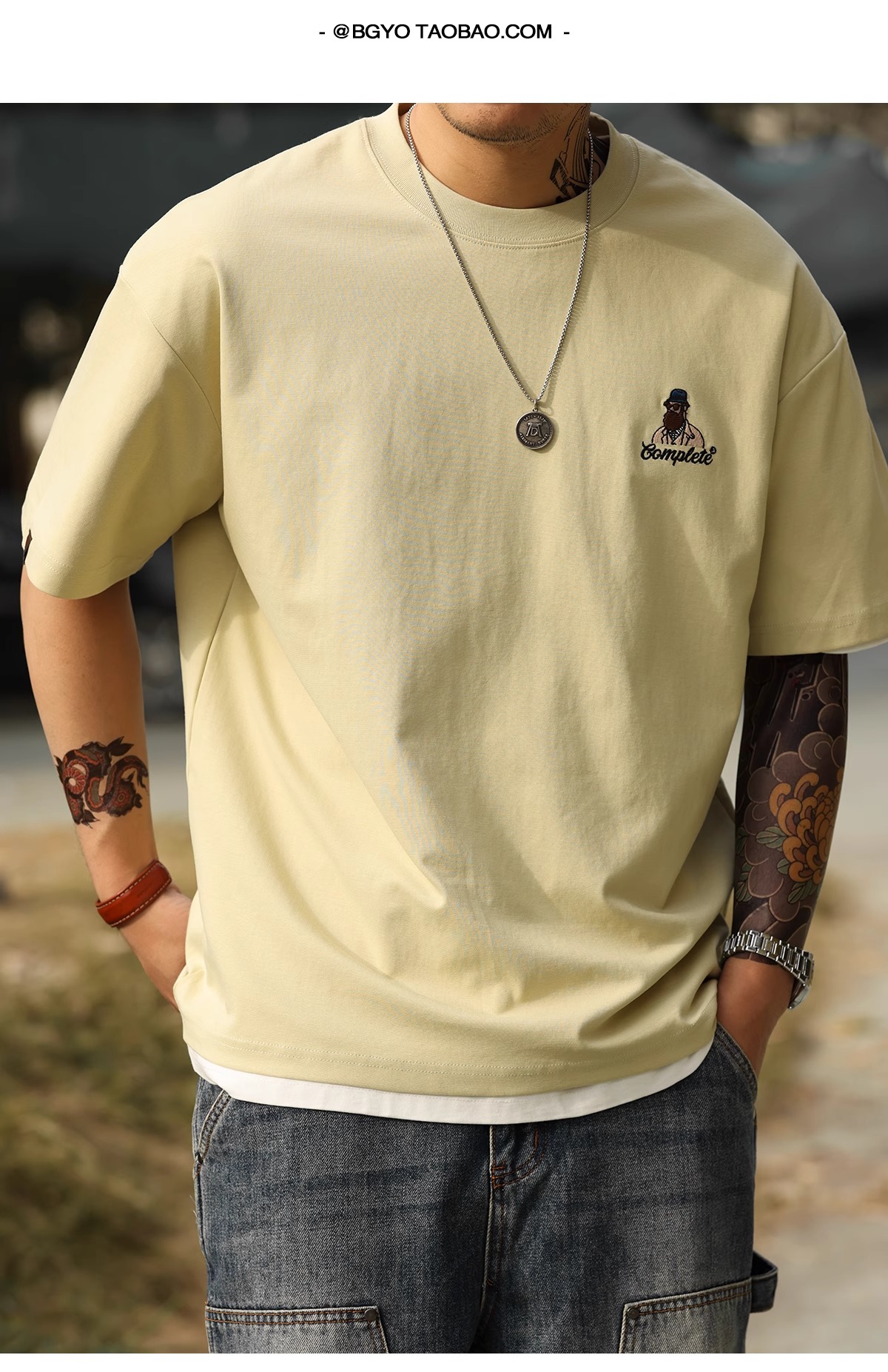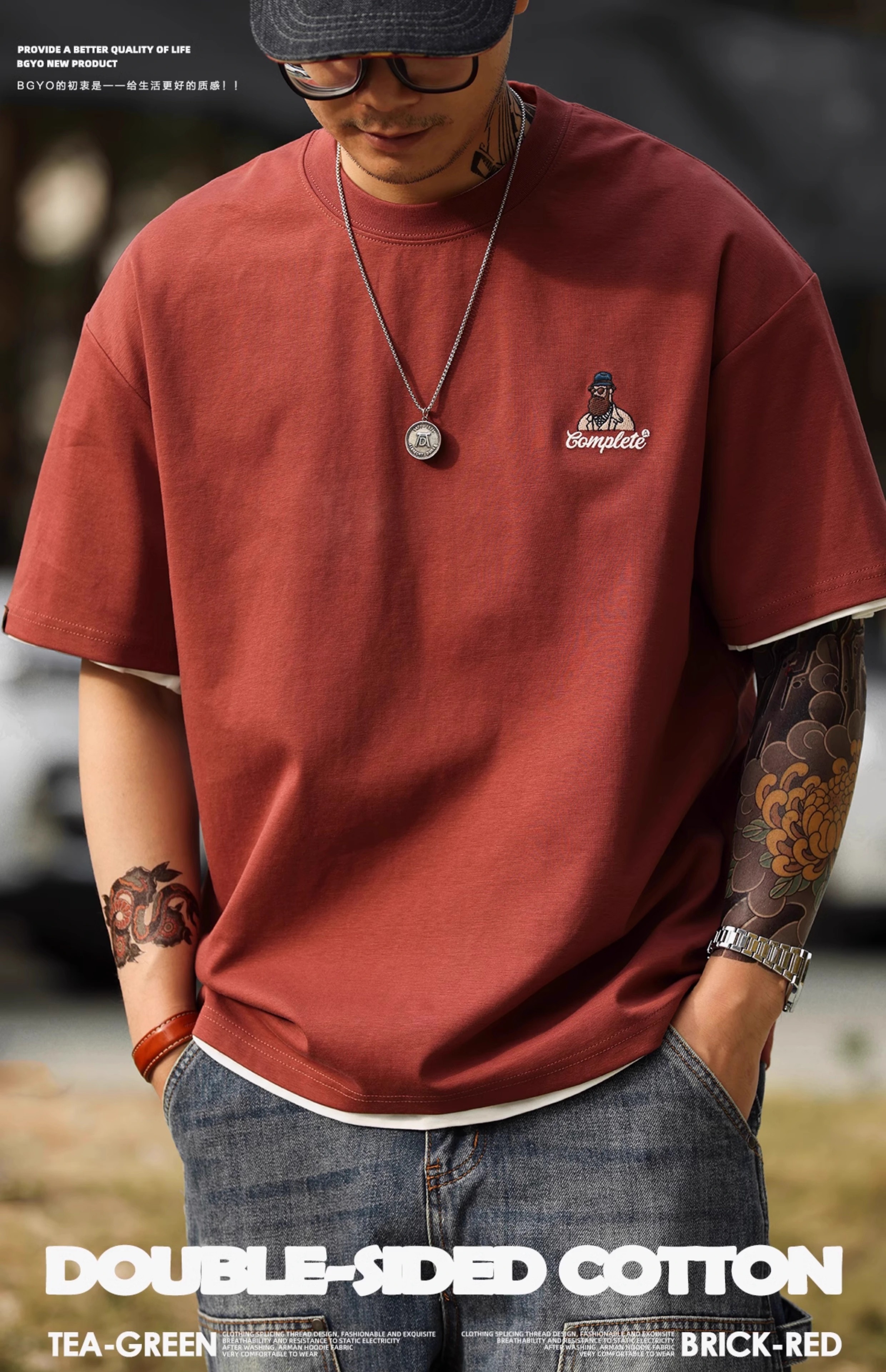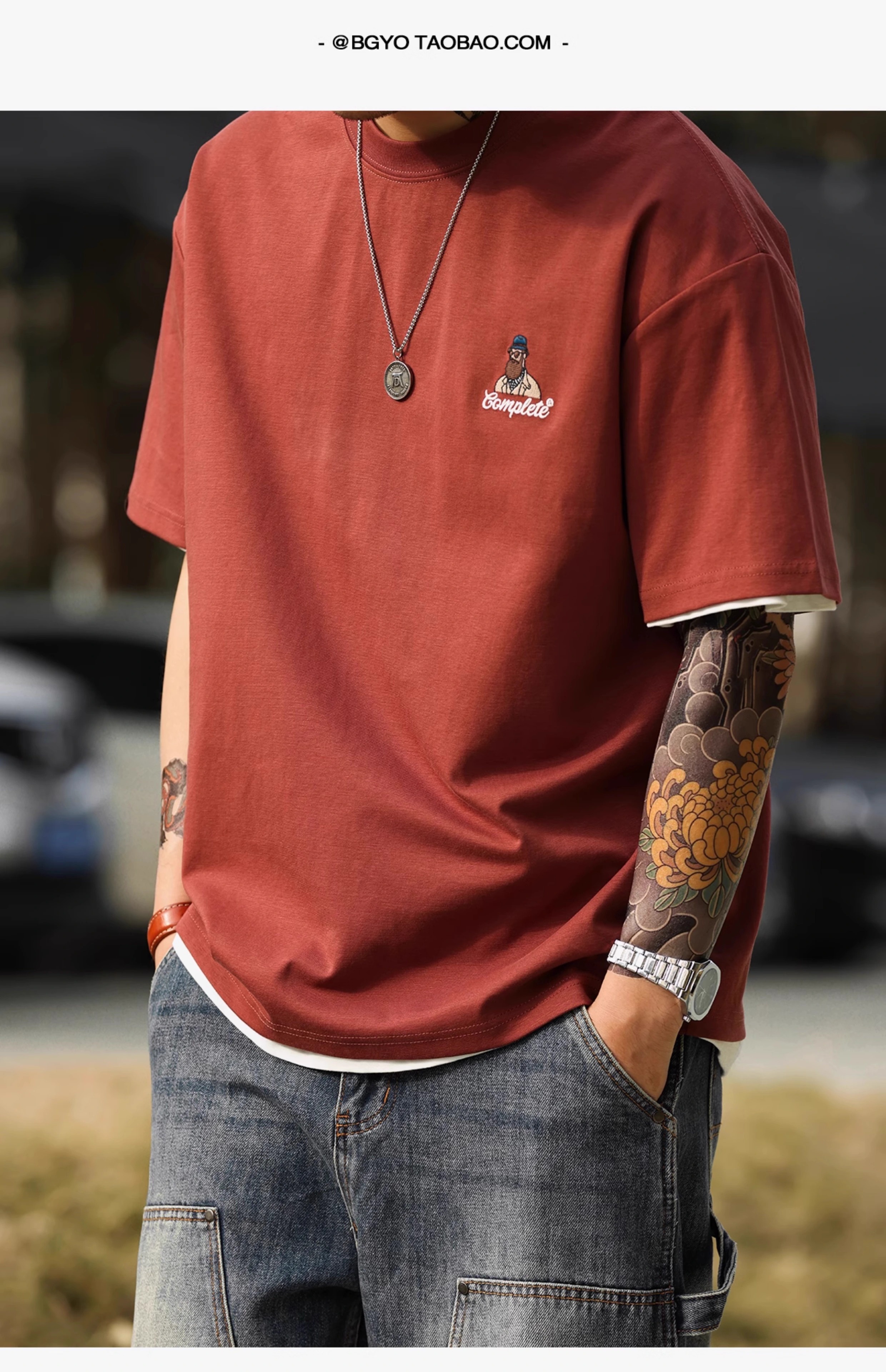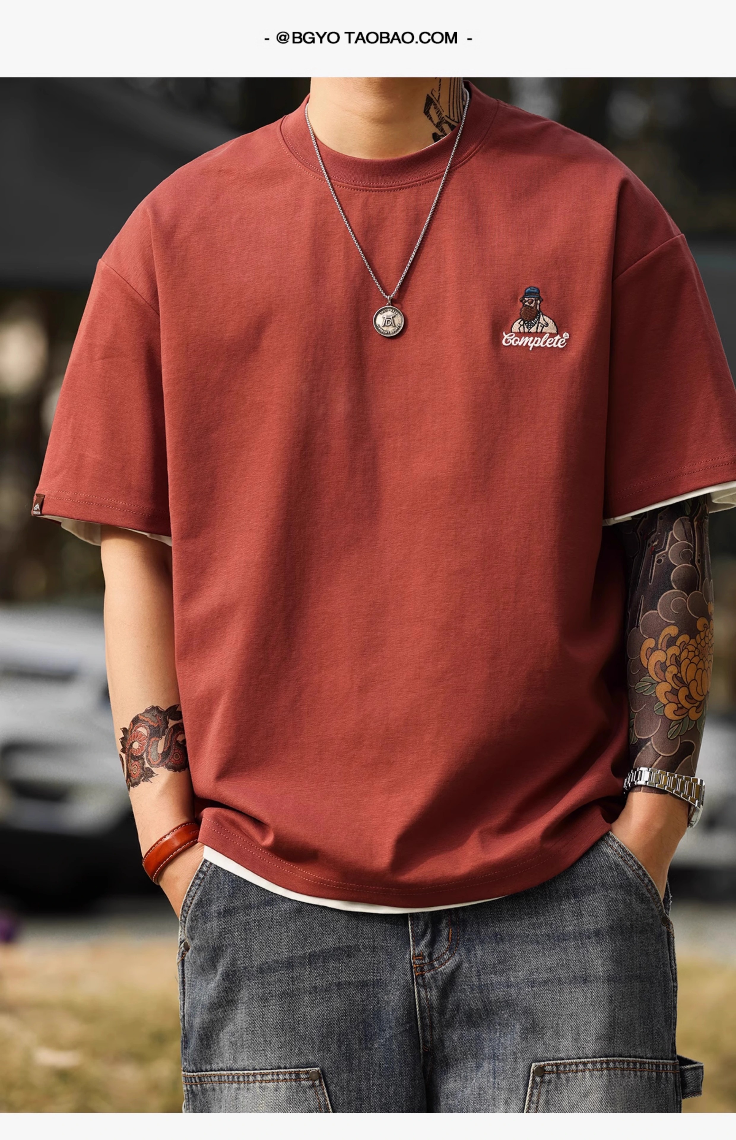 American Casual Fun Embroidered Short-Sleeved T-Shirt Men 210g Double-Sided Cotton Encore Red Bottoming Shirt