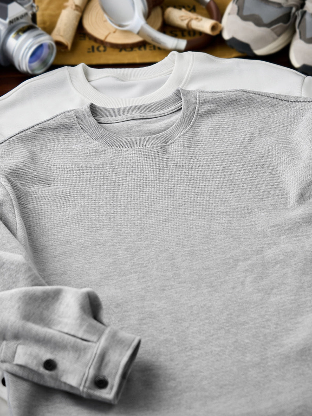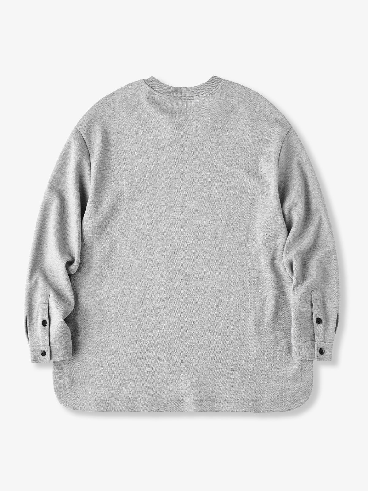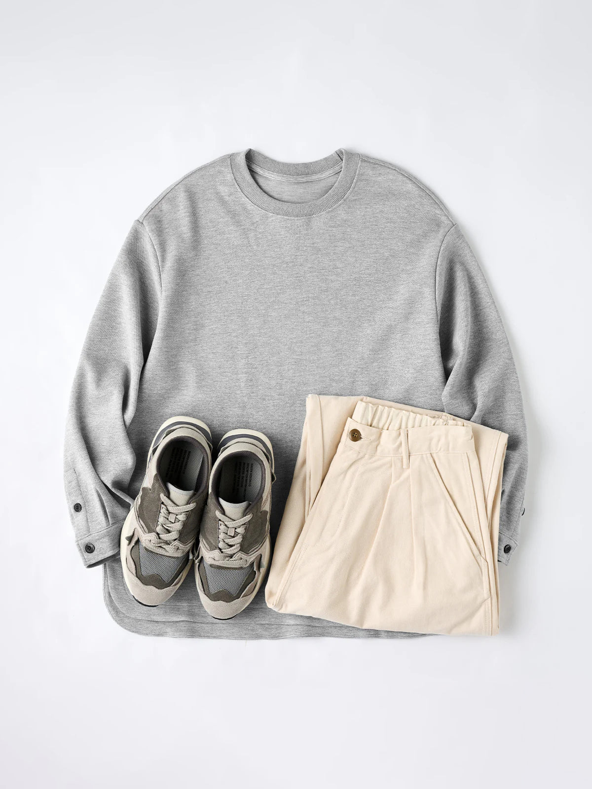 The crew neck is simple and easy to style, ensuring it doesn’t interfere with the overall design. The drop-shoulder design creates a relaxed silhouette with extra room around the shoulders, incorporating a modern trend. Two buttons are placed on the cuffs, functioning not only as a practical feature to secure rolled-up sleeves but also as a design accent. The hem draws a curved line, and the distinctive hemline design is crafted with ease of movement and comfort in mind.