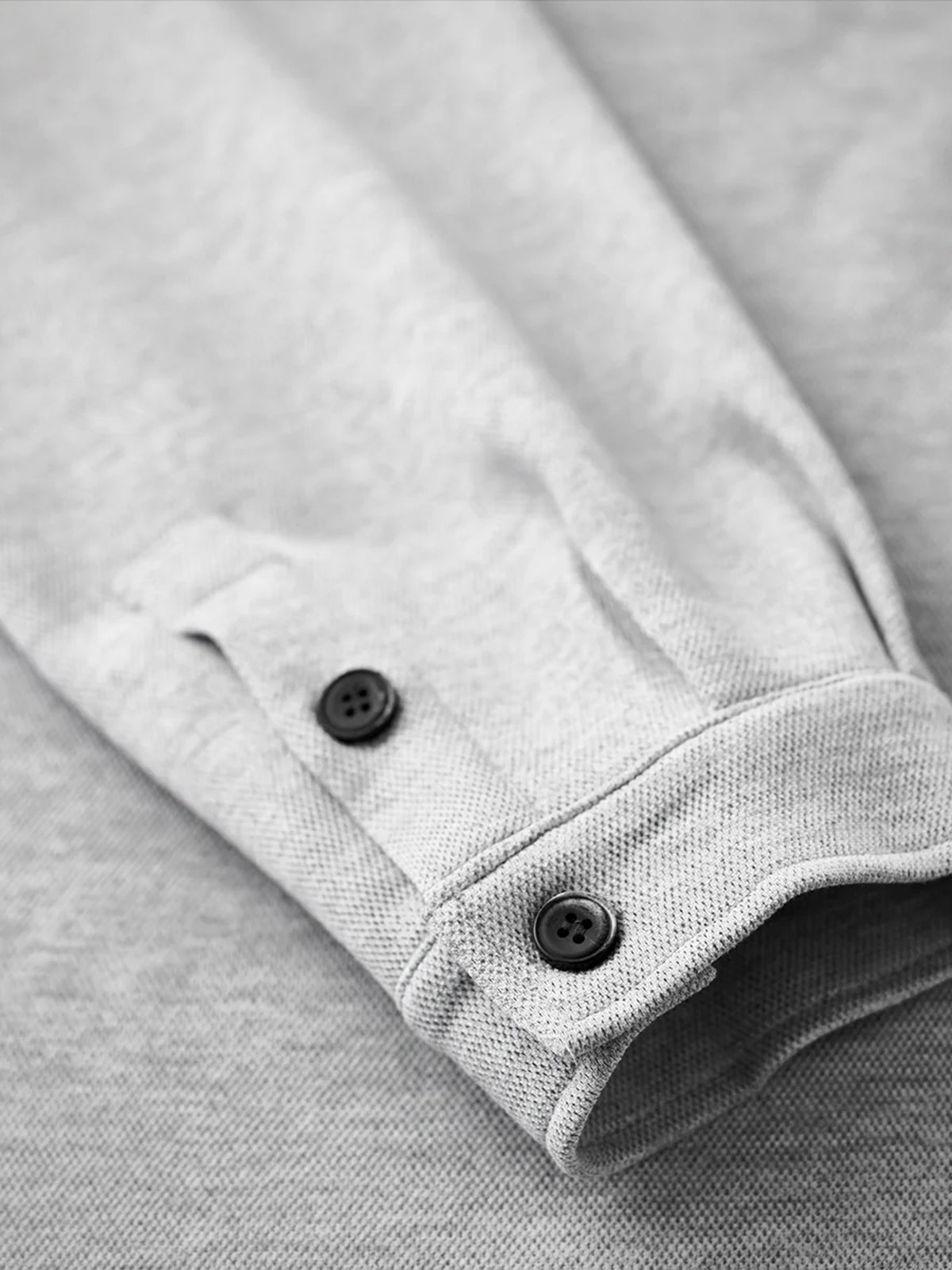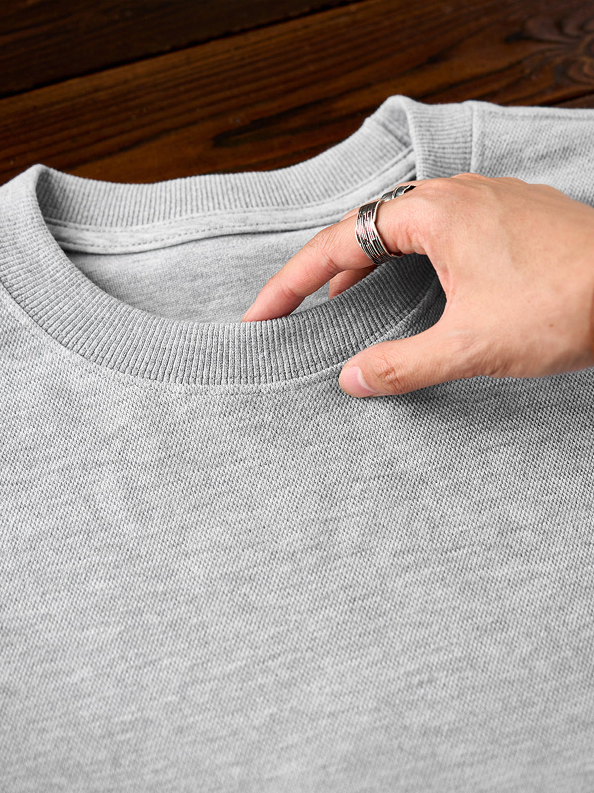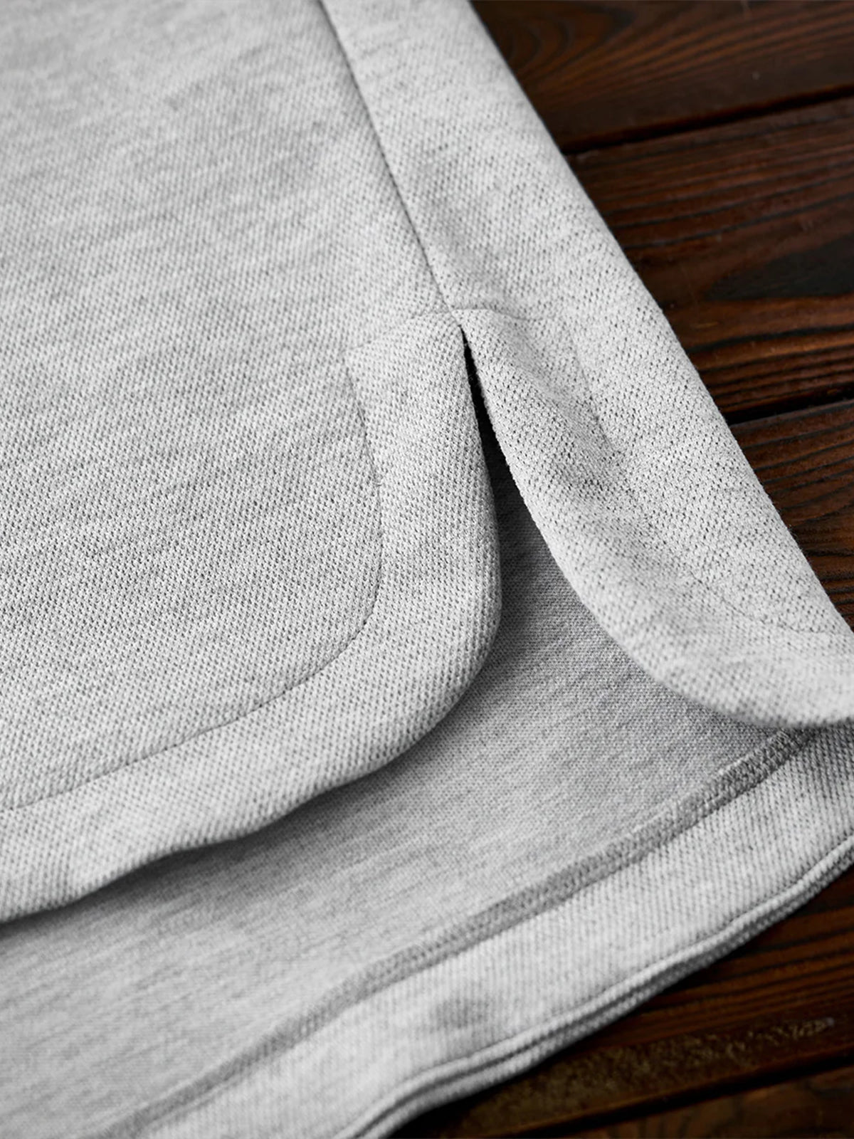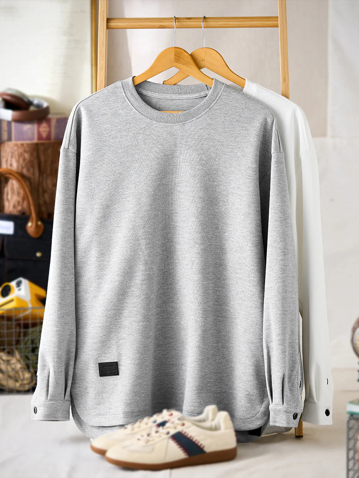 The crew neck is simple and easy to style, ensuring it doesn’t interfere with the overall design. The drop-shoulder design creates a relaxed silhouette with extra room around the shoulders, incorporating a modern trend. Two buttons are placed on the cuffs, functioning not only as a practical feature to secure rolled-up sleeves but also as a design accent. The hem draws a curved line, and the distinctive hemline design is crafted with ease of movement and comfort in mind.