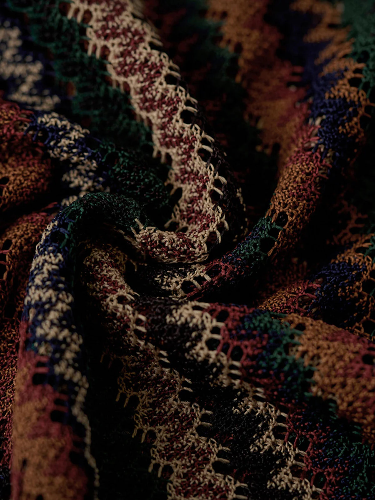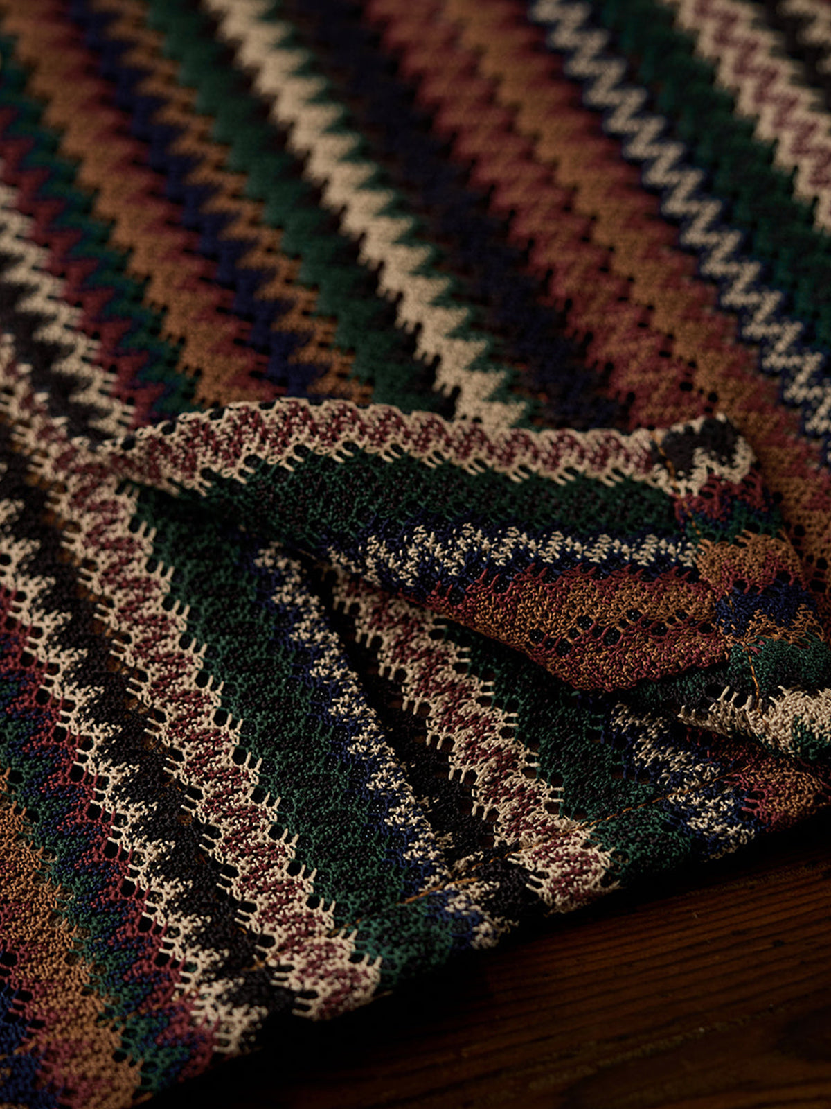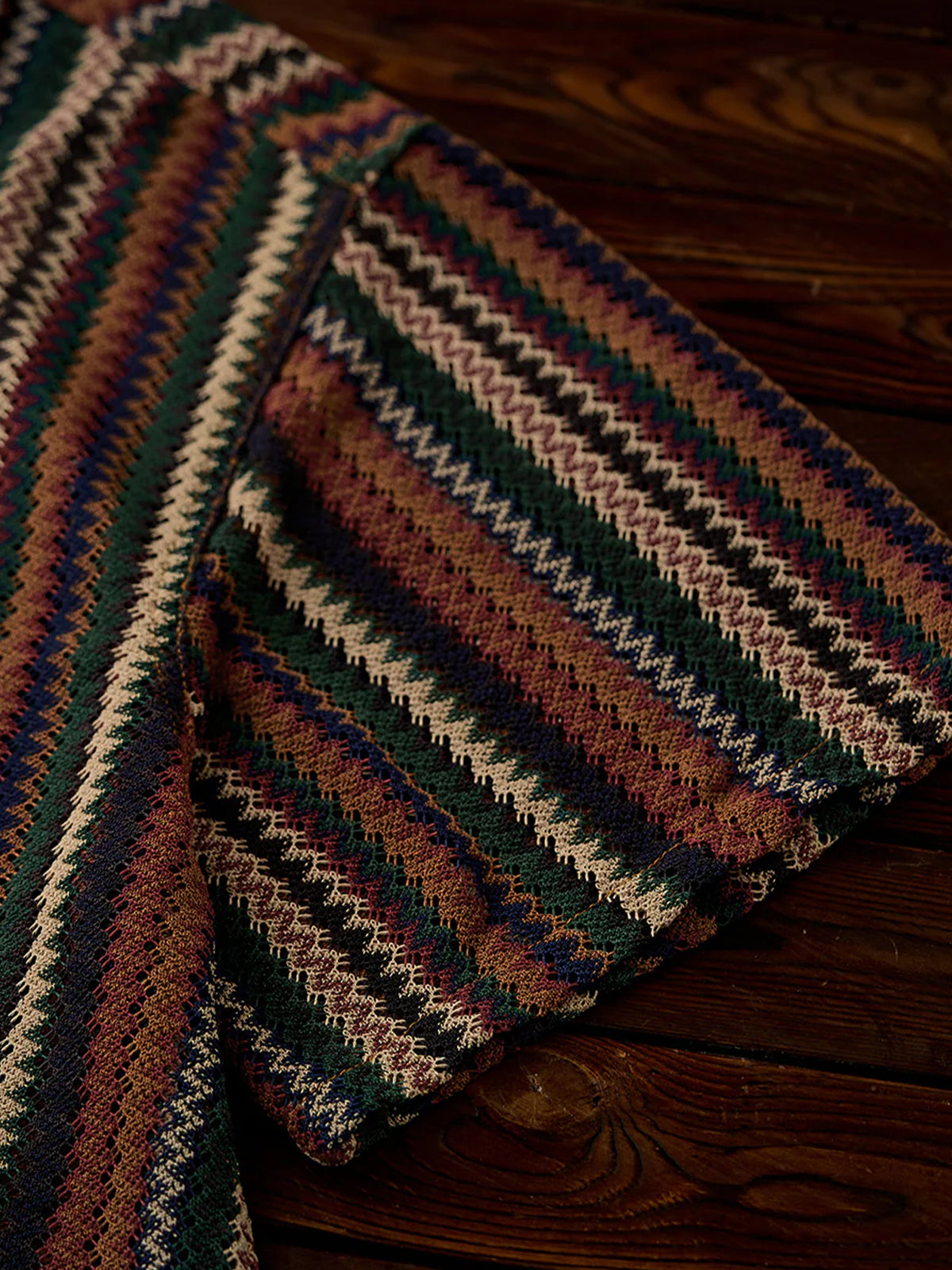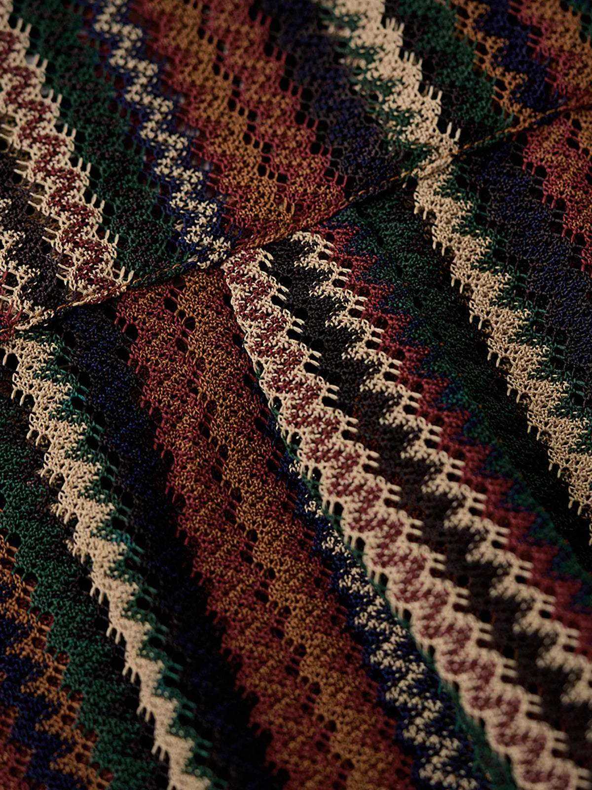 The shirt features an all-over zigzag stripe pattern in earthy tones such as reddish-brown, deep green, cream, and black. This vintage-inspired color palette adds a classical yet modern impression. The fabric has a fine knit texture with a three-dimensional feel and slight transparency, allowing for versatile styling depending on your inner layer.