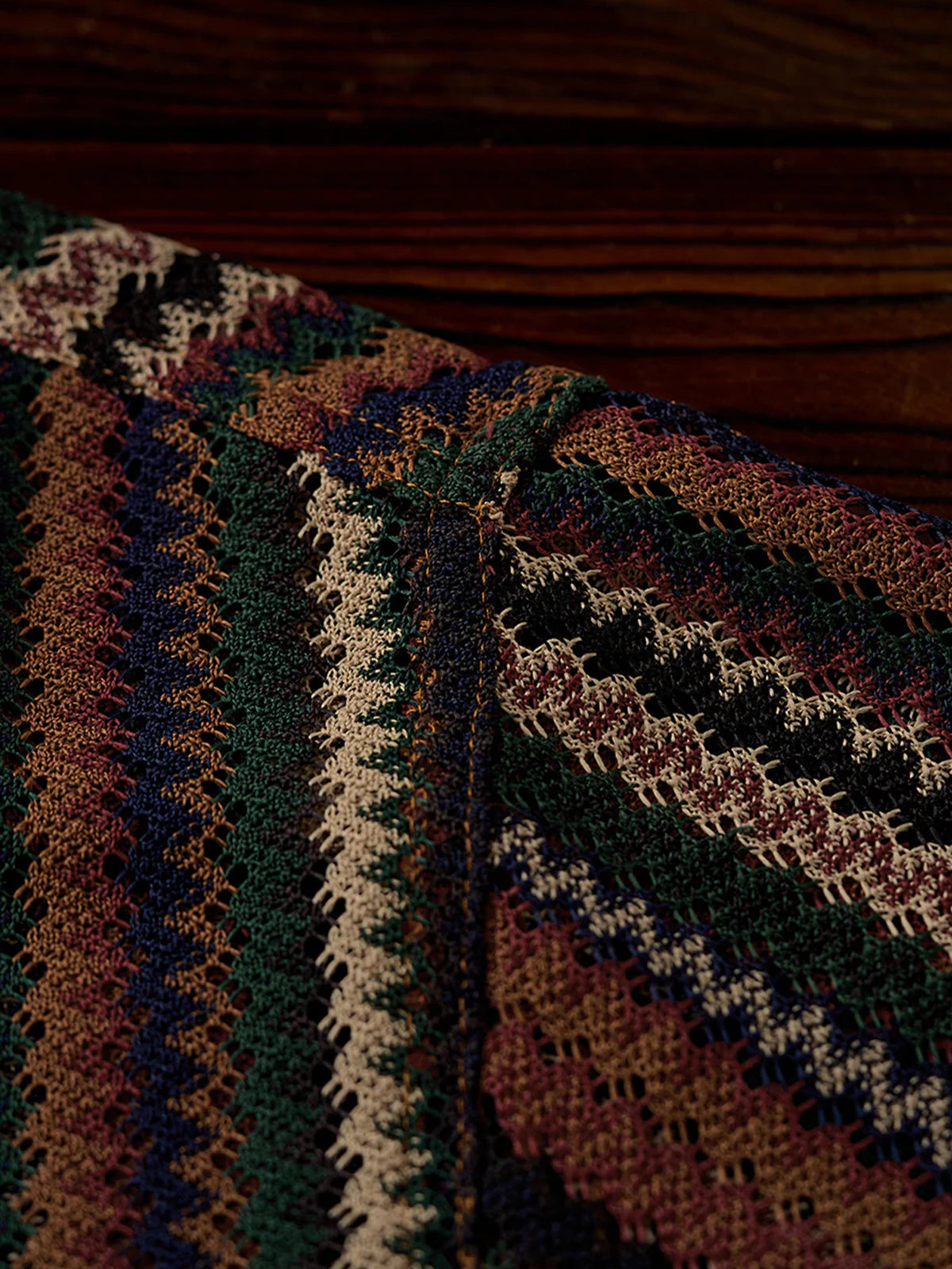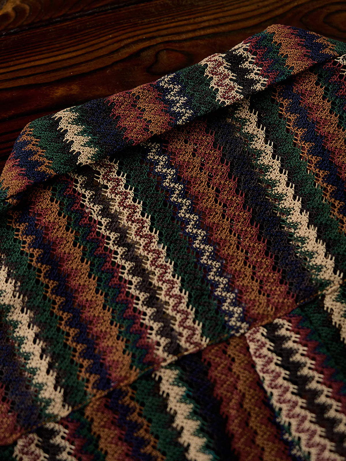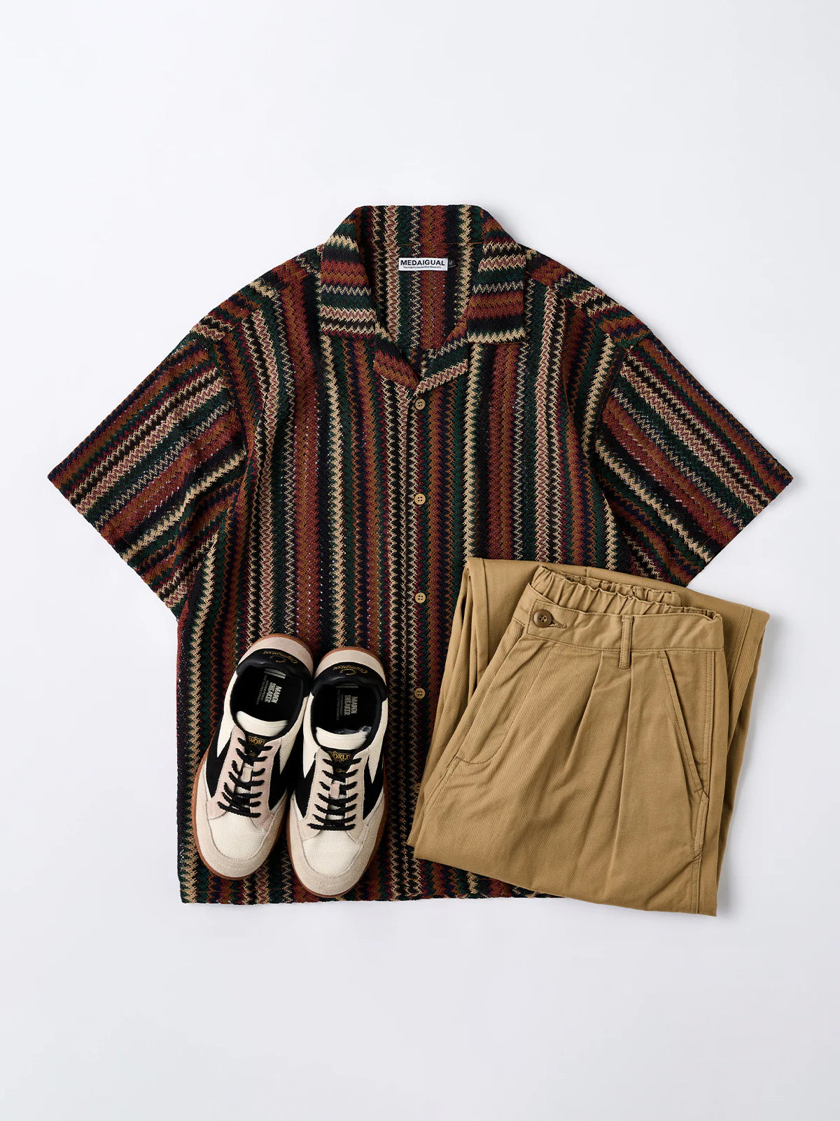 Inspired by the traditional style of Cuban shirts, this updated version features modern colors and patterns. The combination of zigzag stripes and openwork design creates a unique and eye-catching look. It balances a relaxed vibe with a touch of formality, offering ease of movement and a comfortable fit.