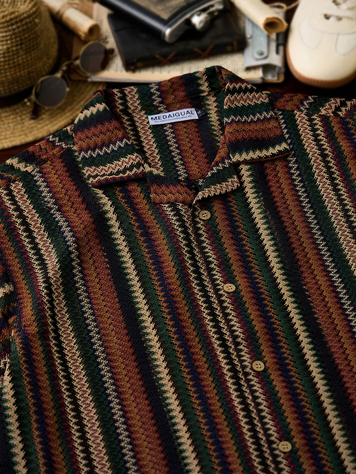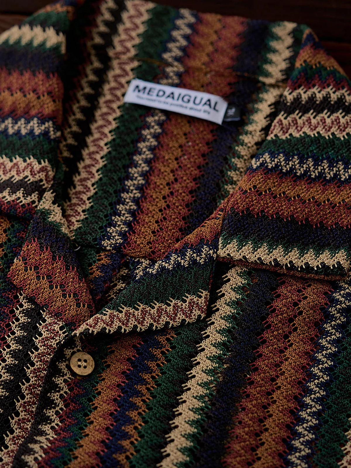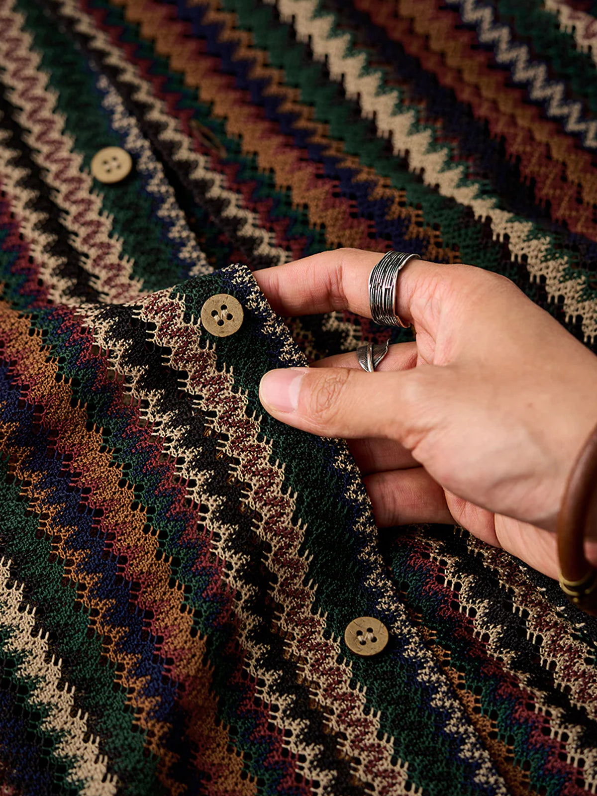 Inspired by the traditional style of Cuban shirts, this updated version features modern colors and patterns. The combination of zigzag stripes and openwork design creates a unique and eye-catching look. It balances a relaxed vibe with a touch of formality, offering ease of movement and a comfortable fit.
