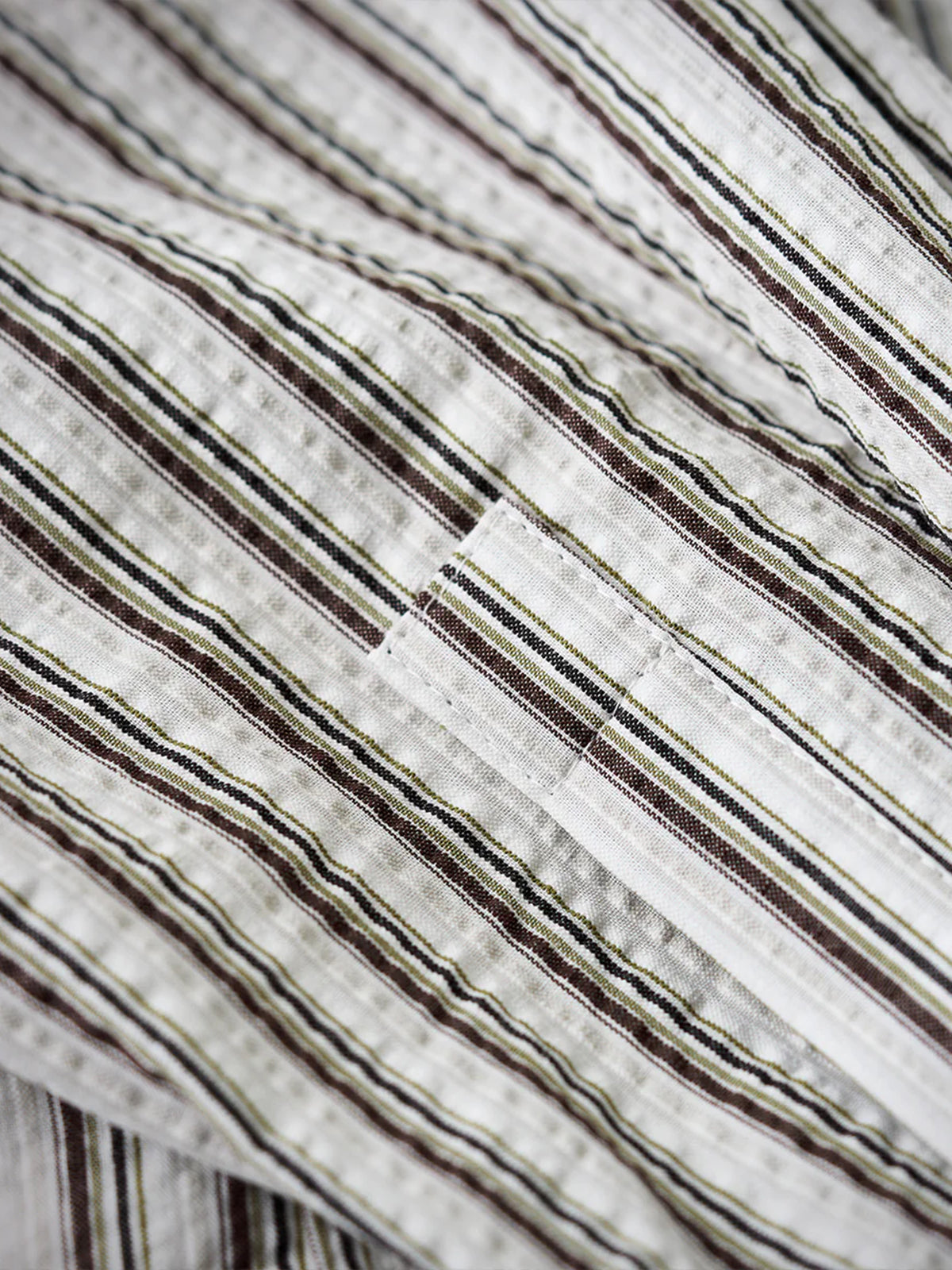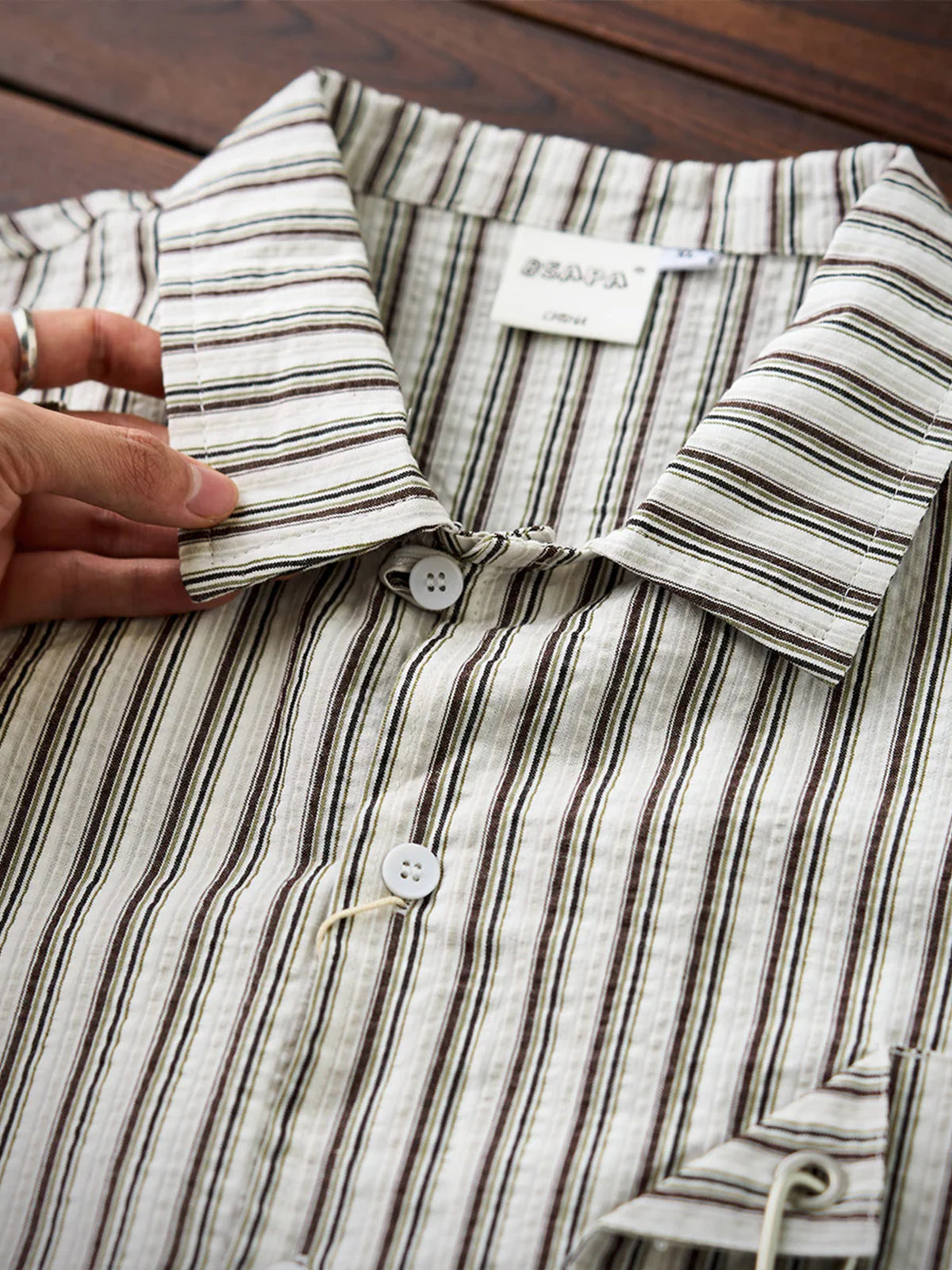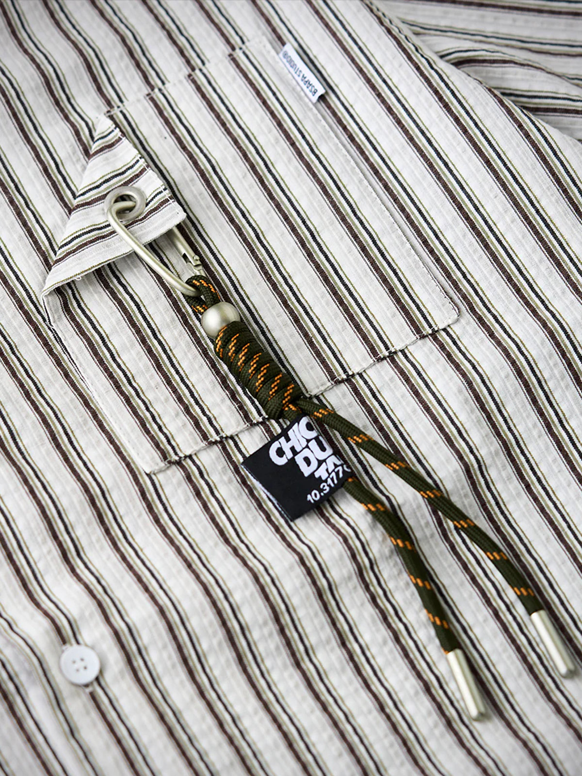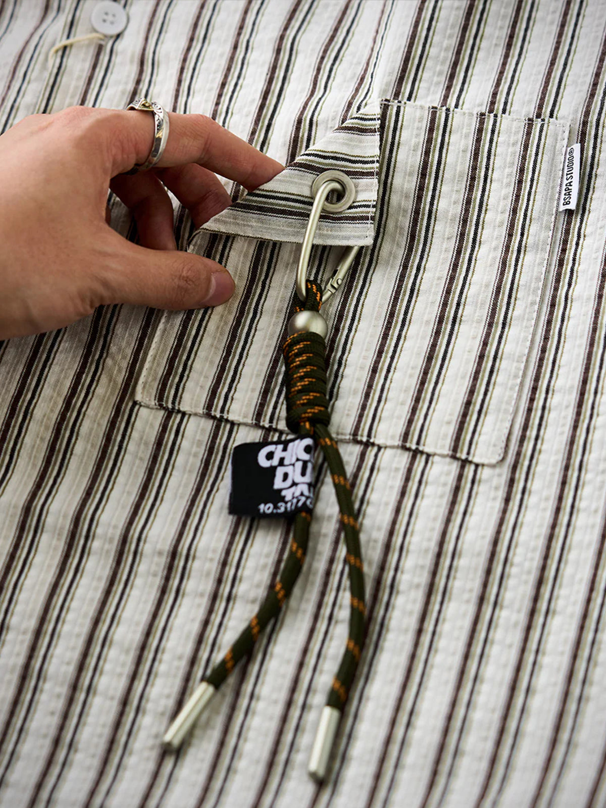 The loose silhouette emphasizes the ease of movement and is suitable for casual style. In particular, the slightly dropped shoulder design makes the shoulder line look softer. The brown and black pinstripes are woven into off-white or color, making it the focus of the design. There is a small pocket on the chest with a carabiner attached to the chest pocket, which can not only be used as an embellishment of the design, but also hang small items such as keys.