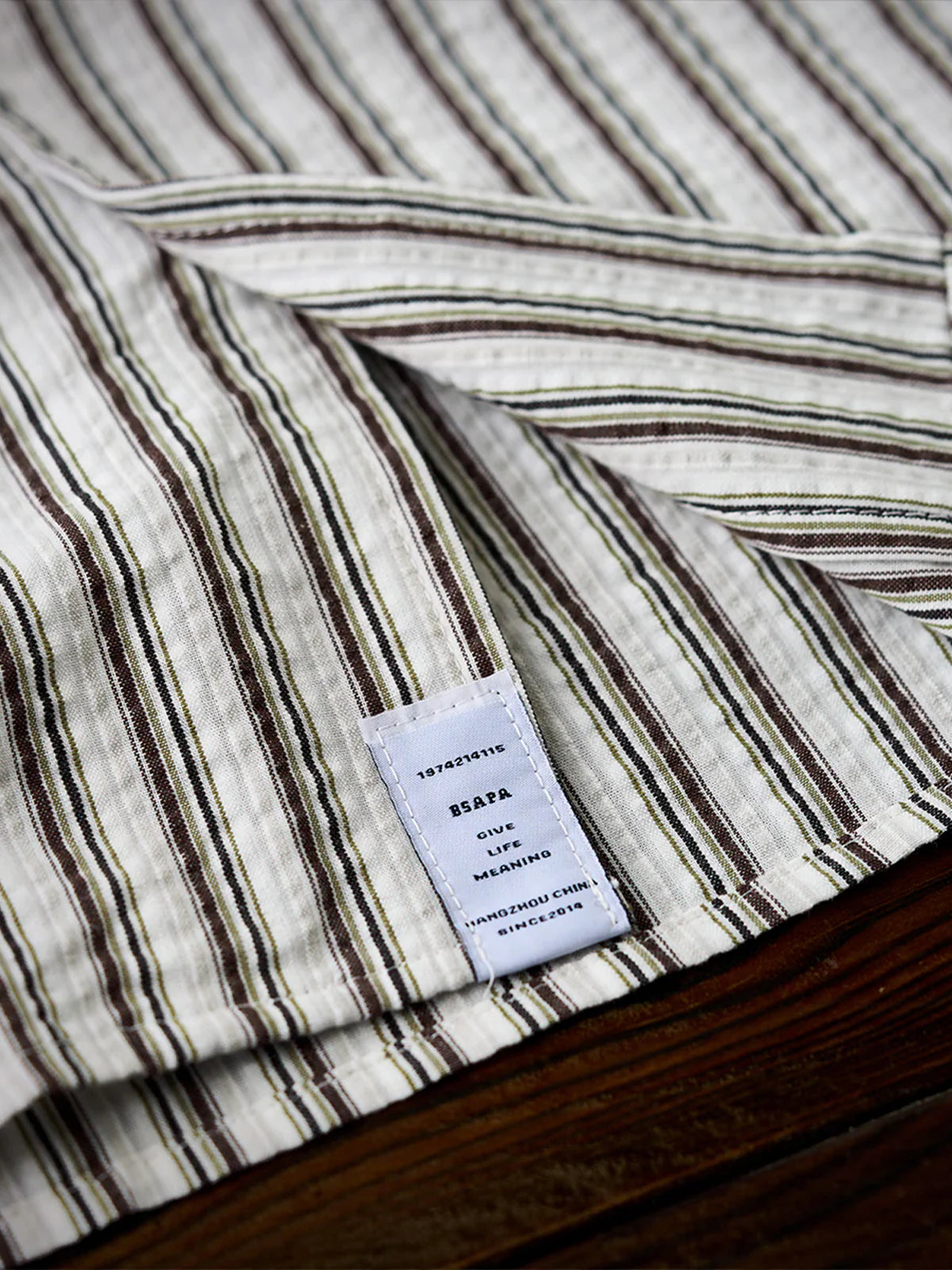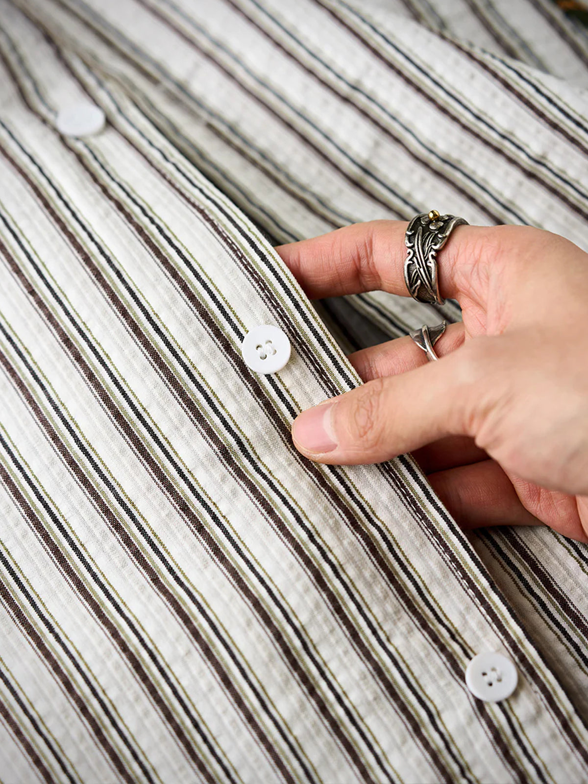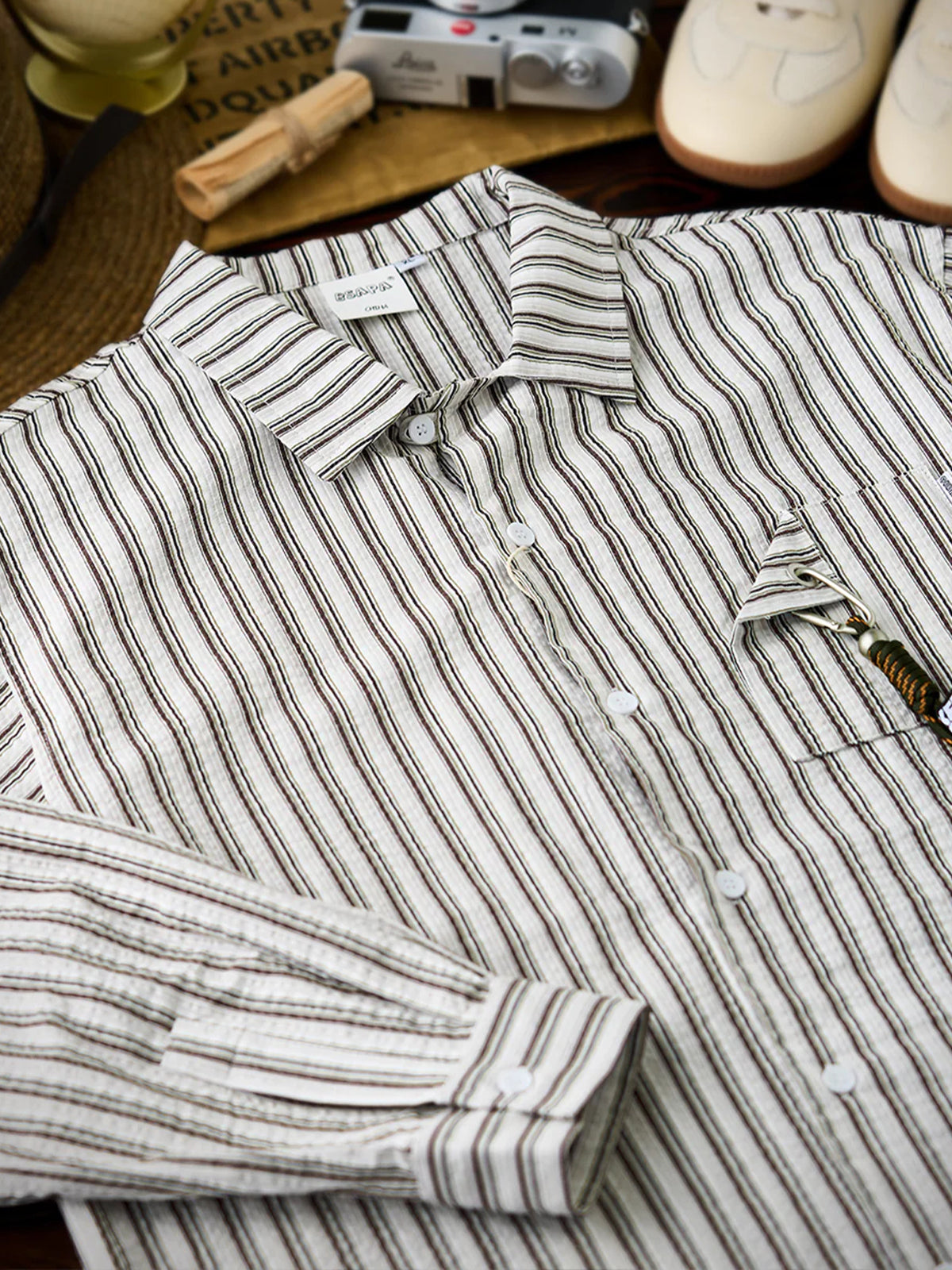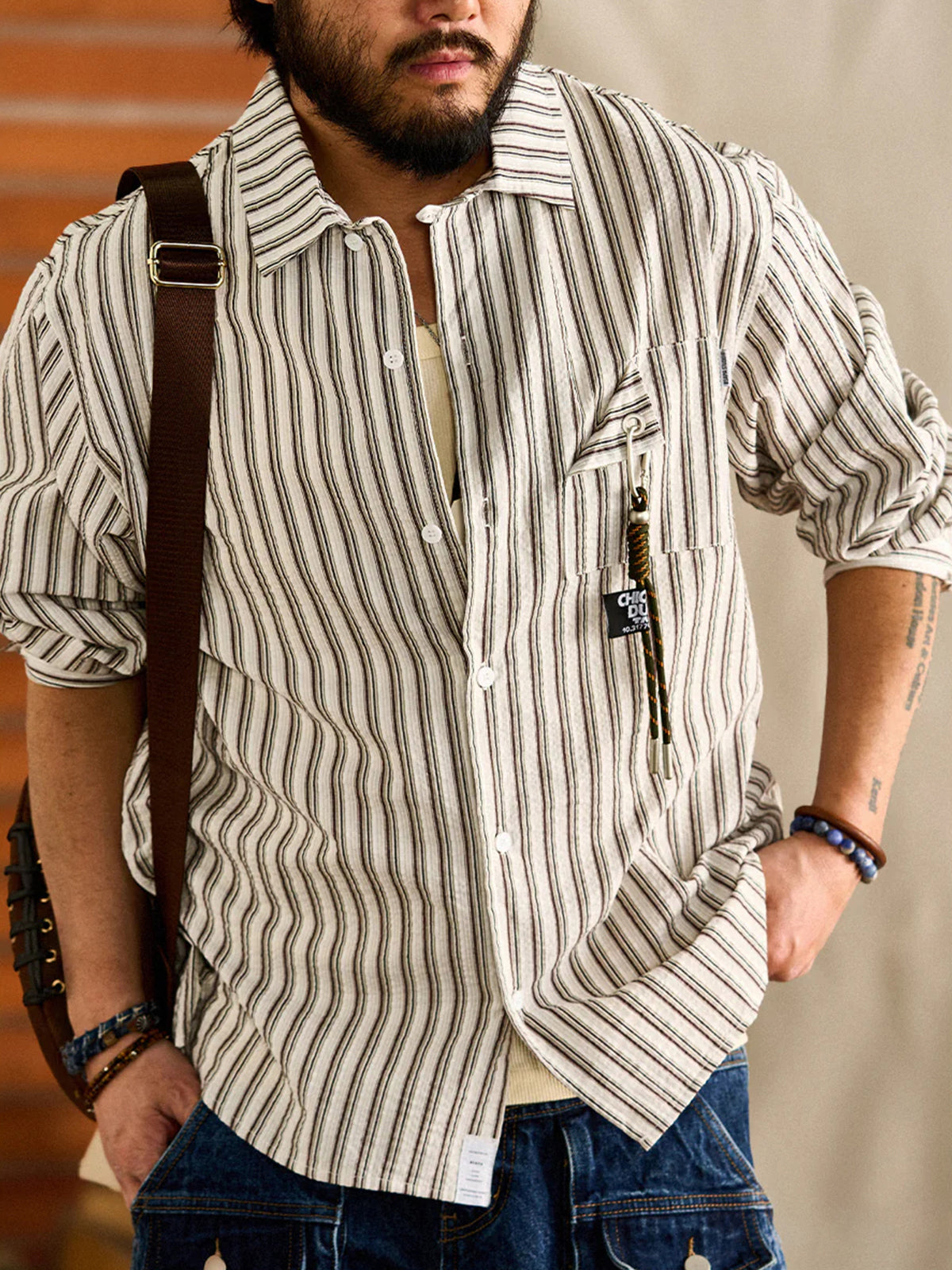 The loose silhouette emphasizes the ease of movement and is suitable for casual style. In particular, the slightly dropped shoulder design makes the shoulder line look softer. The brown and black pinstripes are woven into off-white or color, making it the focus of the design. There is a small pocket on the chest with a carabiner attached to the chest pocket, which can not only be used as an embellishment of the design, but also hang small items such as keys.