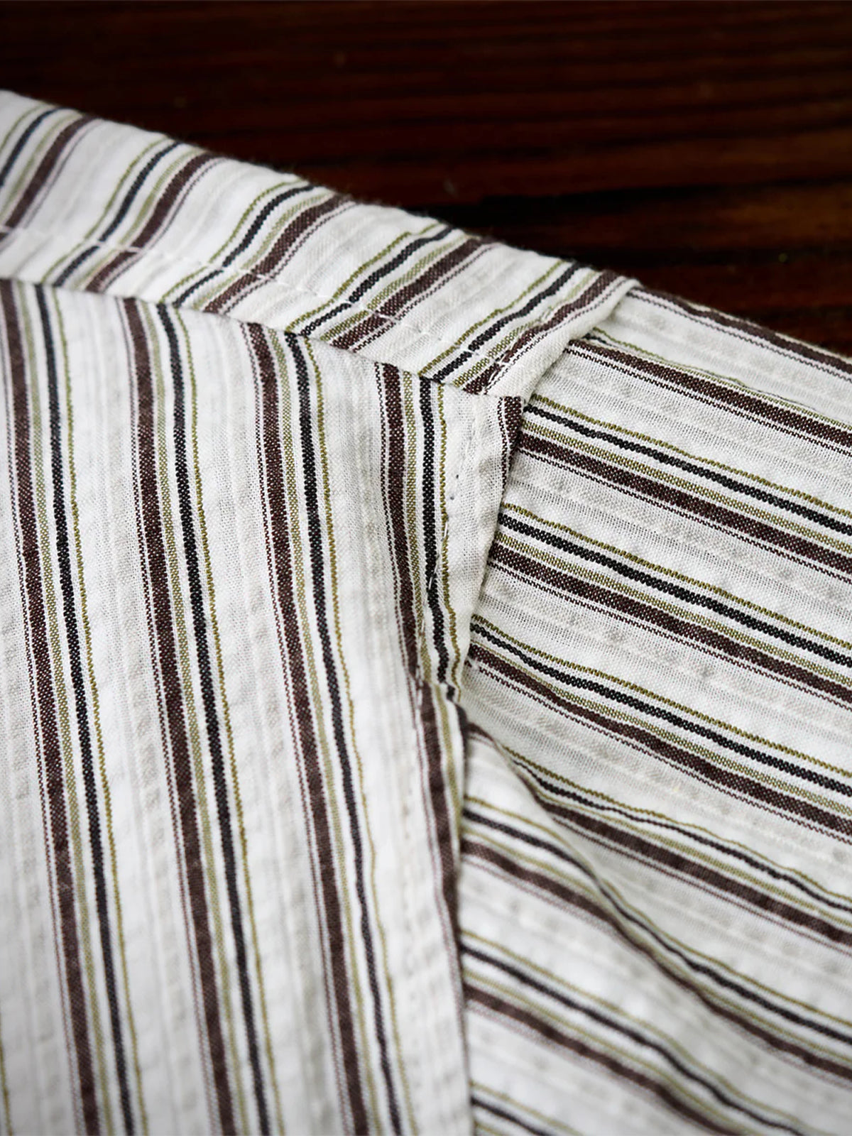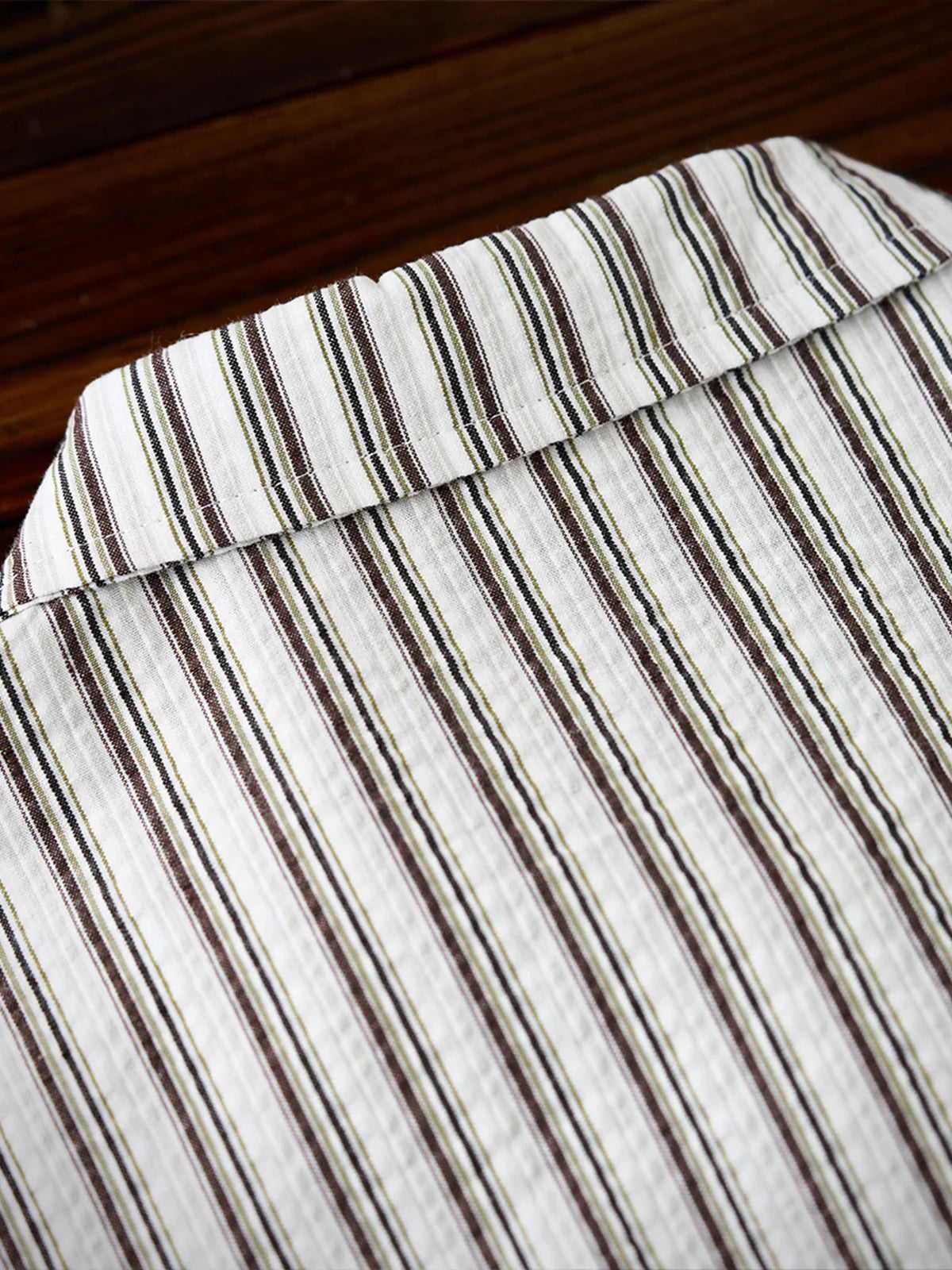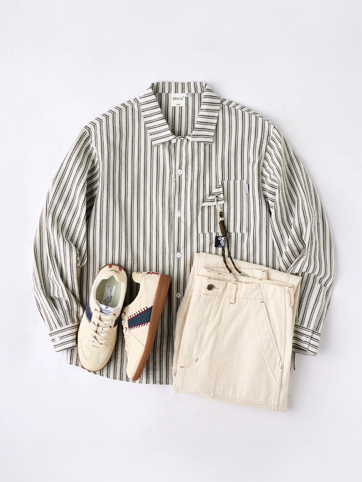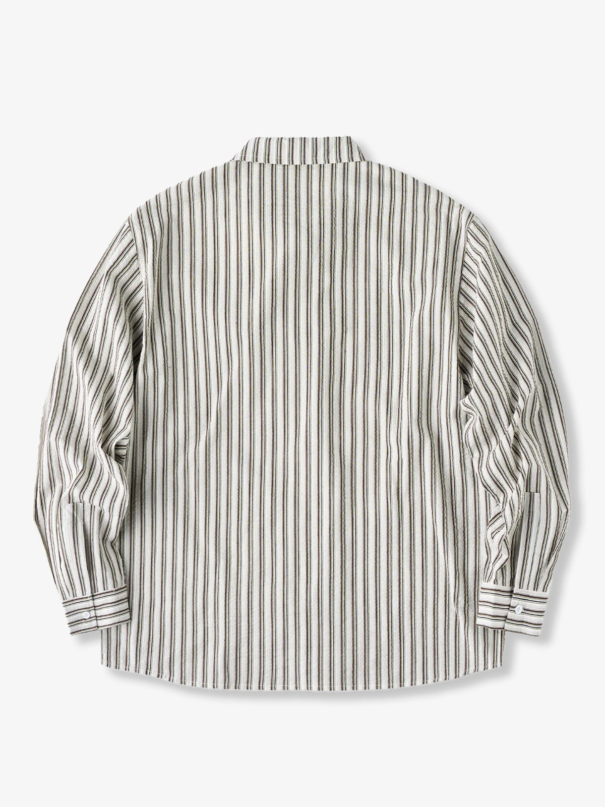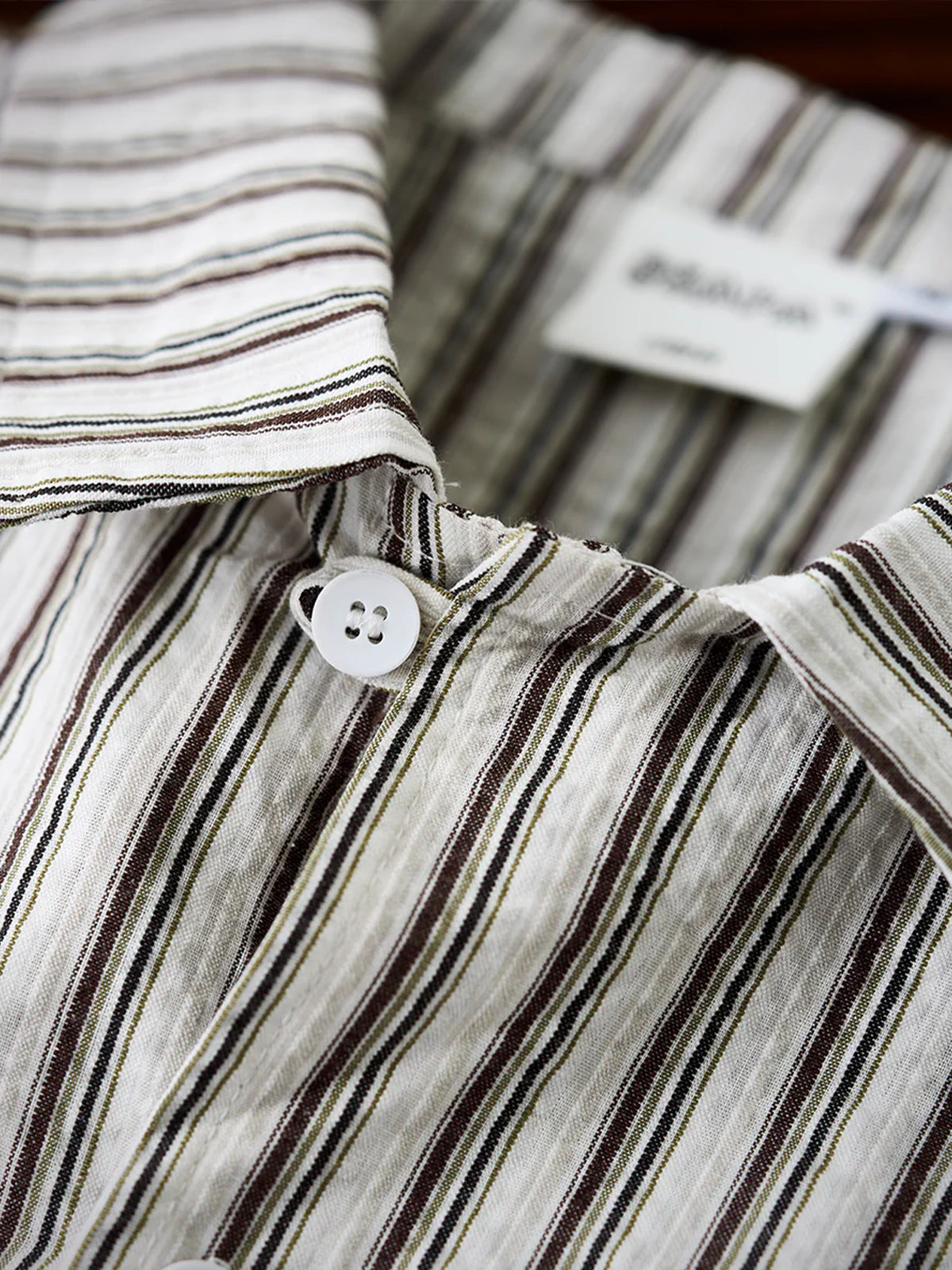 The loose silhouette emphasizes the ease of movement and is suitable for casual style. In particular, the slightly dropped shoulder design makes the shoulder line look softer. The brown and black pinstripes are woven into off-white or color, making it the focus of the design. There is a small pocket on the chest with a carabiner attached to the chest pocket, which can not only be used as an embellishment of the design, but also hang small items such as keys.