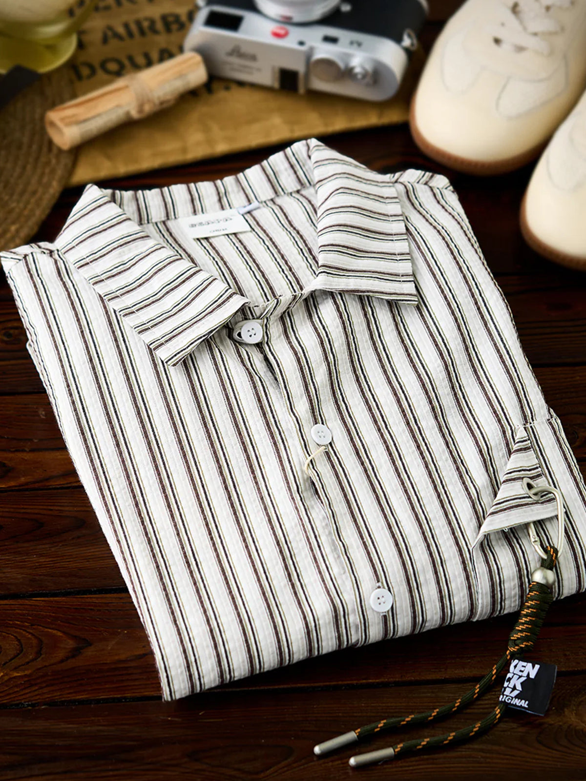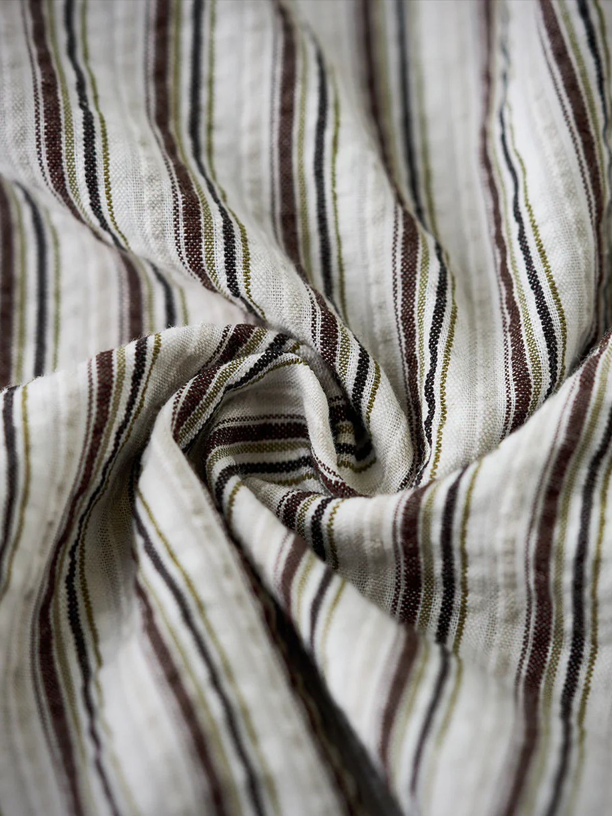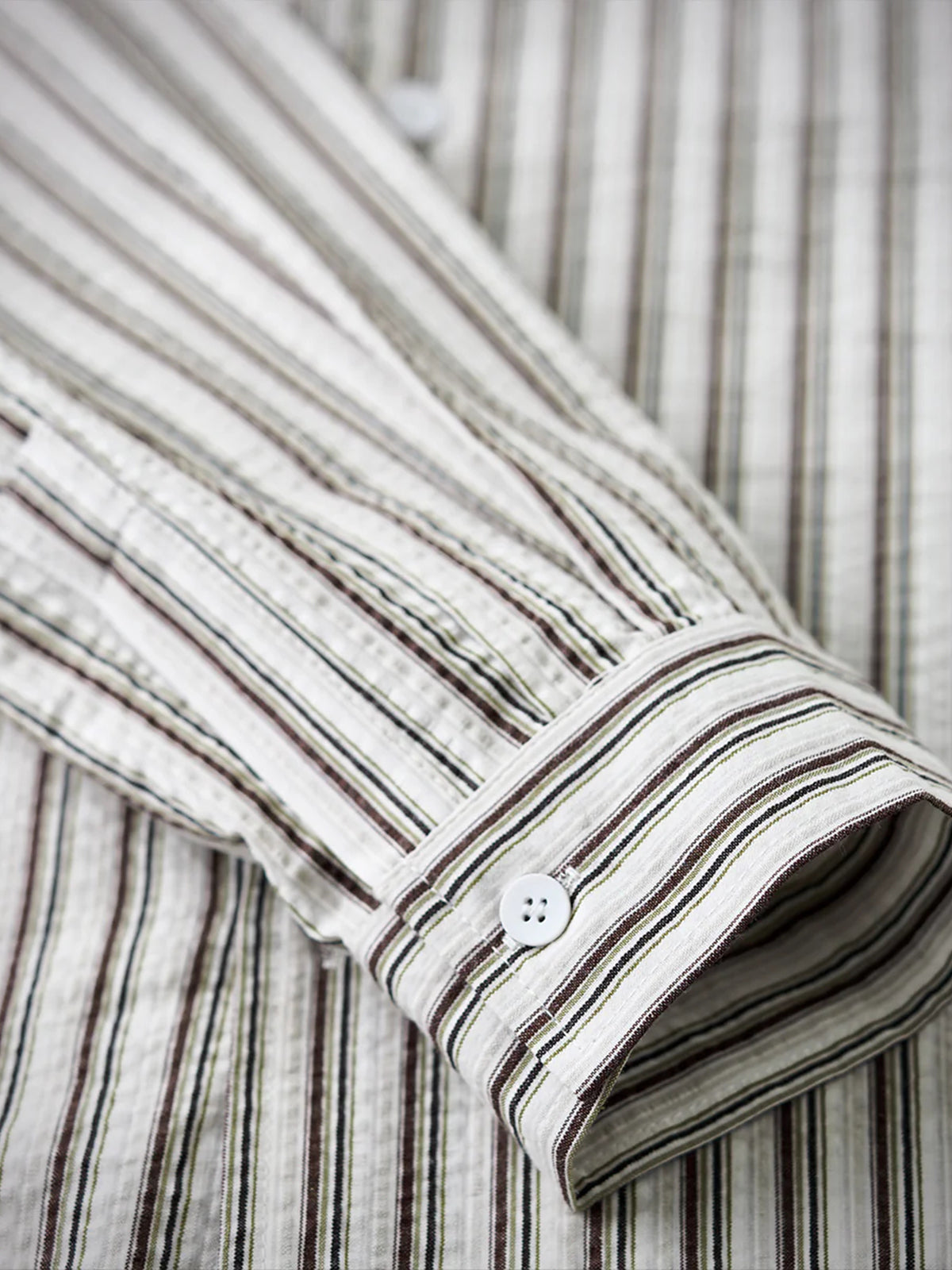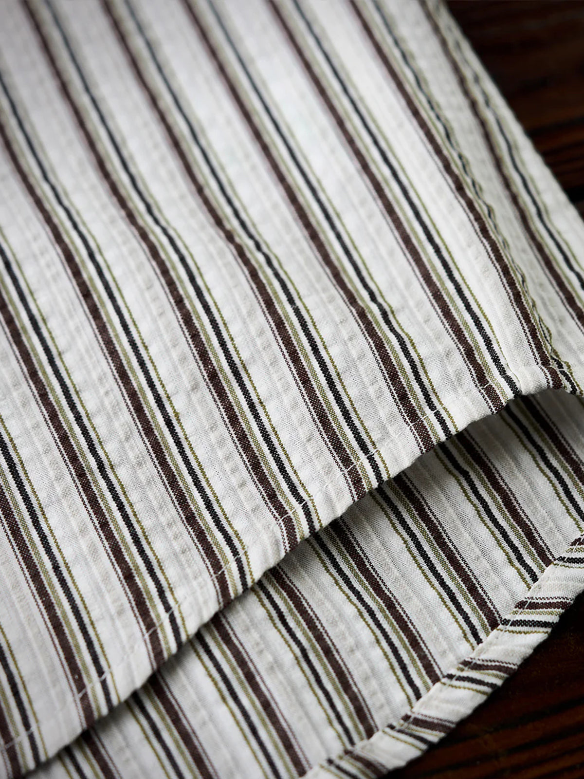 The loose silhouette emphasizes the ease of movement and is suitable for casual style. In particular, the slightly dropped shoulder design makes the shoulder line look softer. The brown and black pinstripes are woven into off-white or color, making it the focus of the design. There is a small pocket on the chest with a carabiner attached to the chest pocket, which can not only be used as an embellishment of the design, but also hang small items such as keys.