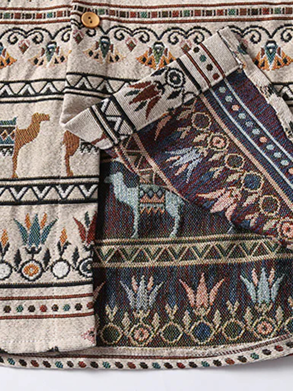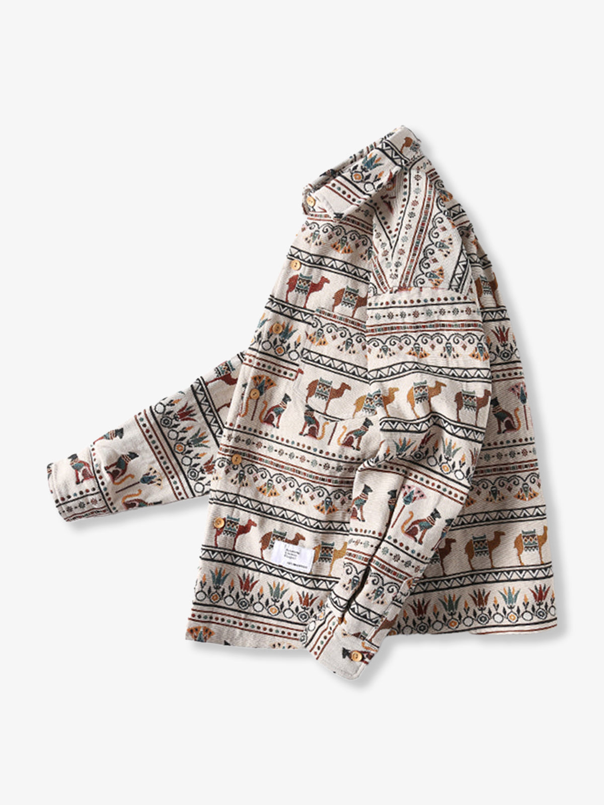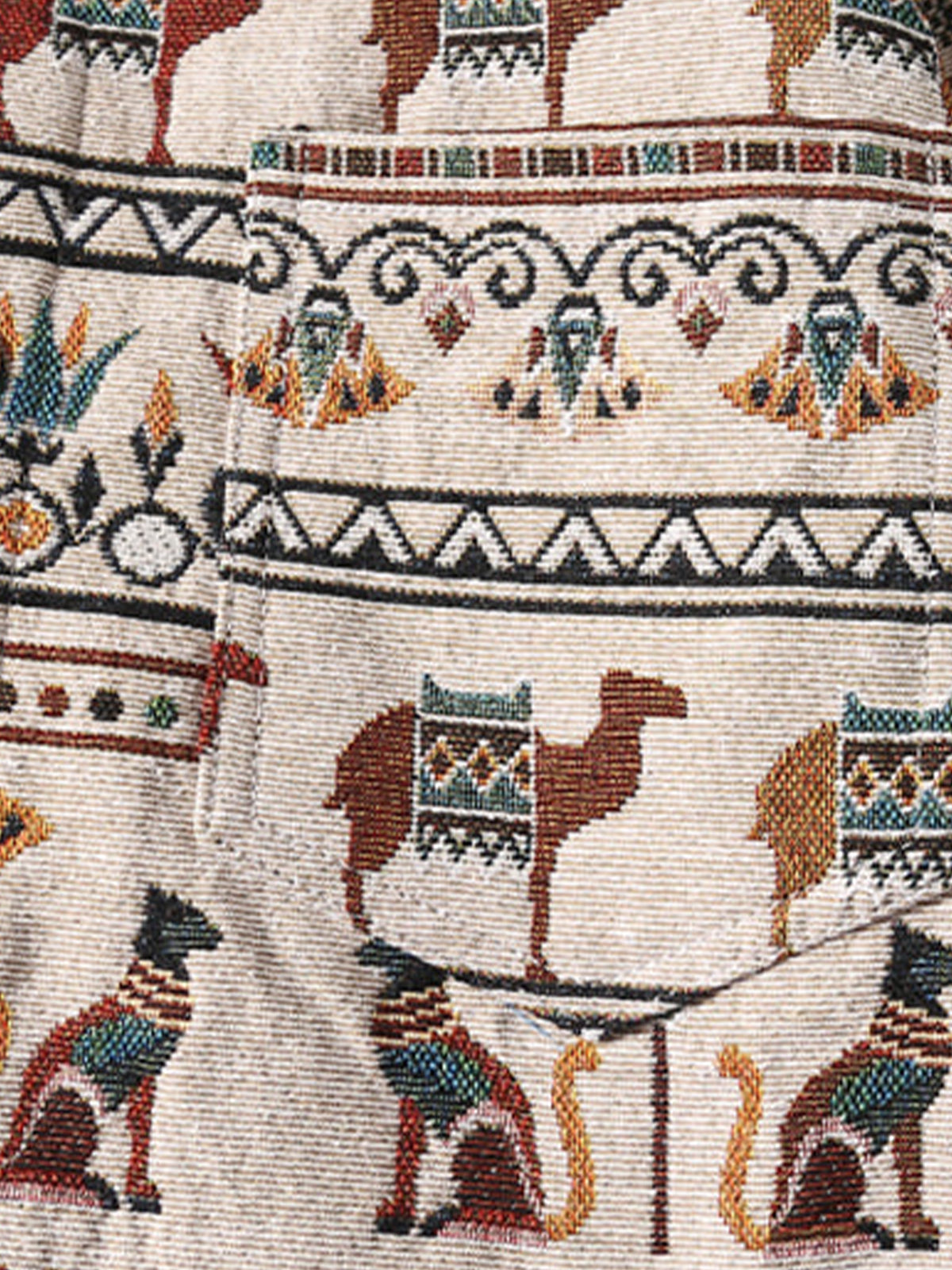 This shirt features a jacquard woven all-over print inspired by Egyptian symbols and motifs, creating a delicate and intricate design with an exotic vibe. The print incorporates iconic Egyptian symbols such as the cat, representing protection and sacredness, and the camel, symbolizing endurance and daily life. These motifs are deeply rooted in Egypt’s culture and history, adding a mystical charm to the garment. With a relaxed fit, the shirt offers comfort and ease of movement, perfect for casual, laid-back styling.