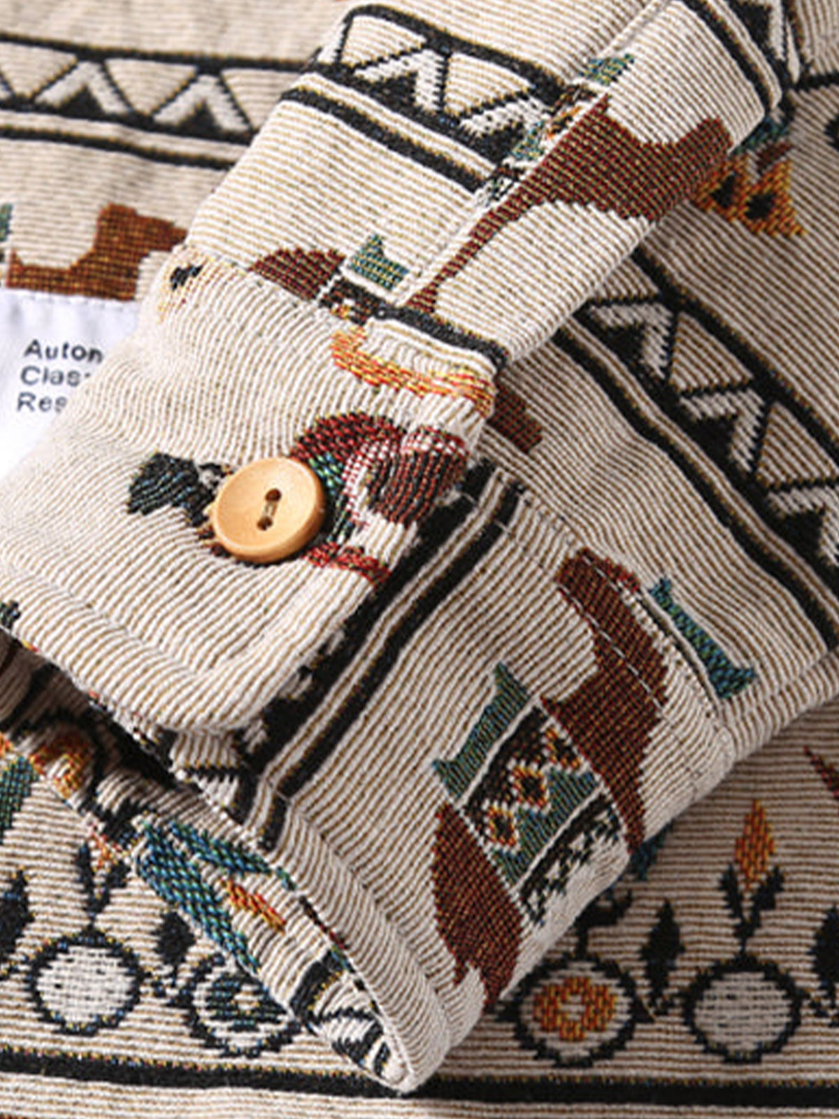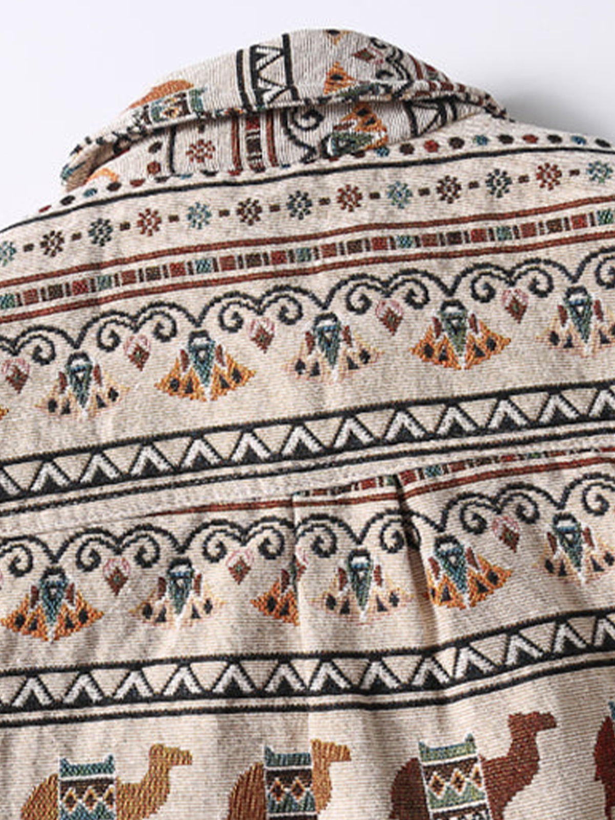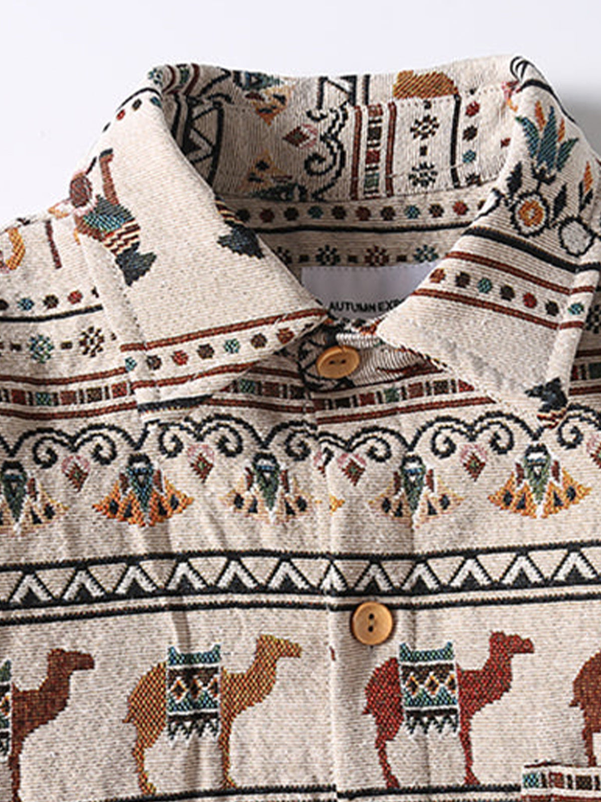 This shirt features a jacquard woven all-over print inspired by Egyptian symbols and motifs, creating a delicate and intricate design with an exotic vibe. The print incorporates iconic Egyptian symbols such as the cat, representing protection and sacredness, and the camel, symbolizing endurance and daily life. These motifs are deeply rooted in Egypt’s culture and history, adding a mystical charm to the garment. With a relaxed fit, the shirt offers comfort and ease of movement, perfect for casual, laid-back styling.