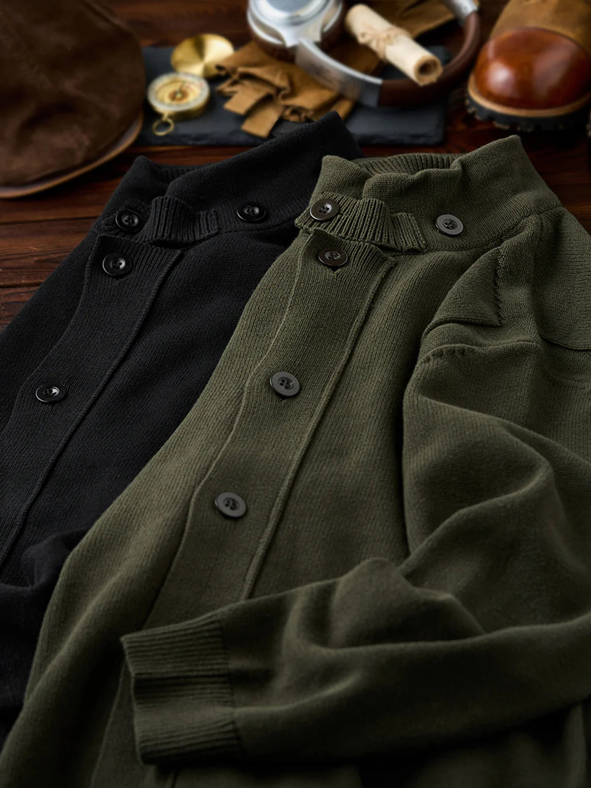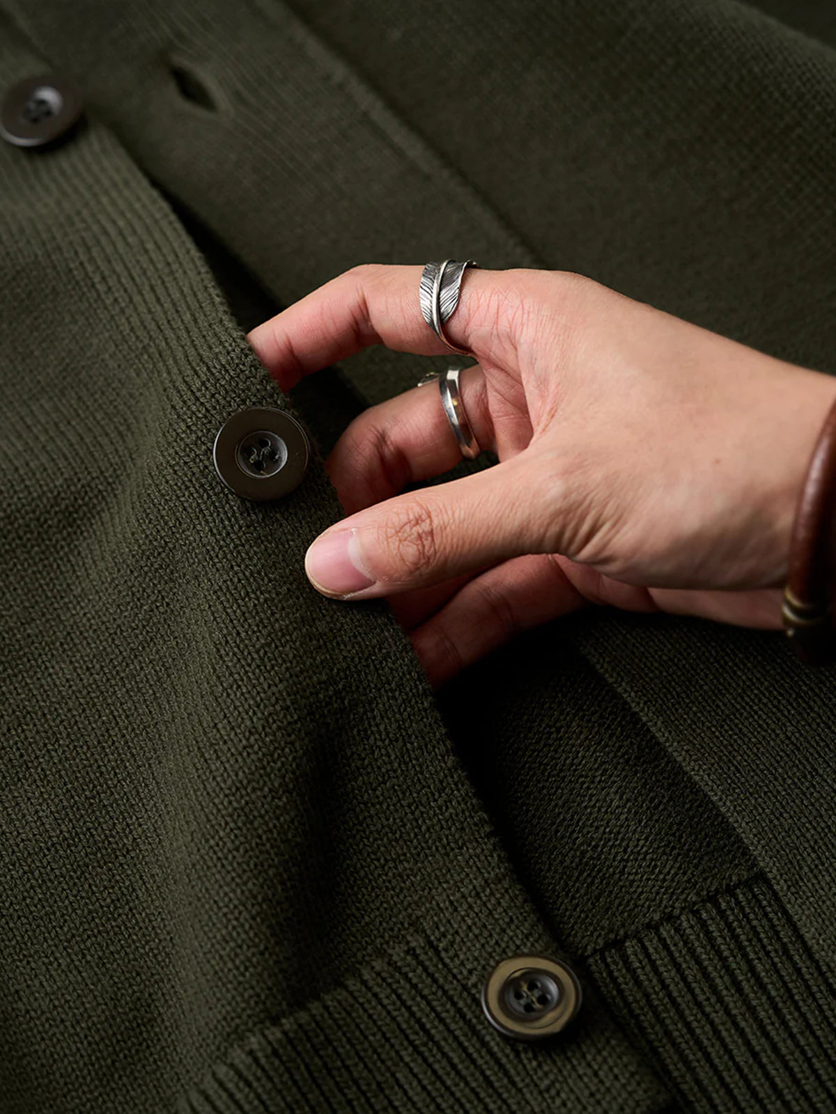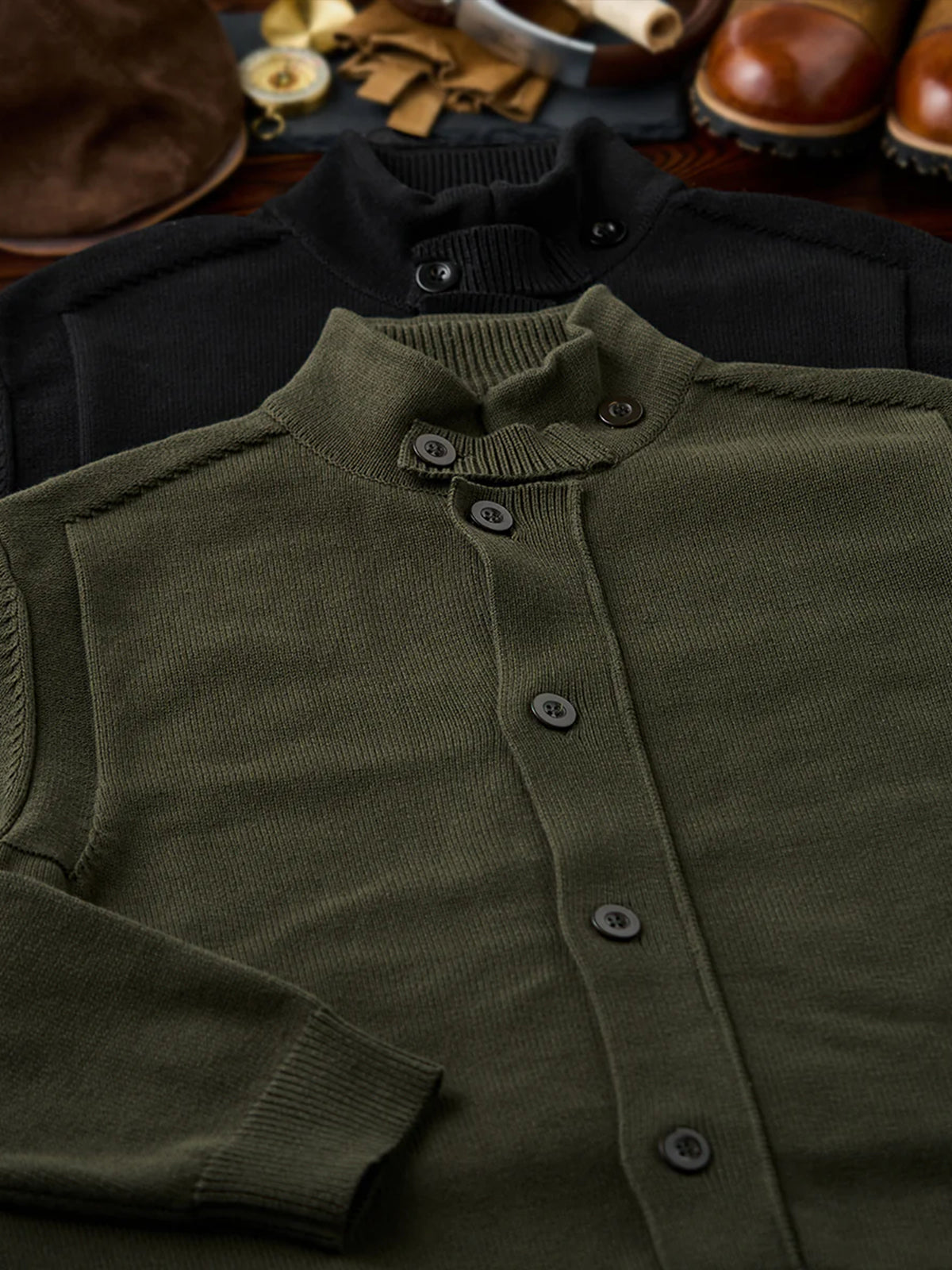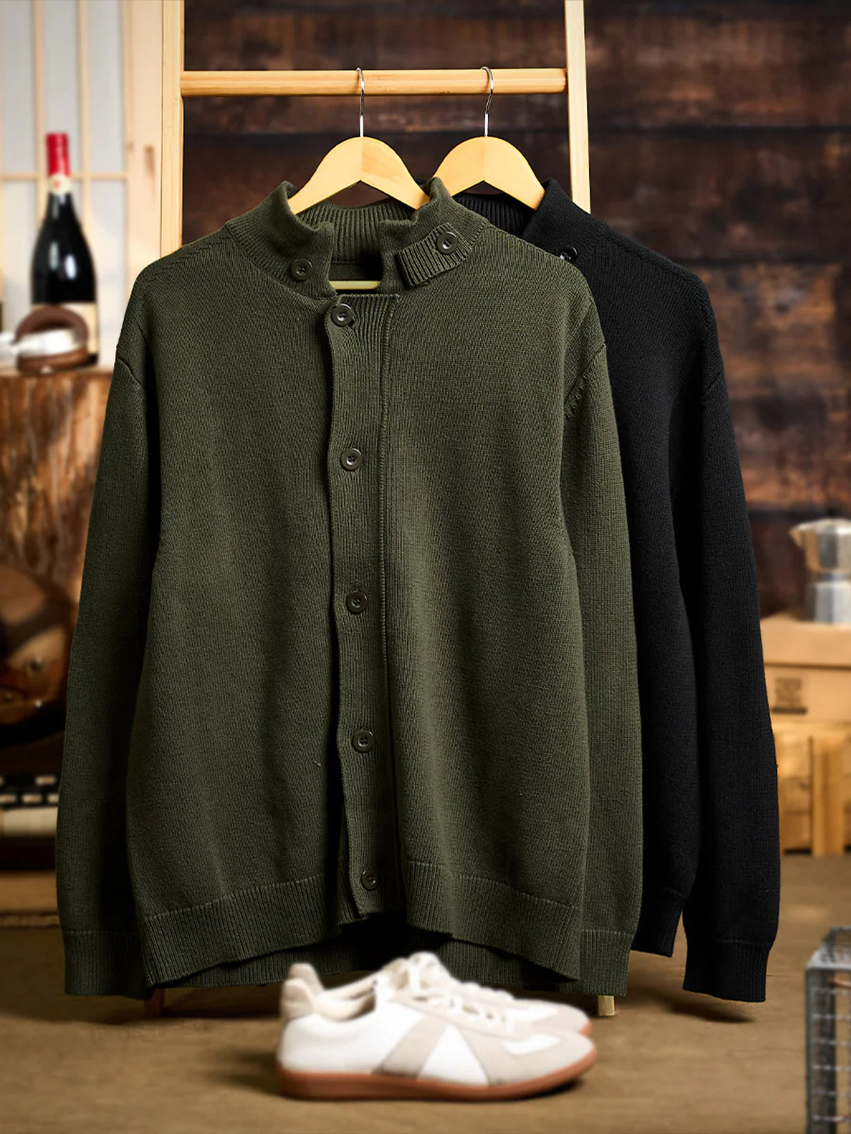 This cardigan features a raised ribbed high neck, providing excellent warmth. The neck includes buttons, allowing you to adjust the opening for styling versatility.