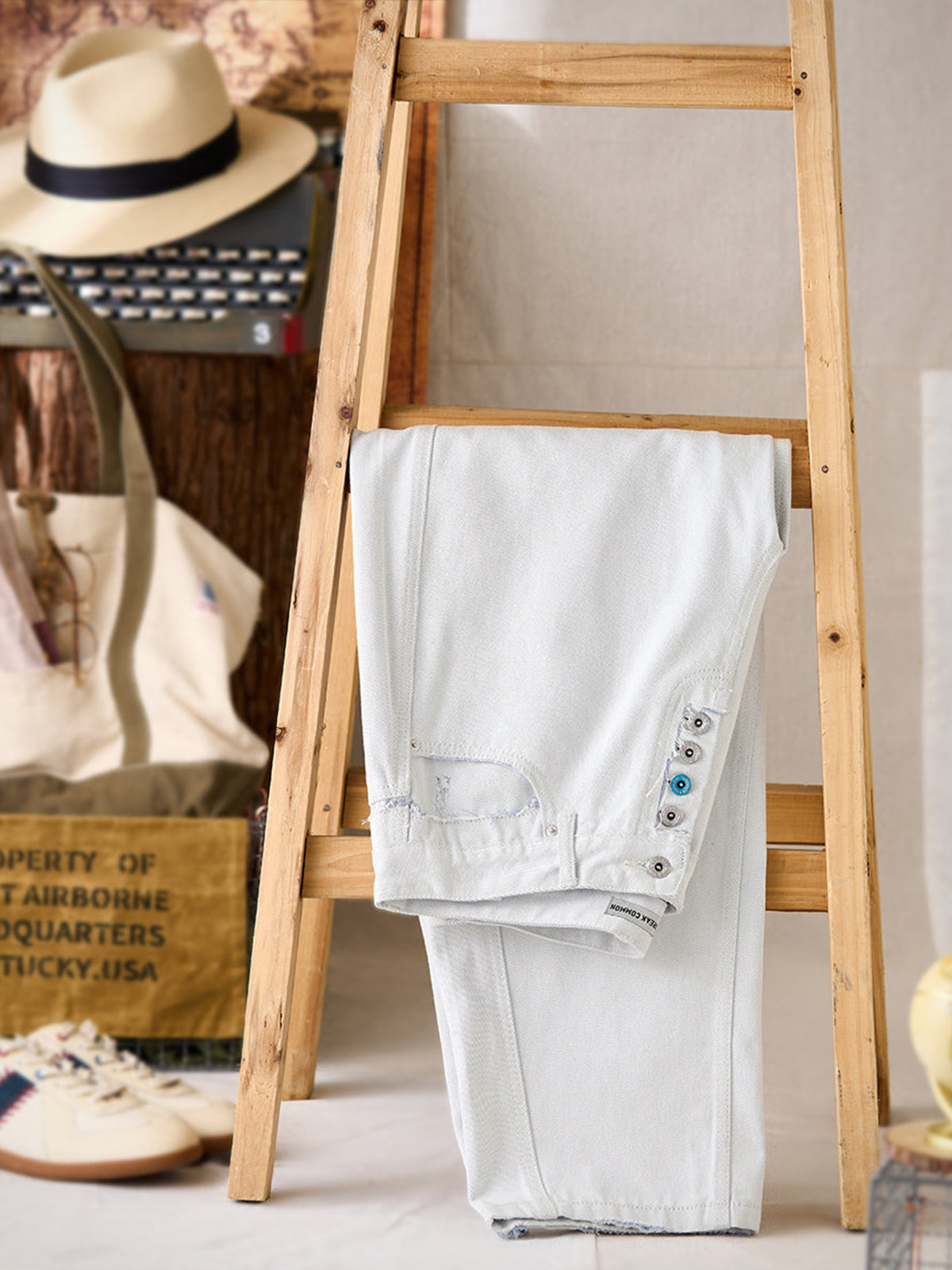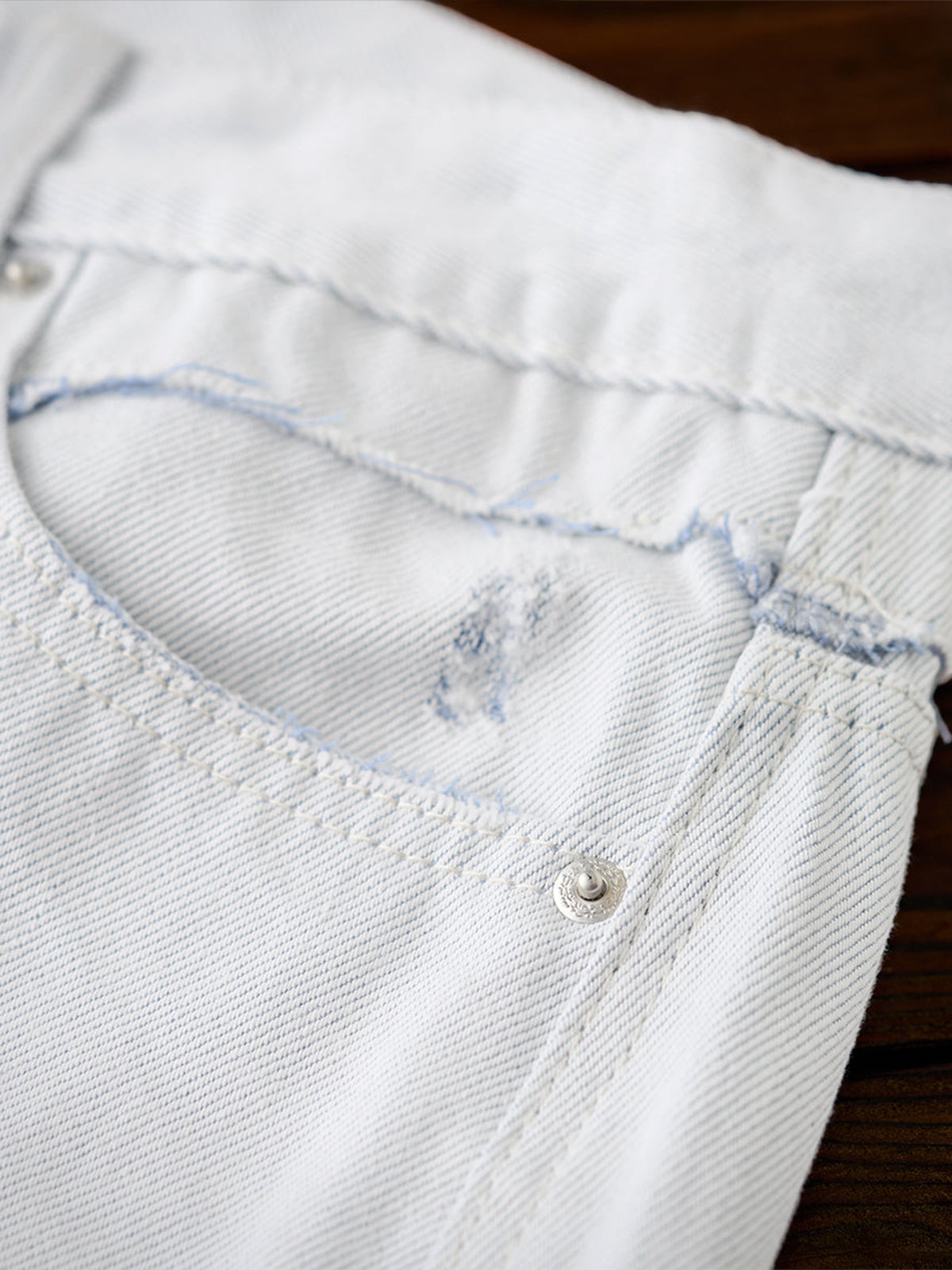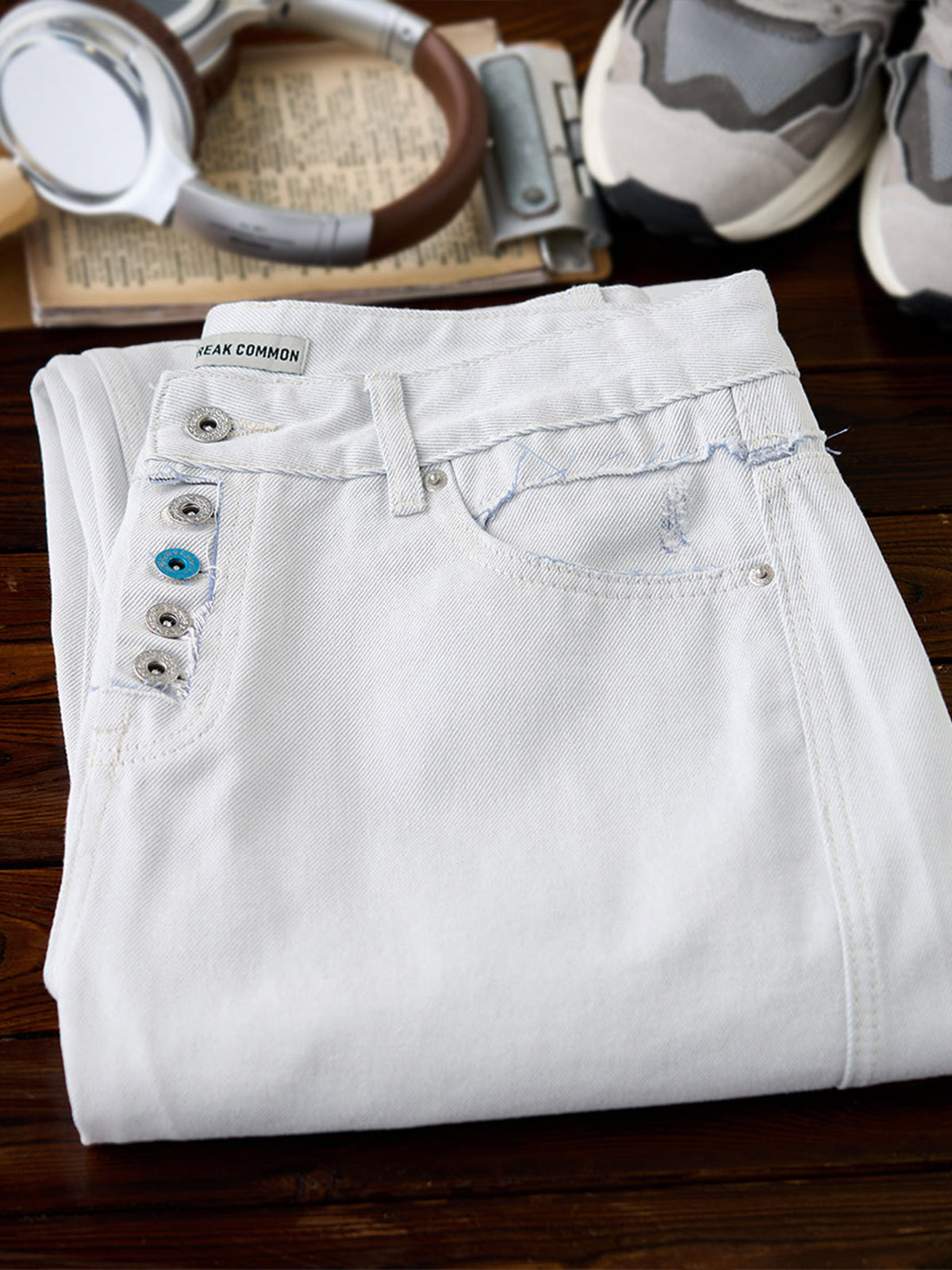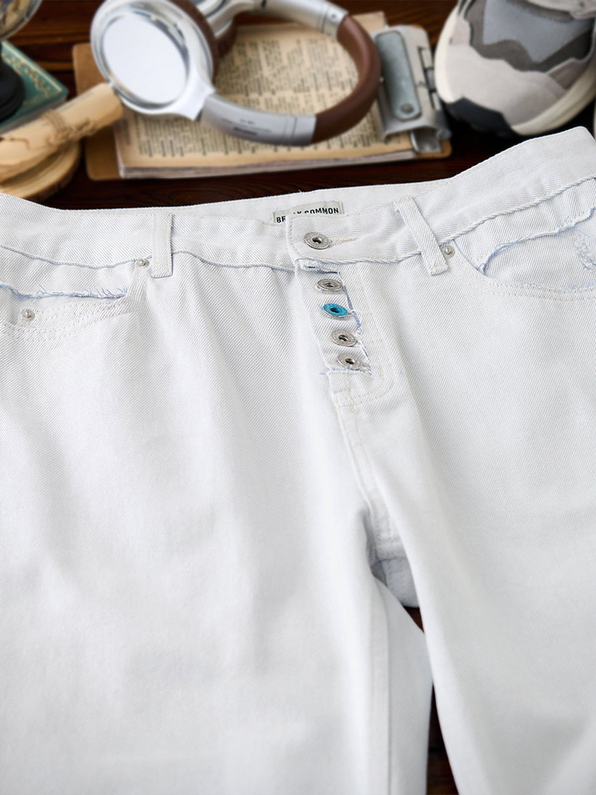 Bold distressed processing and fringe details catch the eye, creating an edgy look on these white denim pants. The waist belt area features fringe processing, adding dynamic detail and personality. Additionally, the button fly with contrasting buttons serves as an accent, demonstrating attention to detail in the design. With this carefully crafted design, simply pairing these pants with a simple top completes your style. Recommended for casual wear as well as fashionable, mode-inspired outfits.