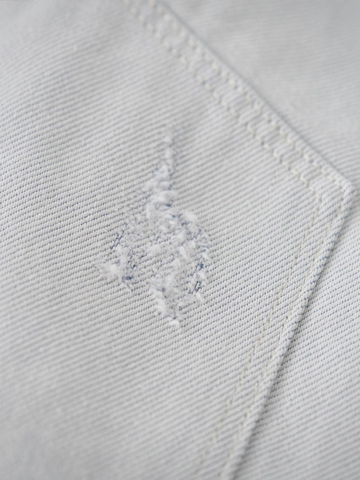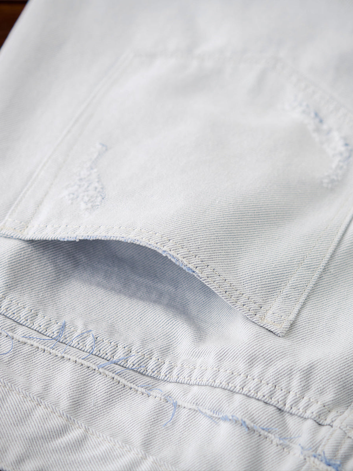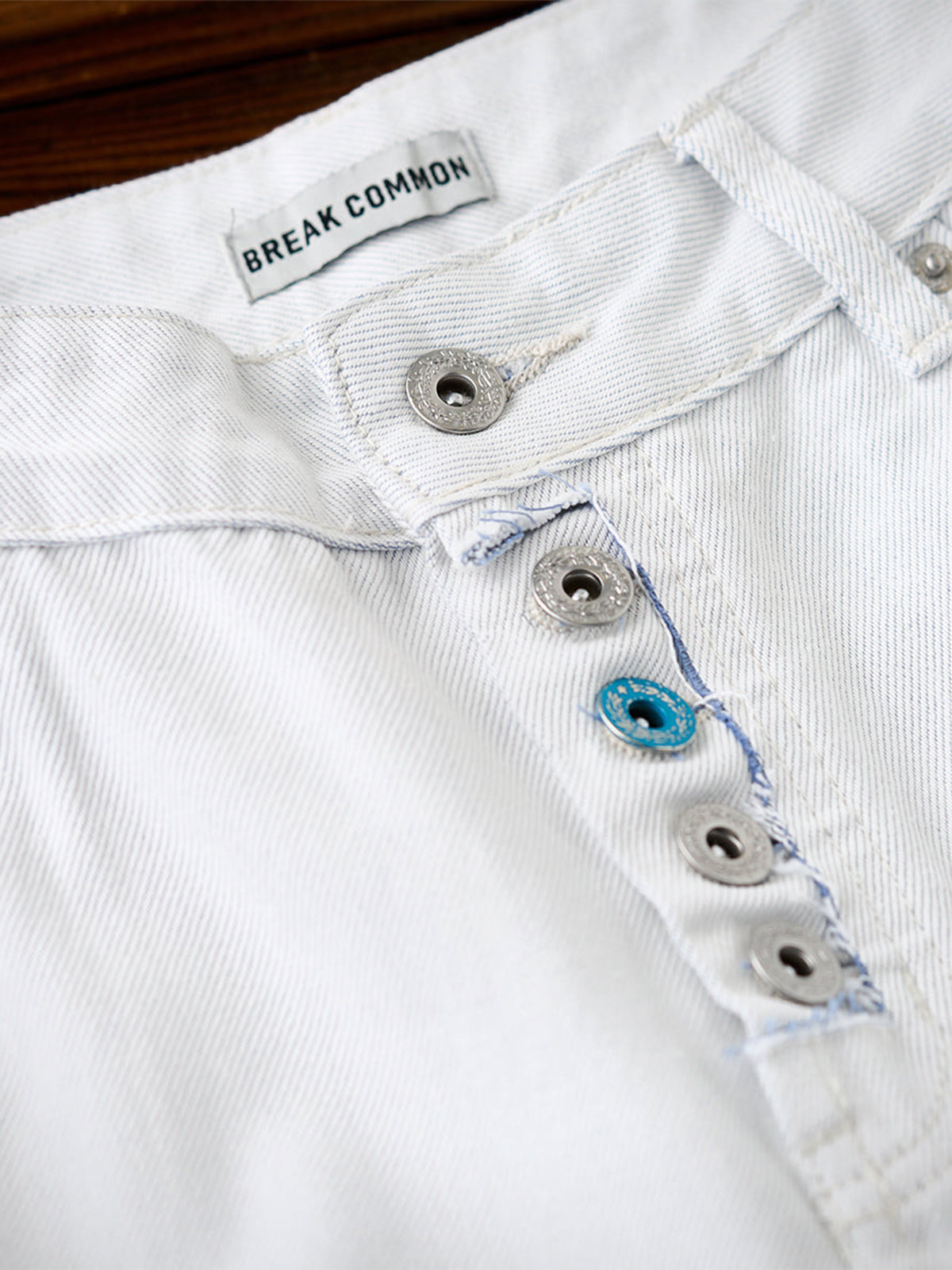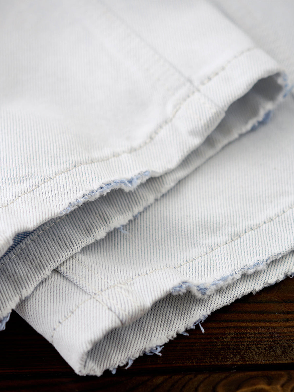Bold distressed processing and fringe details catch the eye, creating an edgy look on these white denim pants. The waist belt area features fringe processing, adding dynamic detail and personality. Additionally, the button fly with contrasting buttons serves as an accent, demonstrating attention to detail in the design. With this carefully crafted design, simply pairing these pants with a simple top completes your style. Recommended for casual wear as well as fashionable, mode-inspired outfits.