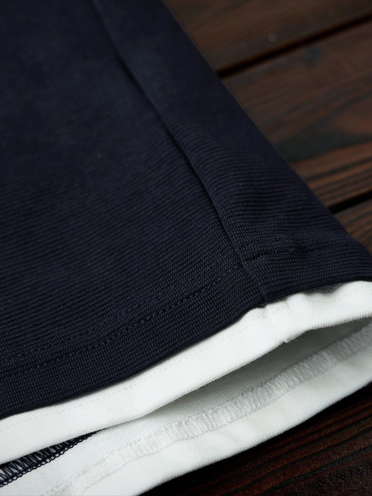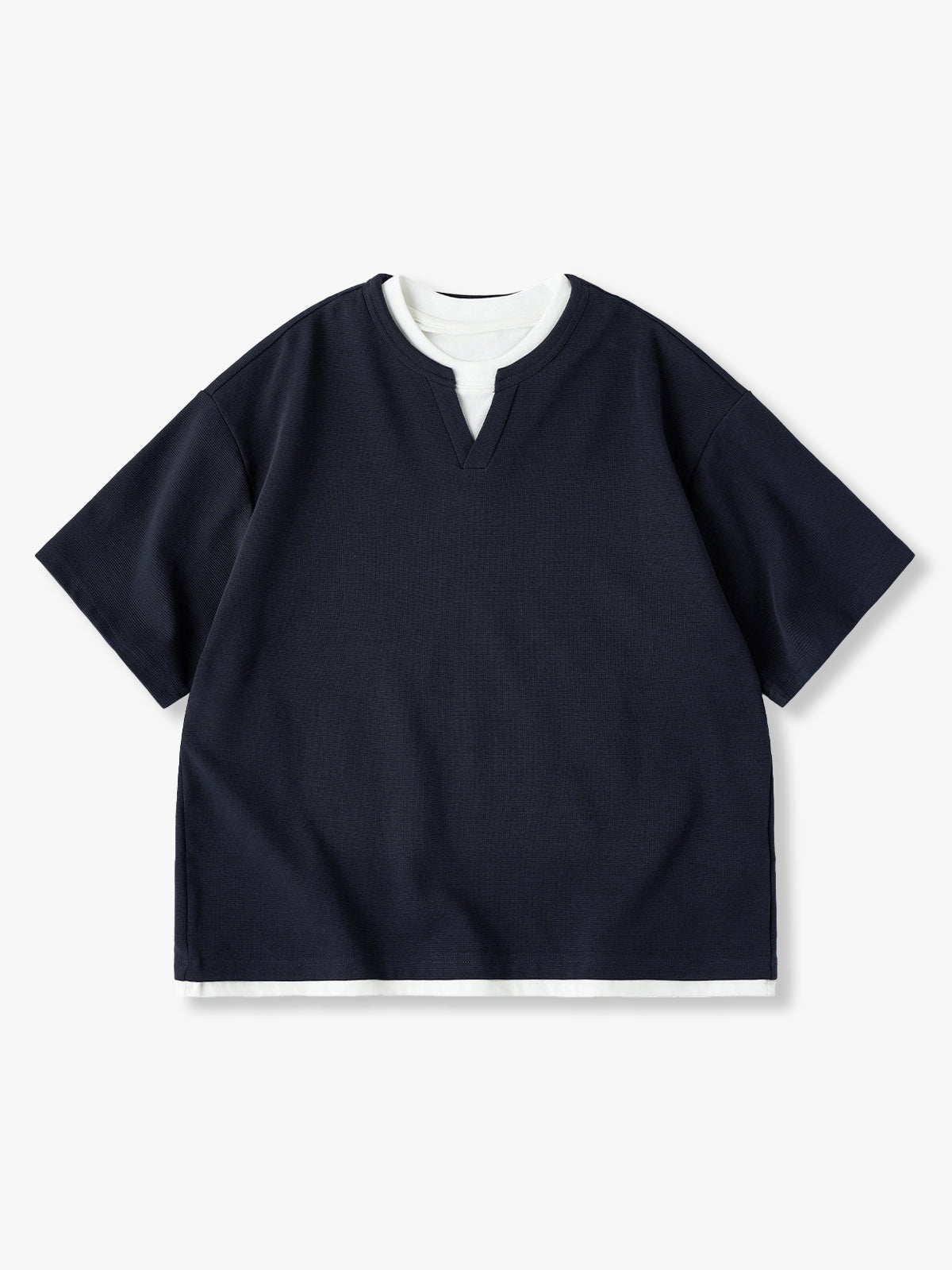 A shallow V-shaped slit at the neckline adds a subtle accent. The neckline and hem feature a layered look, as if an inner shirt is being worn underneath. In reality, it's a single T-shirt, allowing you to enjoy a stylish layered effect without the discomfort of actual layering.