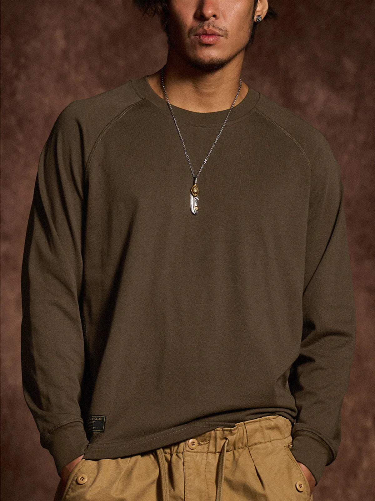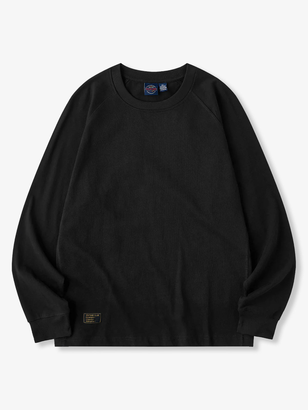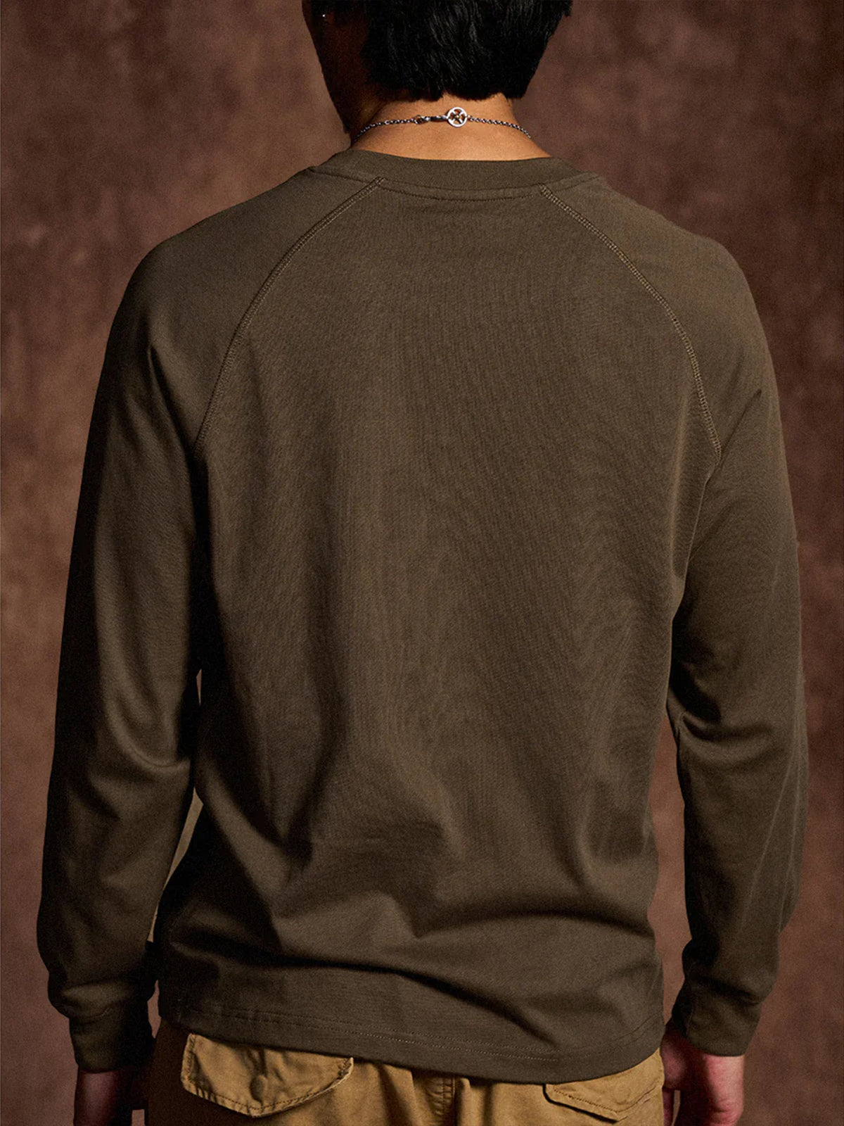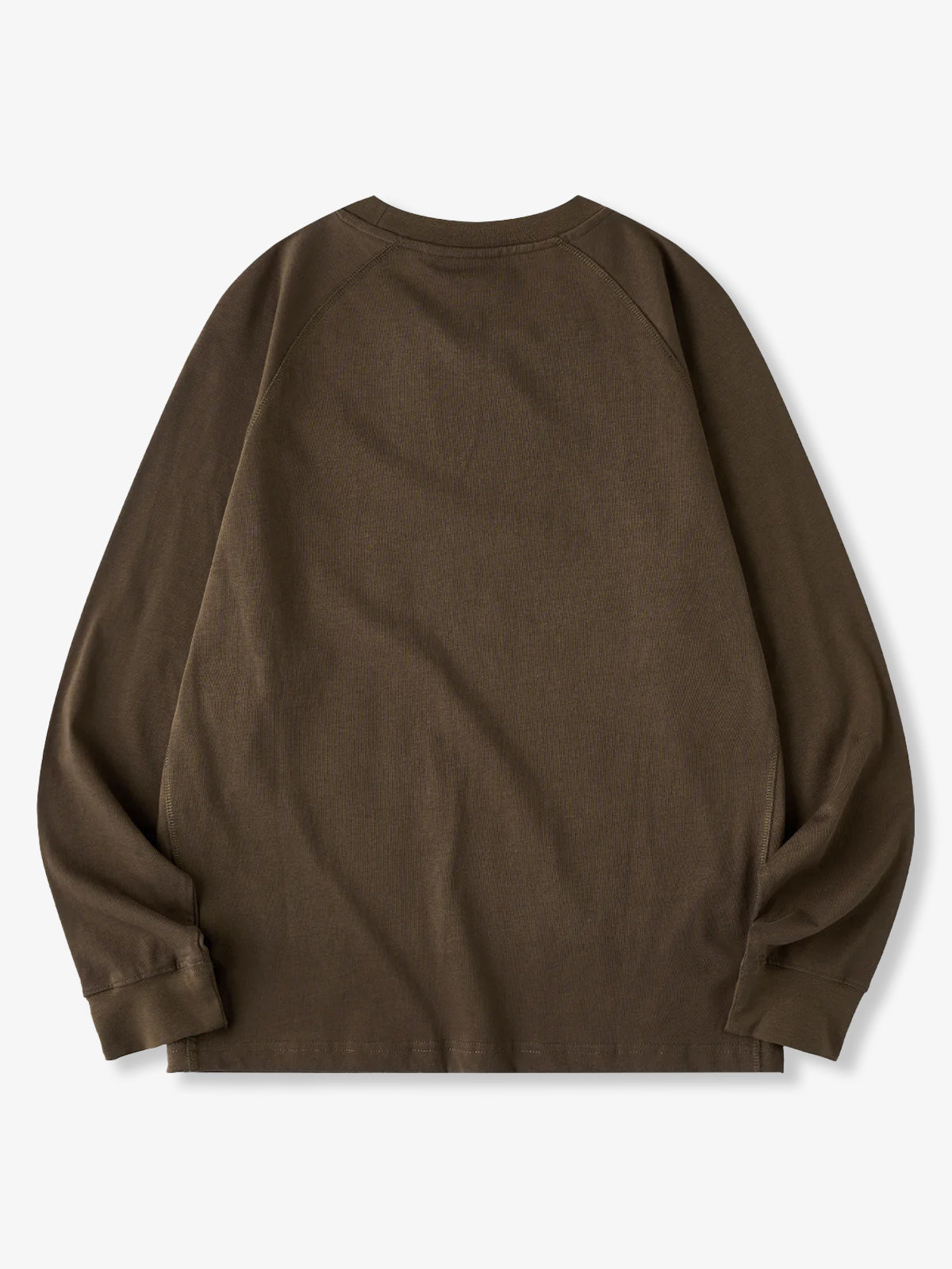 A long-sleeve T-shirt featuring a raglan sleeve construction that extends smoothly from the shoulders to the cuffs. The seams and side stitch lines are reinforced with durable thread for strength and shape retention, creating a clean, dimensional silhouette. A small brand tag is placed subtly at the hem, adding a refined touch to the minimalist design. Available in coffee, black, and white, this versatile piece transitions effortlessly from casual to streetwear styles.