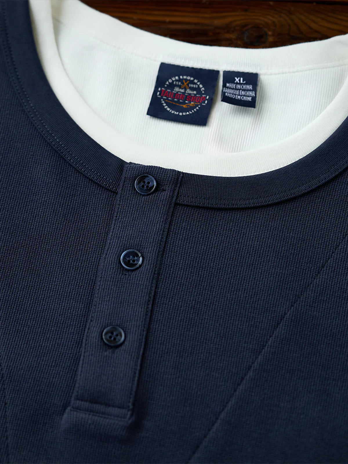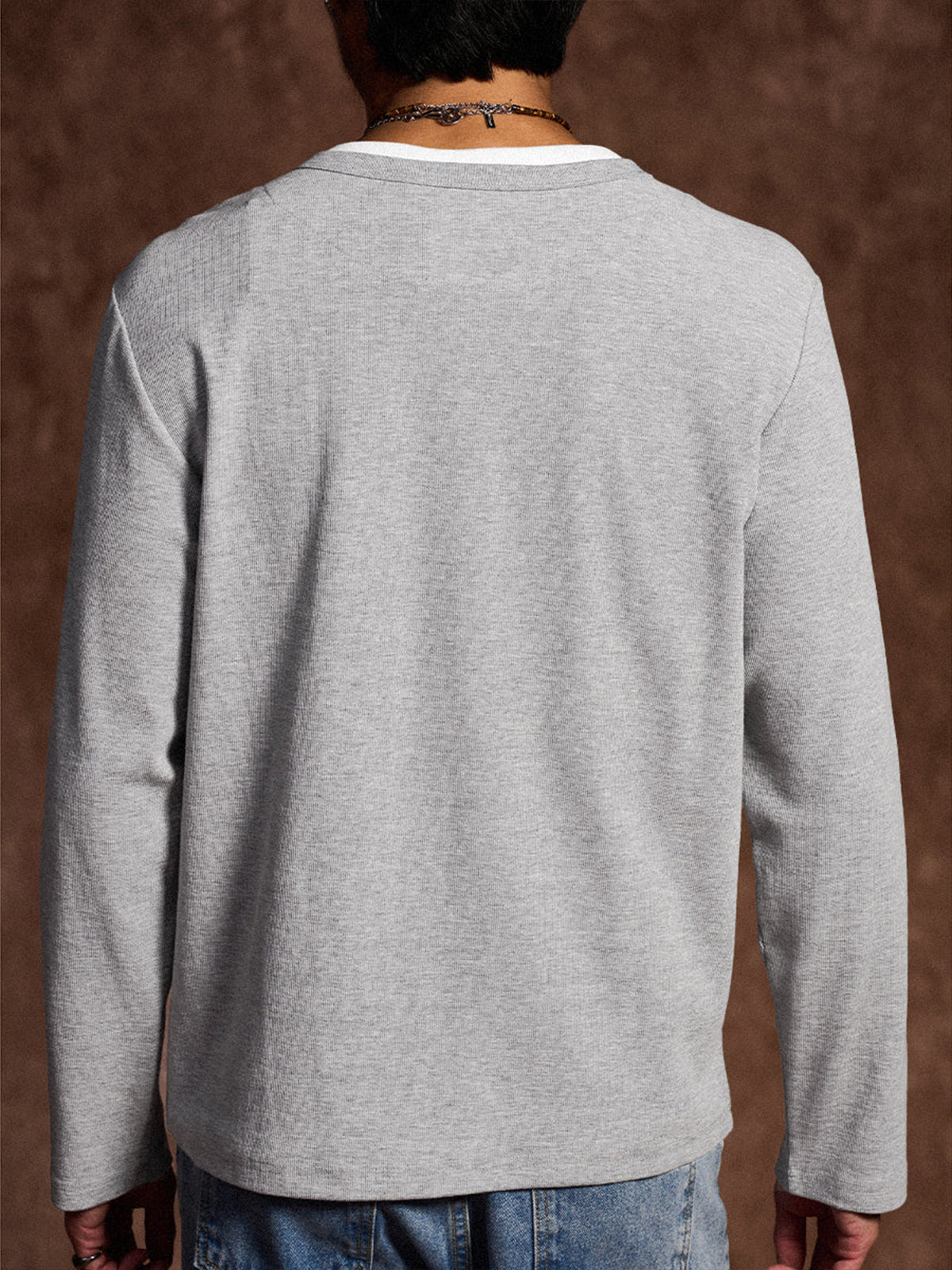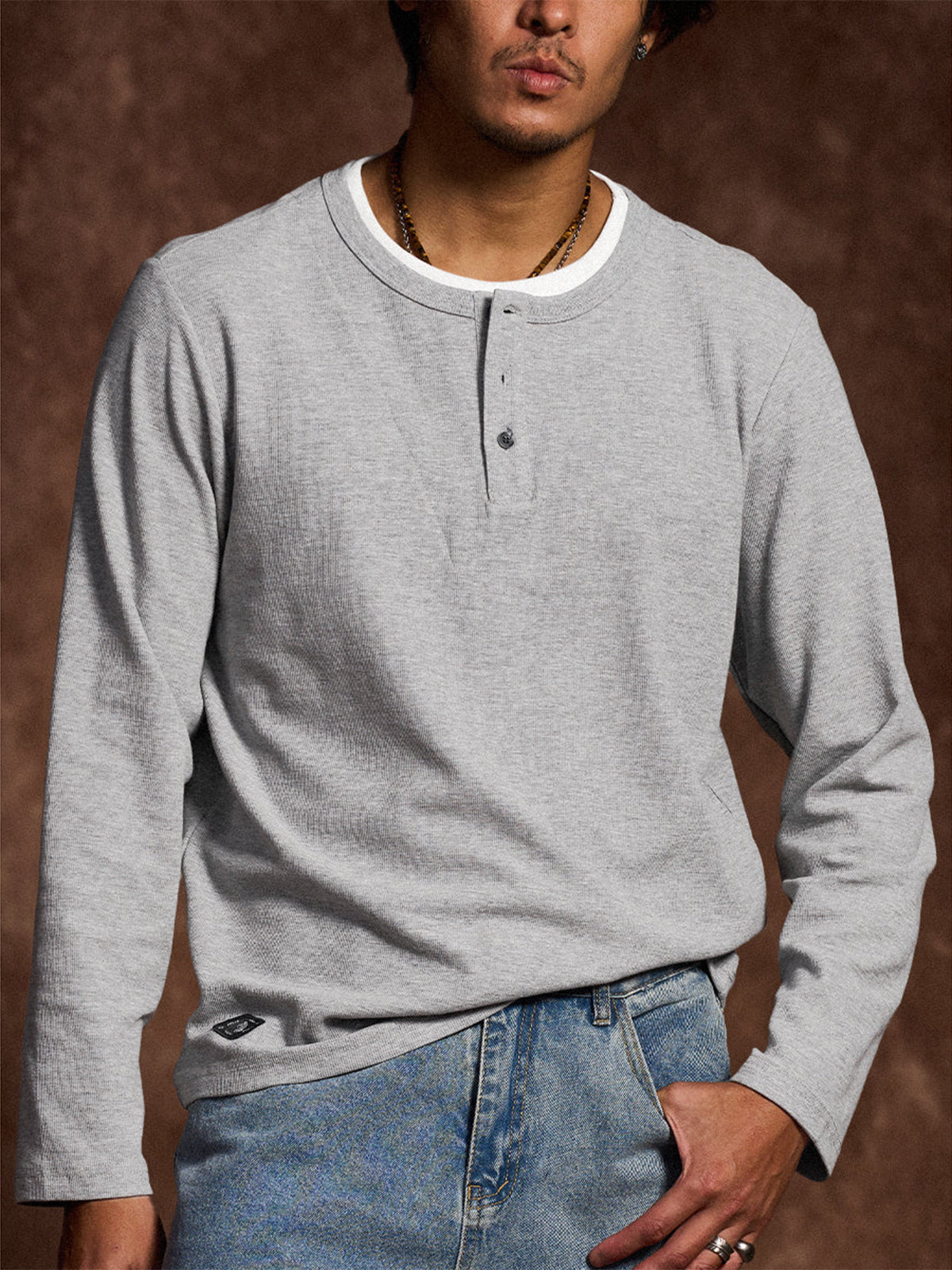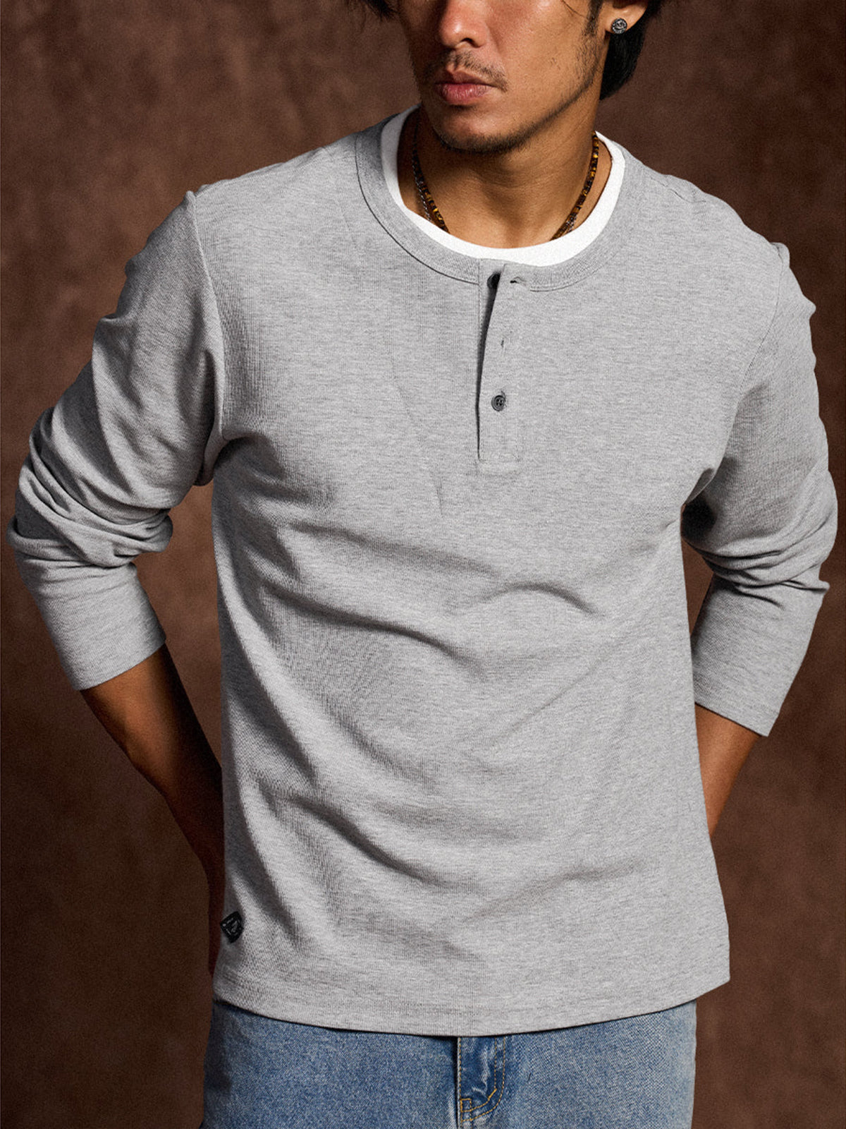 This Henley long-sleeve T-shirt features a faux layered design with a sewn-in white inner panel at the neckline, giving the appearance of a layered outfit without the bulk. The classic Henley neck with a three-button closure adds a stylish and refined touch. Available in navy and gray with a vintage-inspired tone, it pairs effortlessly with various bottoms.