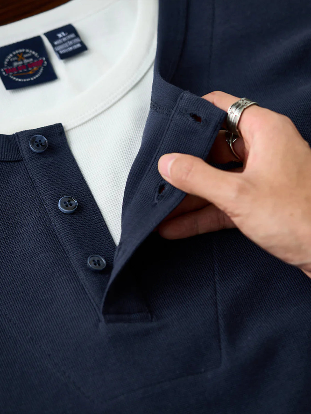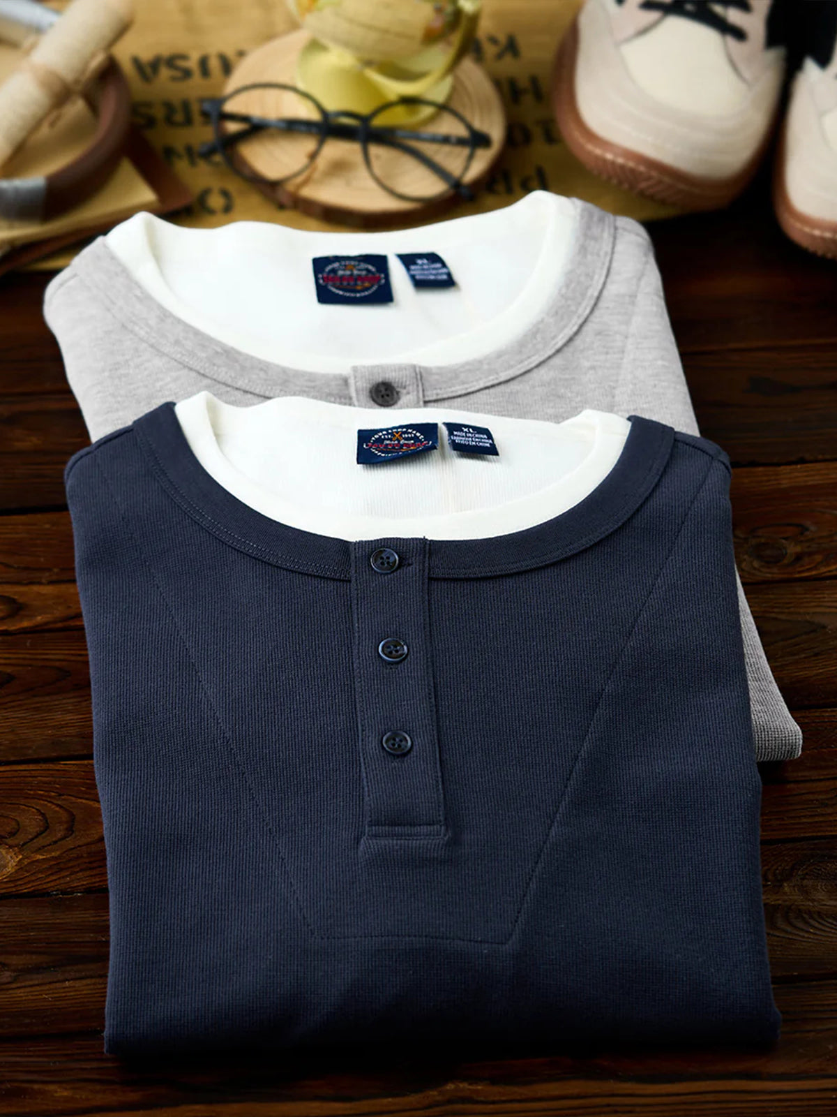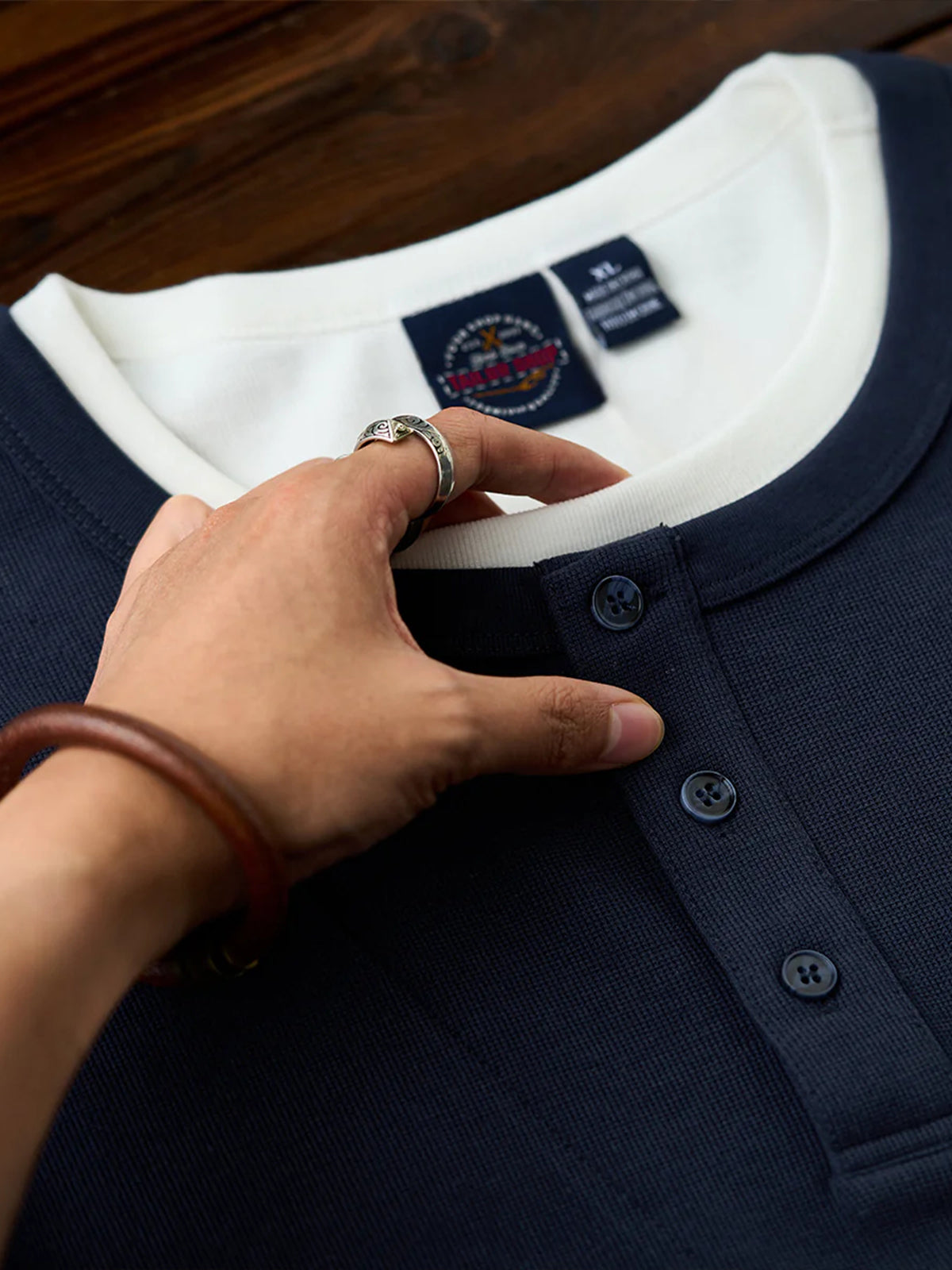 This Henley long-sleeve T-shirt features a faux layered design with a sewn-in white inner panel at the neckline, giving the appearance of a layered outfit without the bulk. The classic Henley neck with a three-button closure adds a stylish and refined touch. Available in navy and gray with a vintage-inspired tone, it pairs effortlessly with various bottoms.