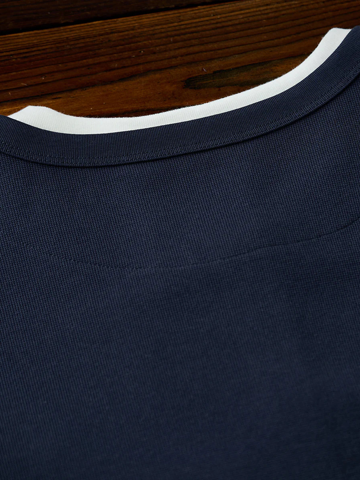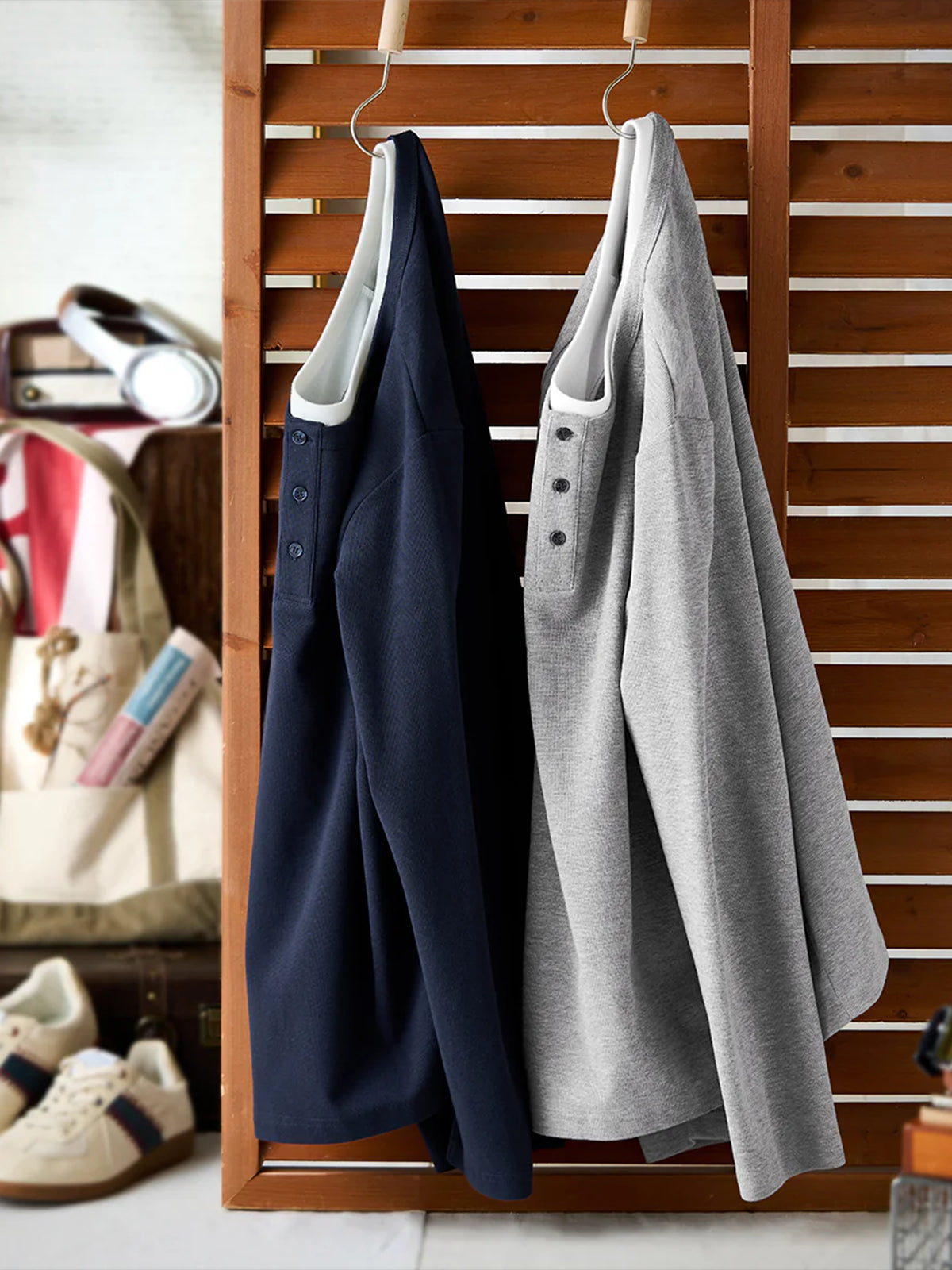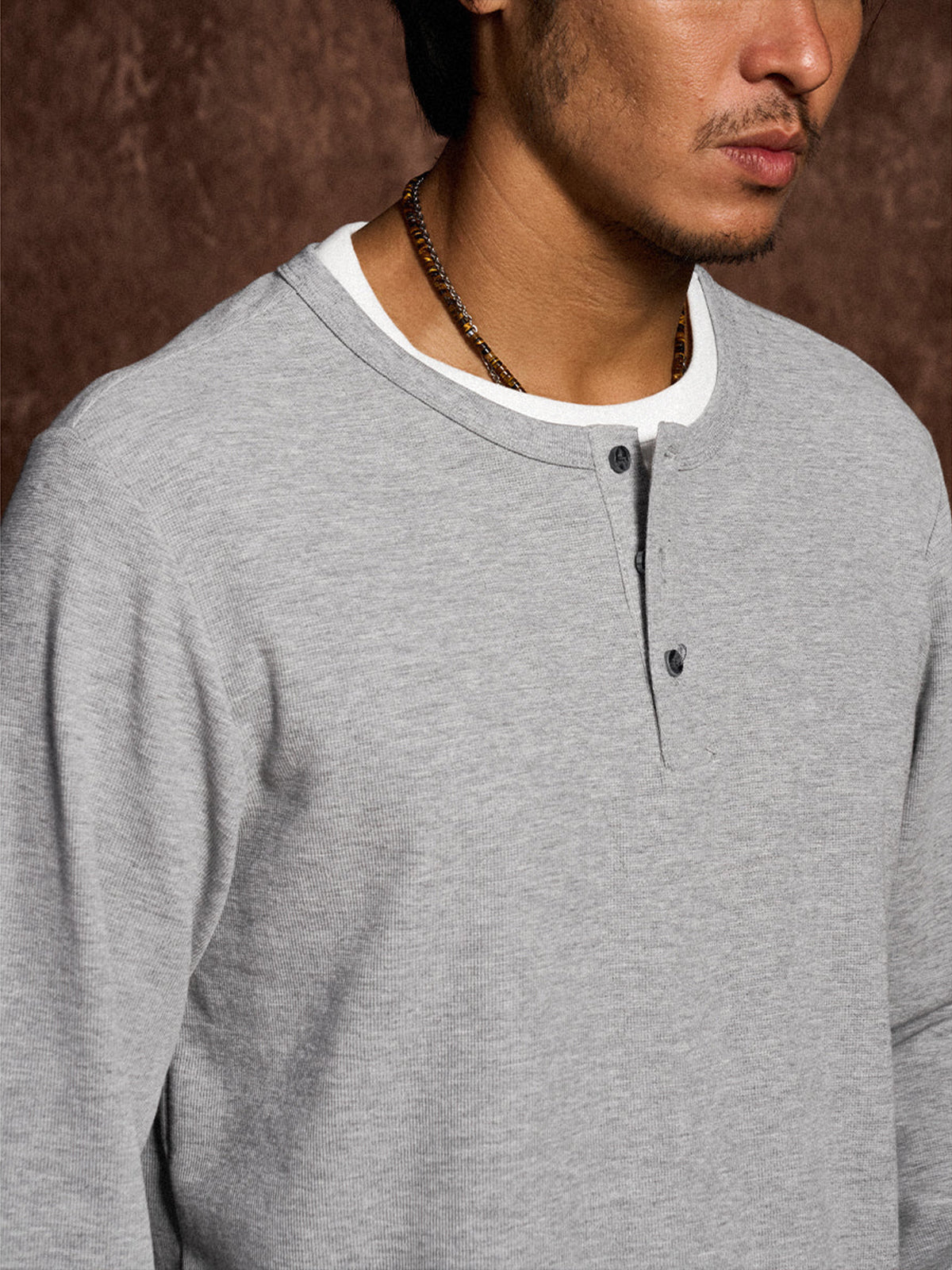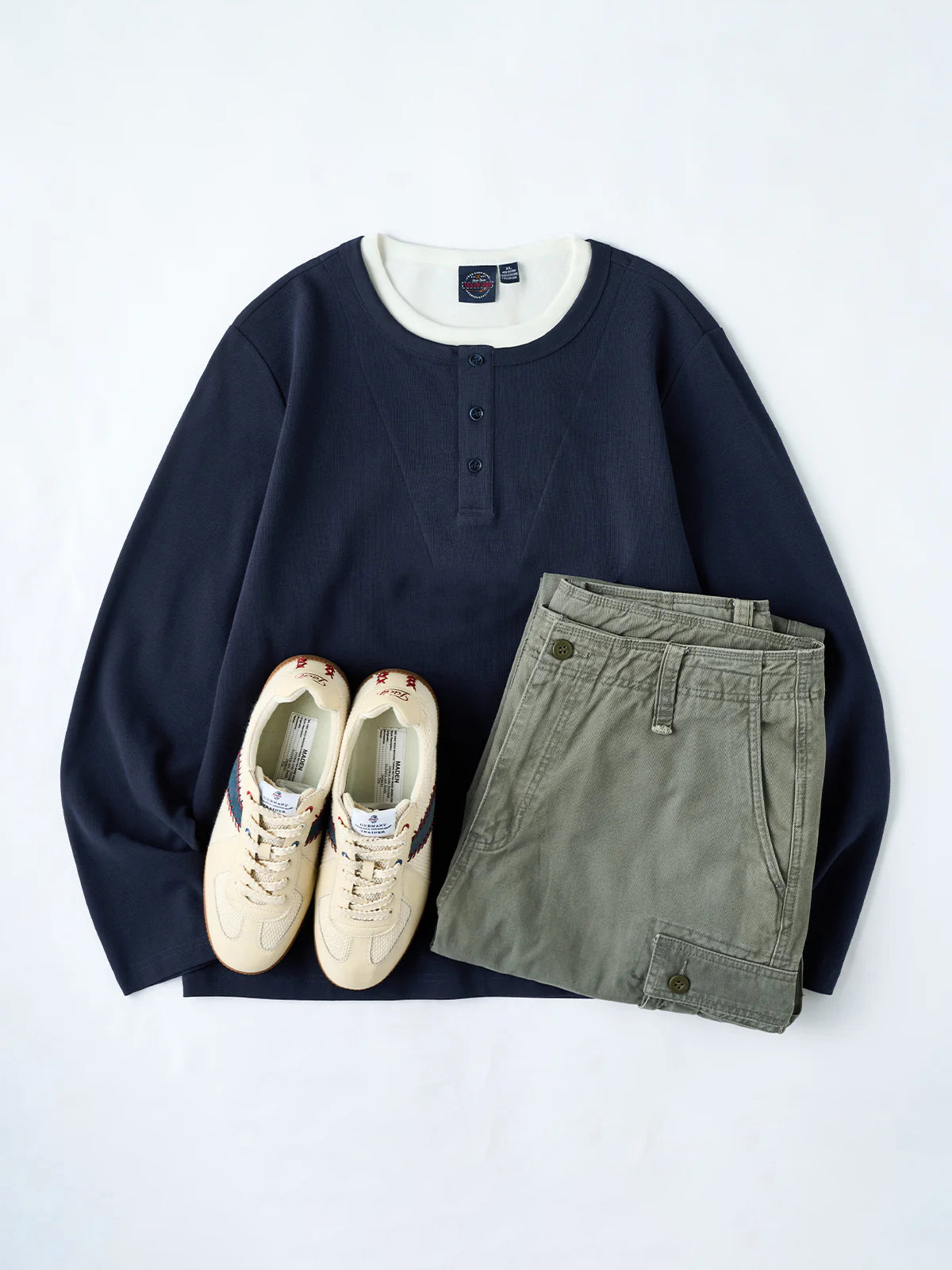 This Henley long-sleeve T-shirt features a faux layered design with a sewn-in white inner panel at the neckline, giving the appearance of a layered outfit without the bulk. The classic Henley neck with a three-button closure adds a stylish and refined touch. Available in navy and gray with a vintage-inspired tone, it pairs effortlessly with various bottoms.