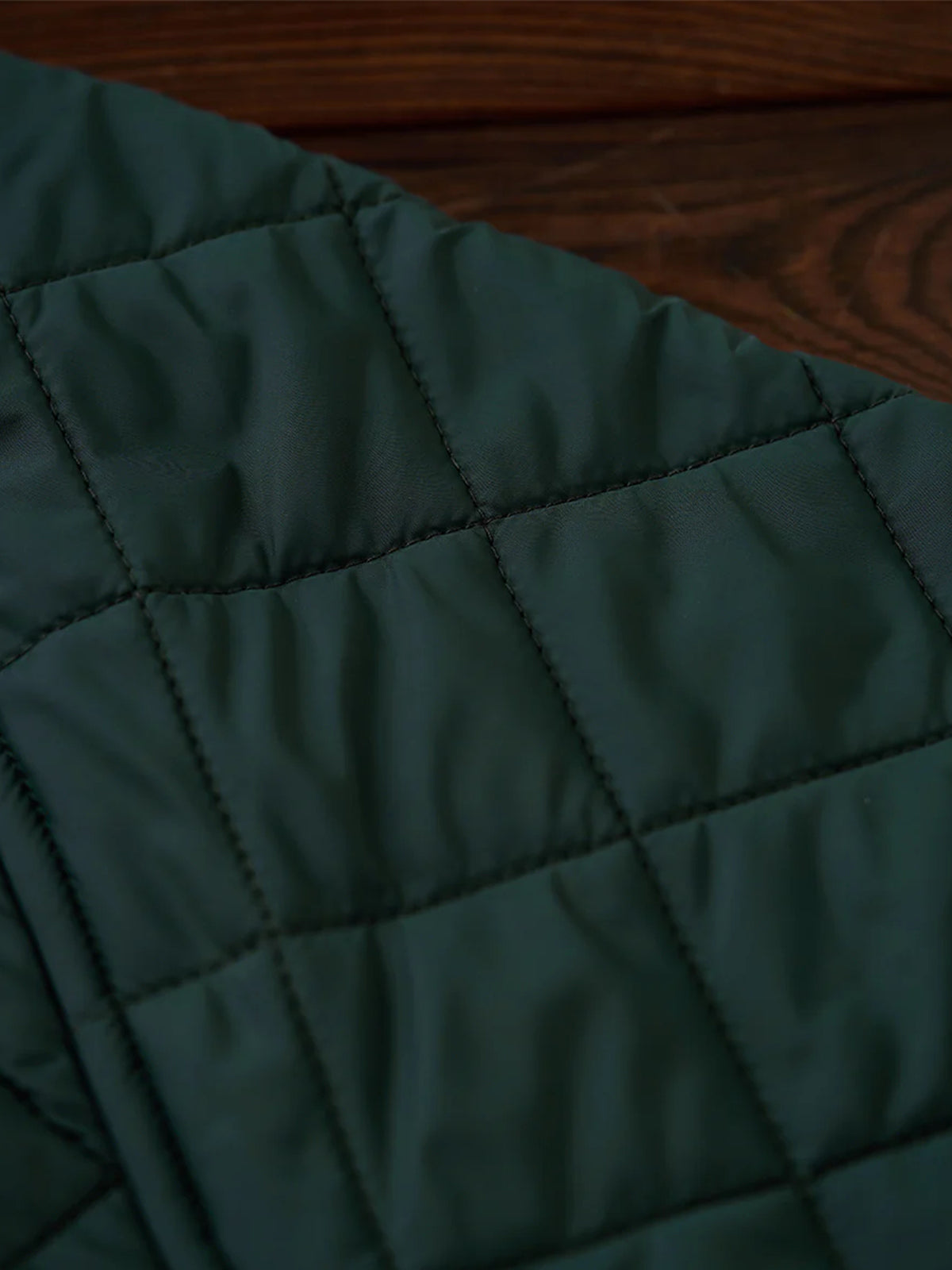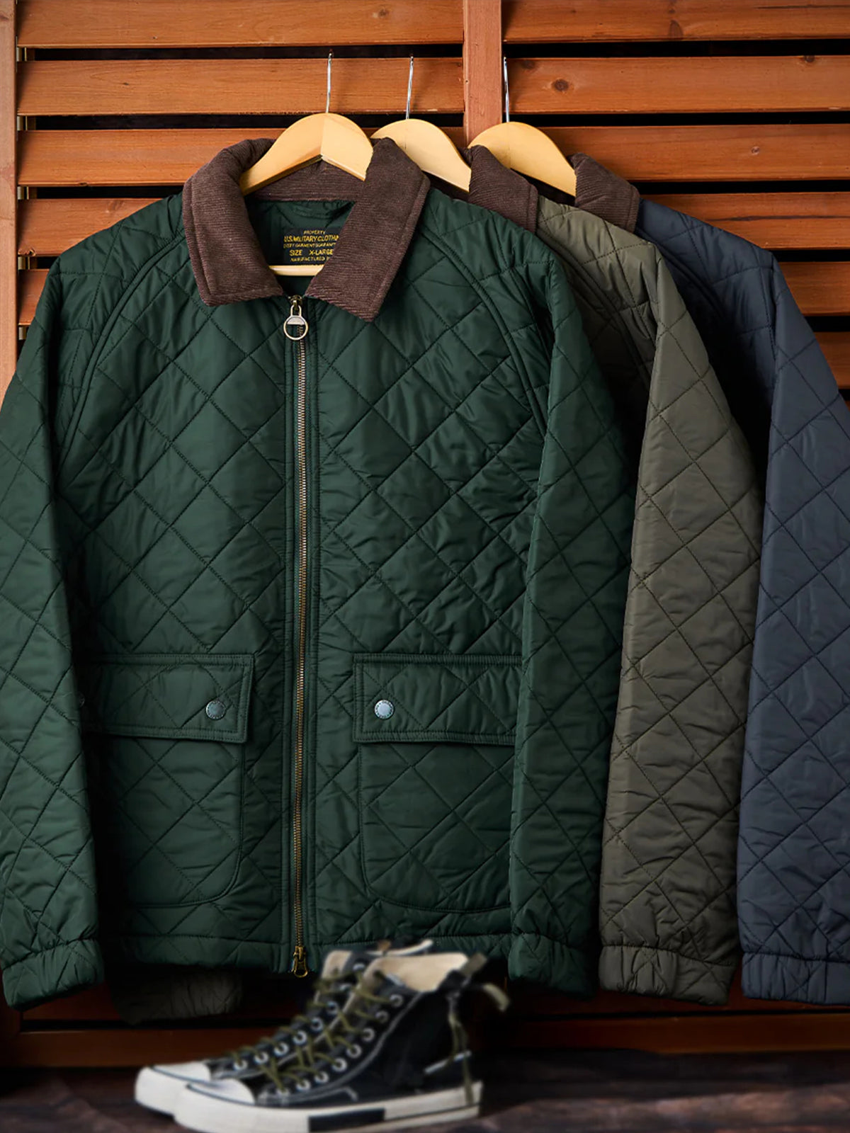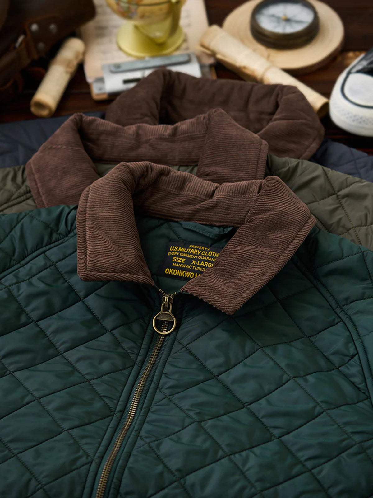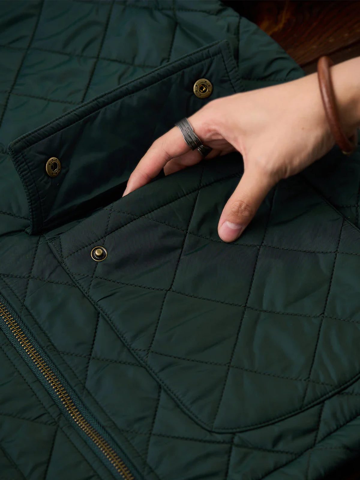 The entire surface is adorned with a diamond-shaped quilted pattern, creating a textured look that gives the jacket a stylish appearance. The diamond quilting is typically arranged with consistent size and spacing, showcasing meticulous attention to detail.