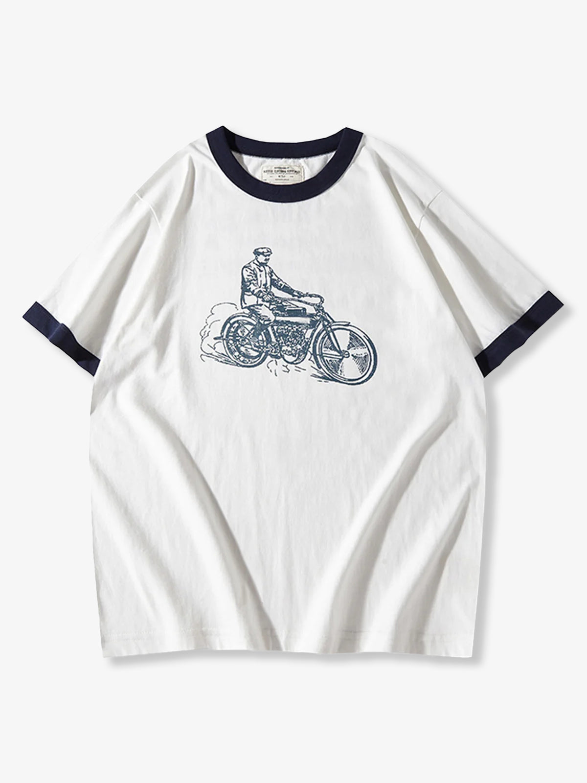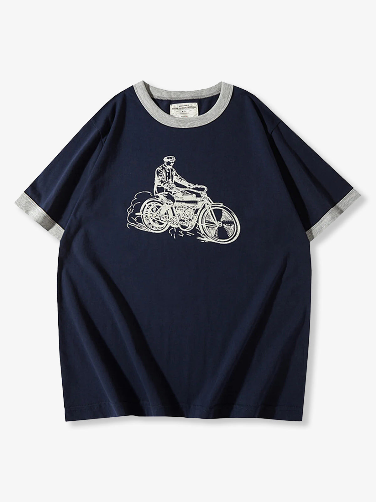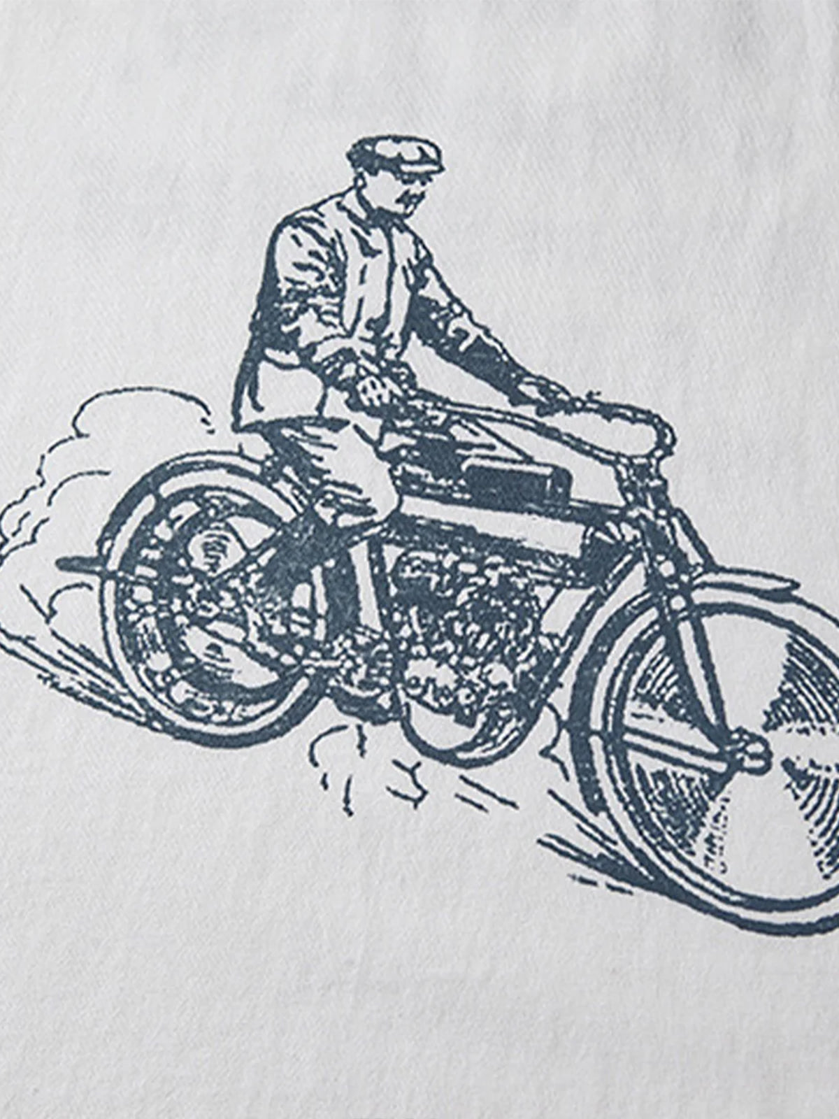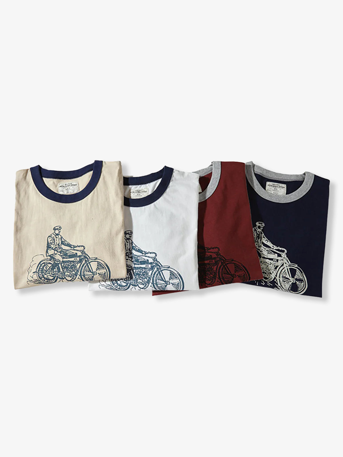 The hand-drawn style line art of a classic motorcycle and rider on the front evokes a retro atmosphere reminiscent of the early 20th century. The structure of the bike and the rider’s outfit are depicted in detail, enhancing the nostalgic mood. On the back, sans-serif text is used to create an industrial and rugged feel. The arched layout of the text forms a visual focal point of the design. Across all color variations, contrasting ribbing is used at the collar and sleeve openings, giving the overall design a sharper, more refined impression.
