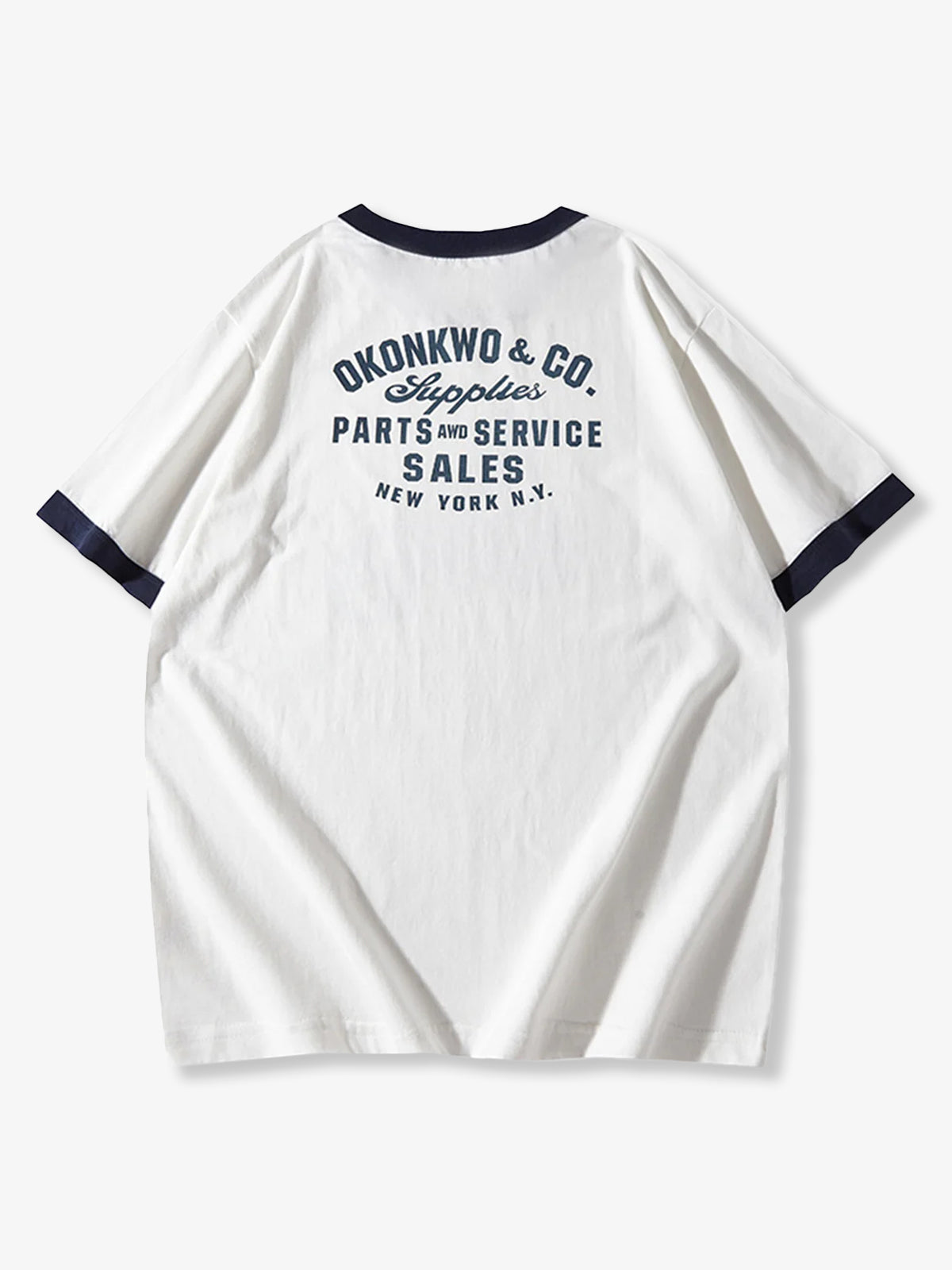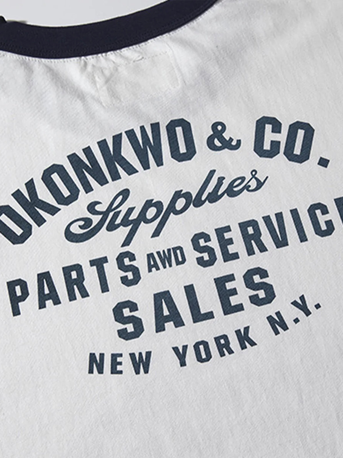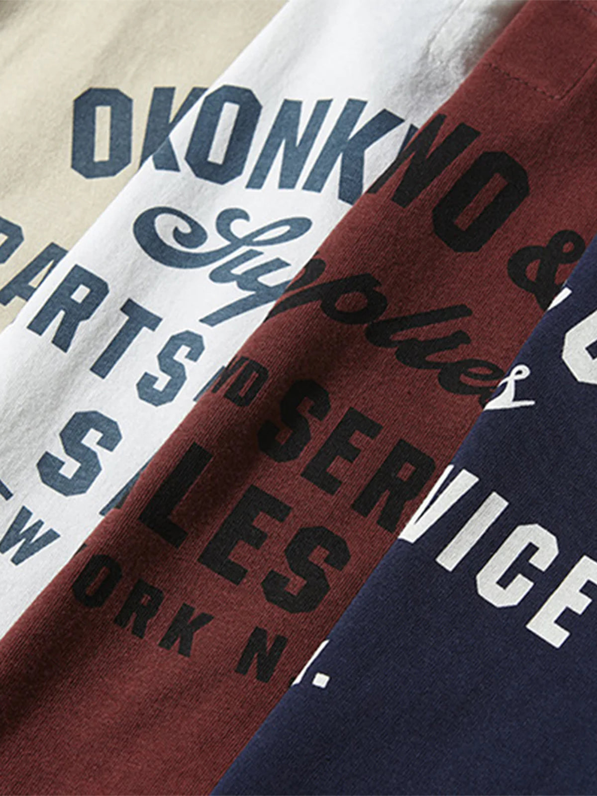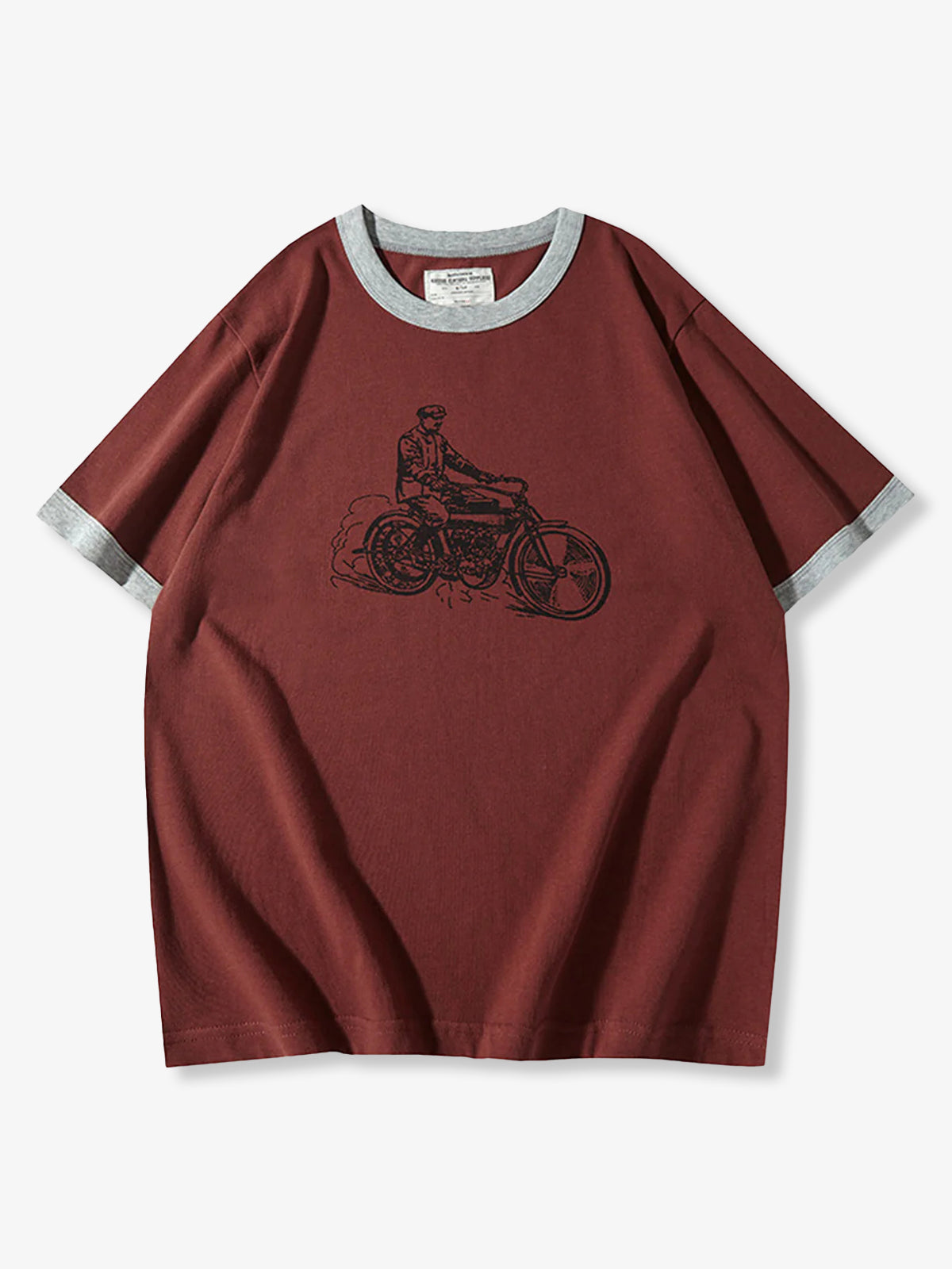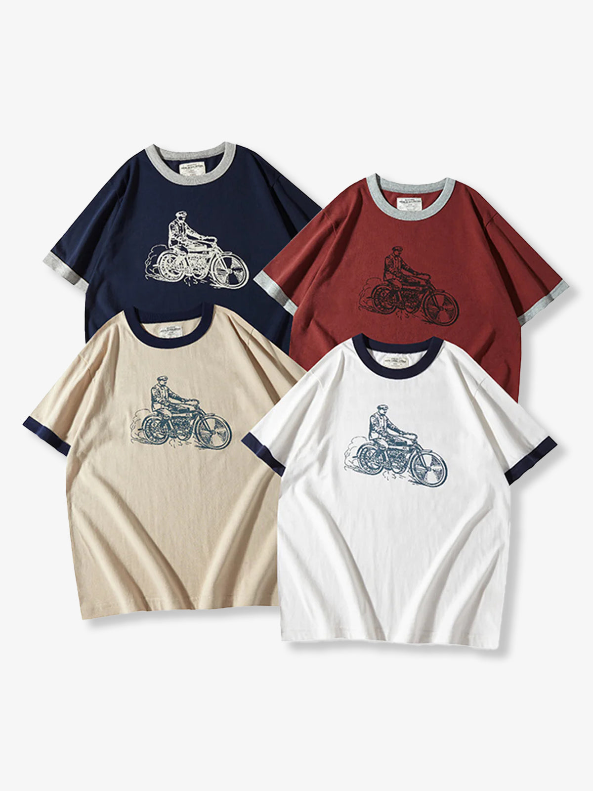 The hand-drawn style line art of a classic motorcycle and rider on the front evokes a retro atmosphere reminiscent of the early 20th century. The structure of the bike and the rider’s outfit are depicted in detail, enhancing the nostalgic mood. On the back, sans-serif text is used to create an industrial and rugged feel. The arched layout of the text forms a visual focal point of the design. Across all color variations, contrasting ribbing is used at the collar and sleeve openings, giving the overall design a sharper, more refined impression.