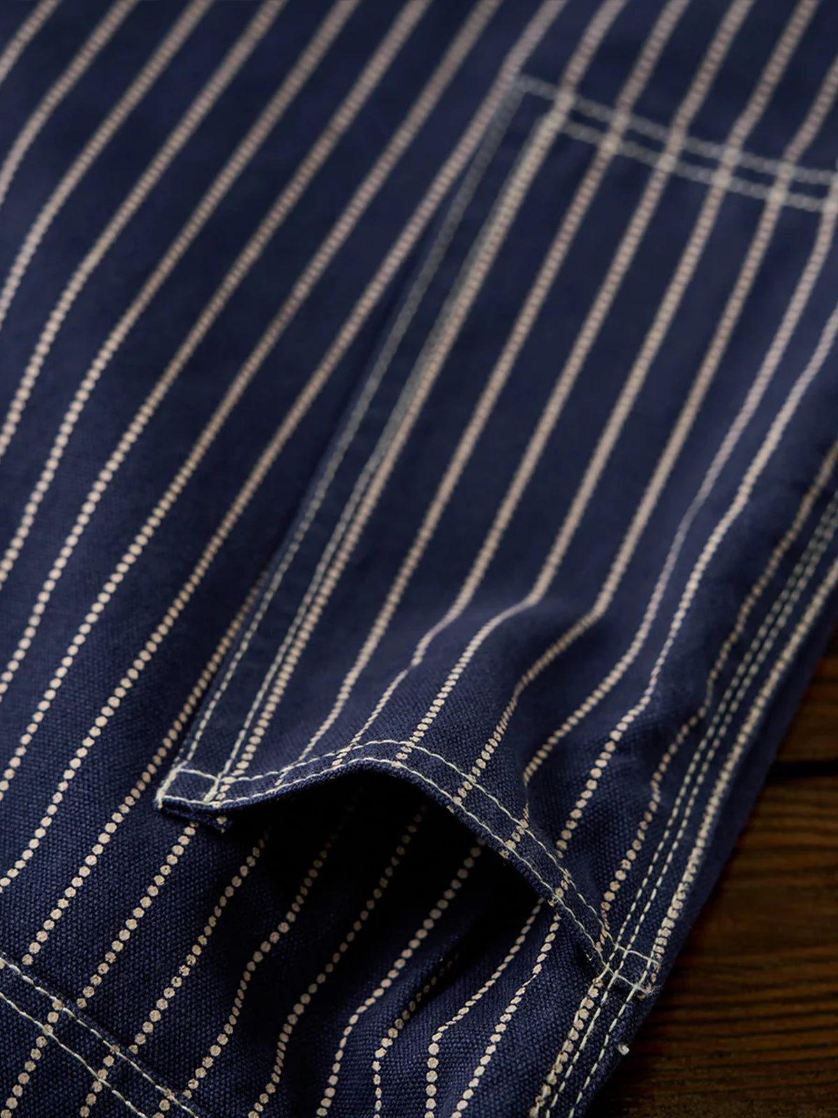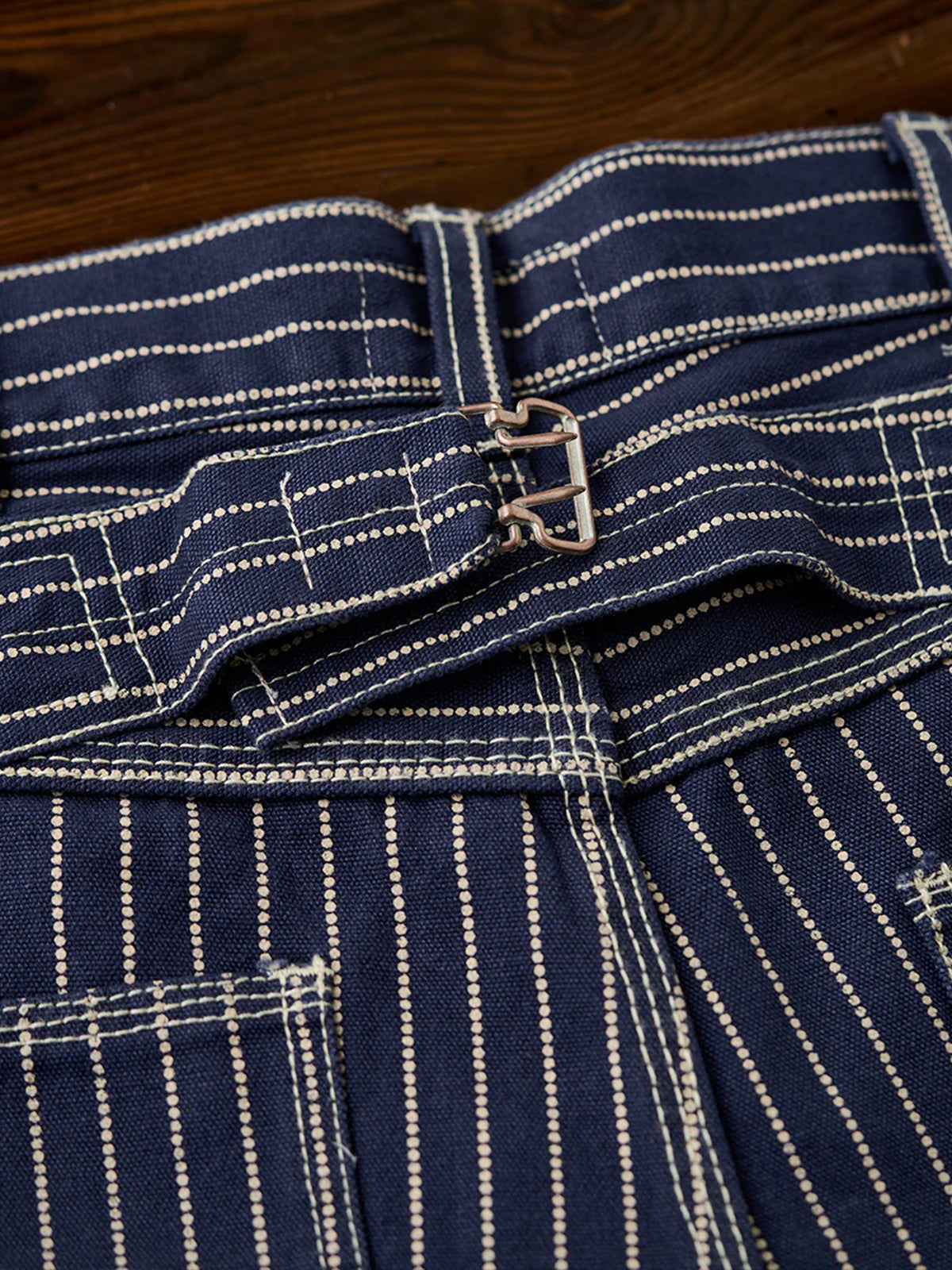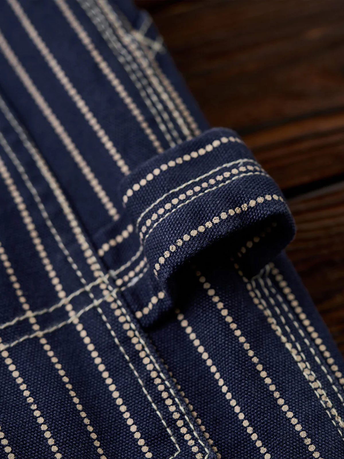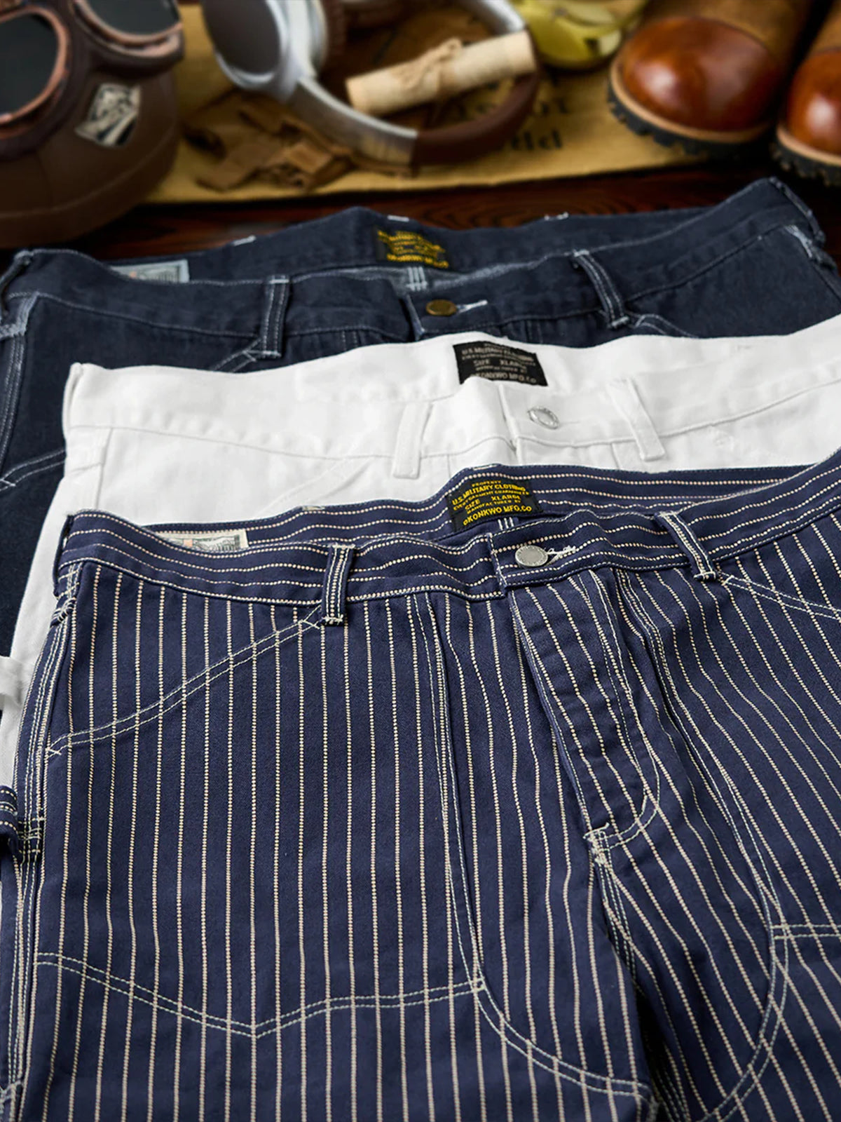 Featuring classic Wabash stripes with thin white lines on a navy background, these pants evoke the timeless feel of traditional workwear. The solid denim options offer a simple and refined look. Functional details like side tool loops emphasize utility, while visible stitching enhances durability and adds subtle design accents. Large, practical back pockets provide extra convenience.