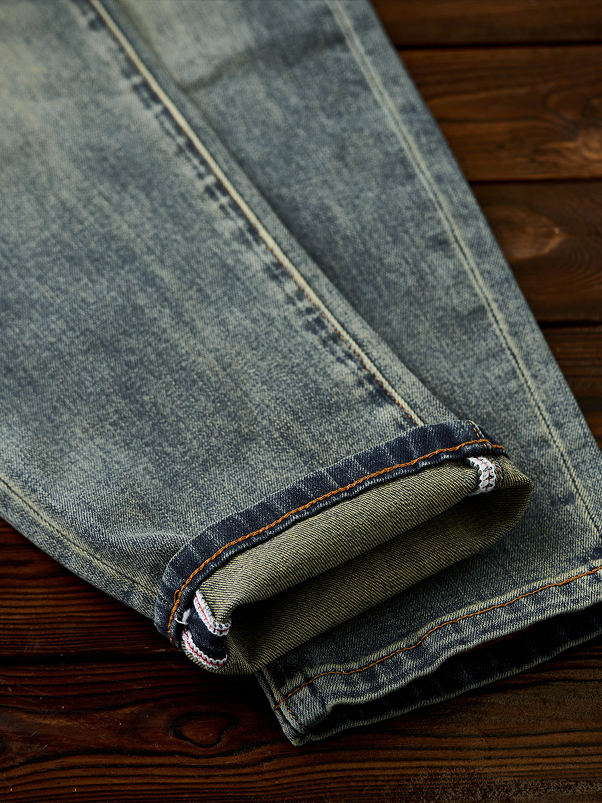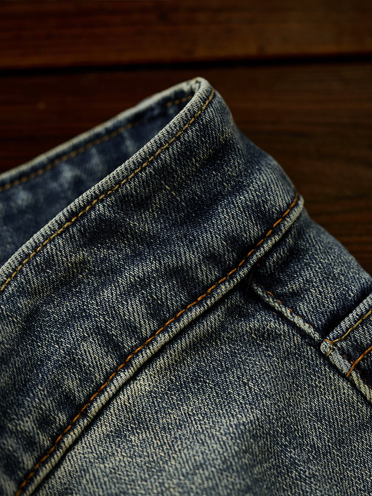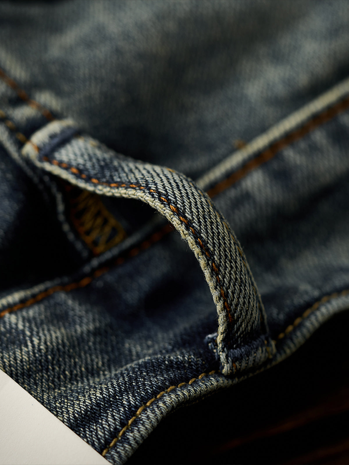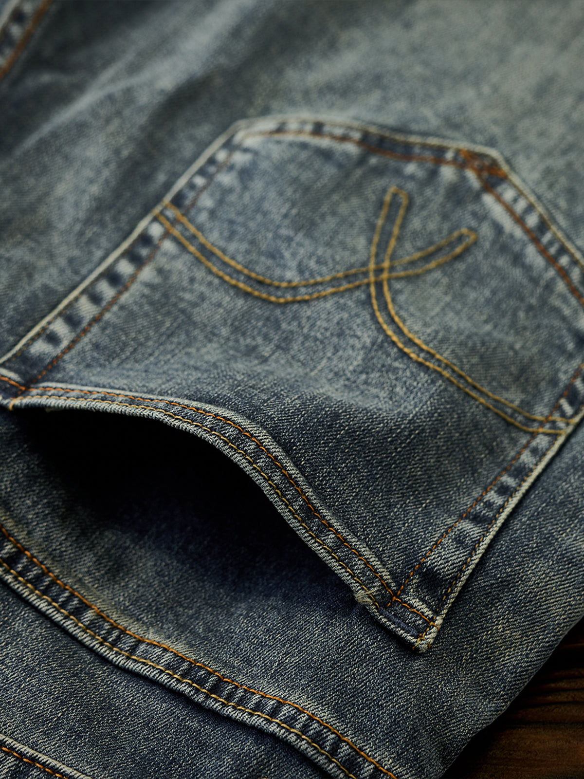 The term "Hige" (literally "beard" in Japanese) is synonymous with "whisker" in denim terminology. It refers to the hand-crafted vintage processing that replicates natural wear patterns in the beard-like creases around the hip and thigh areas. In English, "whisker" is written as whisker and originally means "facial hair."