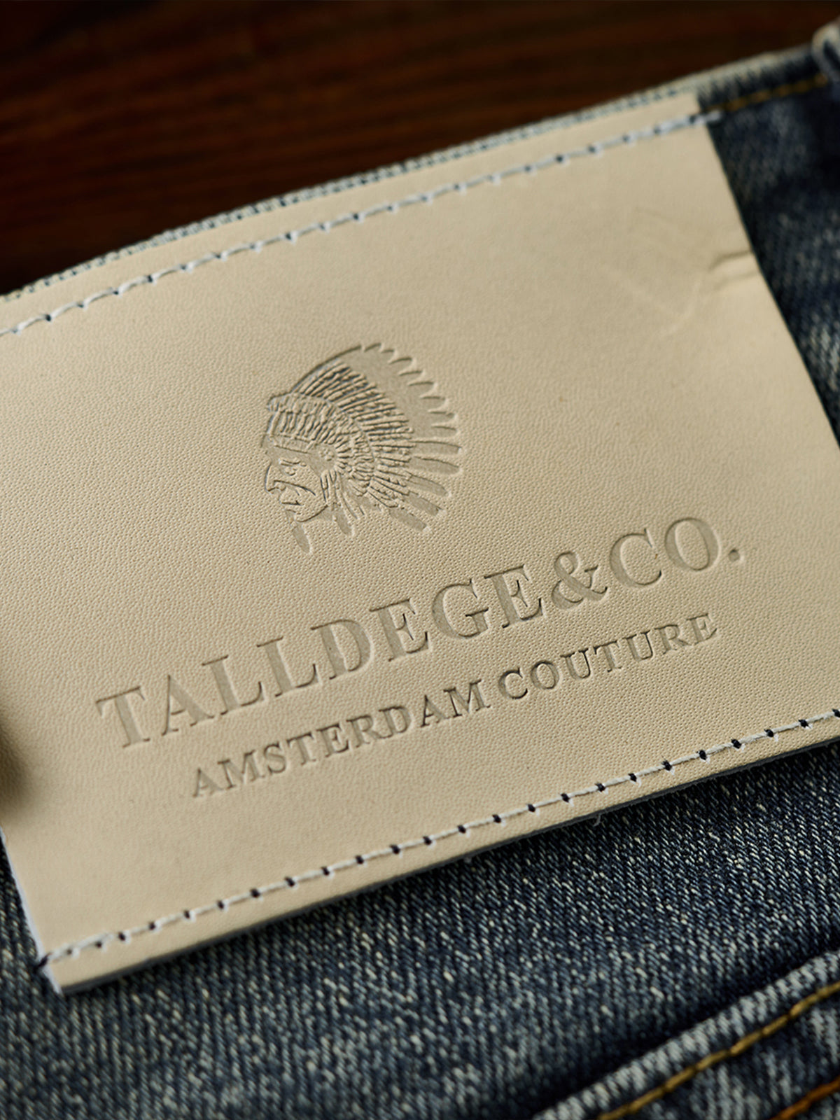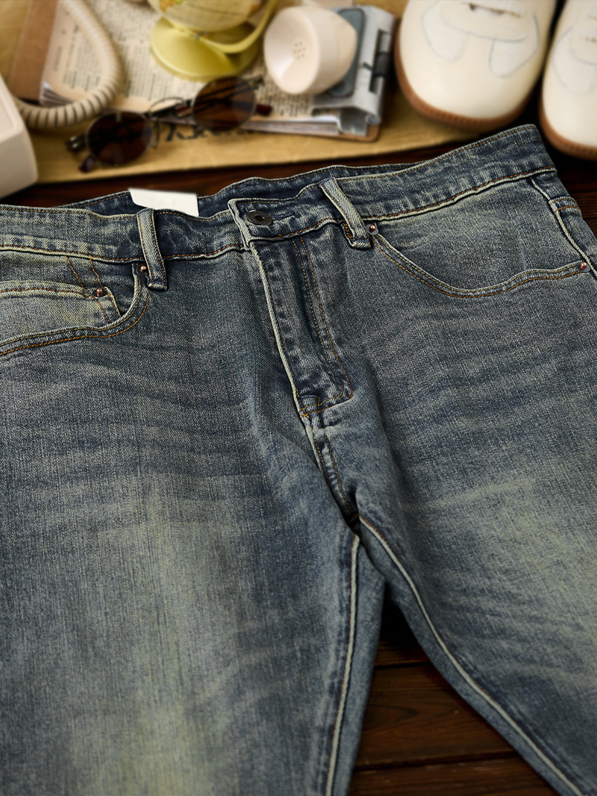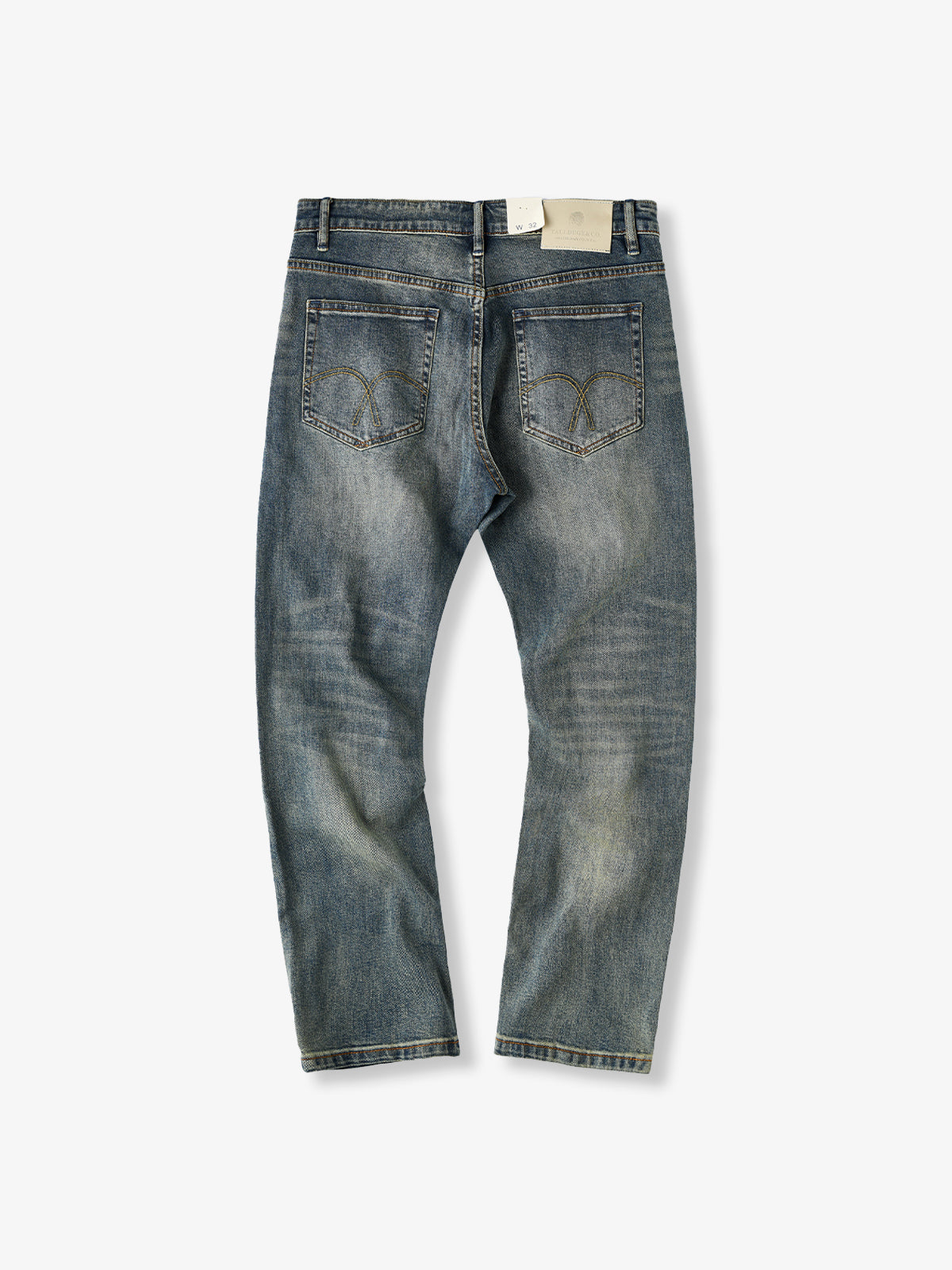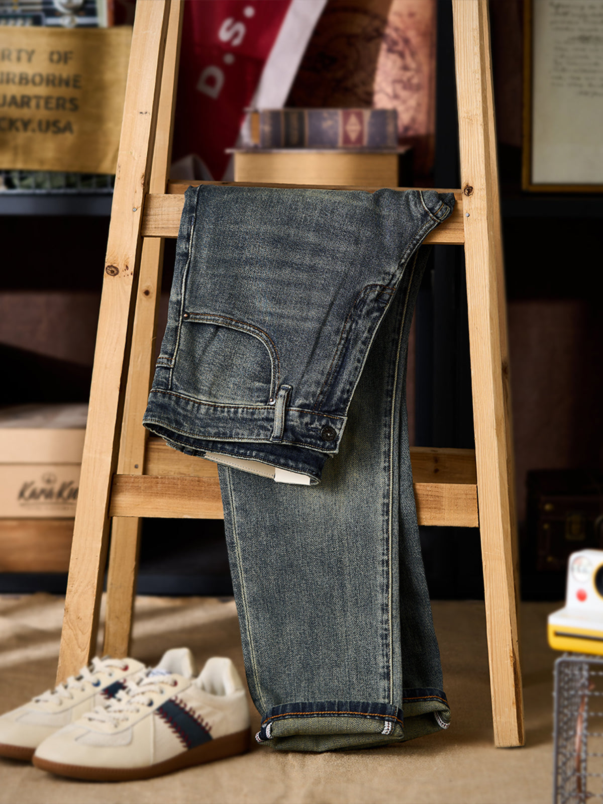 The term "Hige" (literally "beard" in Japanese) is synonymous with "whisker" in denim terminology. It refers to the hand-crafted vintage processing that replicates natural wear patterns in the beard-like creases around the hip and thigh areas. In English, "whisker" is written as whisker and originally means "facial hair."