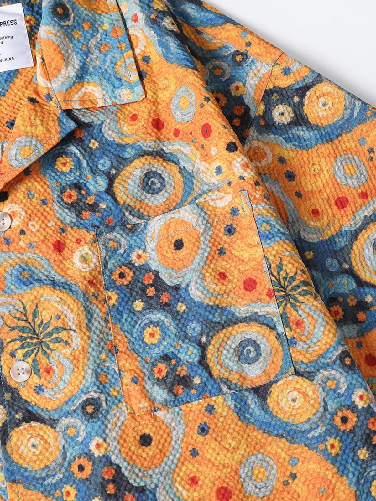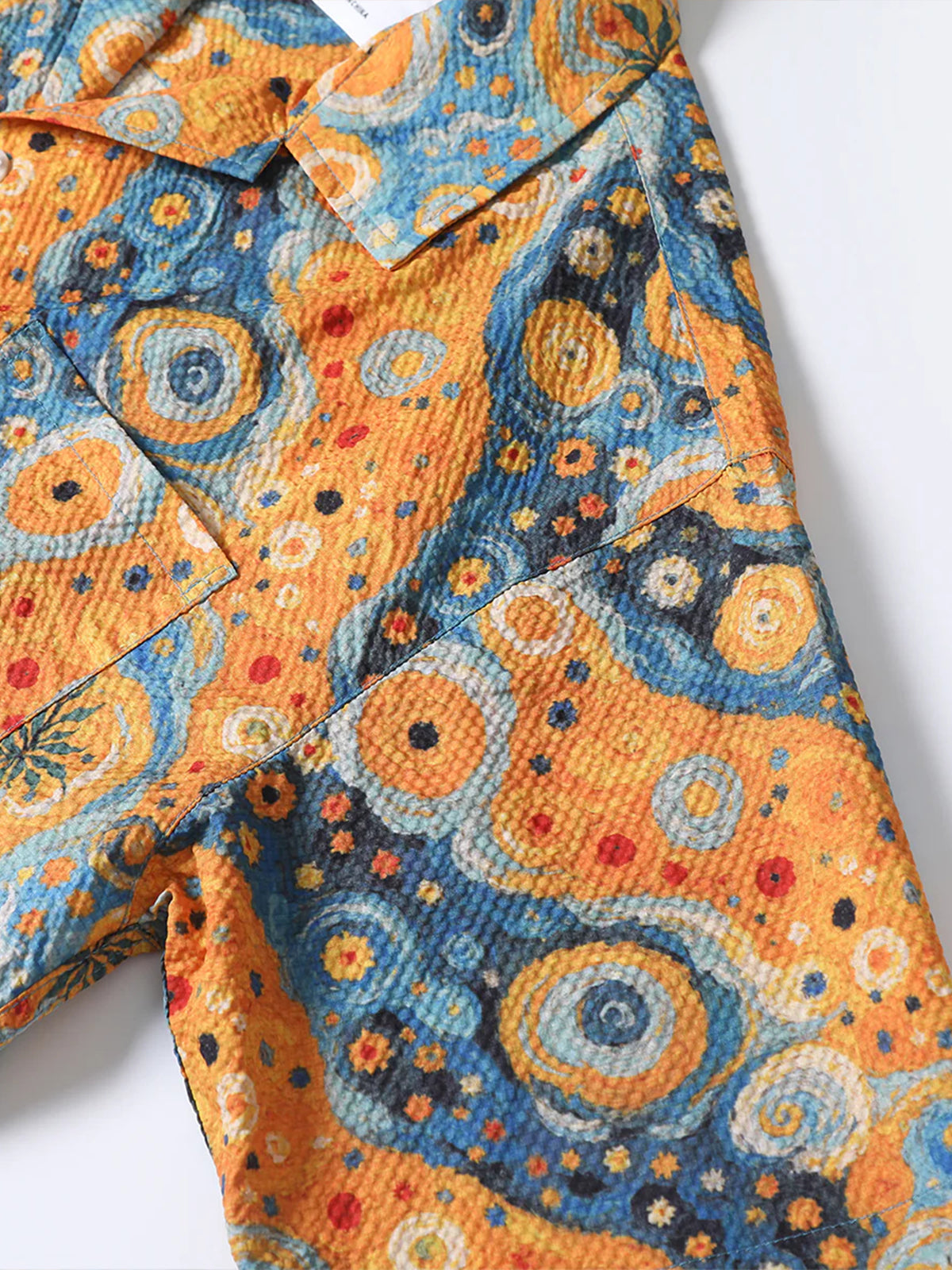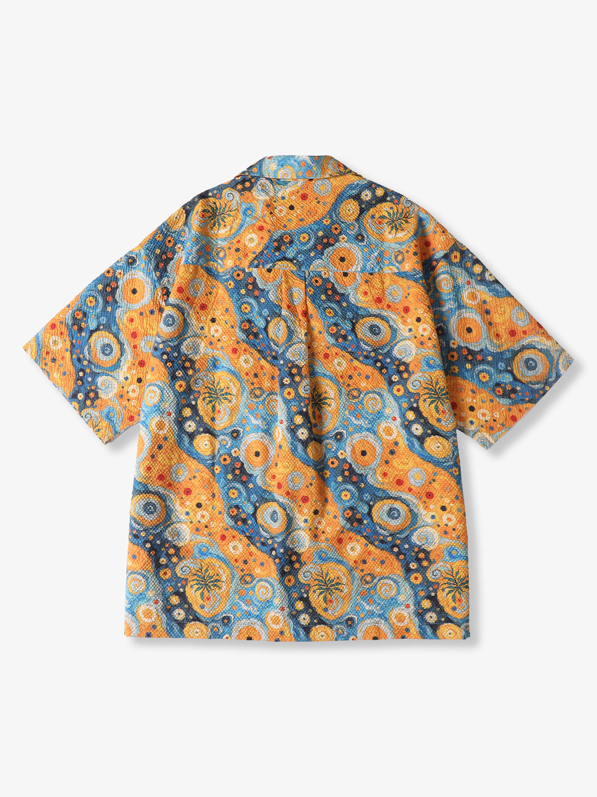 Bursting with the fresh, vibrant colors of “Summer Juice,” this aloha shirt features rhythmic abstract circle motifs that balance a playful pop look with a refined touch. Designed with an open collar for a relaxed summer vibe, it pairs effortlessly with white trousers or casual shorts, instantly elevating warm-weather outfits with personality and ease.
