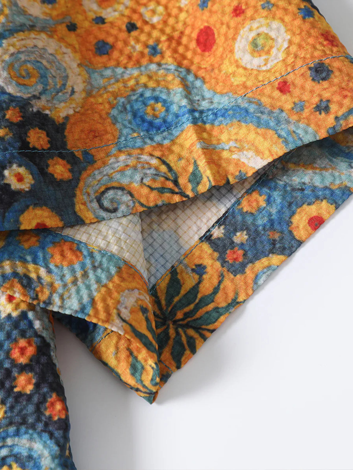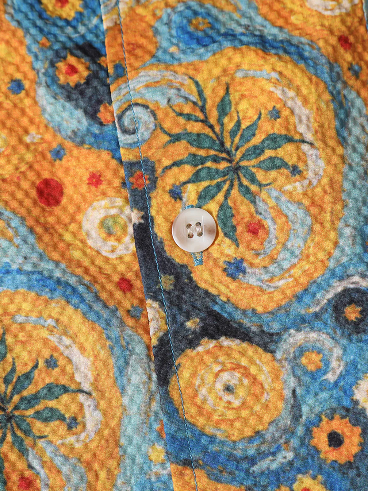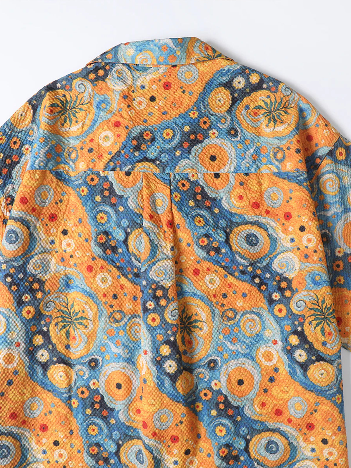 Bursting with the fresh, vibrant colors of “Summer Juice,” this aloha shirt features rhythmic abstract circle motifs that balance a playful pop look with a refined touch. Designed with an open collar for a relaxed summer vibe, it pairs effortlessly with white trousers or casual shorts, instantly elevating warm-weather outfits with personality and ease.