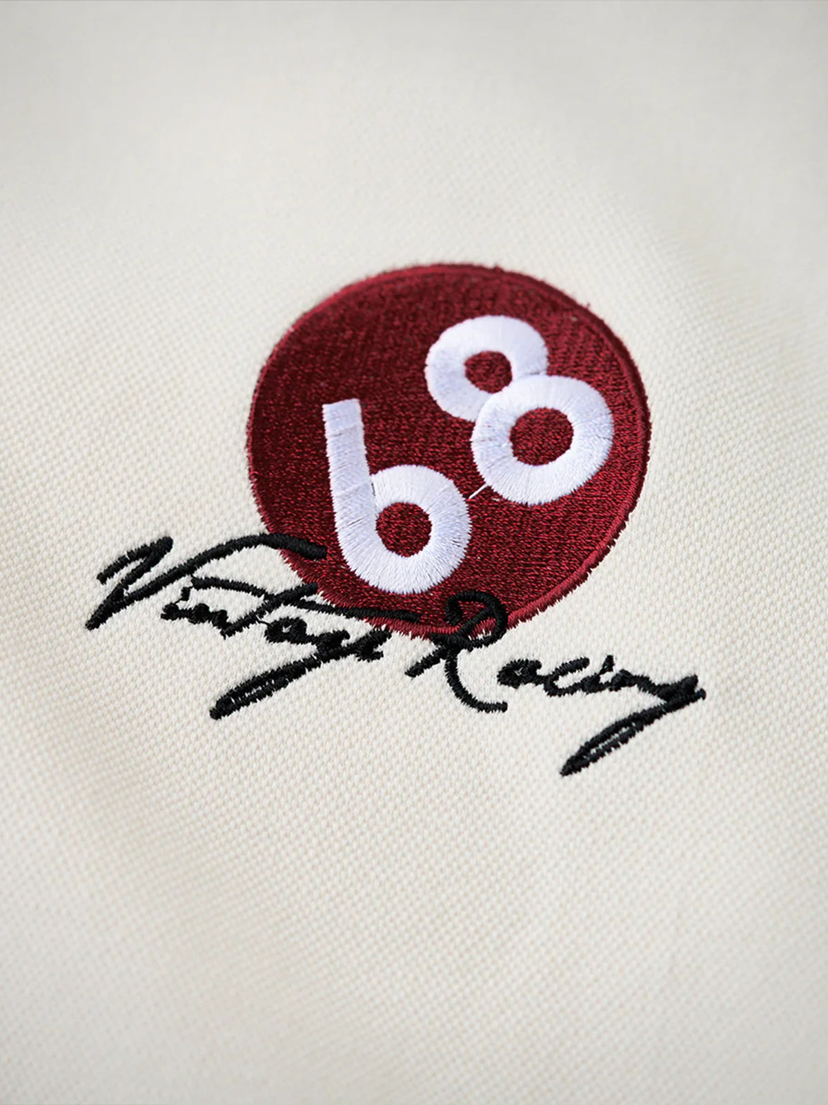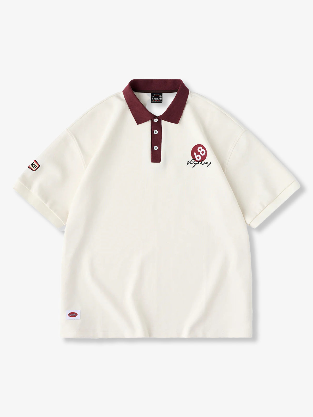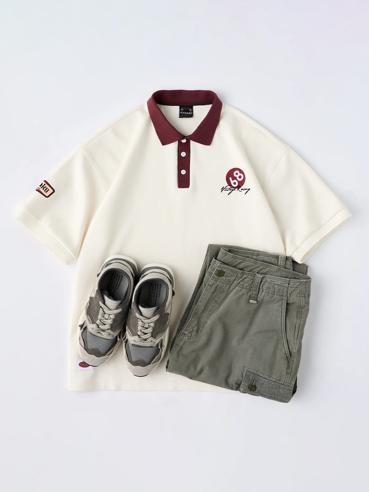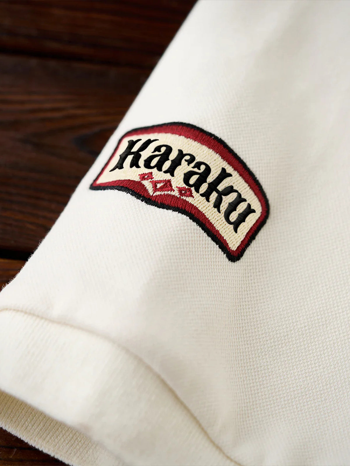 A "68 Vintage Racing" embroidery on the right chest, done in a hand-drawn style, brings a sense of speed and individuality. The sleeve is adorned with the “Karaku Plus” logo in red and black threads, standing out subtly against the natural fabric base.