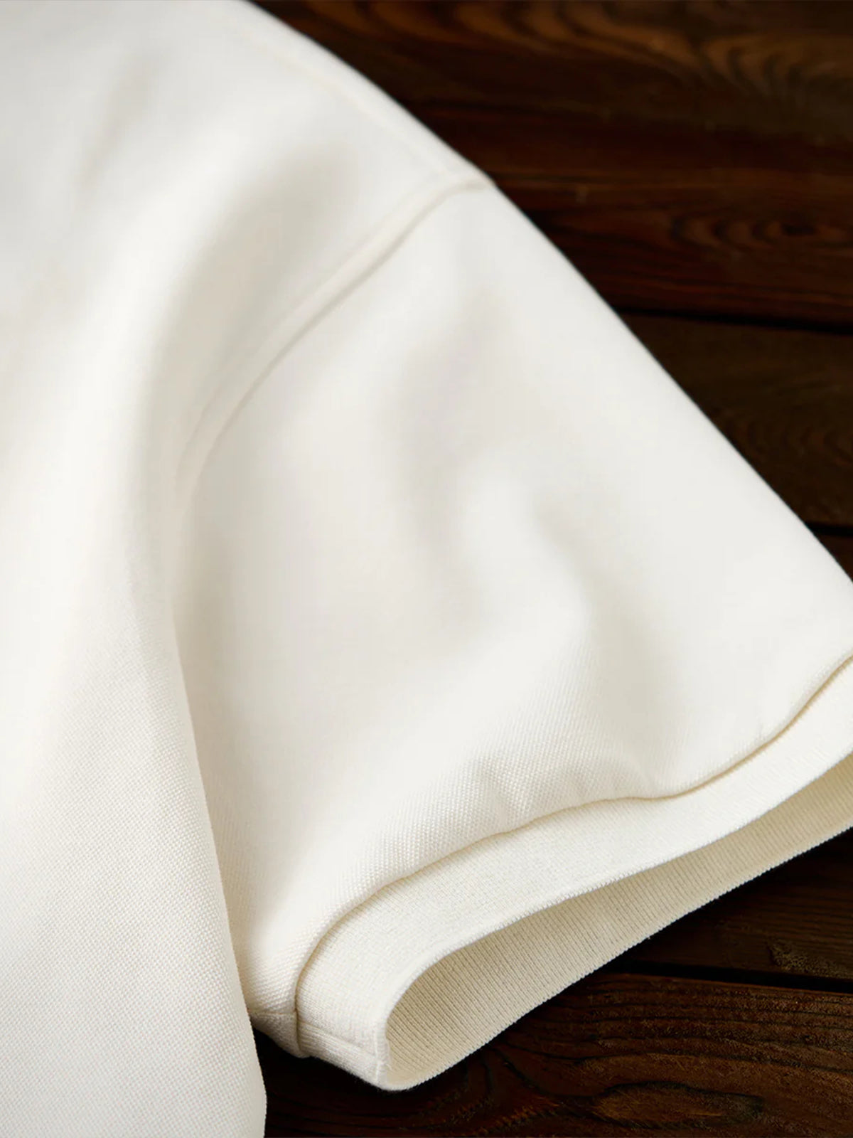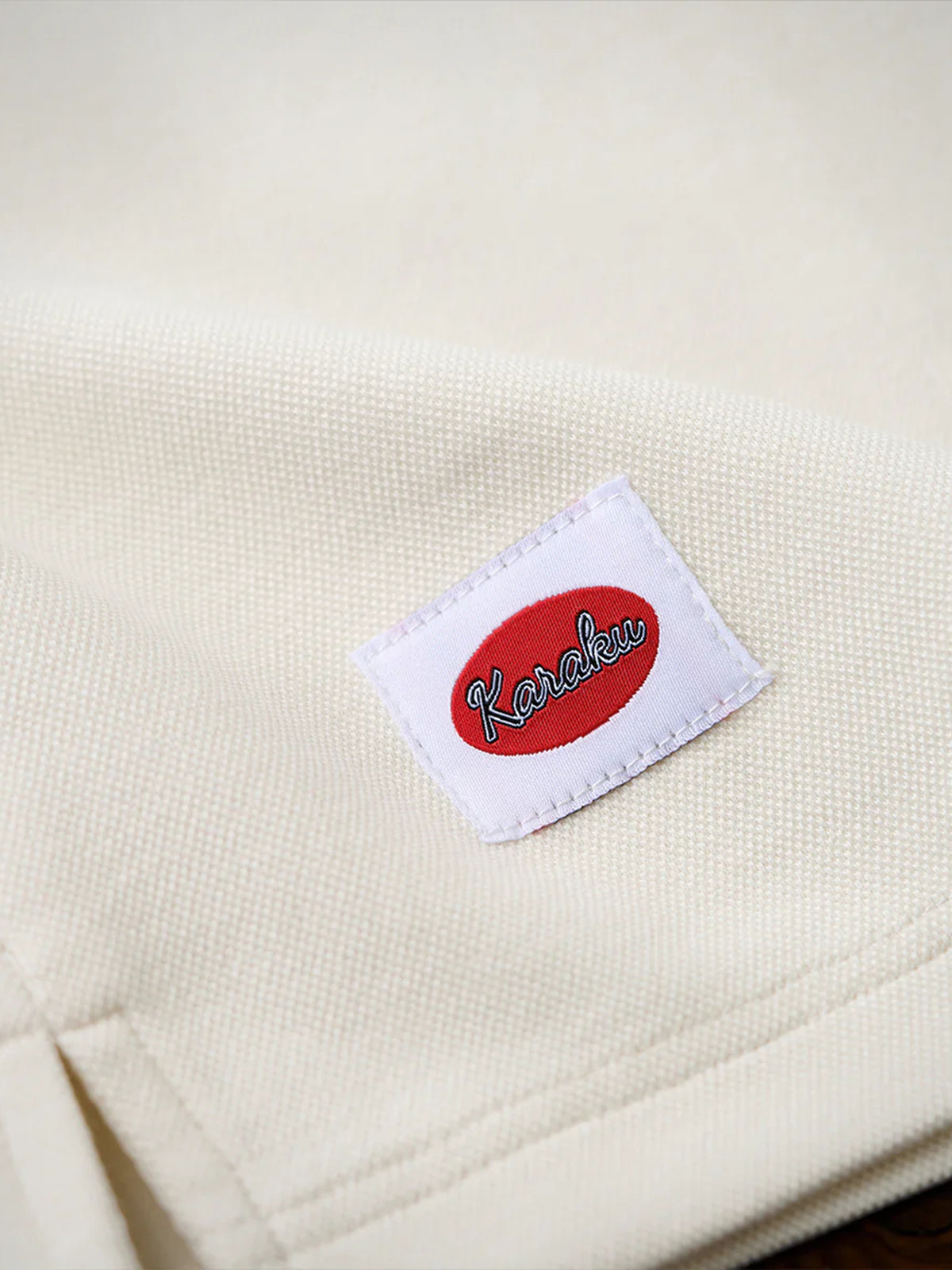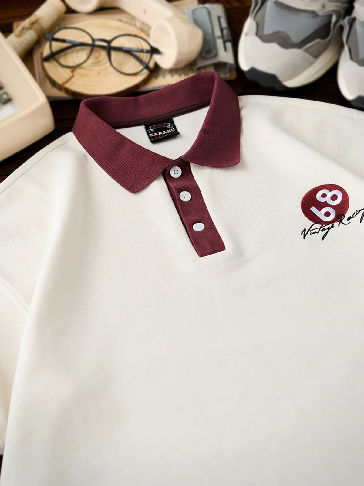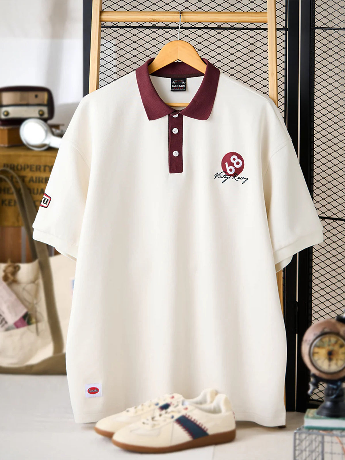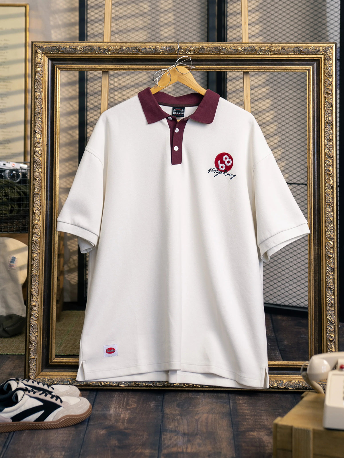A "68 Vintage Racing" embroidery on the right chest, done in a hand-drawn style, brings a sense of speed and individuality. The sleeve is adorned with the “Karaku Plus” logo in red and black threads, standing out subtly against the natural fabric base.