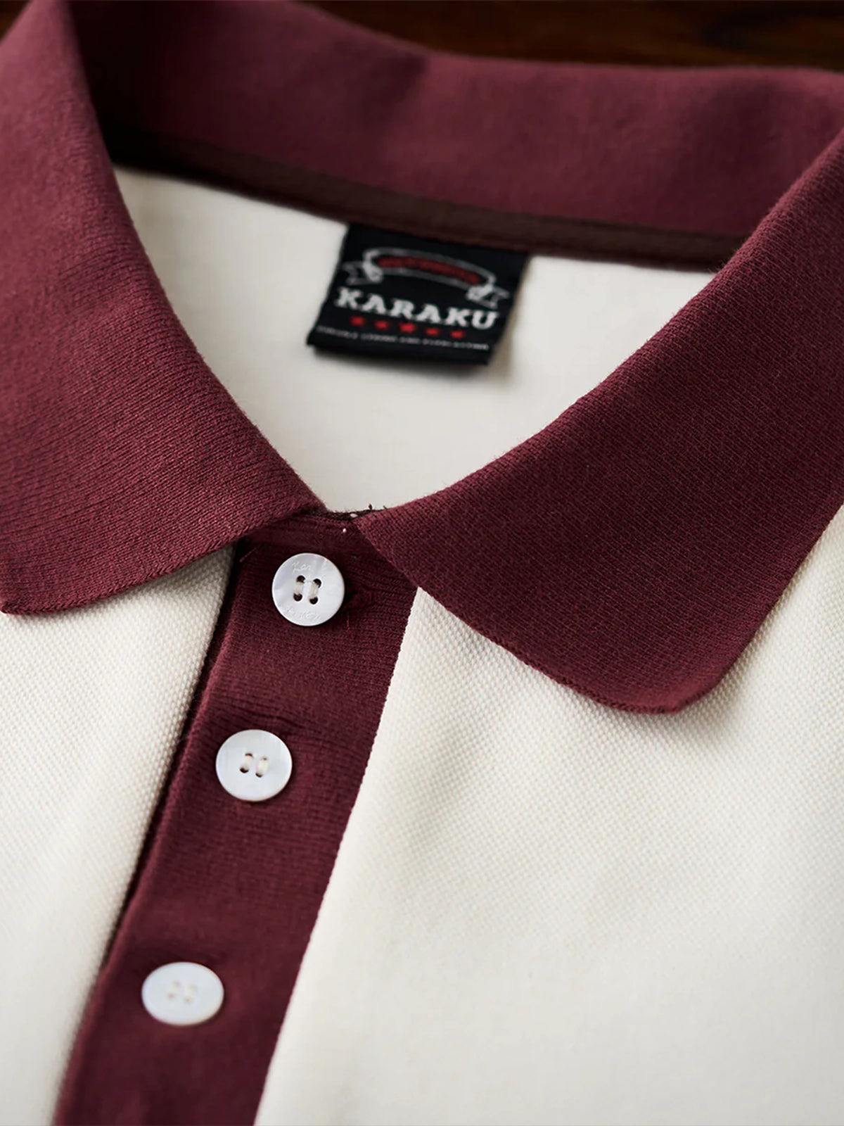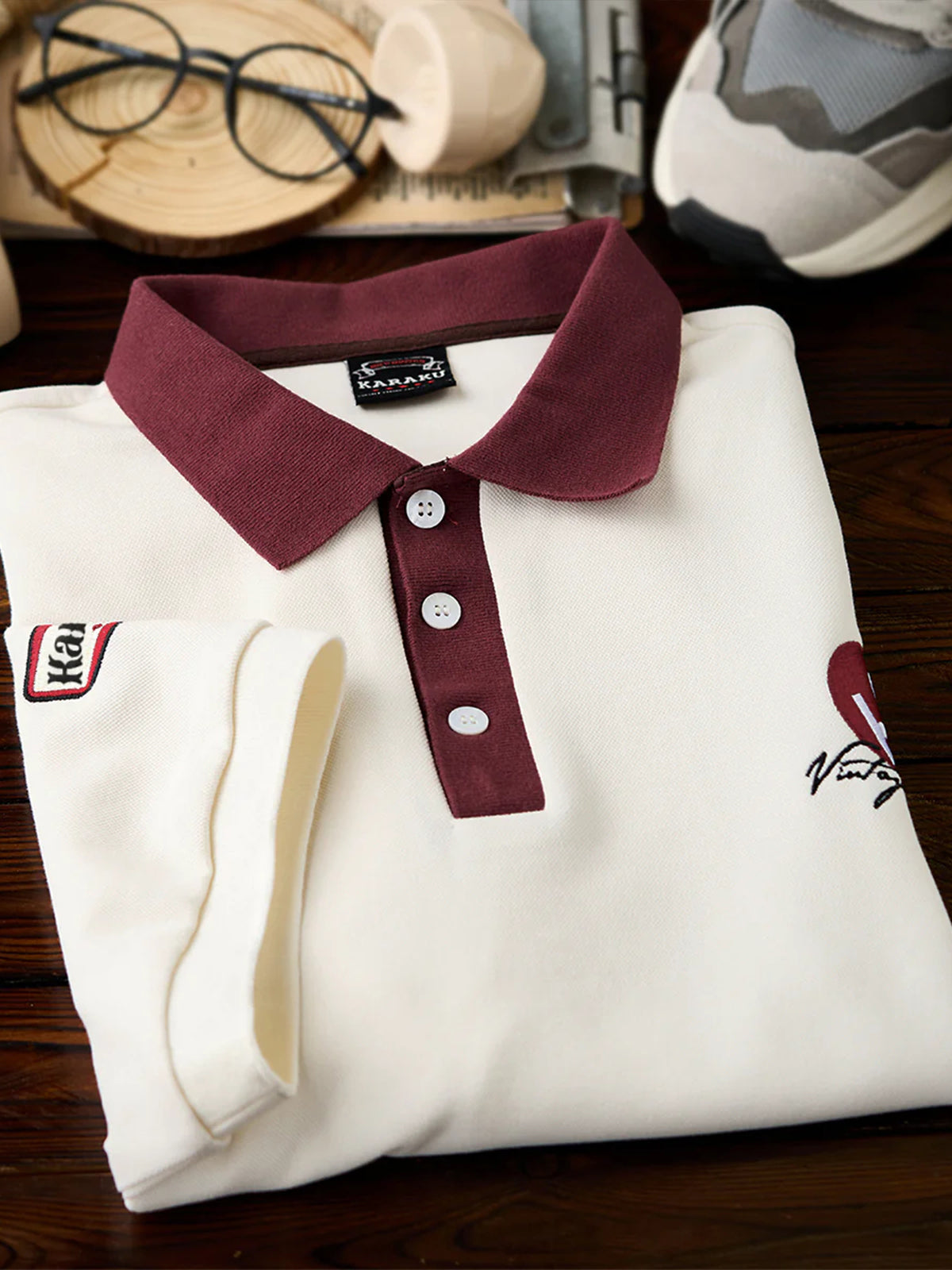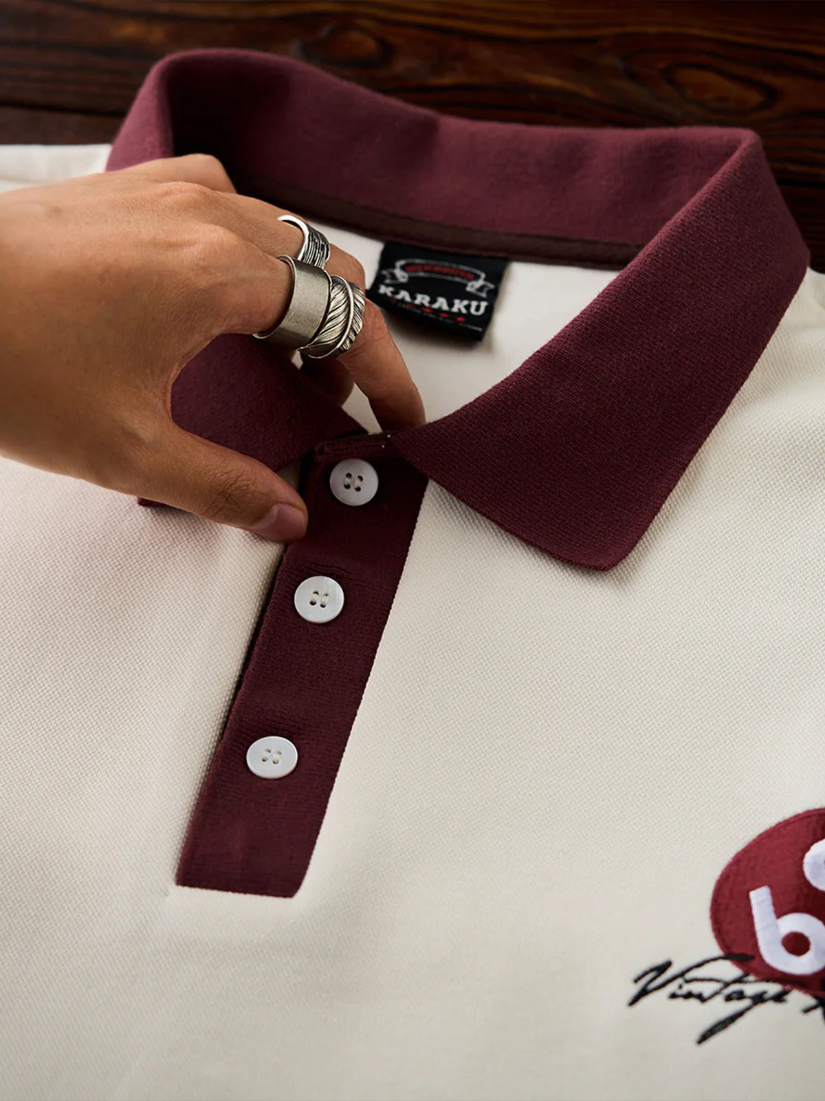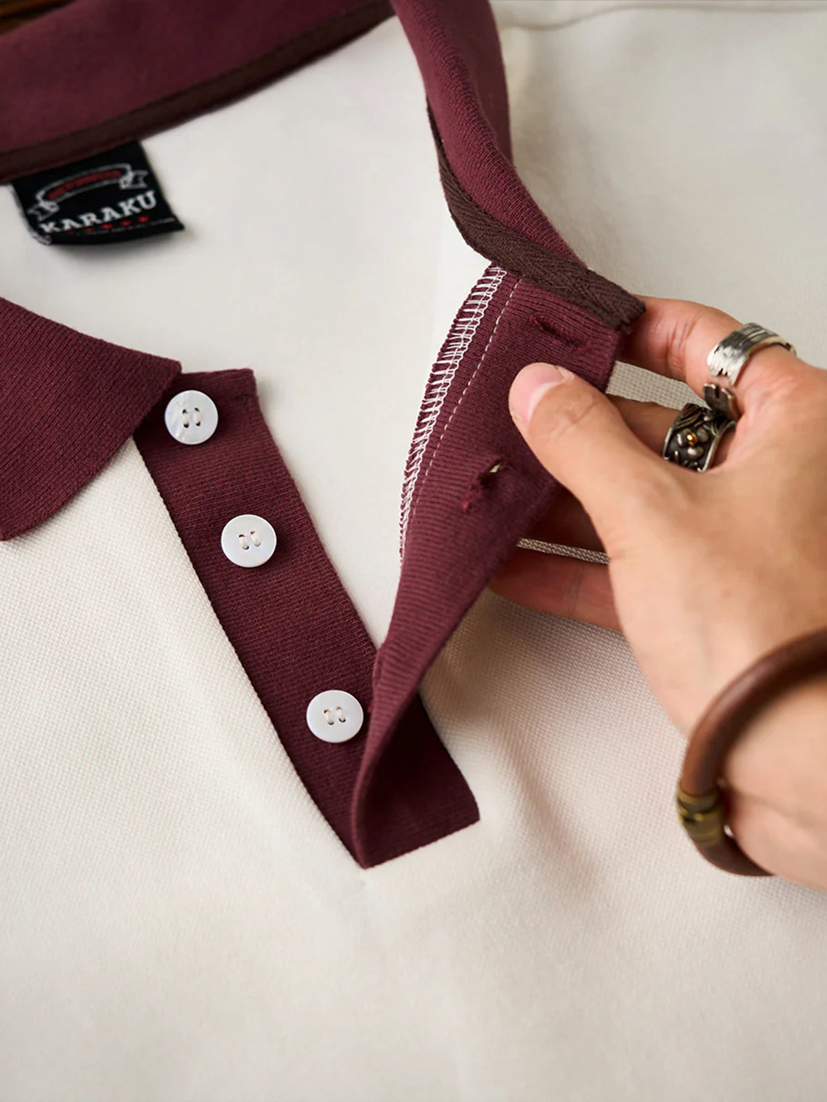 This polo shirt features a classic collar and button placket that gives a casual yet slightly formal impression. The wine-red collar adds a stylish accent to the overall look.