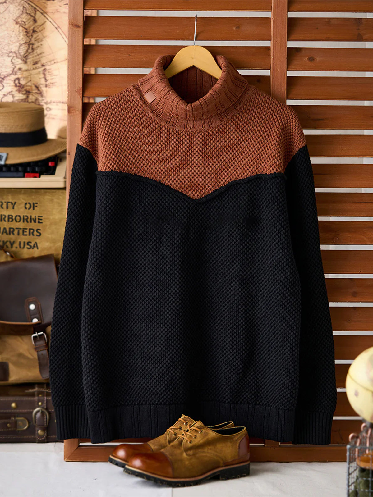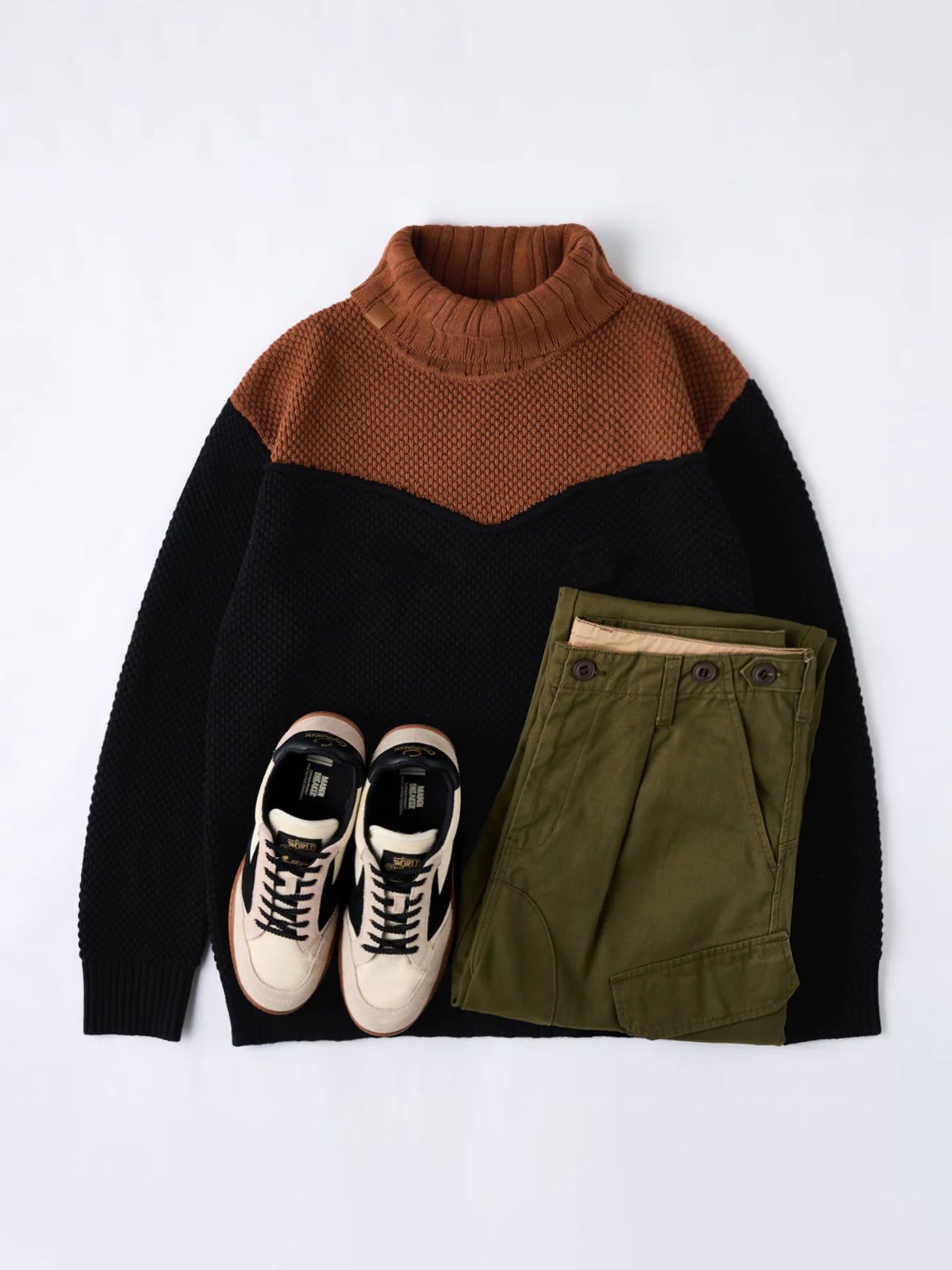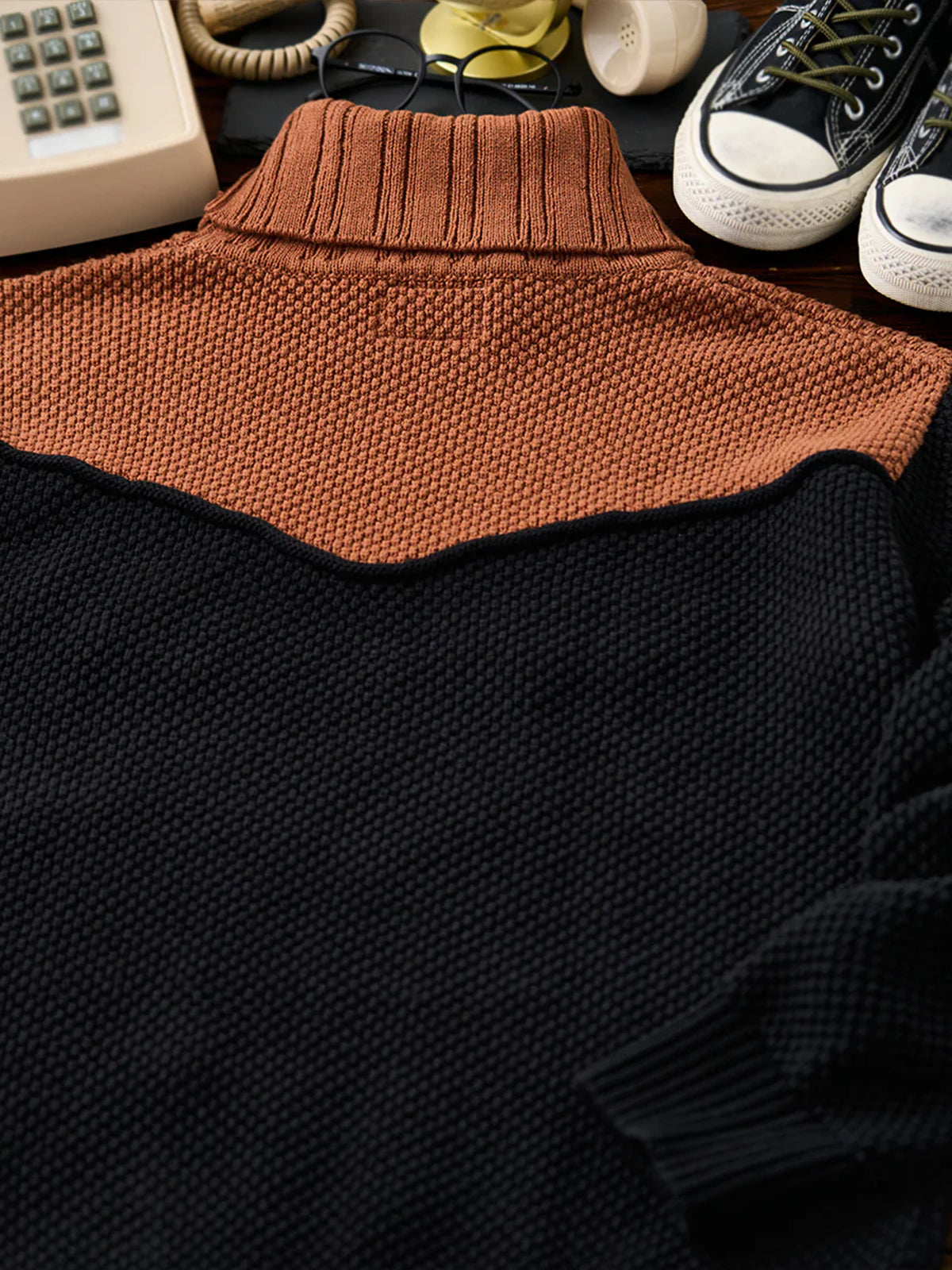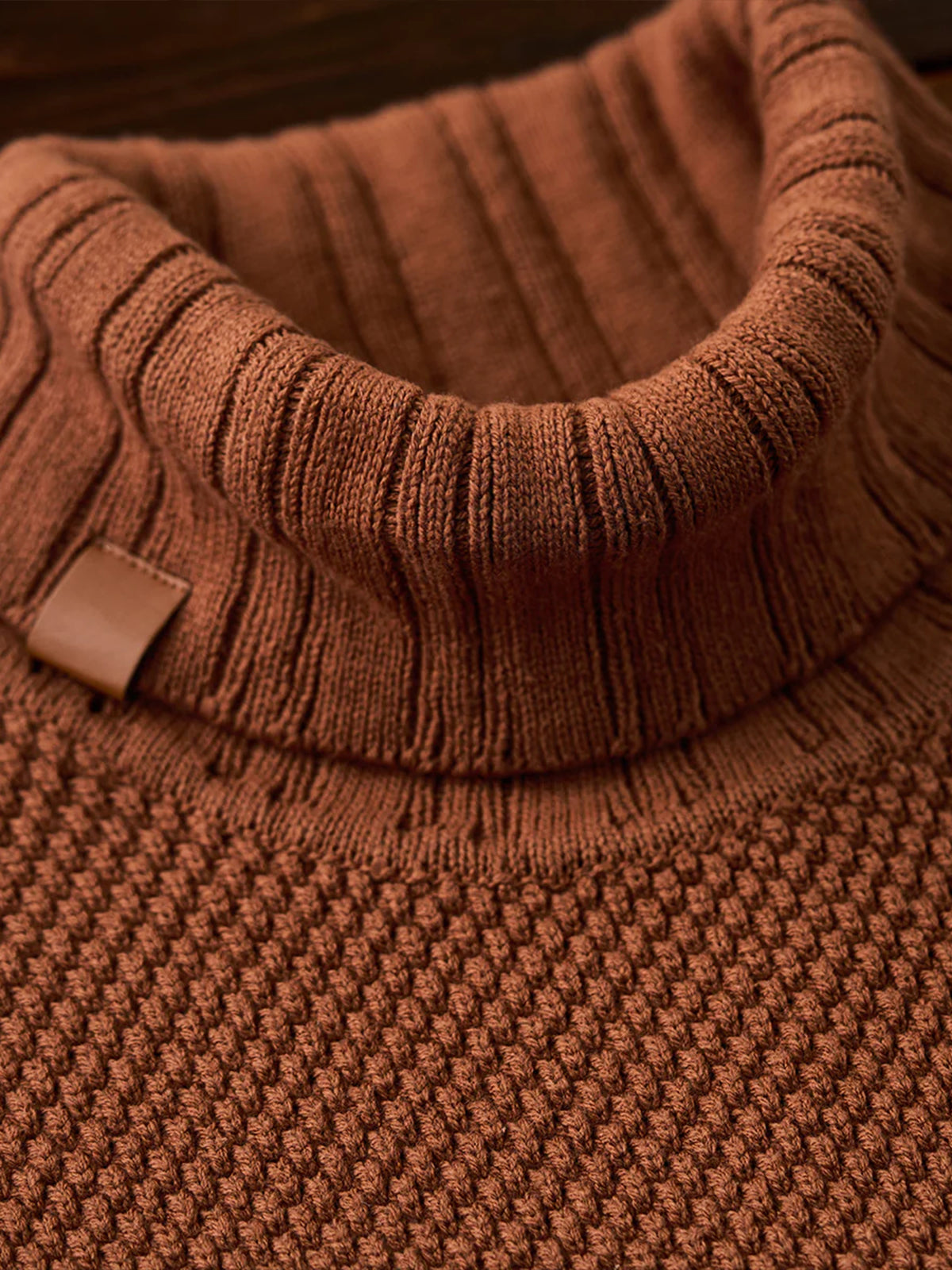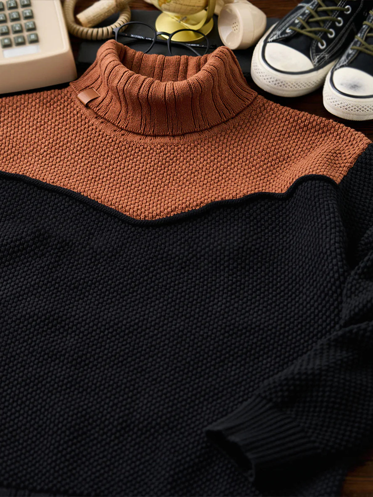 A high-neck knit sweater featuring textured pineapple pile knitting, giving a rich, dimensional look and a soft, cozy feel. Subtle colorblock accents add personality to the classic silhouette, while a leather tag on the collar delivers a natural touch of sophistication. The high neckline wraps the neck for warmth, making it perfect for chilly days. Versatile and comfortable, this piece embodies Karaku’s signature cozy style for both everyday wear and relaxed occasions.