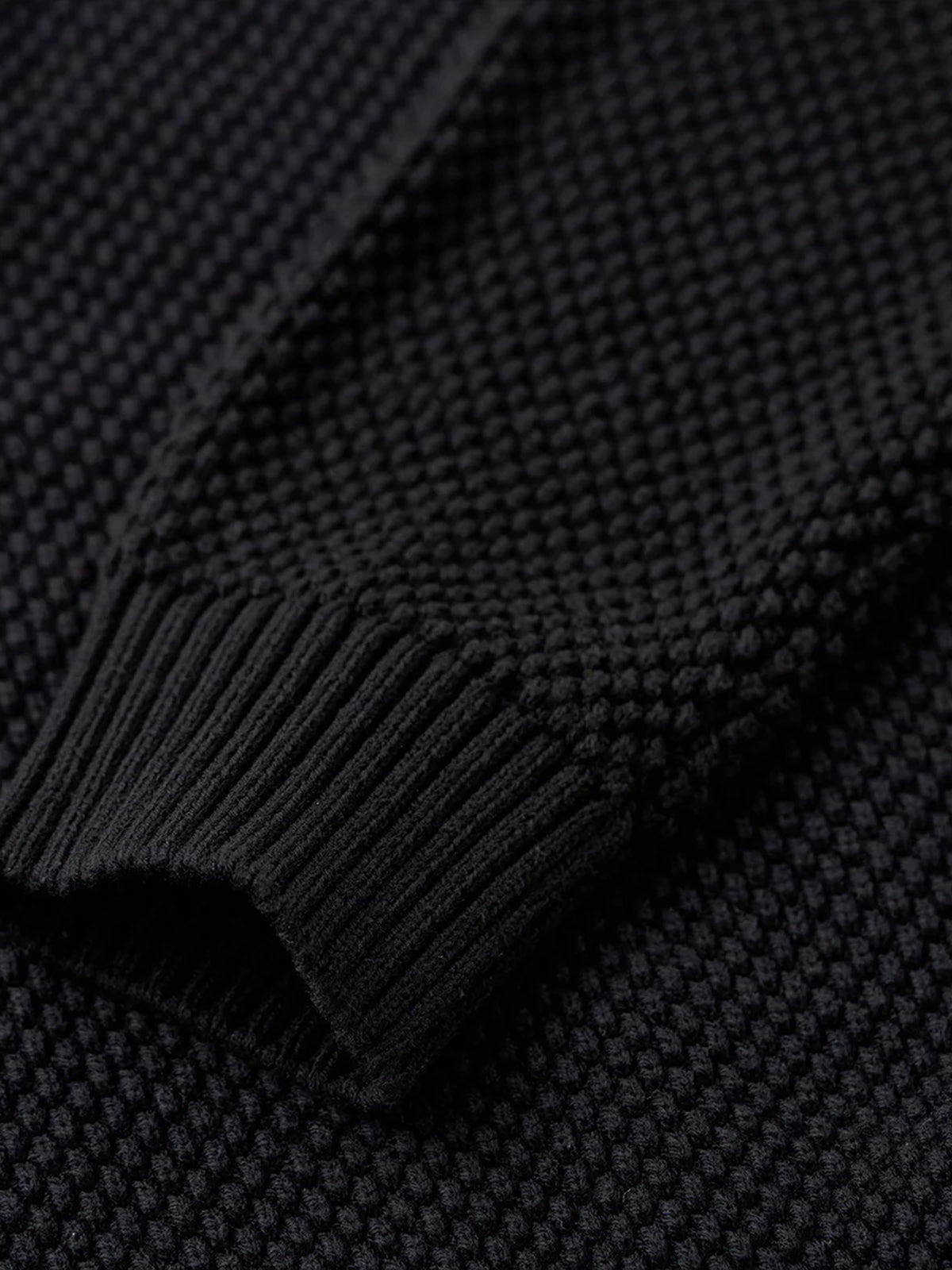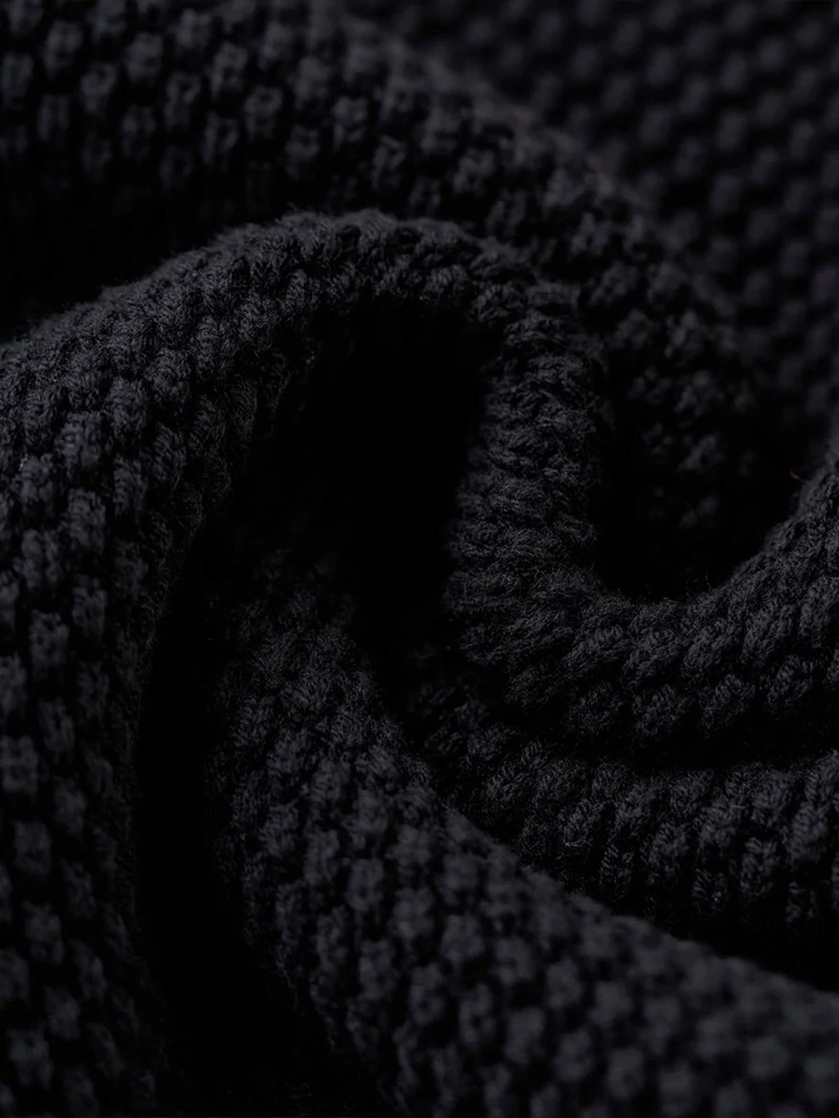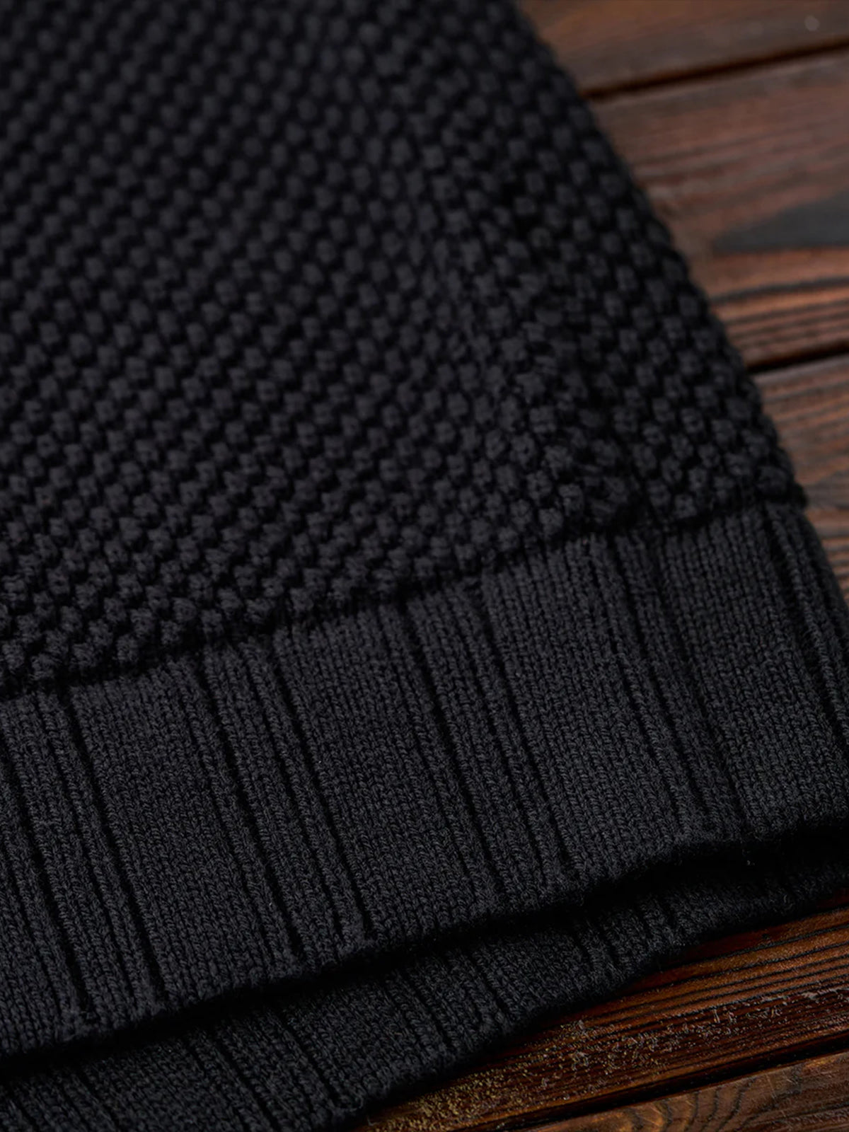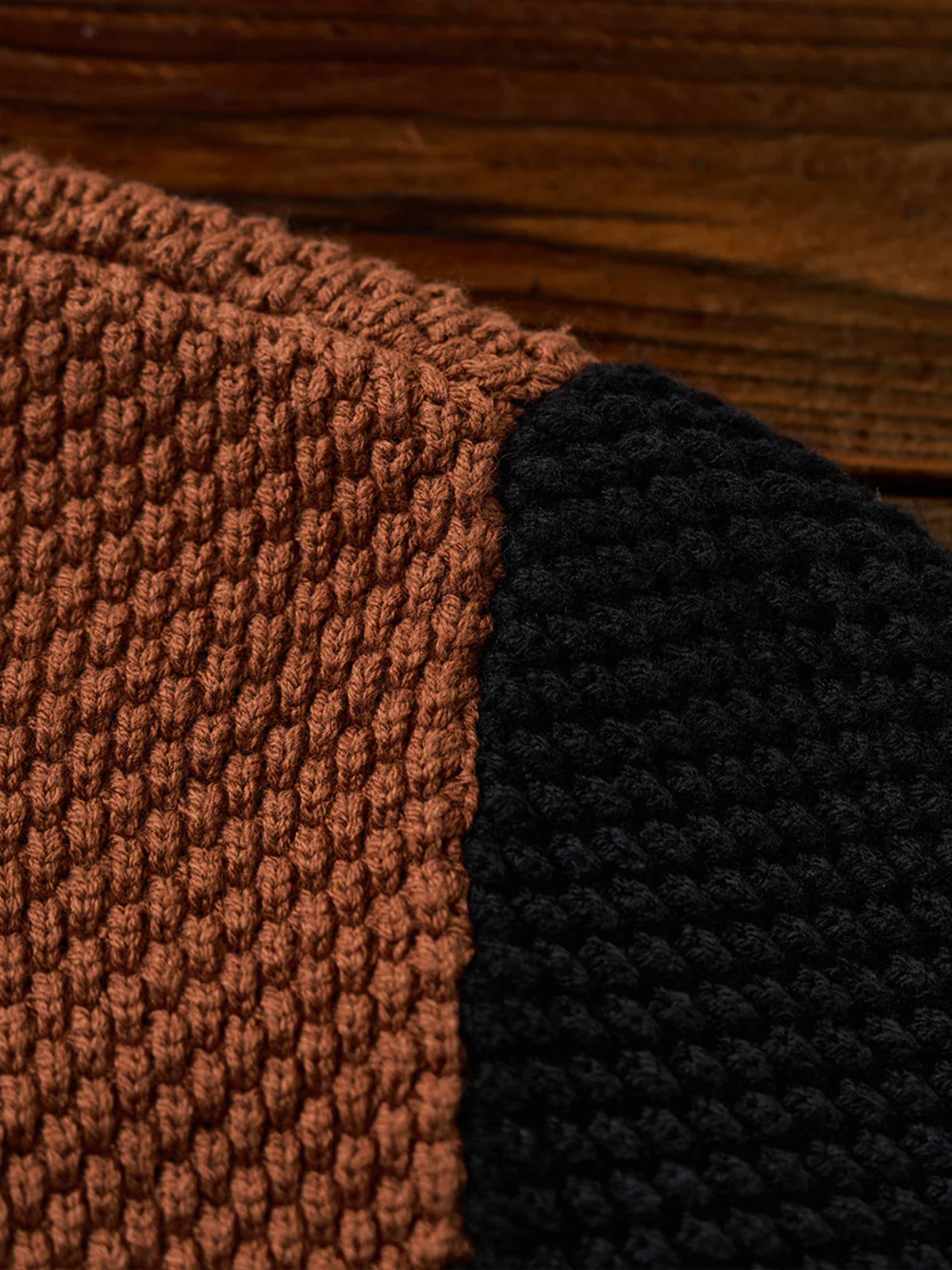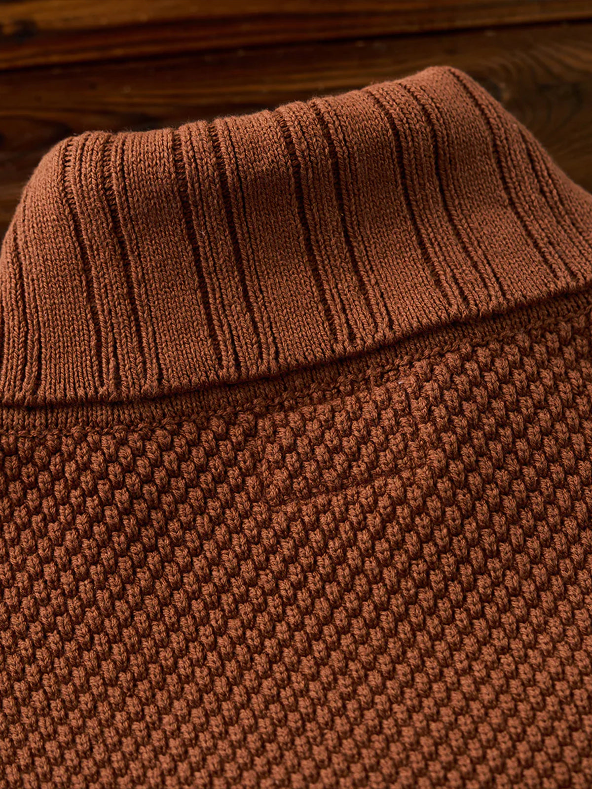 A high-neck knit sweater featuring textured pineapple pile knitting, giving a rich, dimensional look and a soft, cozy feel. Subtle colorblock accents add personality to the classic silhouette, while a leather tag on the collar delivers a natural touch of sophistication. The high neckline wraps the neck for warmth, making it perfect for chilly days. Versatile and comfortable, this piece embodies Karaku’s signature cozy style for both everyday wear and relaxed occasions.