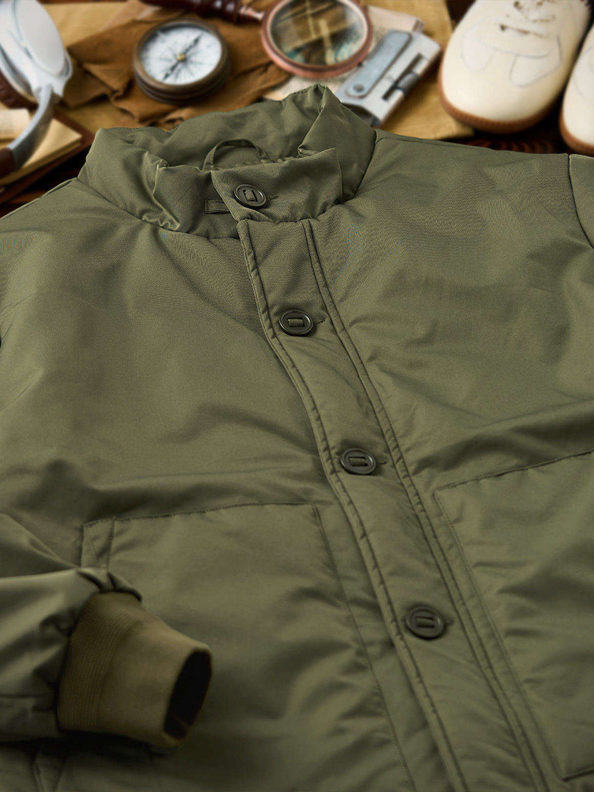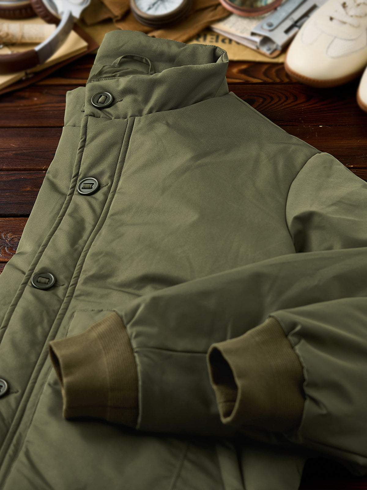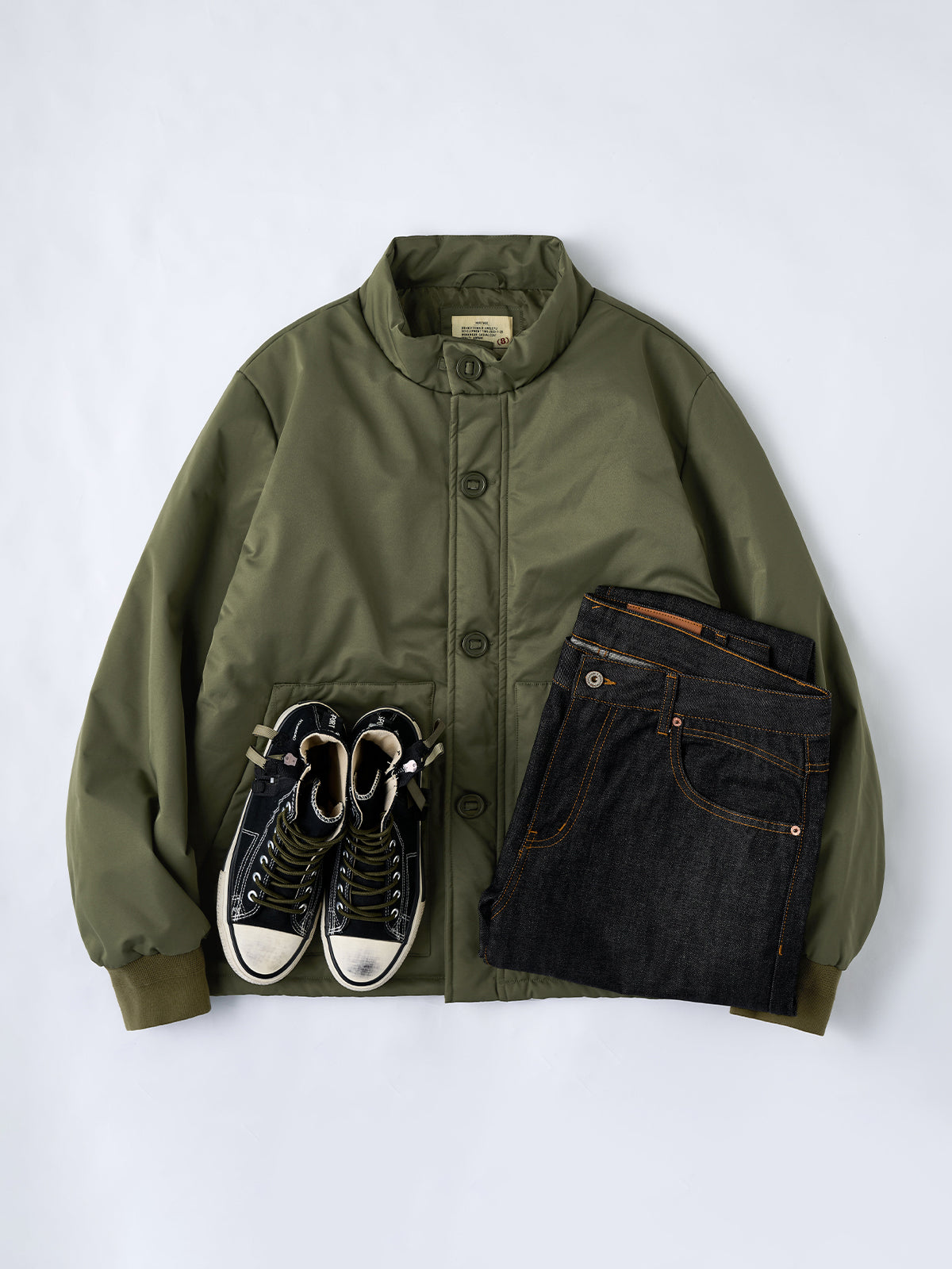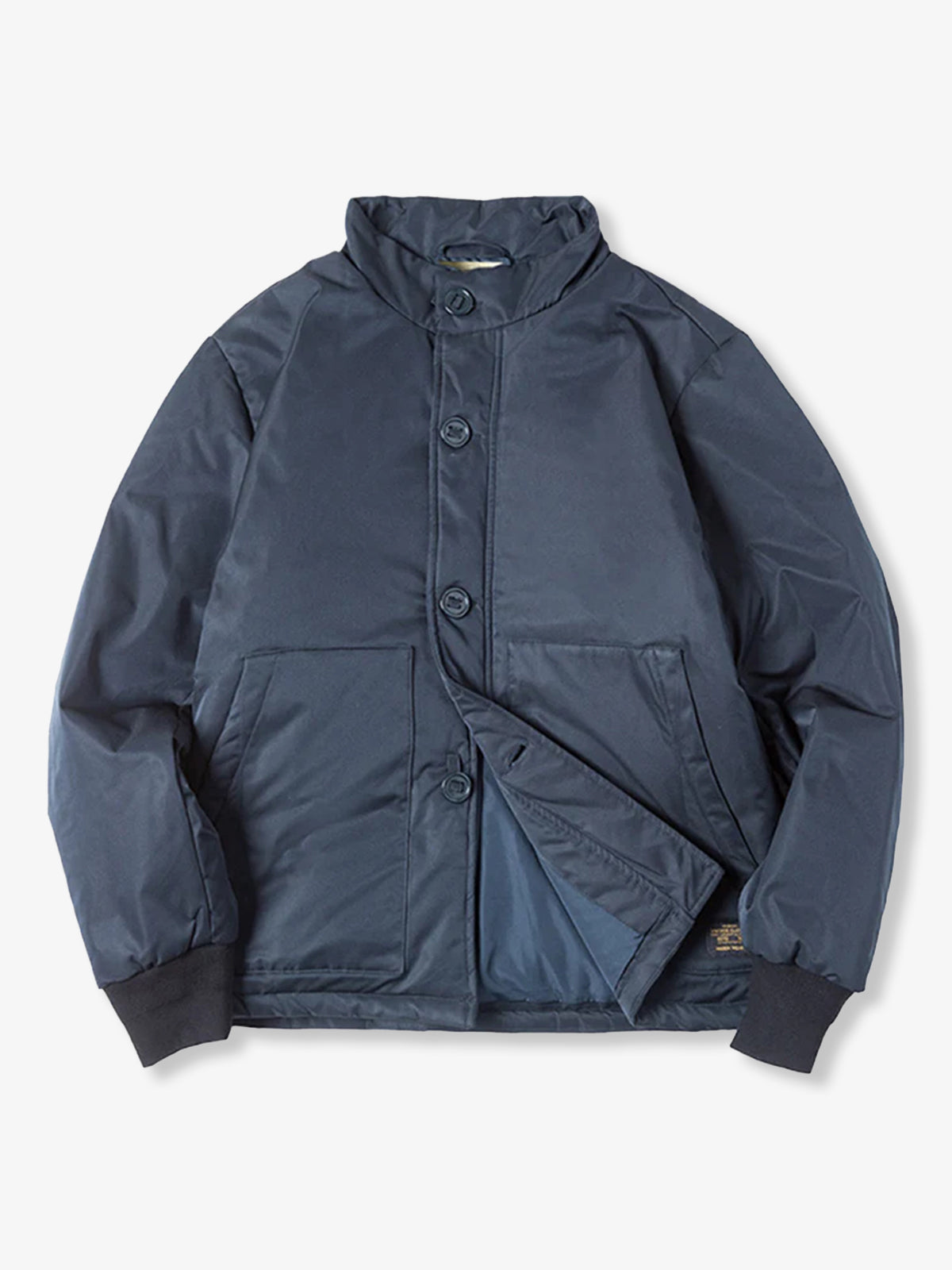 A modern reinterpretation of the original “A-1” flight jacket — a timeless design first introduced by the U.S. Army Air Corps in 1927 as their very first standard flight jacket. Its cropped, waist-length silhouette was purpose-built for tight cockpits and went on to inspire legendary successors like the M-2 and MA-1. This updated version brings that heritage into the present with a padded structure for warmth and a clean, slightly boxy fit that enhances the body’s proportions. The ribbed cuffs and button-front closure stay true to the original’s vintage functionality, while the stand collar gives it a sharp, contemporary touch.