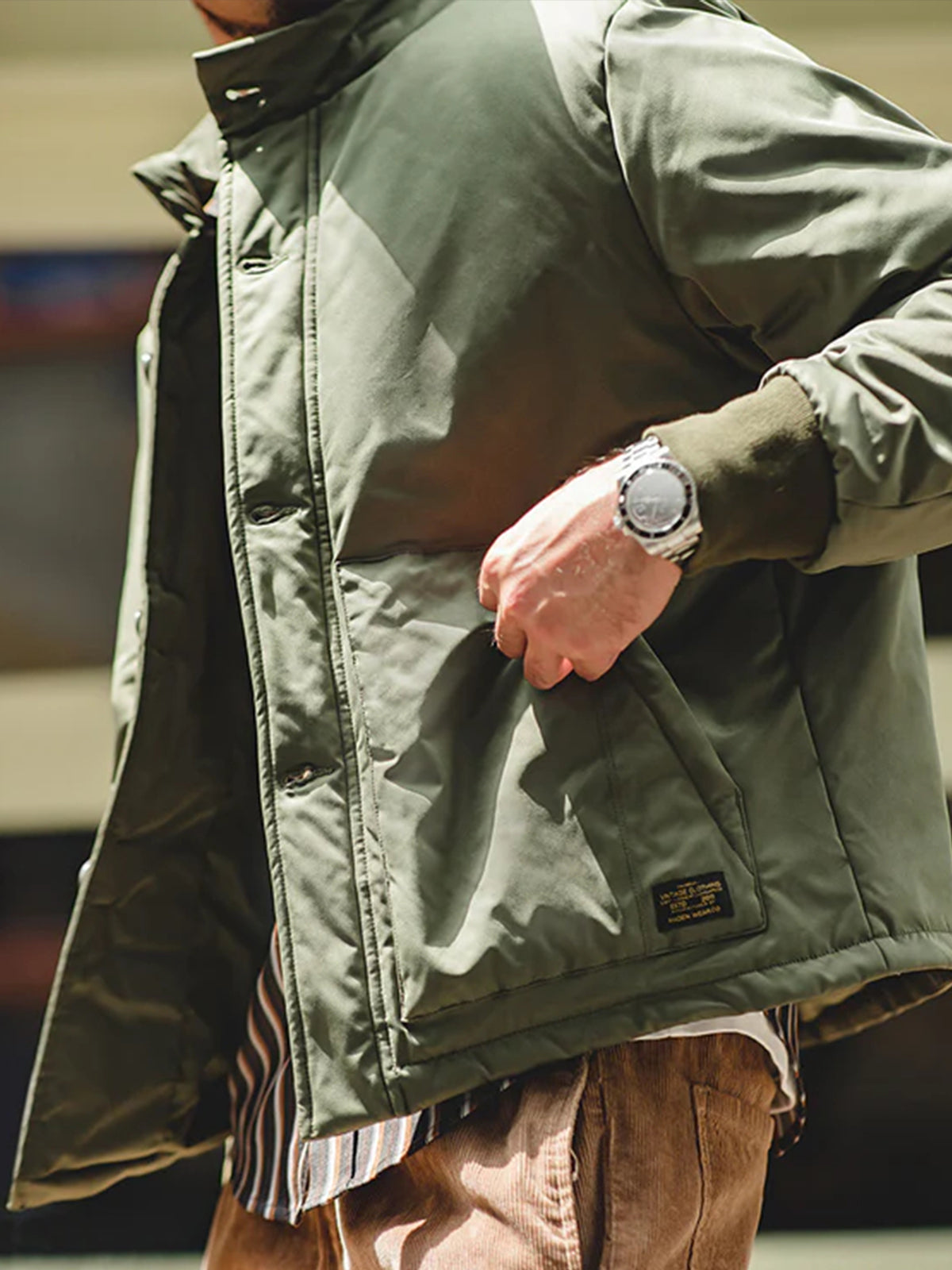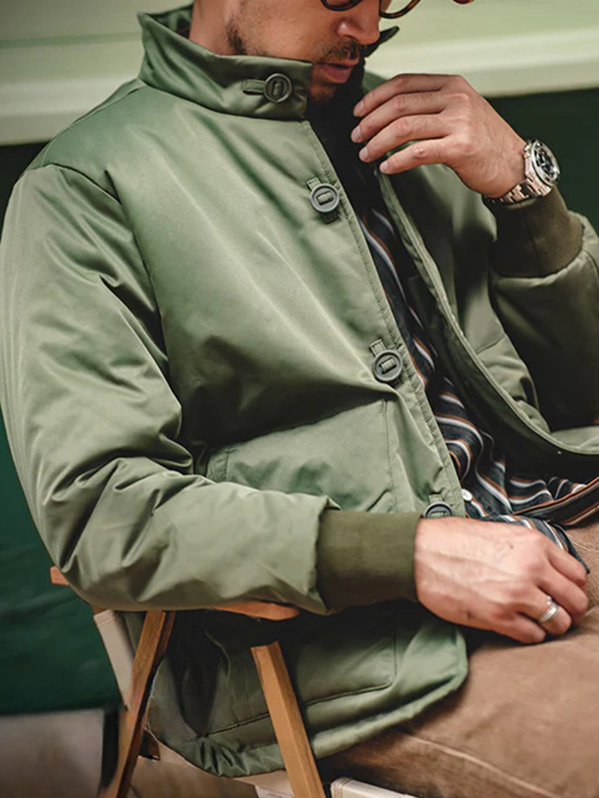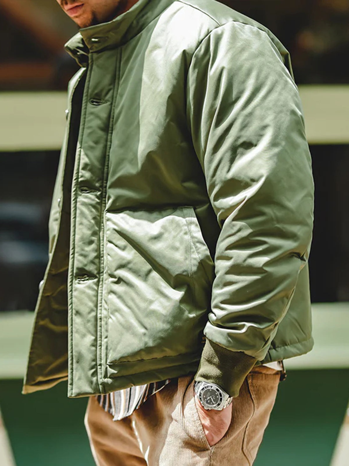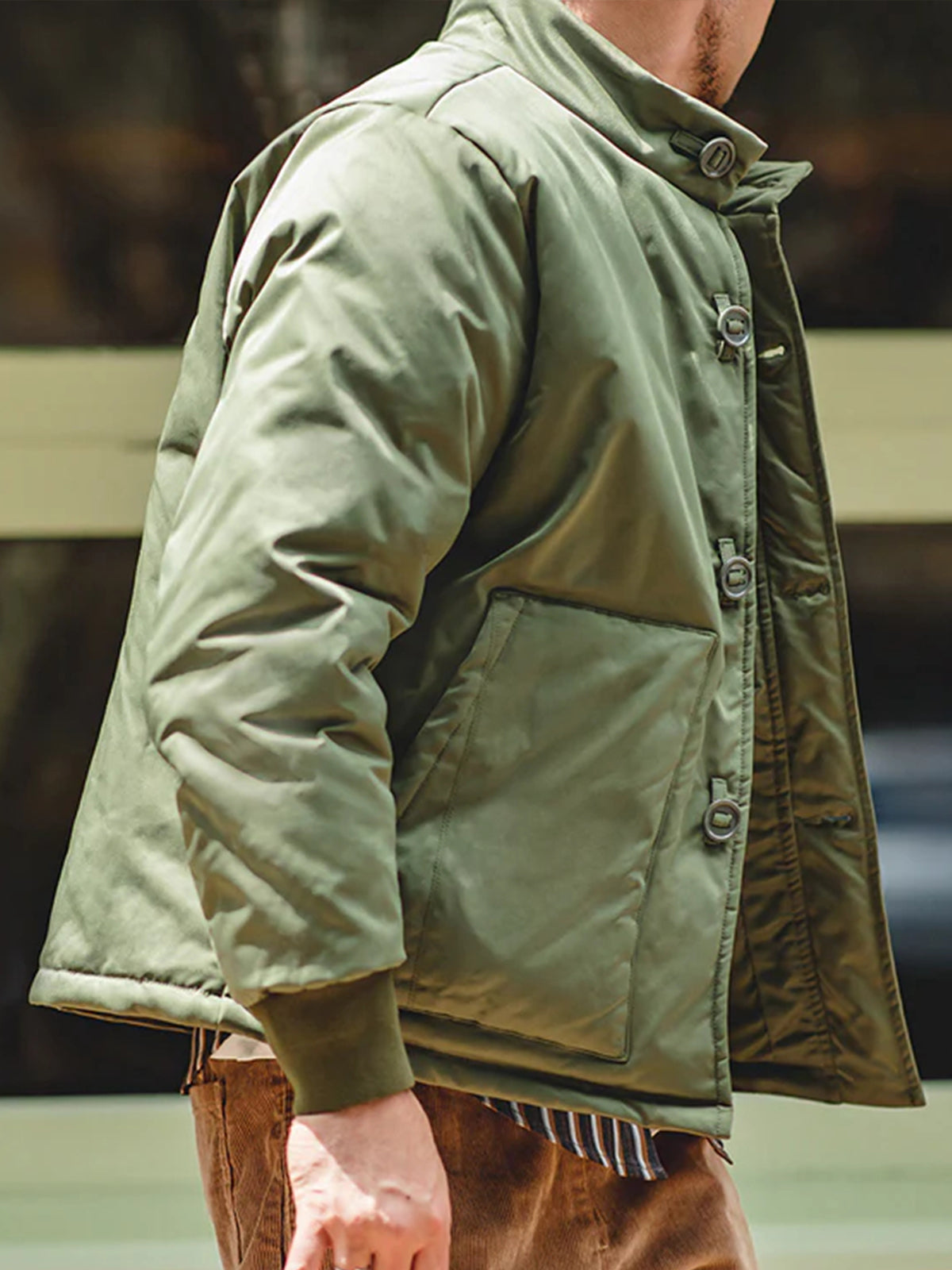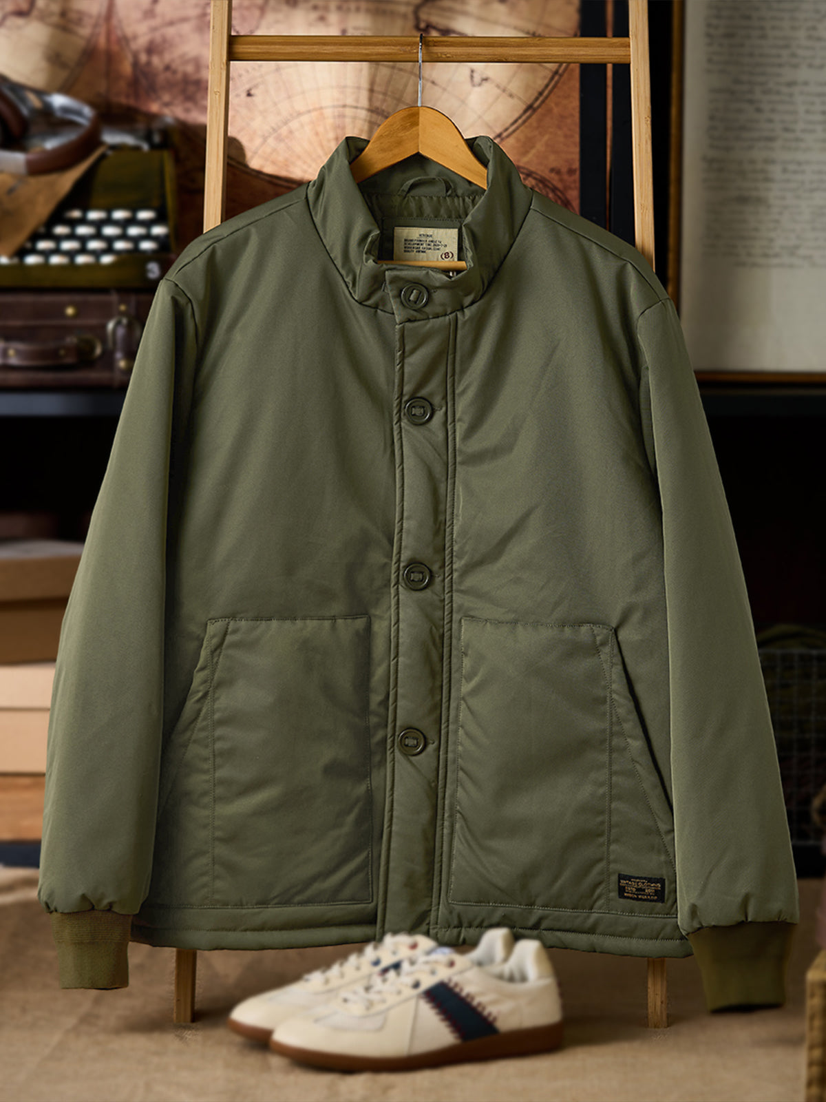 A modern reinterpretation of the original “A-1” flight jacket — a timeless design first introduced by the U.S. Army Air Corps in 1927 as their very first standard flight jacket. Its cropped, waist-length silhouette was purpose-built for tight cockpits and went on to inspire legendary successors like the M-2 and MA-1. This updated version brings that heritage into the present with a padded structure for warmth and a clean, slightly boxy fit that enhances the body’s proportions. The ribbed cuffs and button-front closure stay true to the original’s vintage functionality, while the stand collar gives it a sharp, contemporary touch.