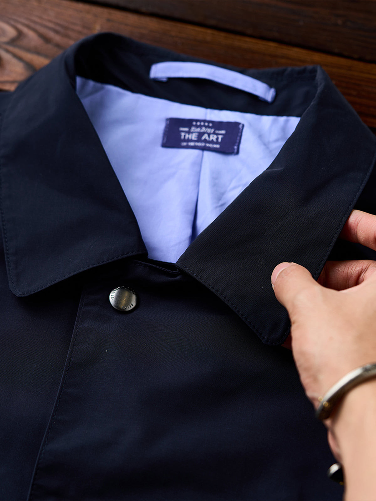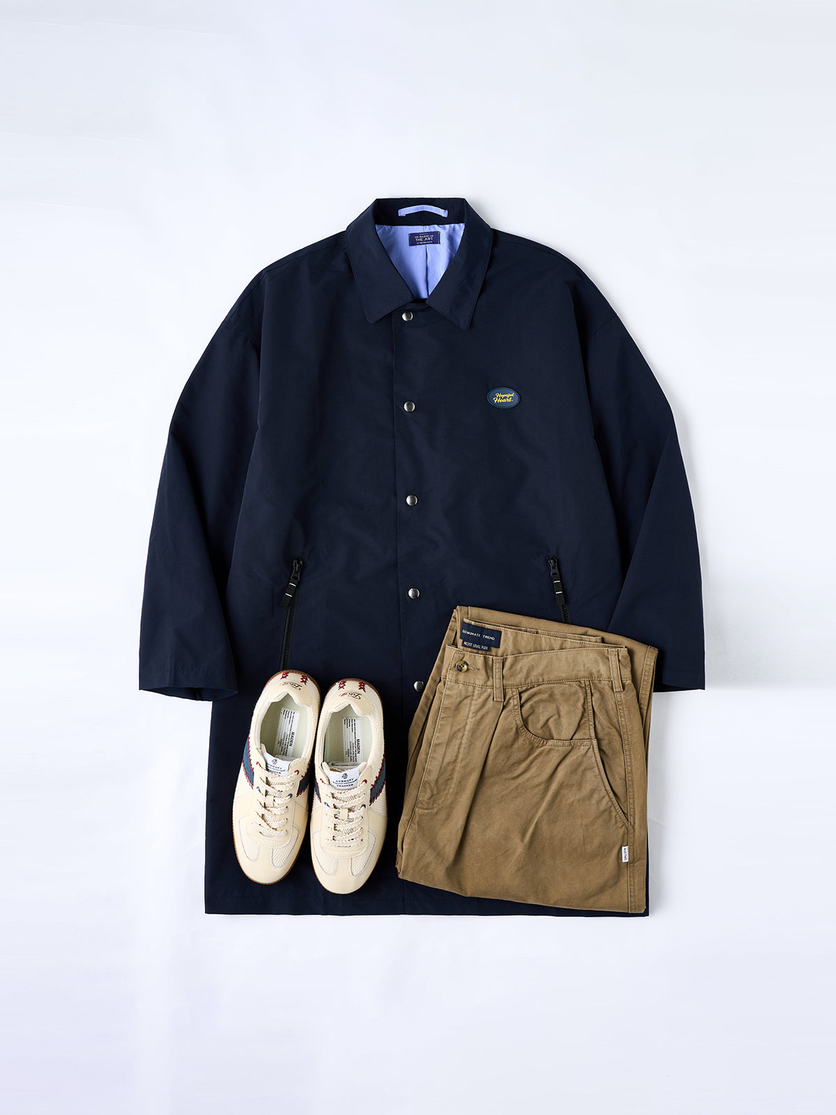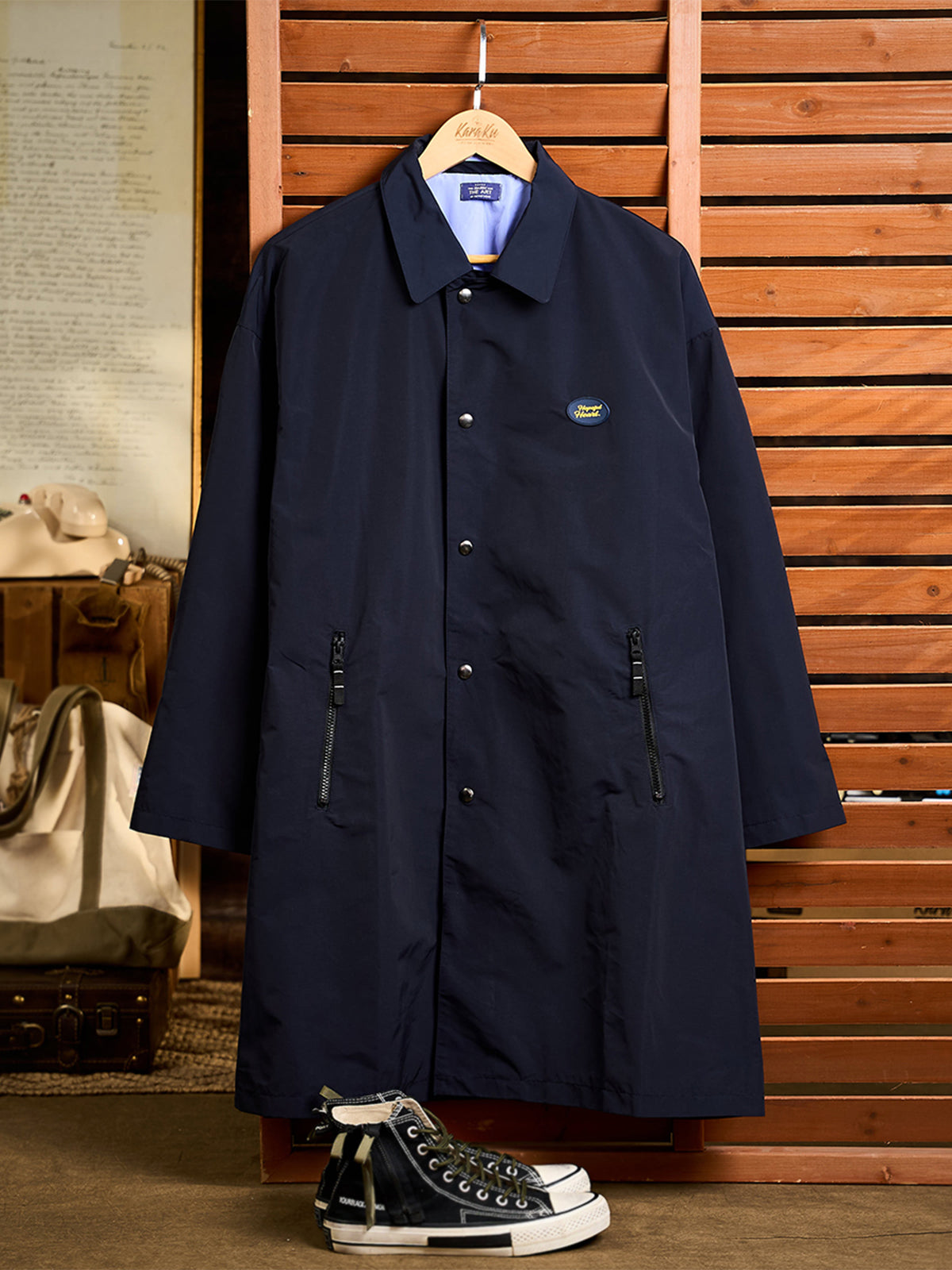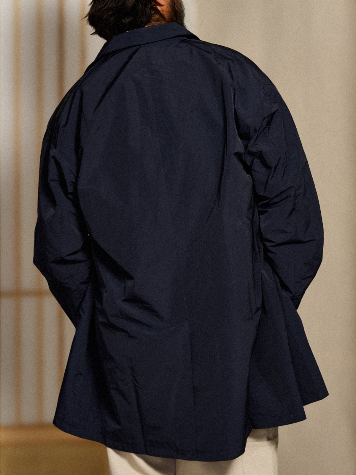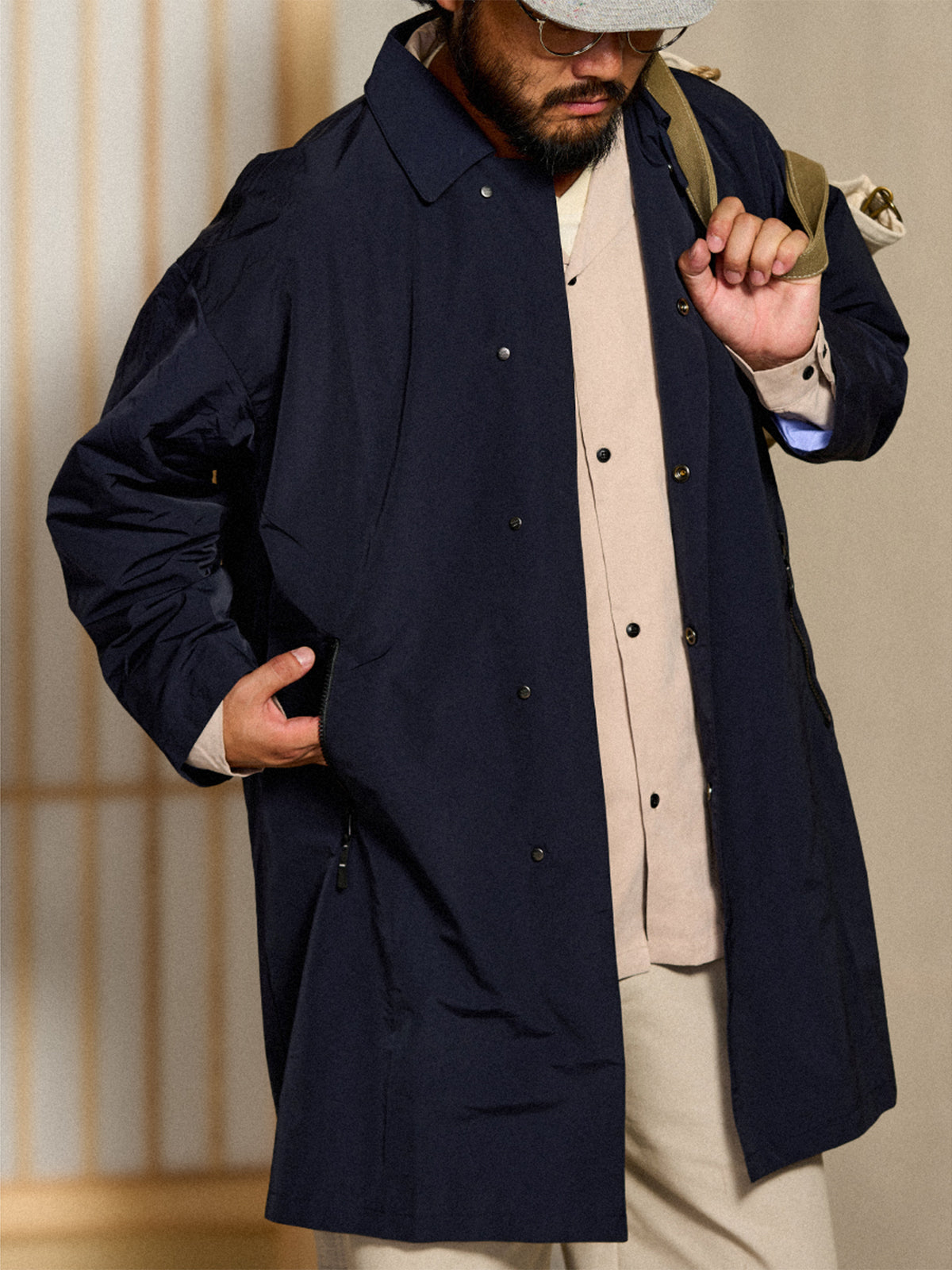 A sturdy outdoor-inspired Balmacaan coat finished with Teflon fabric protector processing for windproof, waterproof, and stain-resistant performance. Practical details such as pockets on the front enhance usability. The fully lined construction, with a material that is neither too thick nor too thin, makes it perfect for the autumn and winter seasons. The front features a concealed placket design in which only the top button is visible when closed, lending a clean and refined impression. With a relaxed silhouette and long length, the coat feels light to wear and drapes moderately without looking stiff.