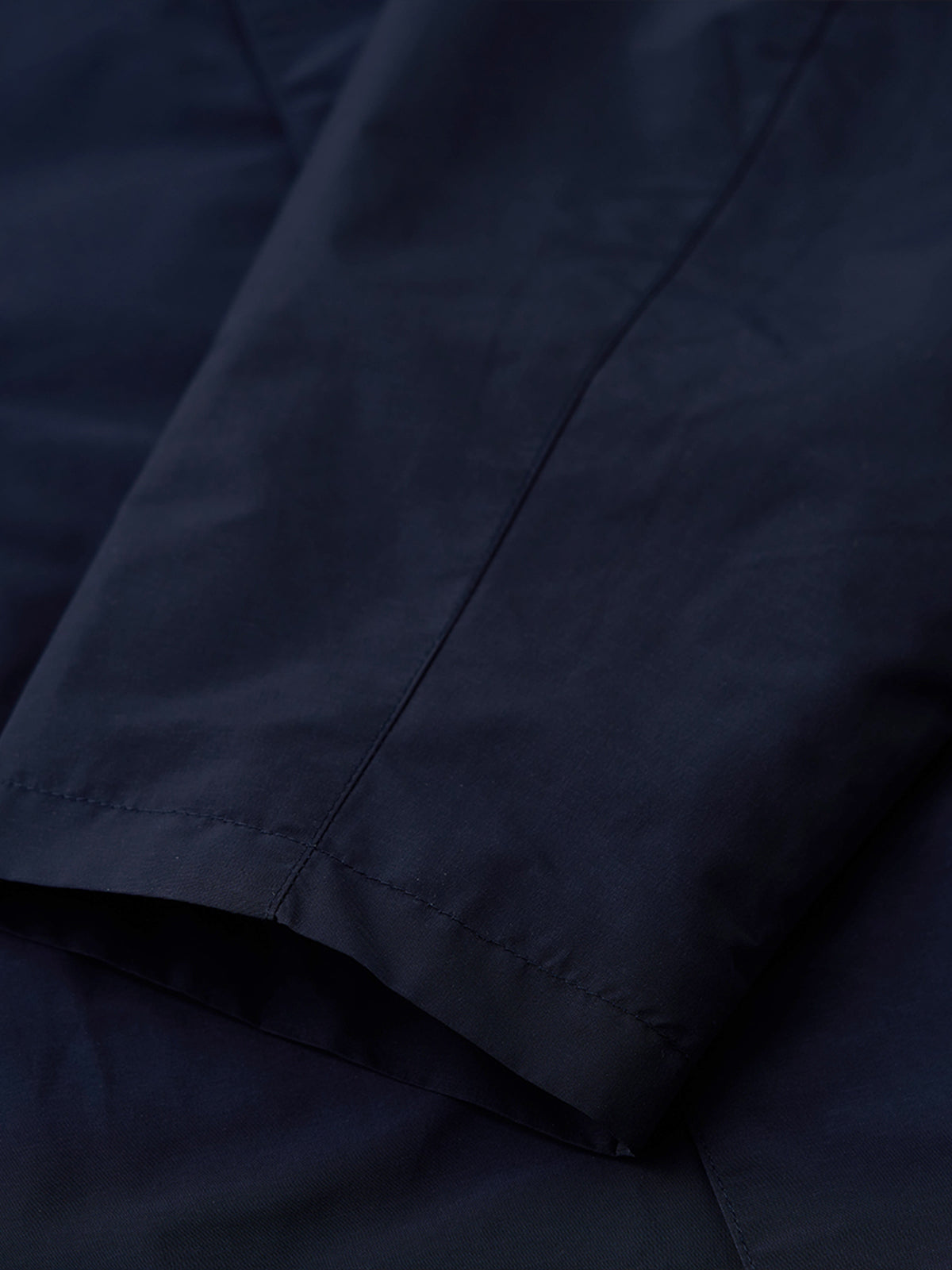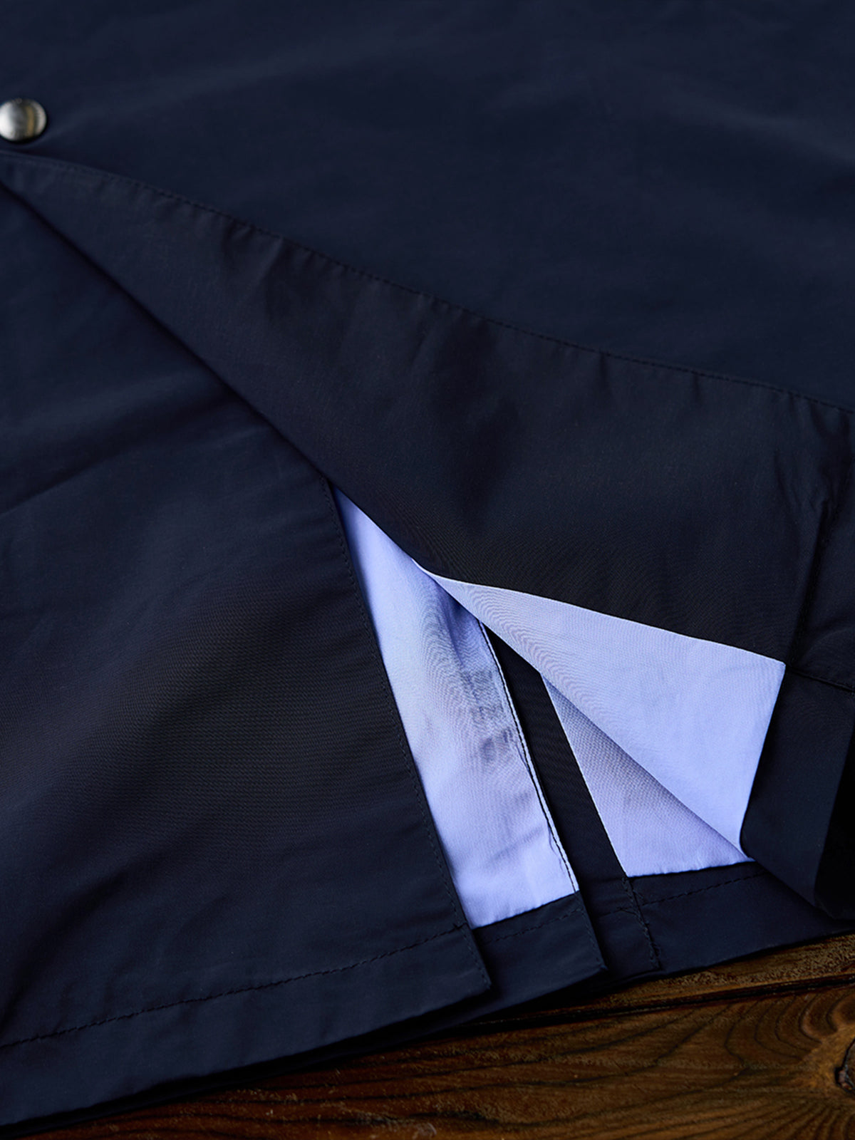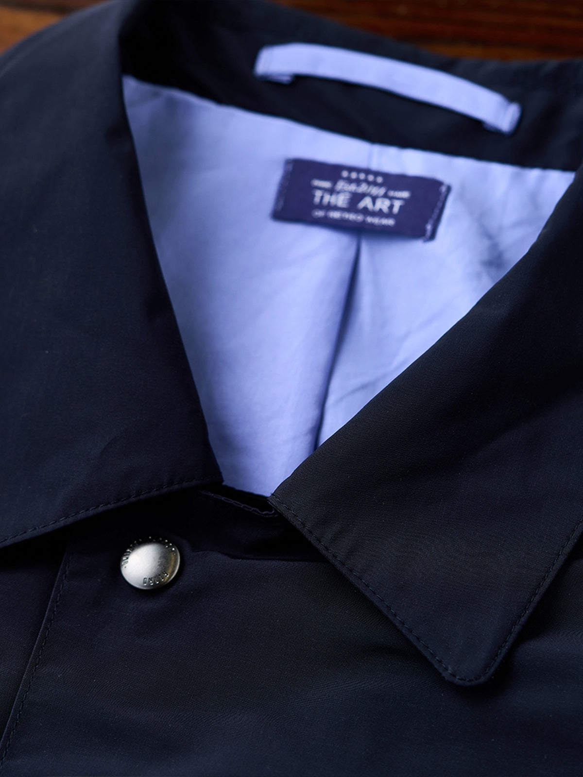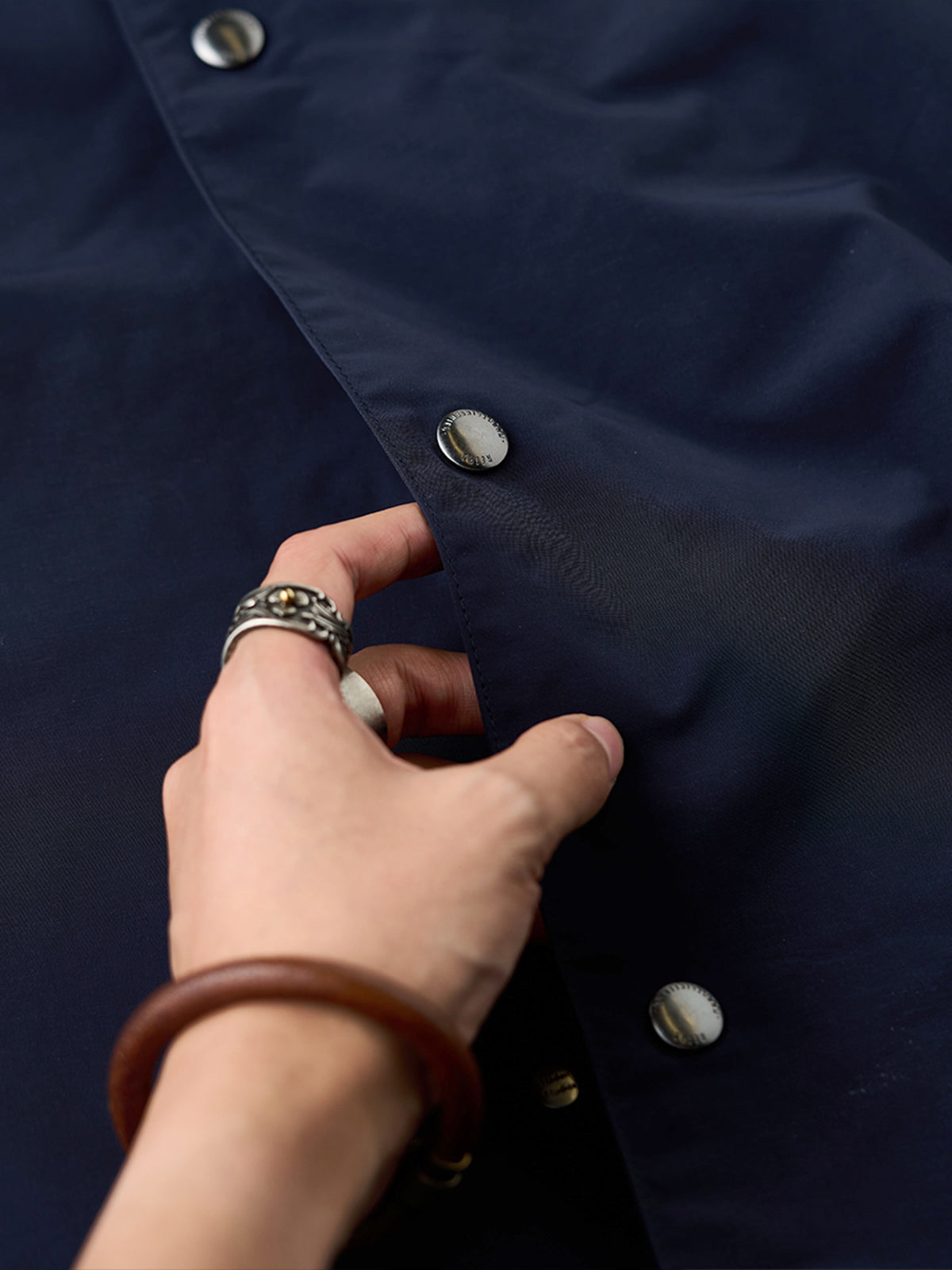 A sturdy outdoor-inspired Balmacaan coat finished with Teflon fabric protector processing for windproof, waterproof, and stain-resistant performance. Practical details such as pockets on the front enhance usability. The fully lined construction, with a material that is neither too thick nor too thin, makes it perfect for the autumn and winter seasons. The front features a concealed placket design in which only the top button is visible when closed, lending a clean and refined impression. With a relaxed silhouette and long length, the coat feels light to wear and drapes moderately without looking stiff.