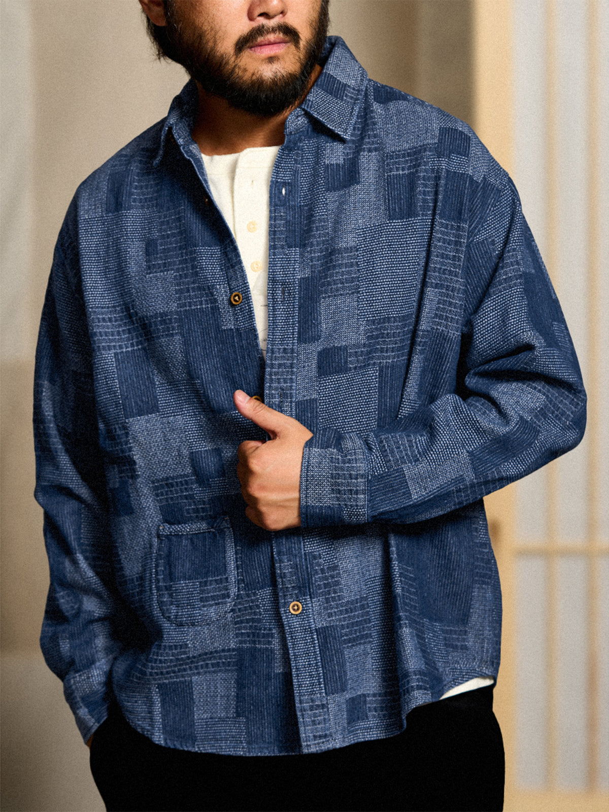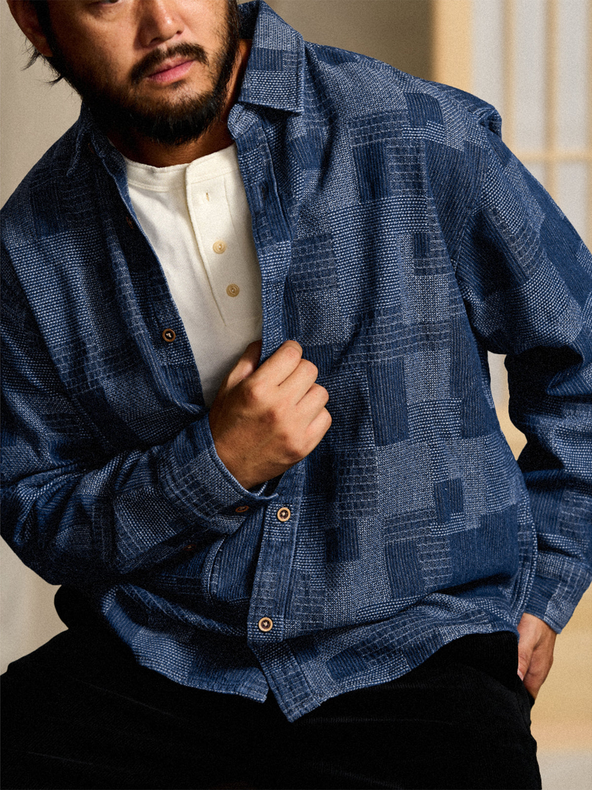 The indigo hue tastes good, and the exciting design that shines in spring is attractive. At first glance, completely different fabrics are stitched together, and the surface is uneven, so the area where the fabric touches the skin is small, and there is space between the skin and the fabric, so it is breathable and comfortable to wear. The hem is finely tailored around to create a smoother arc. The balance of the silhouette has also been modified to make it easier to insert into various shapes. The moderately loose silhouette is attractive, and it does not pick up the lines of the body, and it is comfortable to wear and has a relaxed feeling.