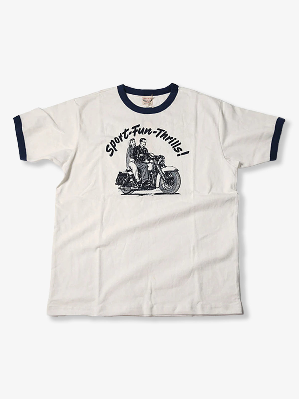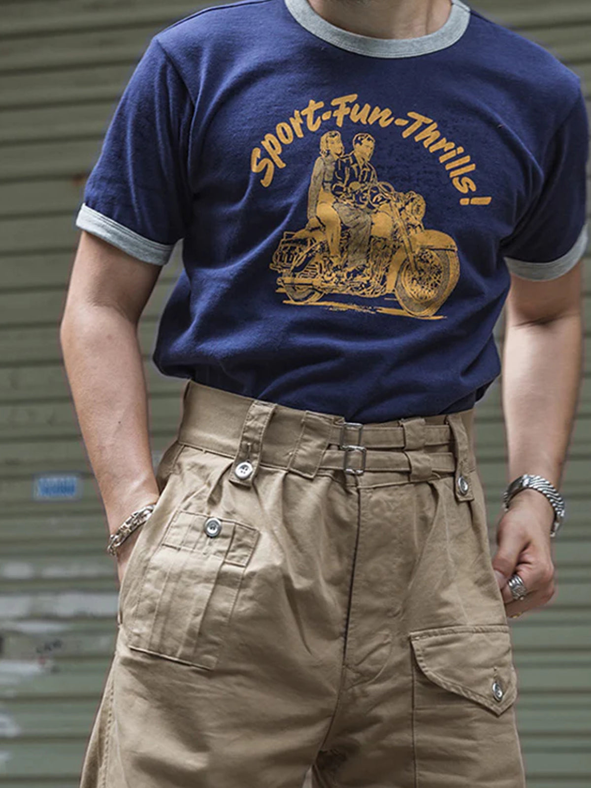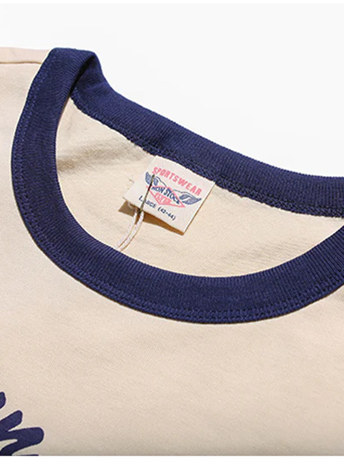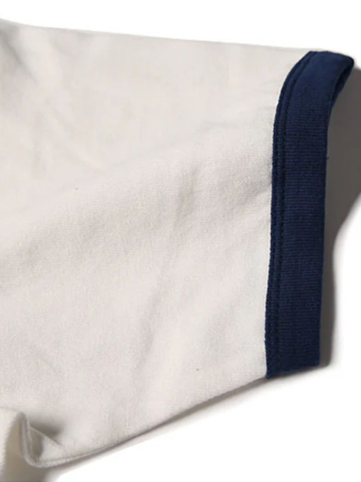 Ringer T-shirts are T-shirts with piping on the neck and sleeves. The English word "ring", which means "ring", derives the name Ringer T-shirt. The graffiti prints intertwined with typical American football culture such as motorcycles and English letters, and the collar and cuffs have ring-reinforced thickness, which is a staple of cycling fashion. The ribbed neckline gives a simple but moderately casual impression.