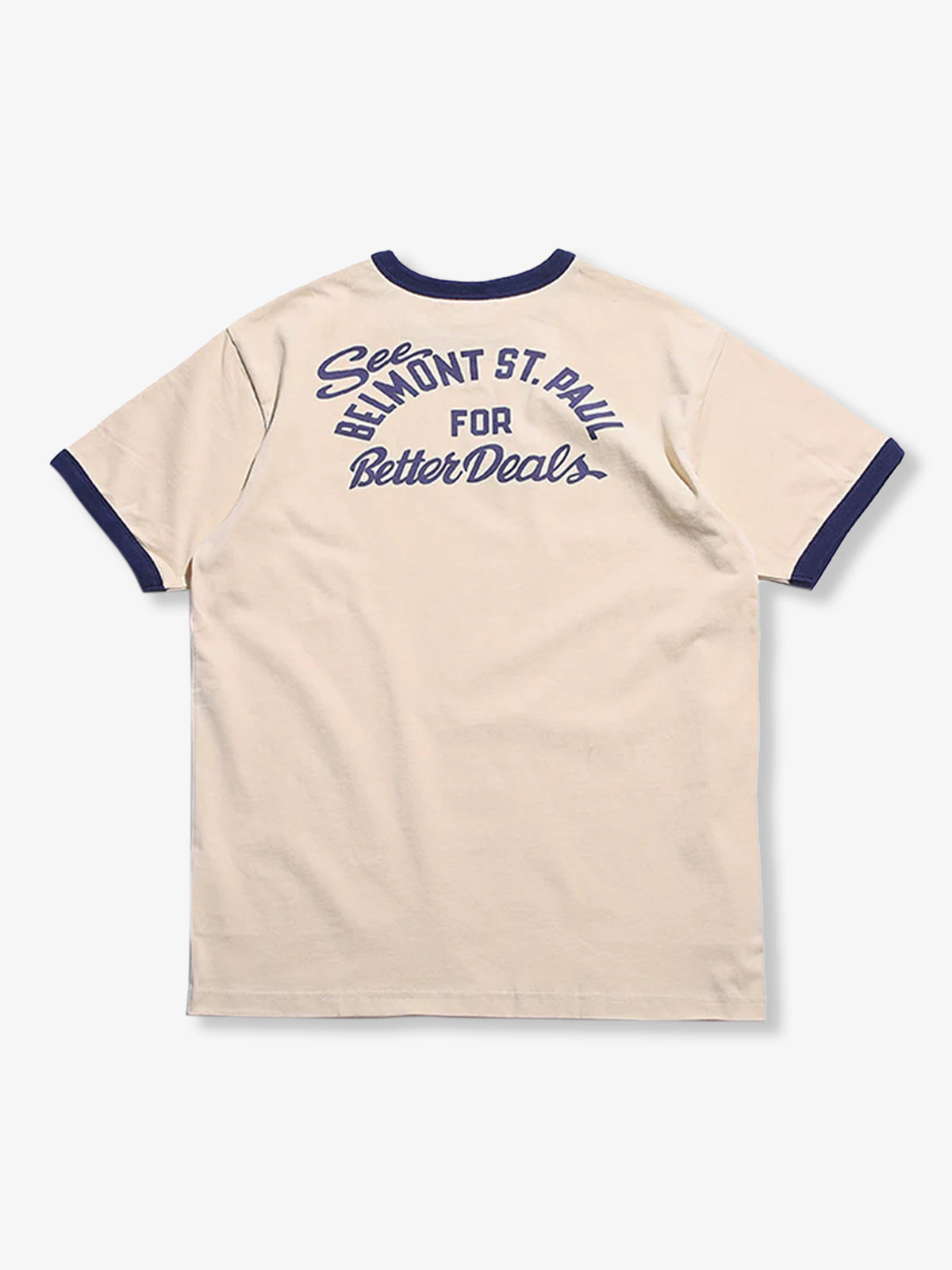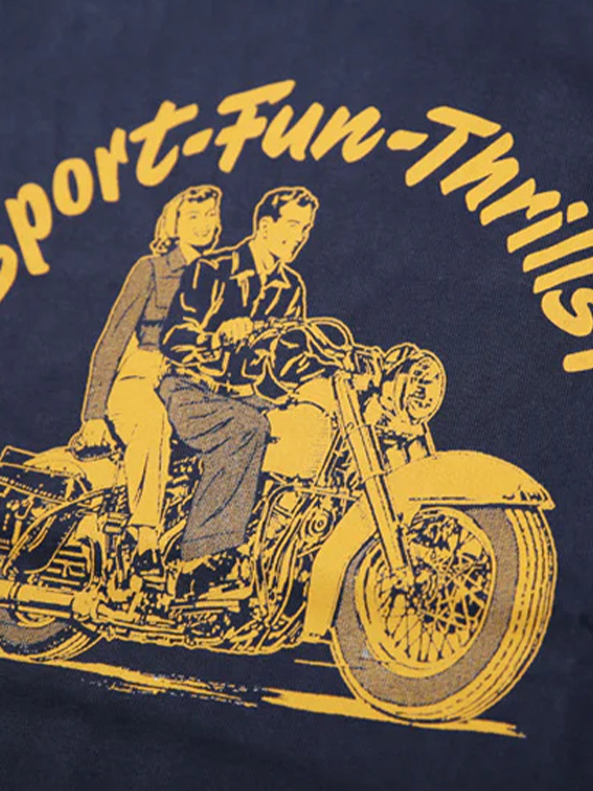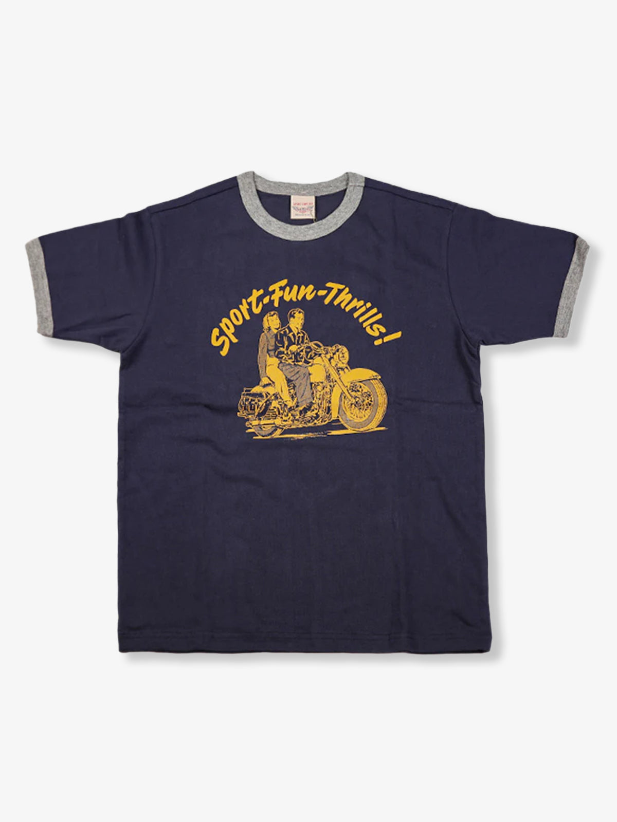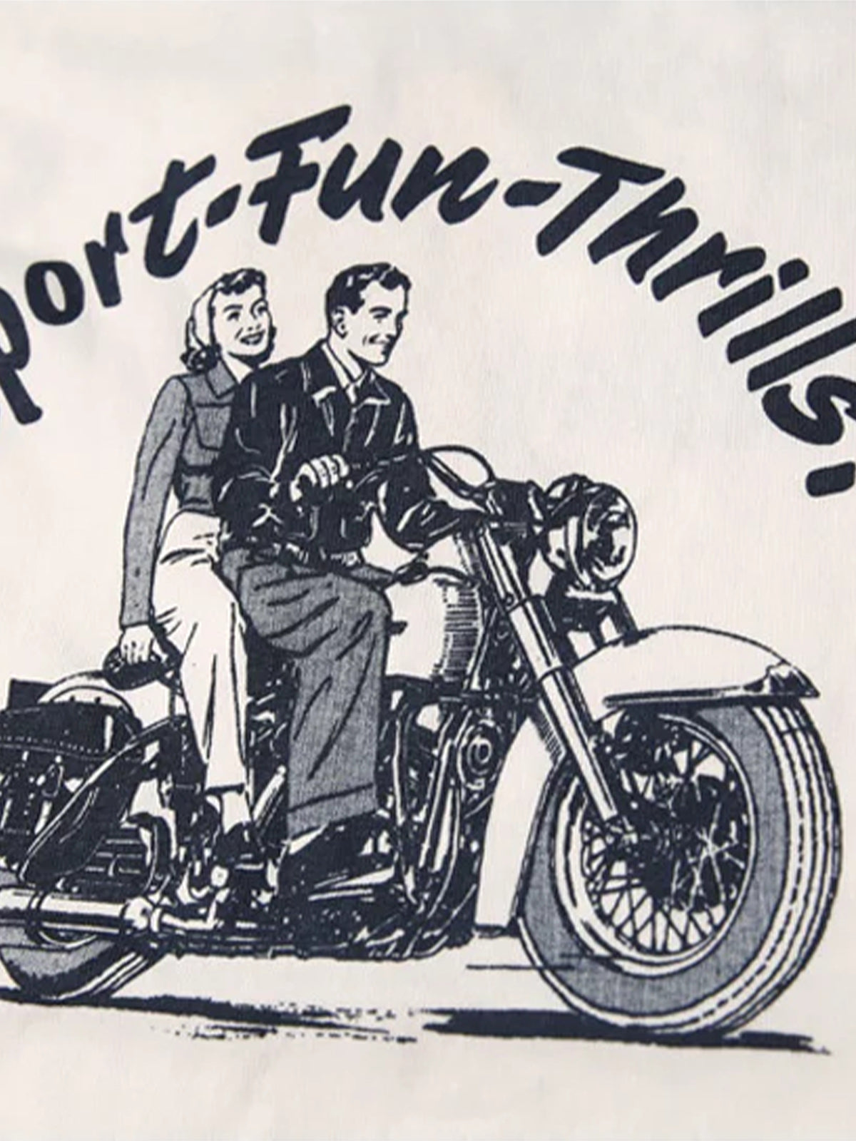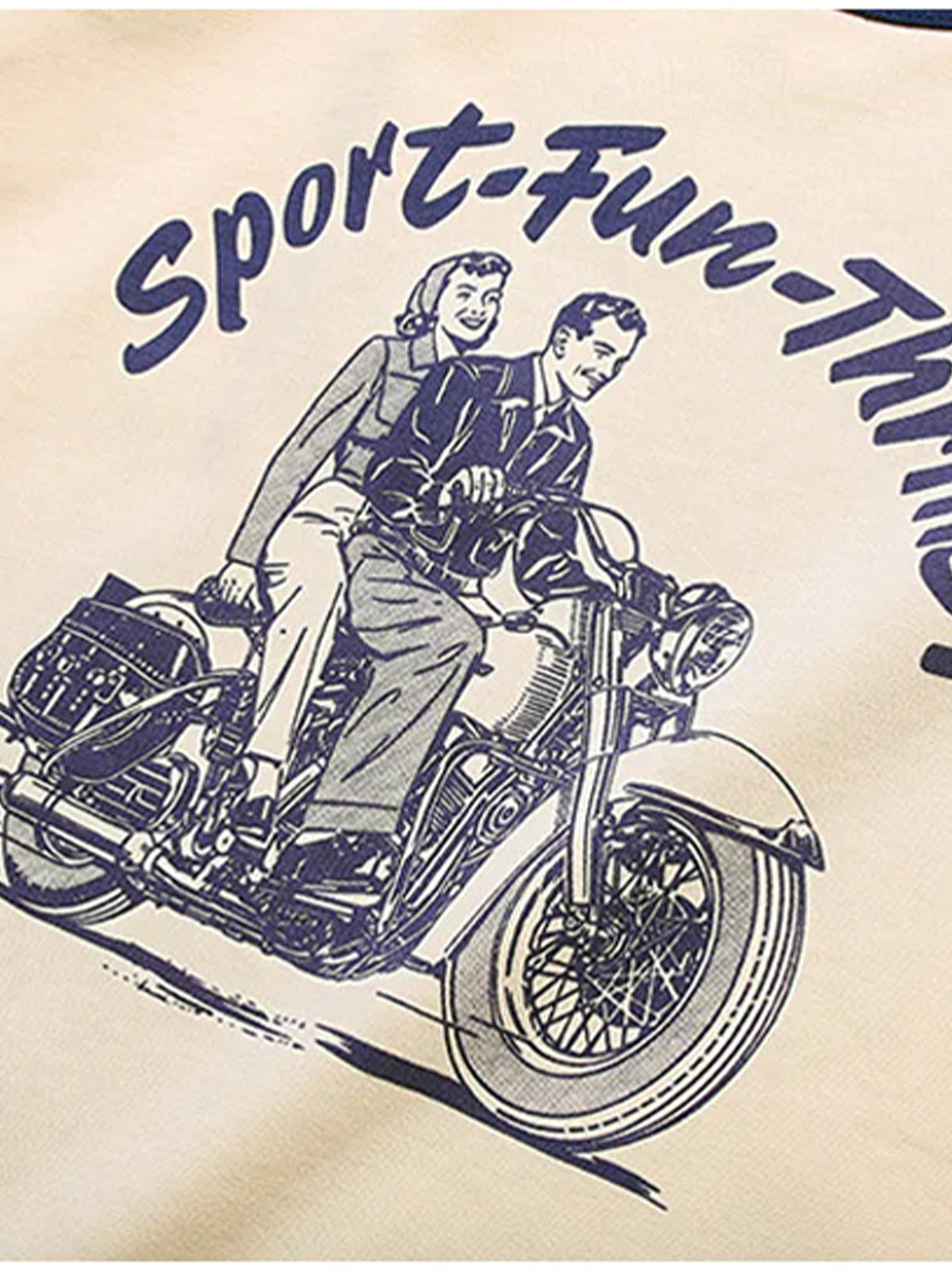 Ringer T-shirts are T-shirts with piping on the neck and sleeves. The English word "ring", which means "ring", derives the name Ringer T-shirt. The graffiti prints intertwined with typical American football culture such as motorcycles and English letters, and the collar and cuffs have ring-reinforced thickness, which is a staple of cycling fashion. The ribbed neckline gives a simple but moderately casual impression.