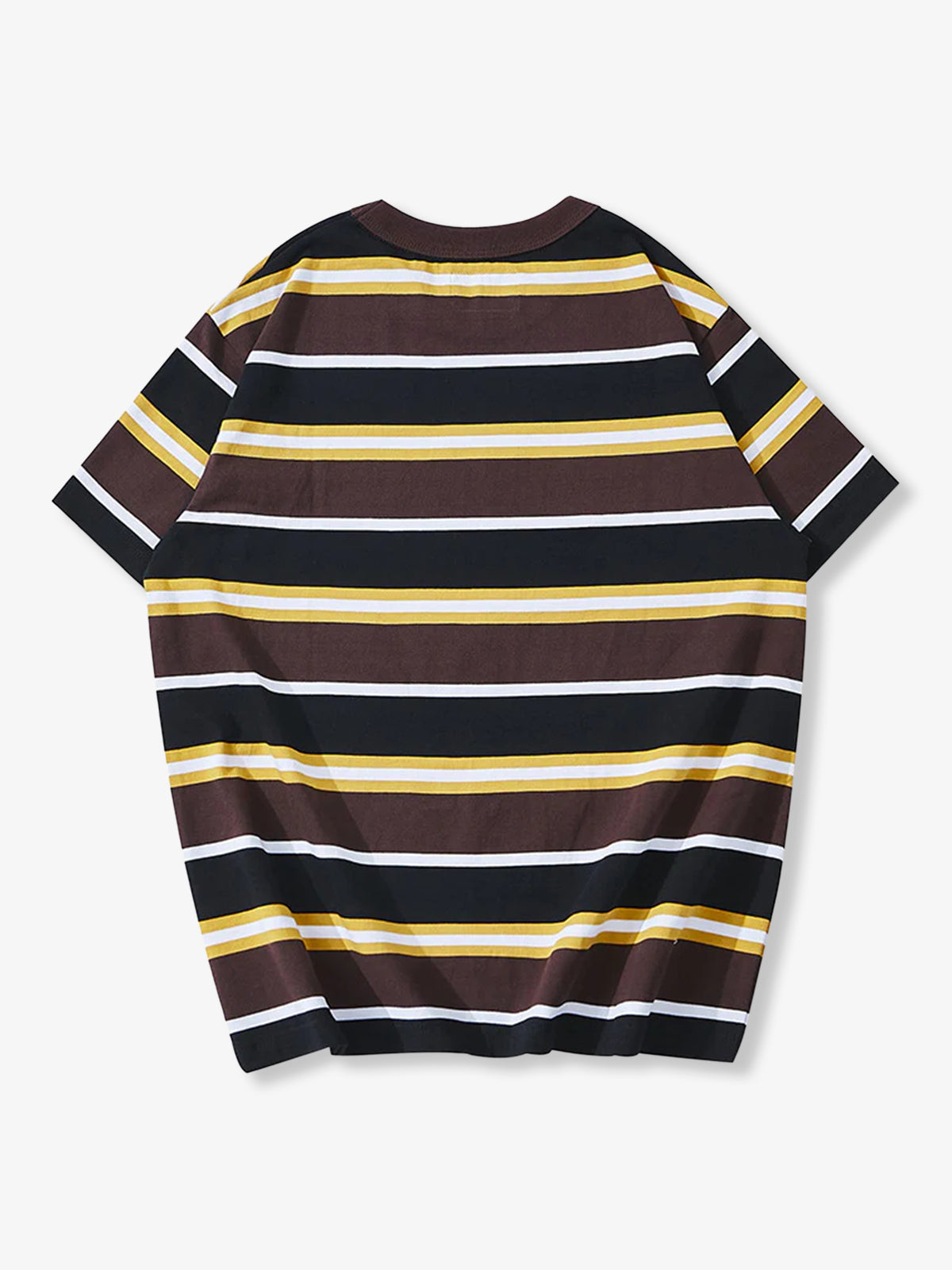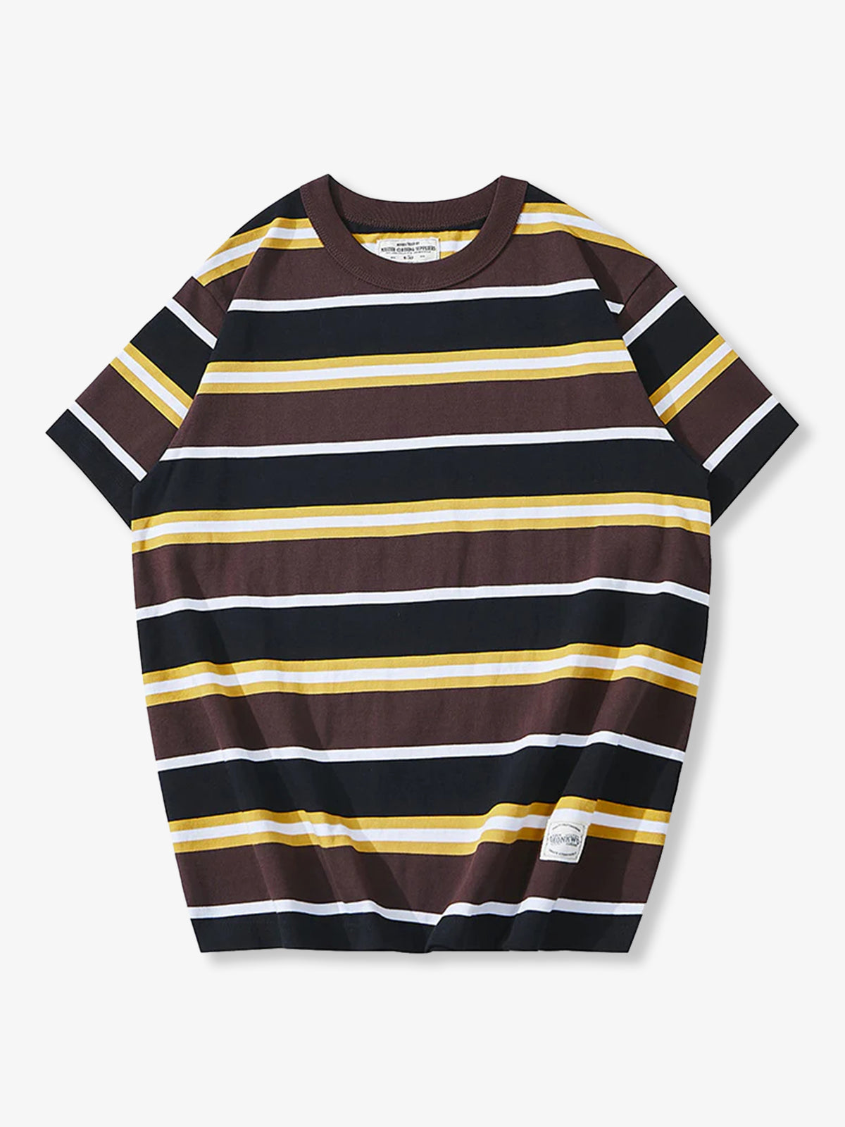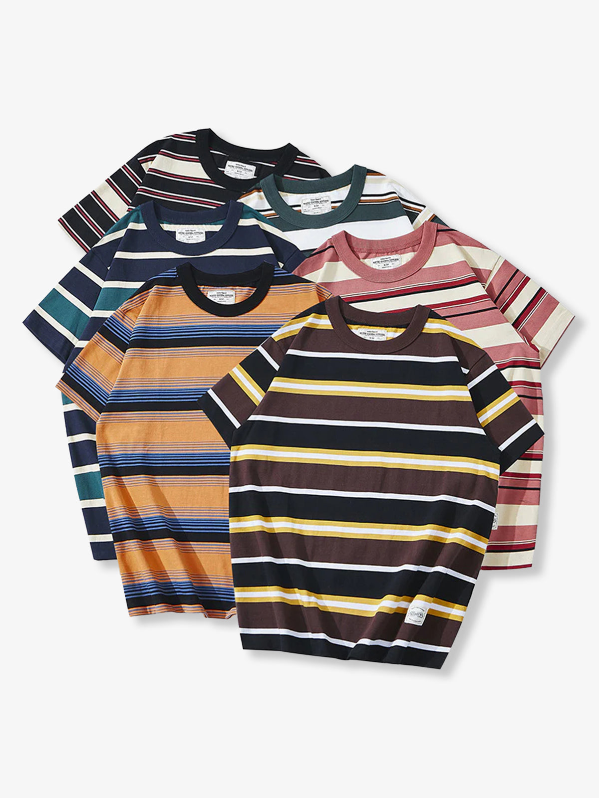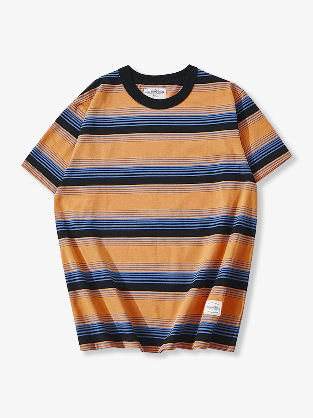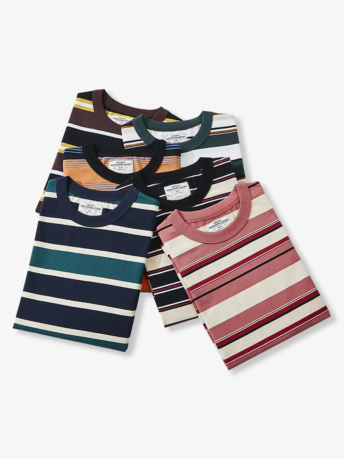 A summer-ready update to our popular border long sleeve tee. This short sleeve version features a clean crewneck and minimal design that highlights the bold stripe pattern. The stripes vary in thickness for added depth, with carefully dyed multicolor combinations that reflect the vibrant energy of spring and summer. Ribbing around the neck is color-matched to the body, creating a refined finish. The regular fit silhouette works well both as a standalone piece and layered.