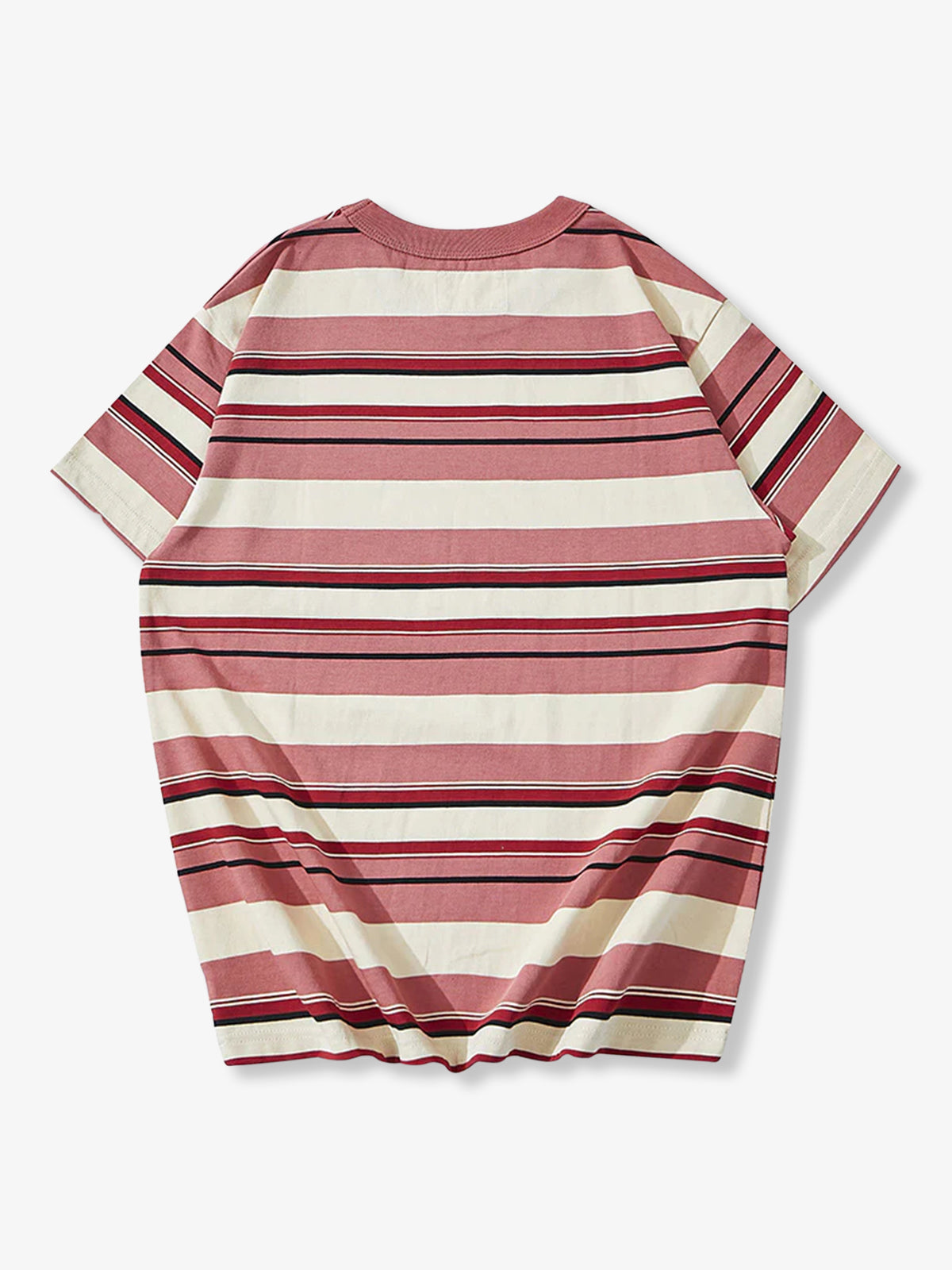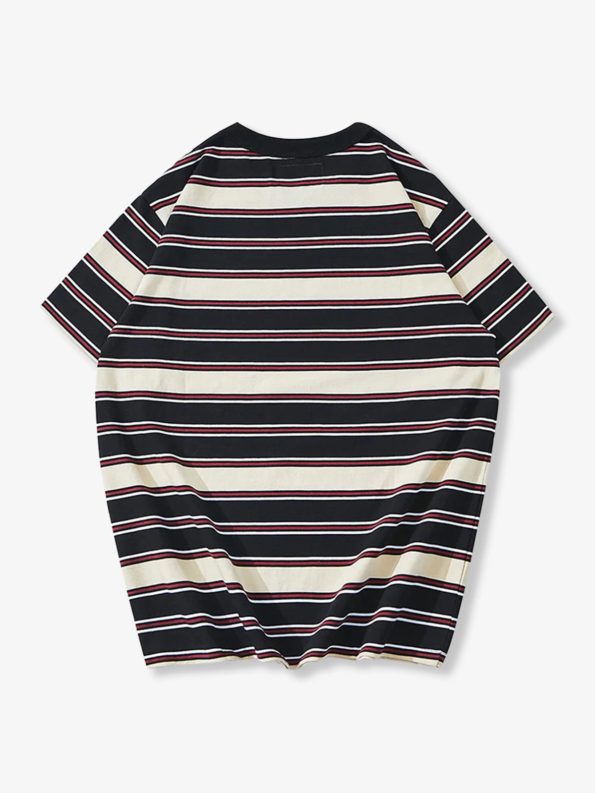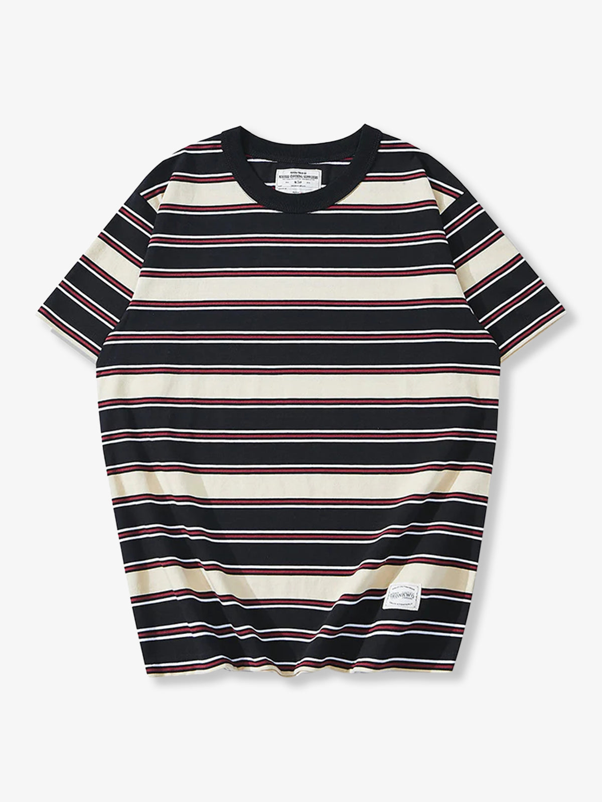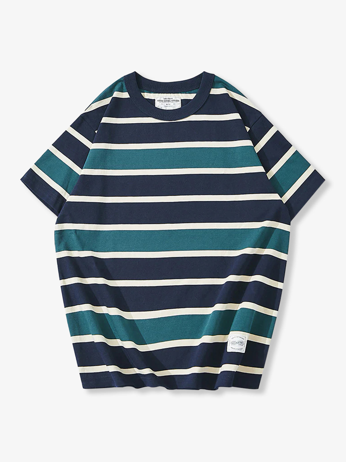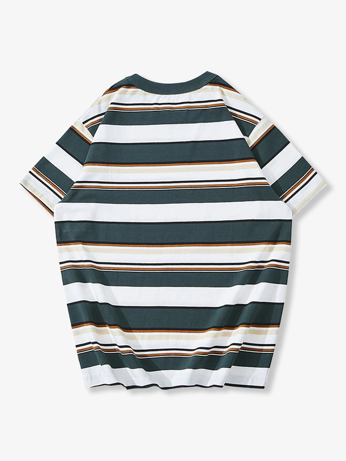 A summer-ready update to our popular border long sleeve tee. This short sleeve version features a clean crewneck and minimal design that highlights the bold stripe pattern. The stripes vary in thickness for added depth, with carefully dyed multicolor combinations that reflect the vibrant energy of spring and summer. Ribbing around the neck is color-matched to the body, creating a refined finish. The regular fit silhouette works well both as a standalone piece and layered.