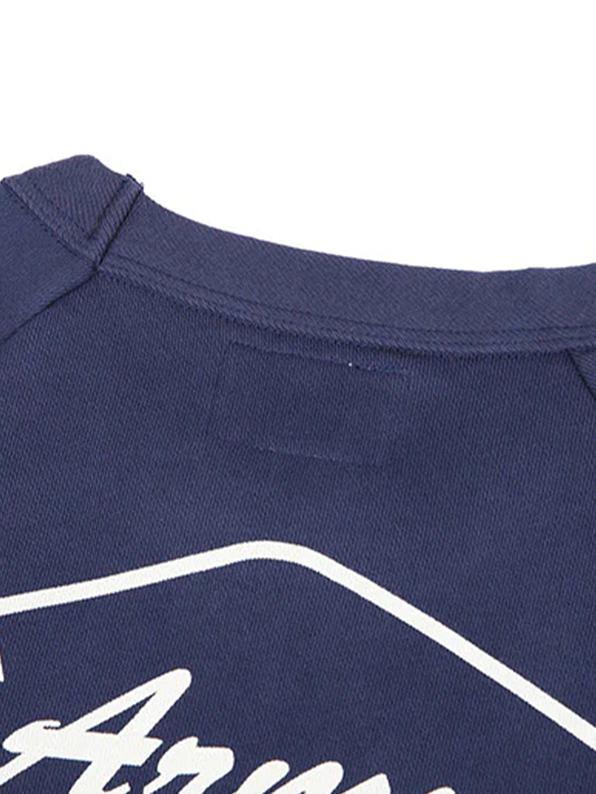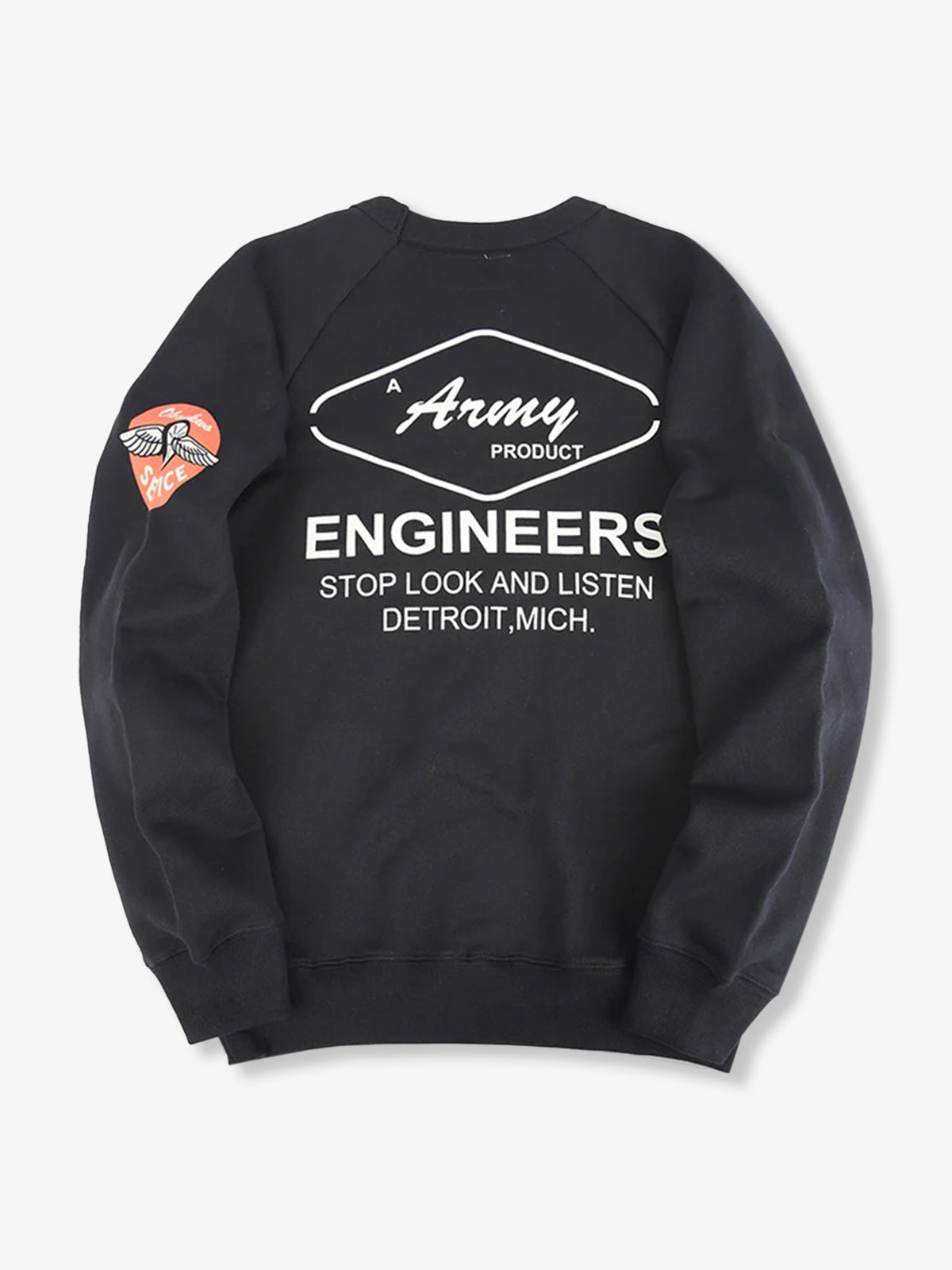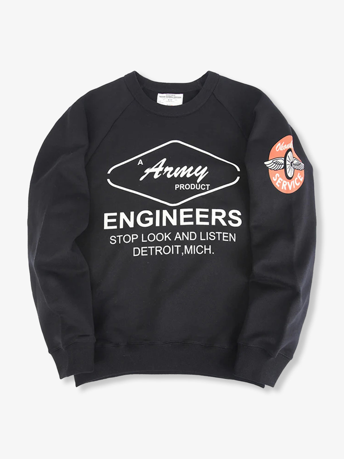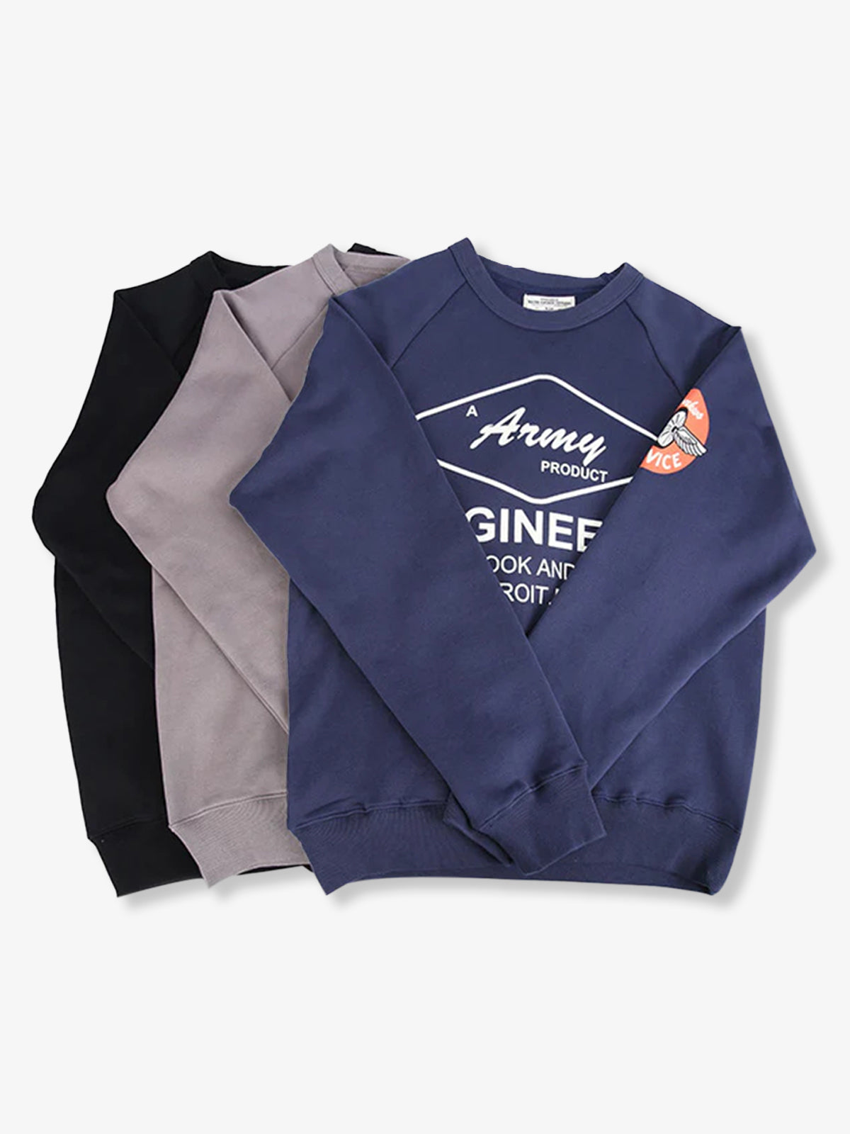 A soft and warm sweatshirt crafted from heavyweight 520g brushed cotton fleece. The smooth, flexible texture offers exceptional comfort and warmth, while the simple silhouette makes it easy to style for everyday wear. Features ribbed neckline, cuffs, and hem for a structured fit and sporty appeal. The dropped shoulder and raglan sleeve construction create a relaxed, easygoing look. A distinctive diagonal seam from neck to underarm enhances movement and adds visual interest. Military and biker-style graphics on the body give it a bold, masculine edge.