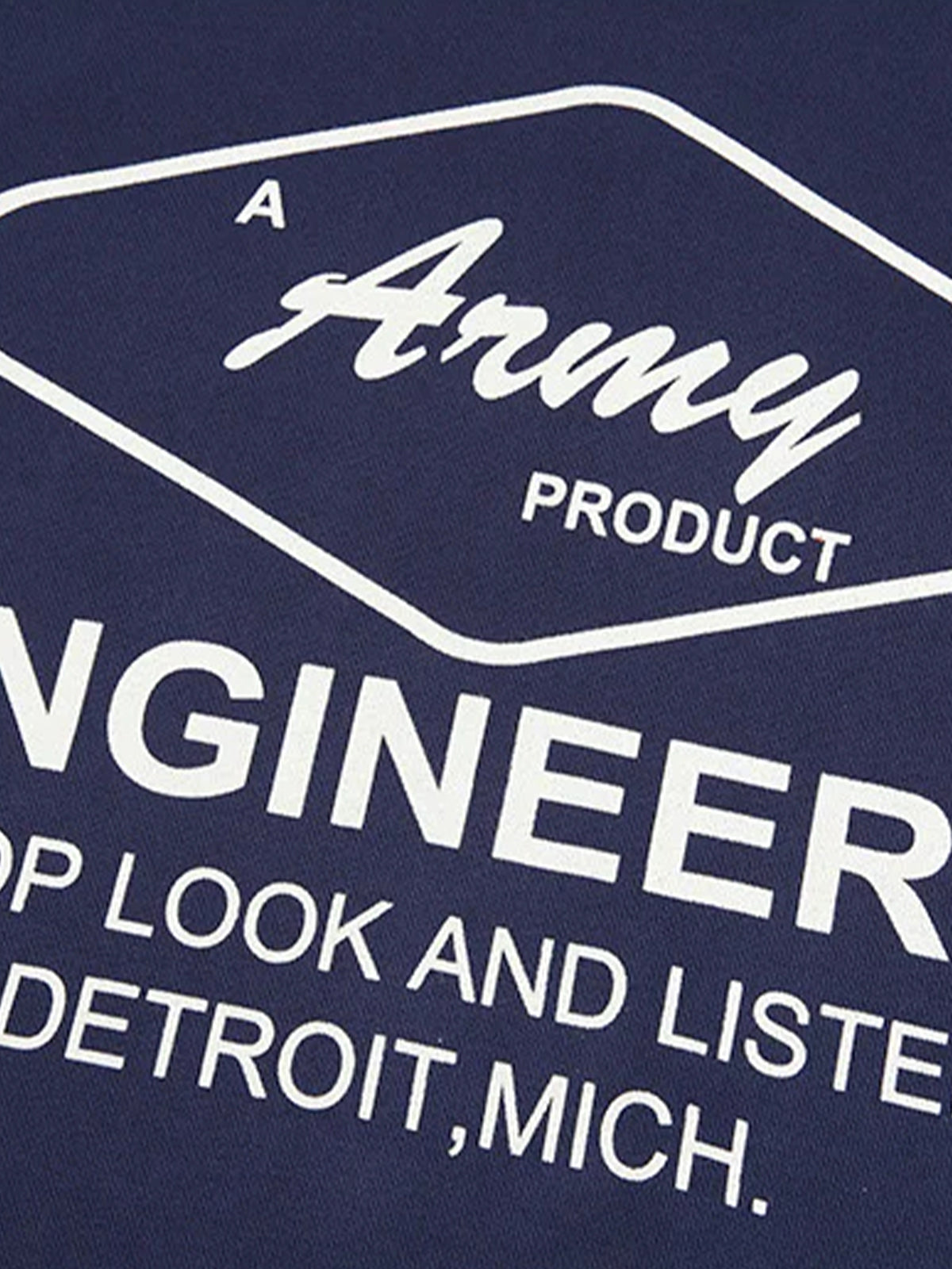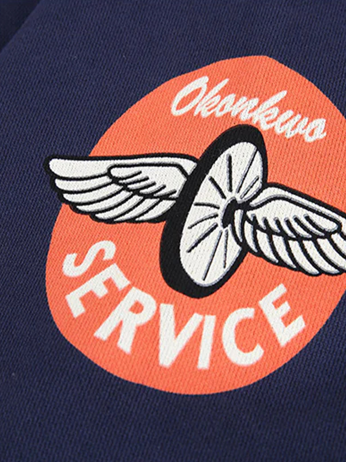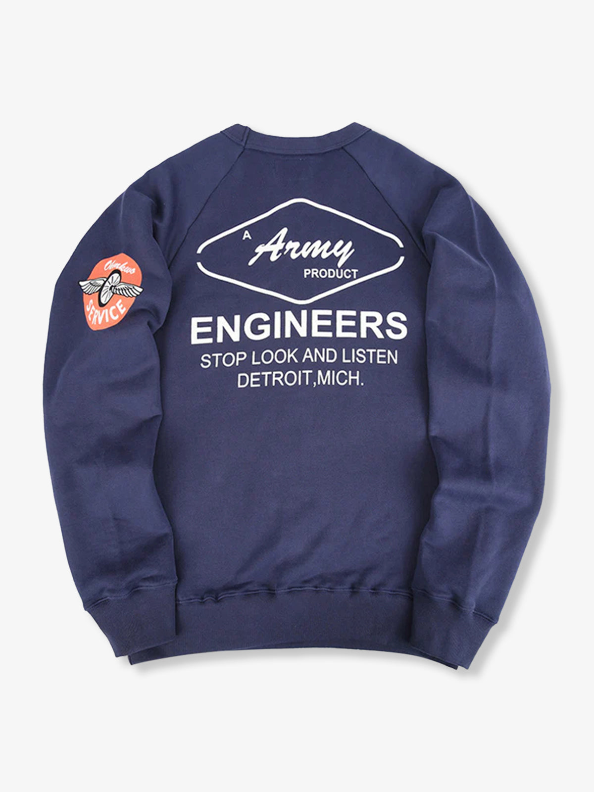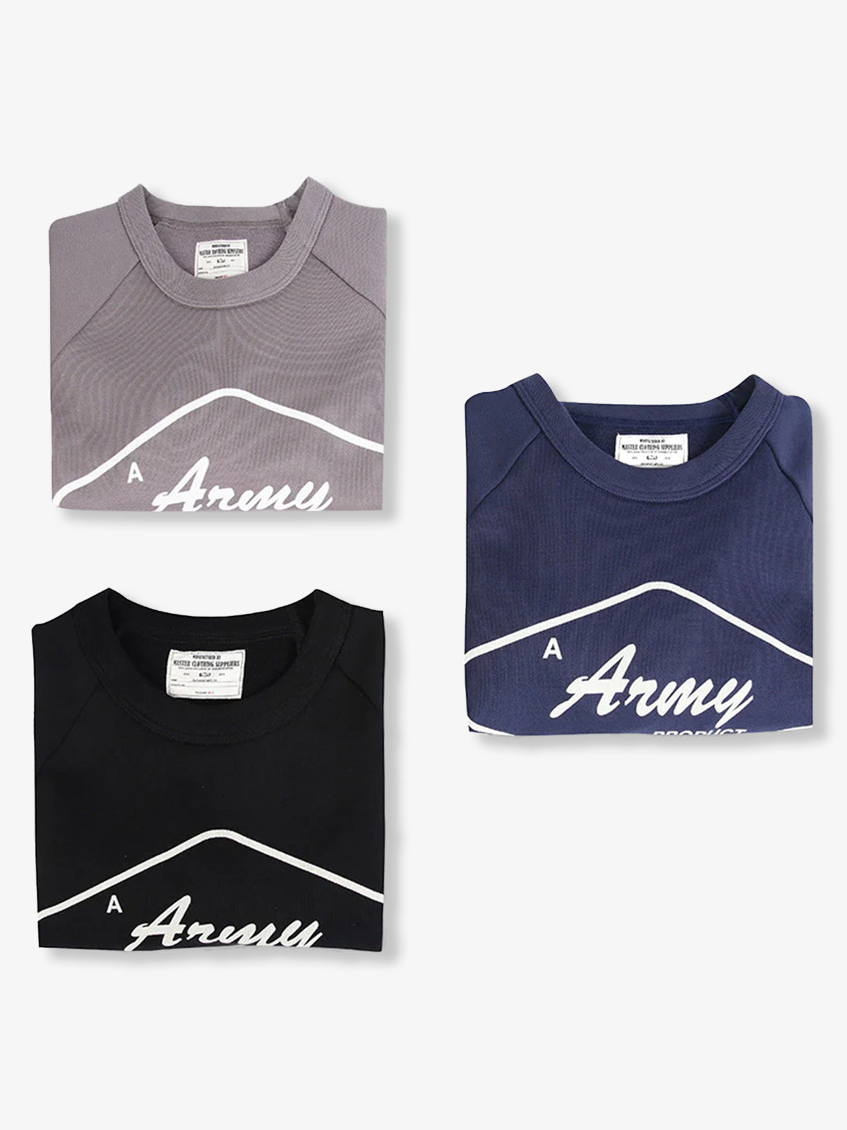 A soft and warm sweatshirt crafted from heavyweight 520g brushed cotton fleece. The smooth, flexible texture offers exceptional comfort and warmth, while the simple silhouette makes it easy to style for everyday wear. Features ribbed neckline, cuffs, and hem for a structured fit and sporty appeal. The dropped shoulder and raglan sleeve construction create a relaxed, easygoing look. A distinctive diagonal seam from neck to underarm enhances movement and adds visual interest. Military and biker-style graphics on the body give it a bold, masculine edge.