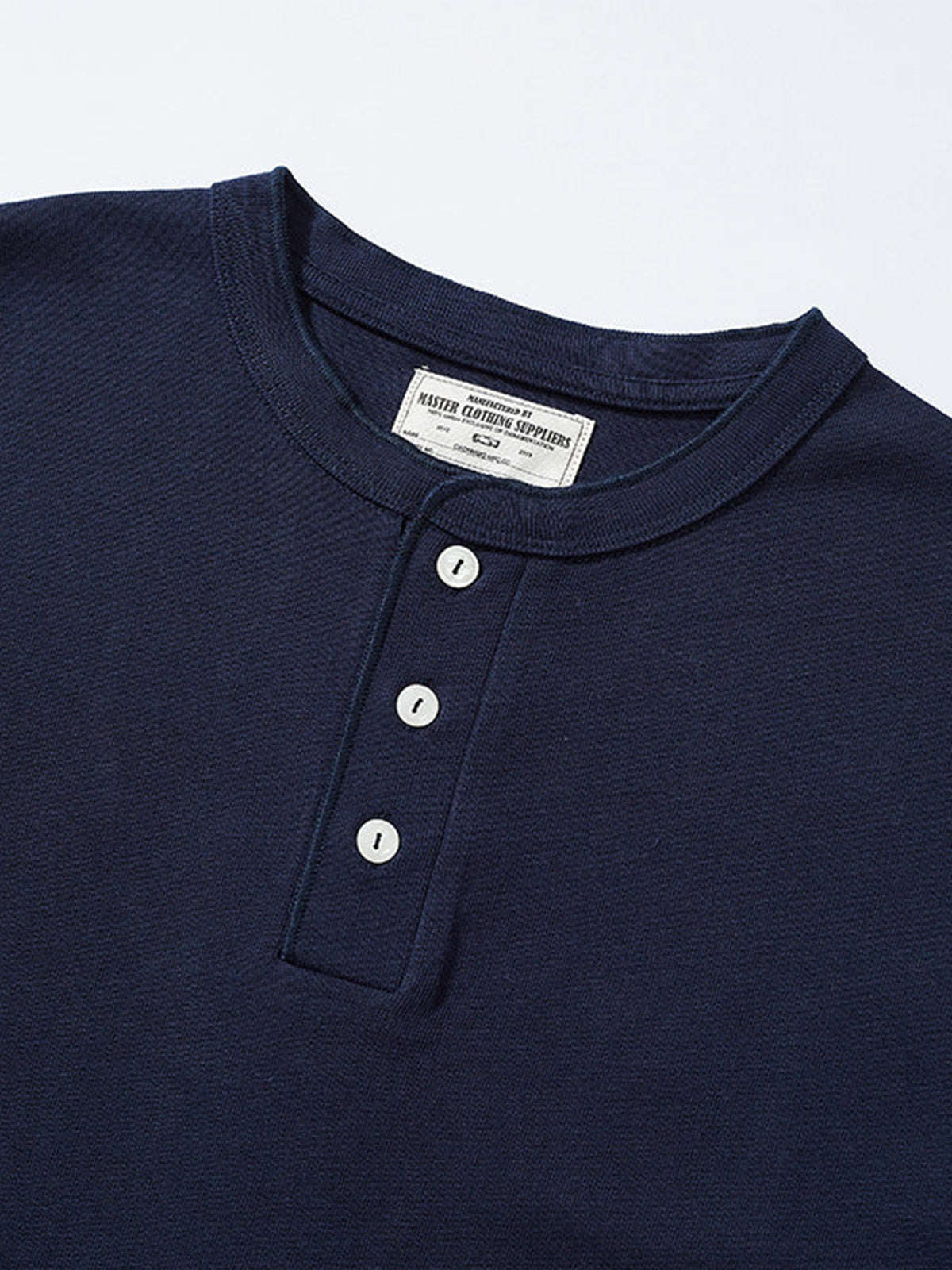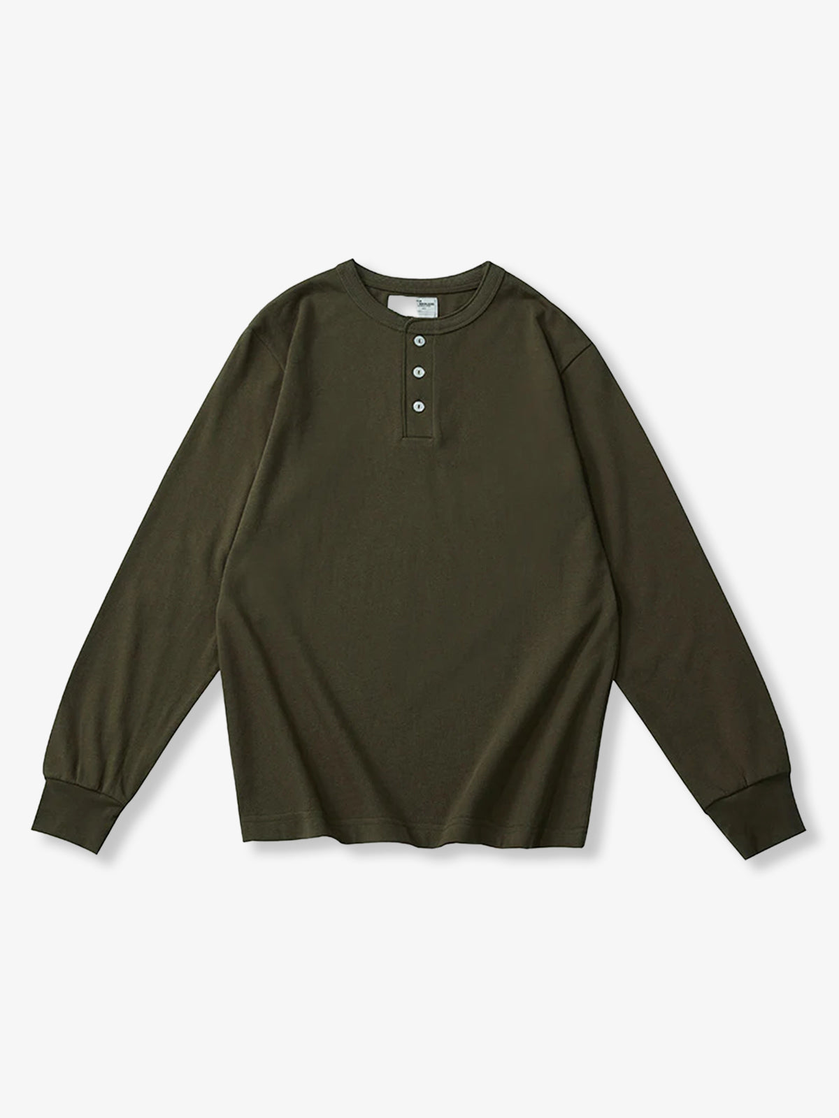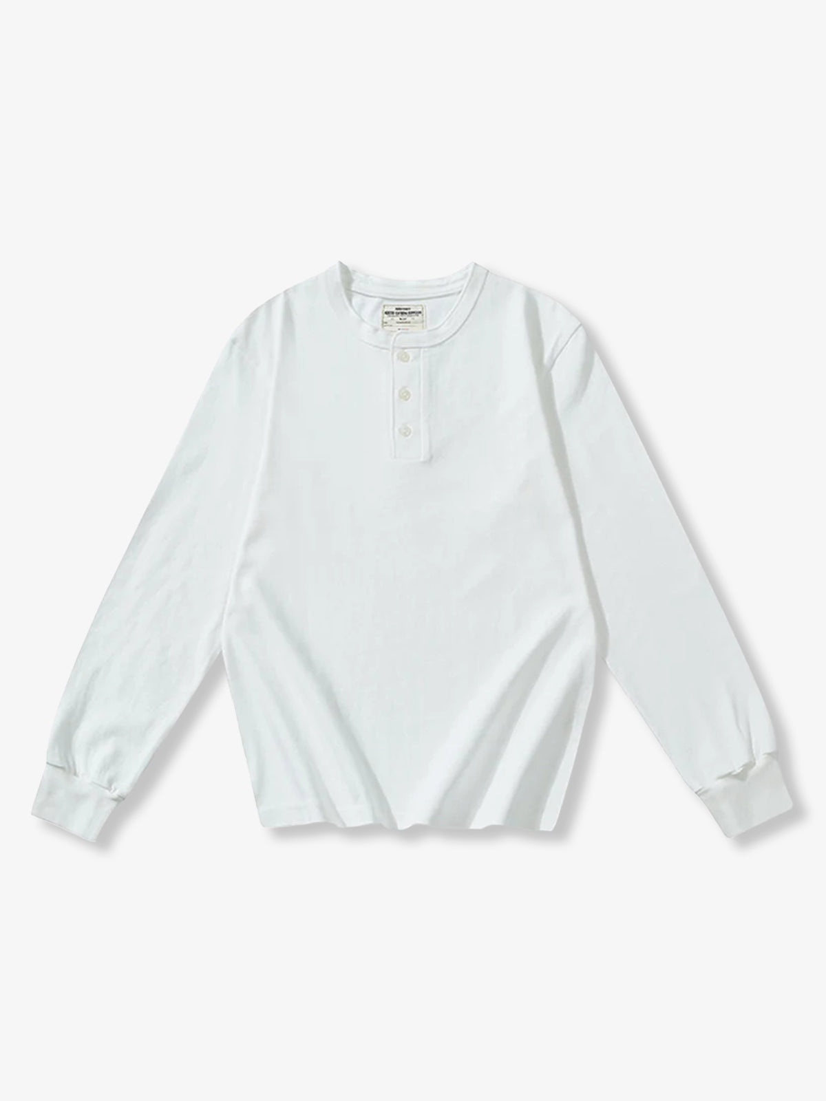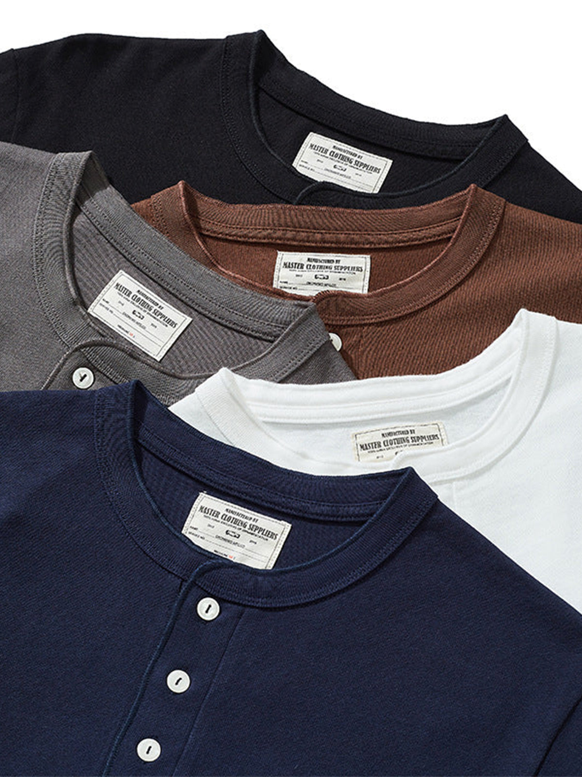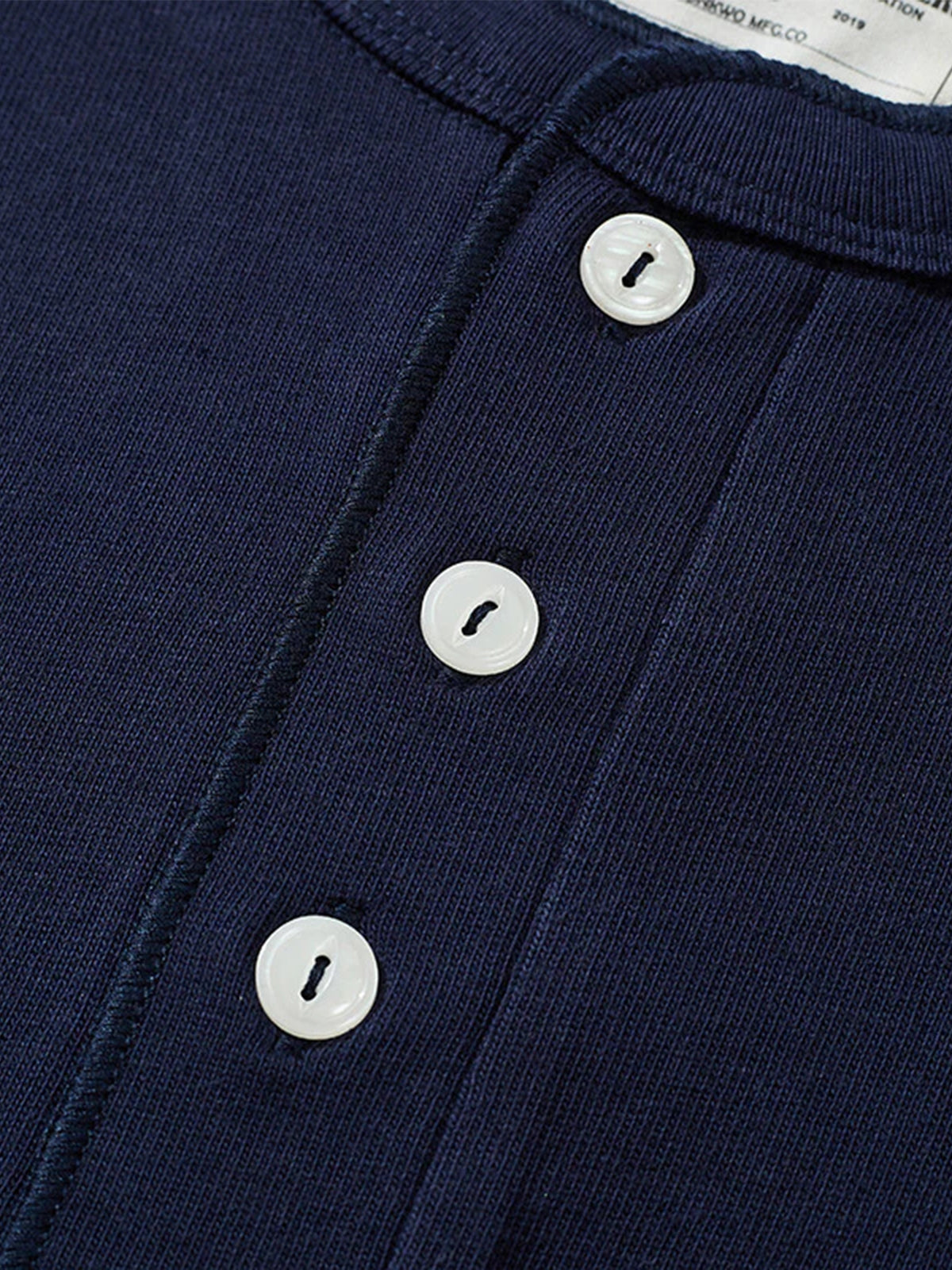 A Henley neck is based on a crew neck, with a placket and buttons at the neckline. Its origin is said to come from the uniforms worn at the historic British boat race, the Henley Royal Regatta. Compared to a crew neck, it is not too casual, and compared to a shirt, it is not too formal — this well-balanced relaxed look is the biggest appeal of this item.