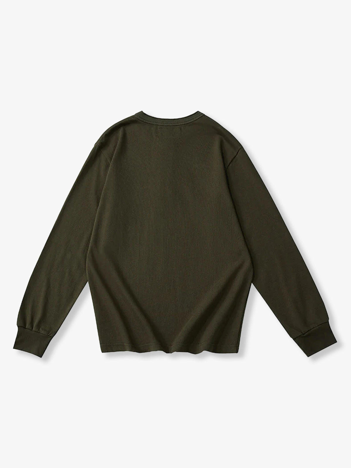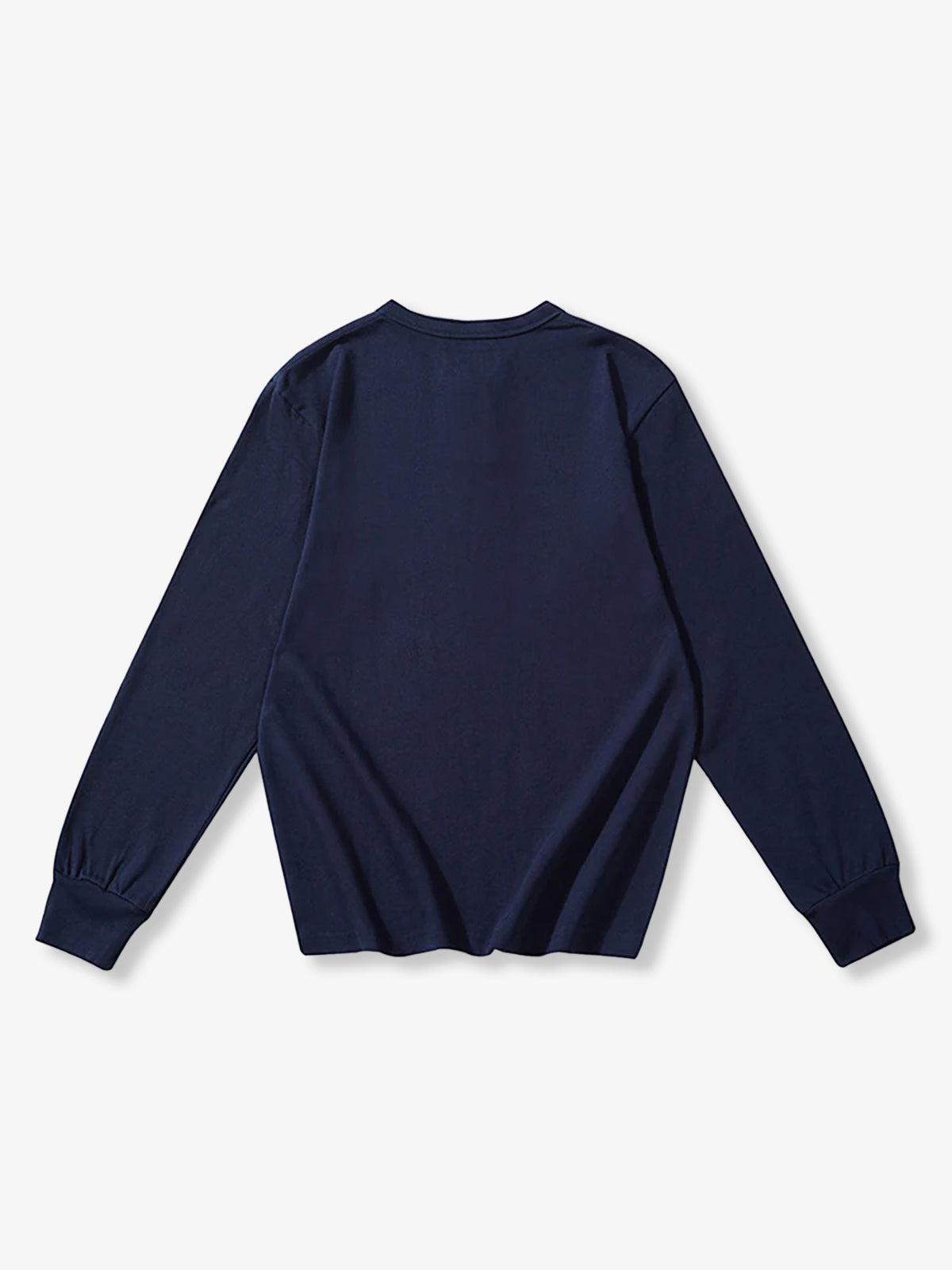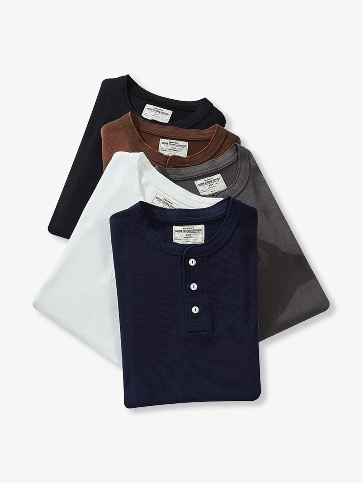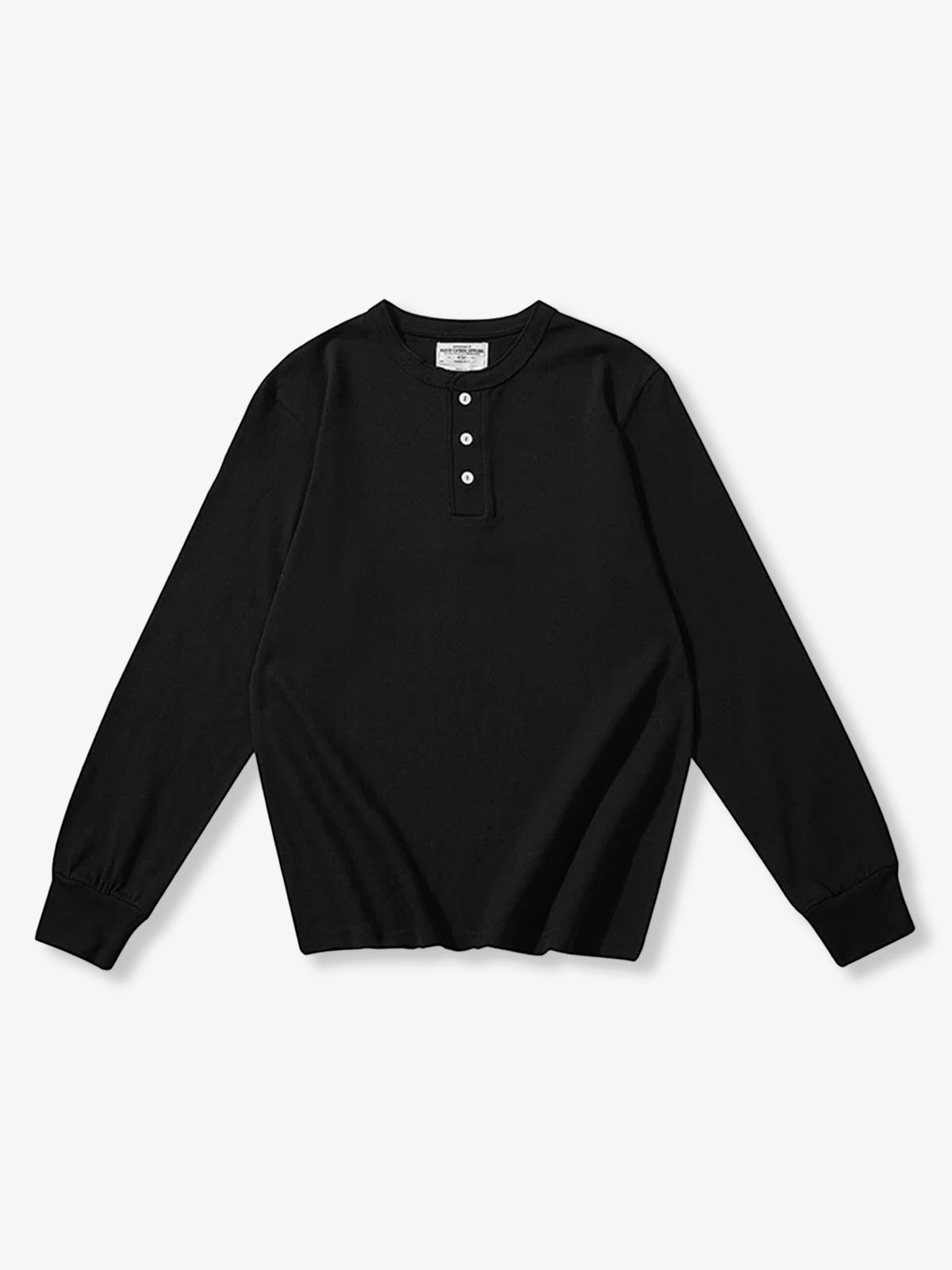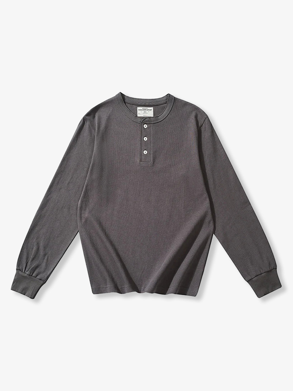 A Henley neck is based on a crew neck, with a placket and buttons at the neckline. Its origin is said to come from the uniforms worn at the historic British boat race, the Henley Royal Regatta. Compared to a crew neck, it is not too casual, and compared to a shirt, it is not too formal — this well-balanced relaxed look is the biggest appeal of this item.