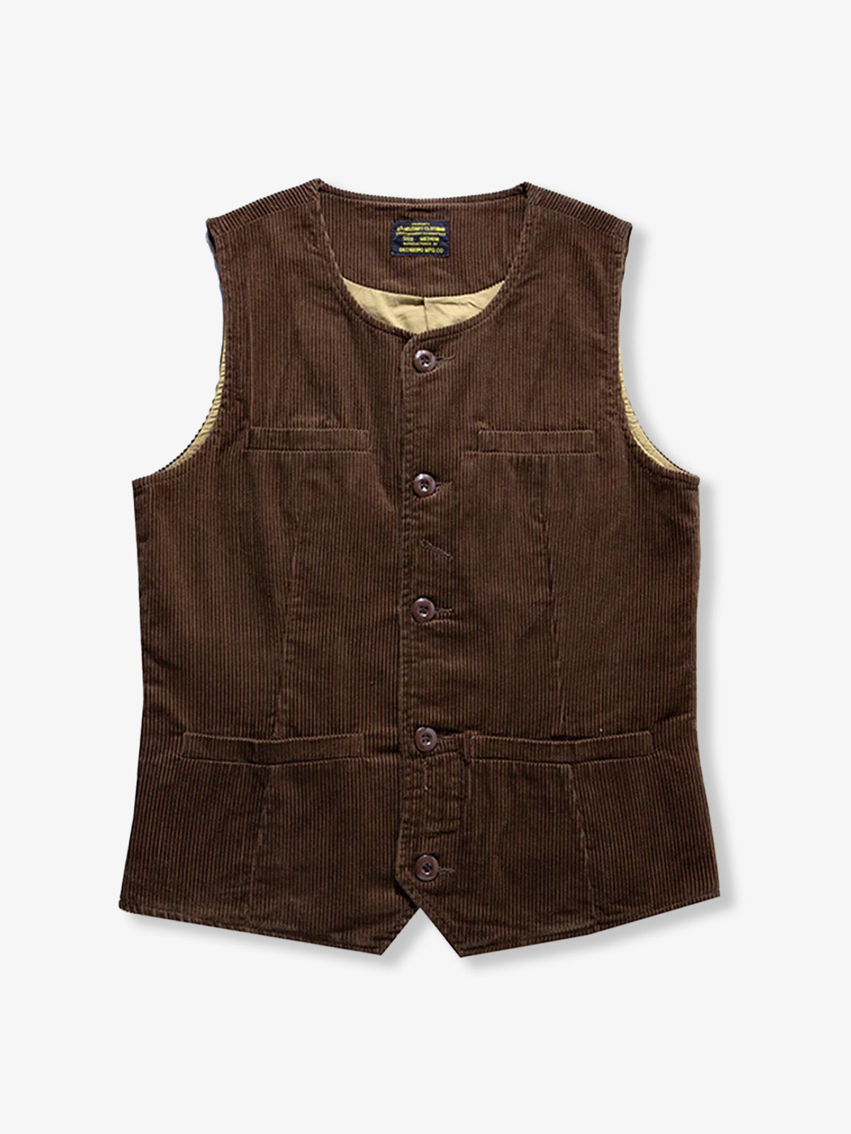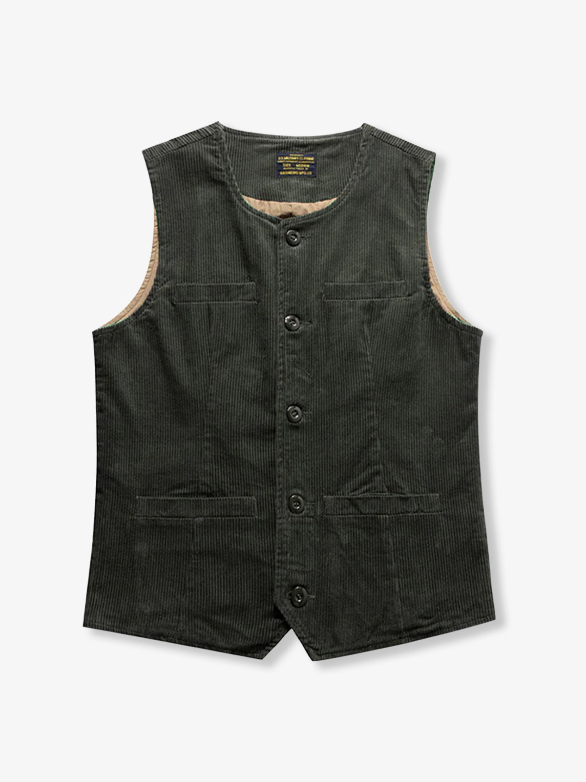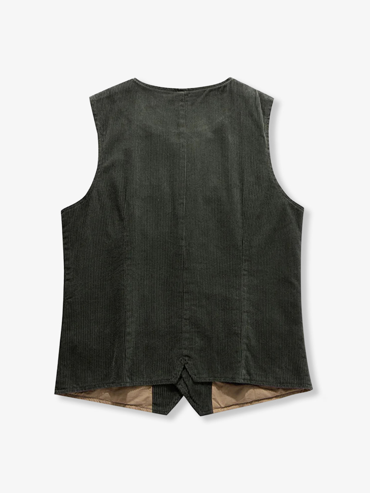 This vest revives the early 1960s silhouette with subtle adjustments to the neckline and shoulder line for a refined, vintage-inspired fit. Made from fine-wale corduroy, the fabric features tightly packed ridges that create a soft, velvety texture—reminiscent of velour. Over time, the material develops a worn-in patina with gentle fading and surface fuzz, enhancing its vintage charm. Designed for cooler seasons, its warmth and texture make it an ideal layering piece for fall and winter.