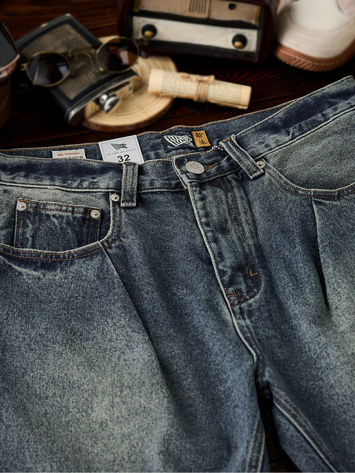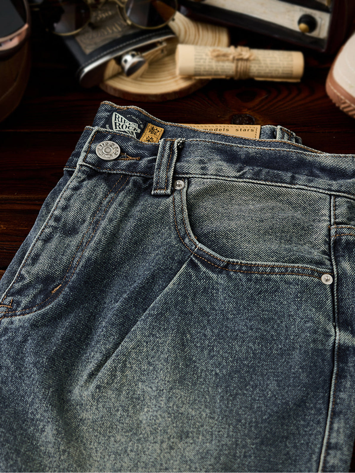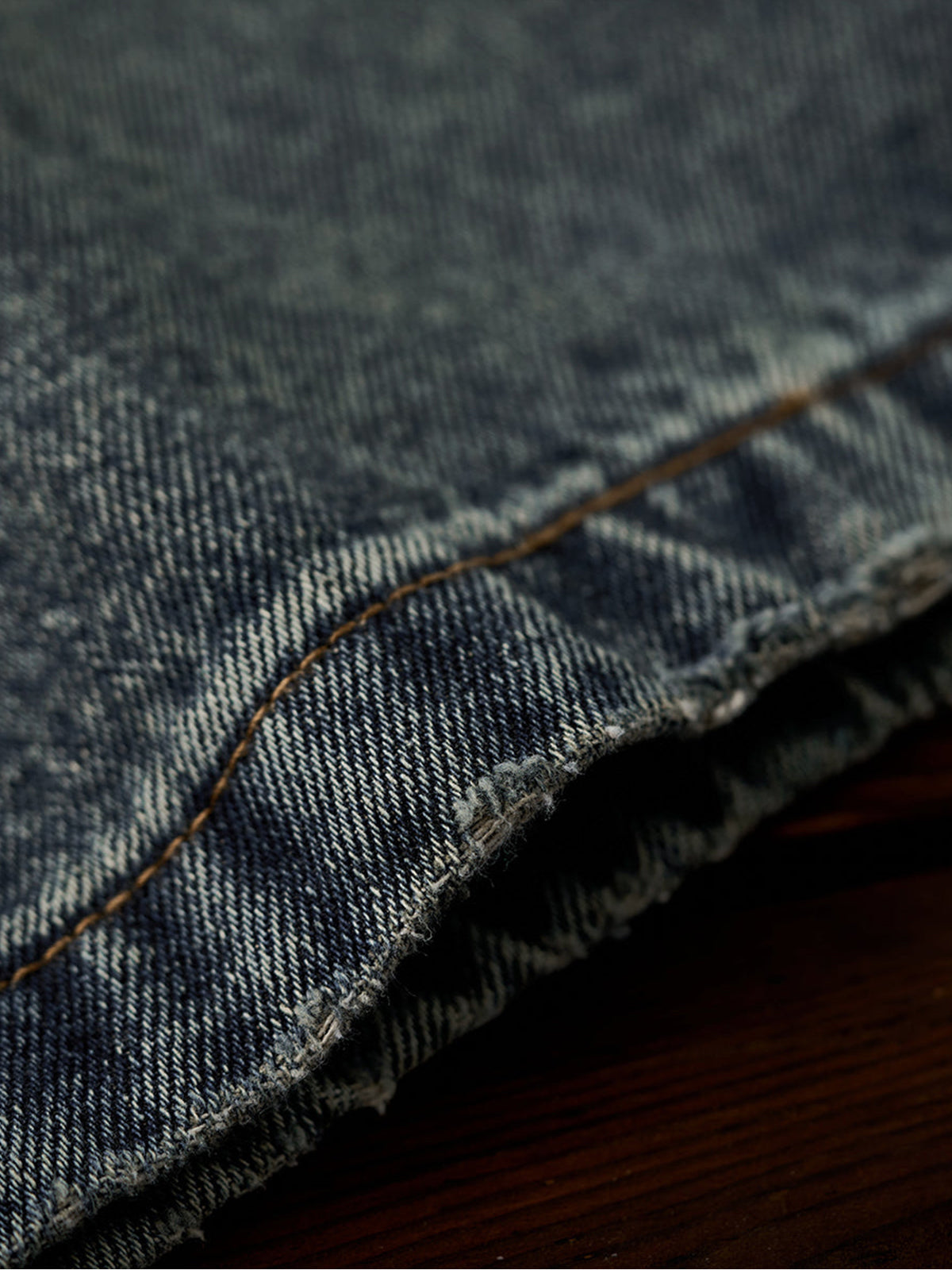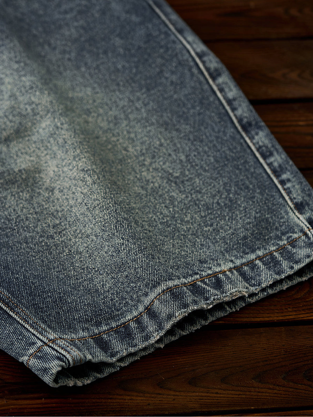The denim fabric is treated with a full stonewash process, using stones or abrasive agents to create a naturally faded surface and soft handfeel. The result is a vintage-inspired texture that feels broken-in from the start.Light distressing at the hem adds a casual, effortless look. The raw edge finish enhances its laid-back vibe.
