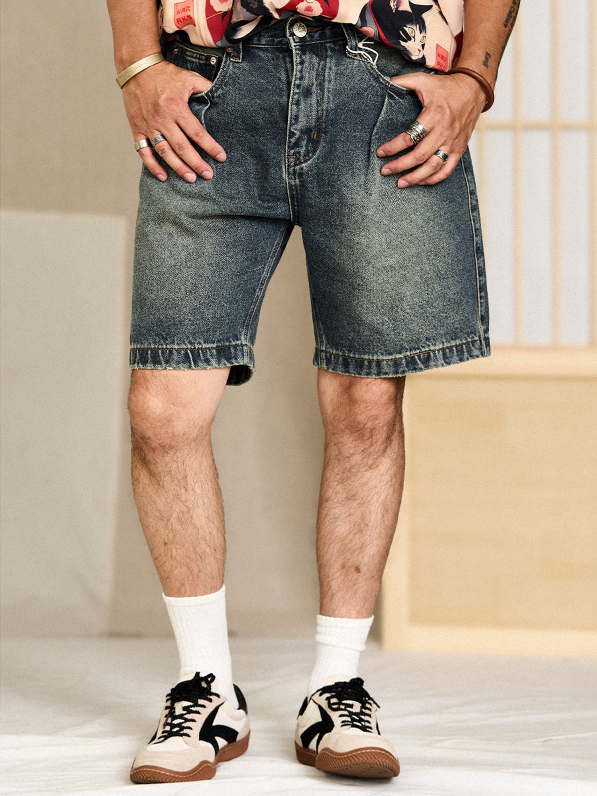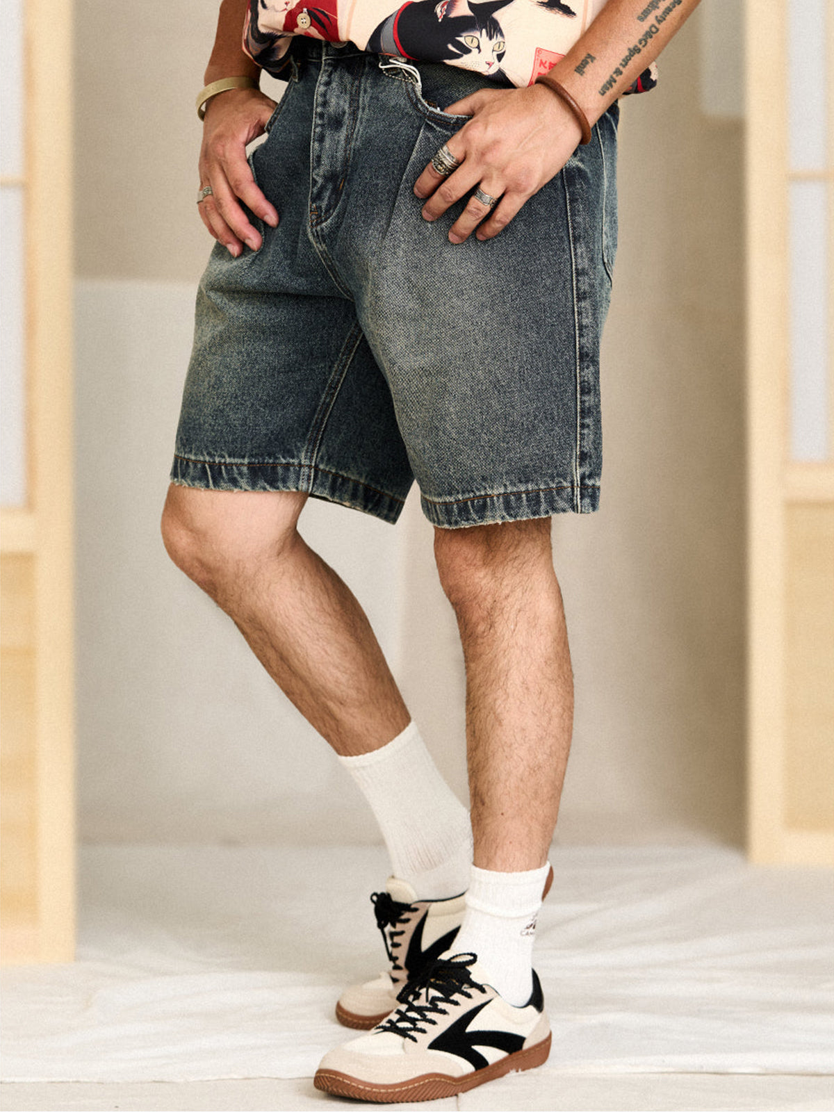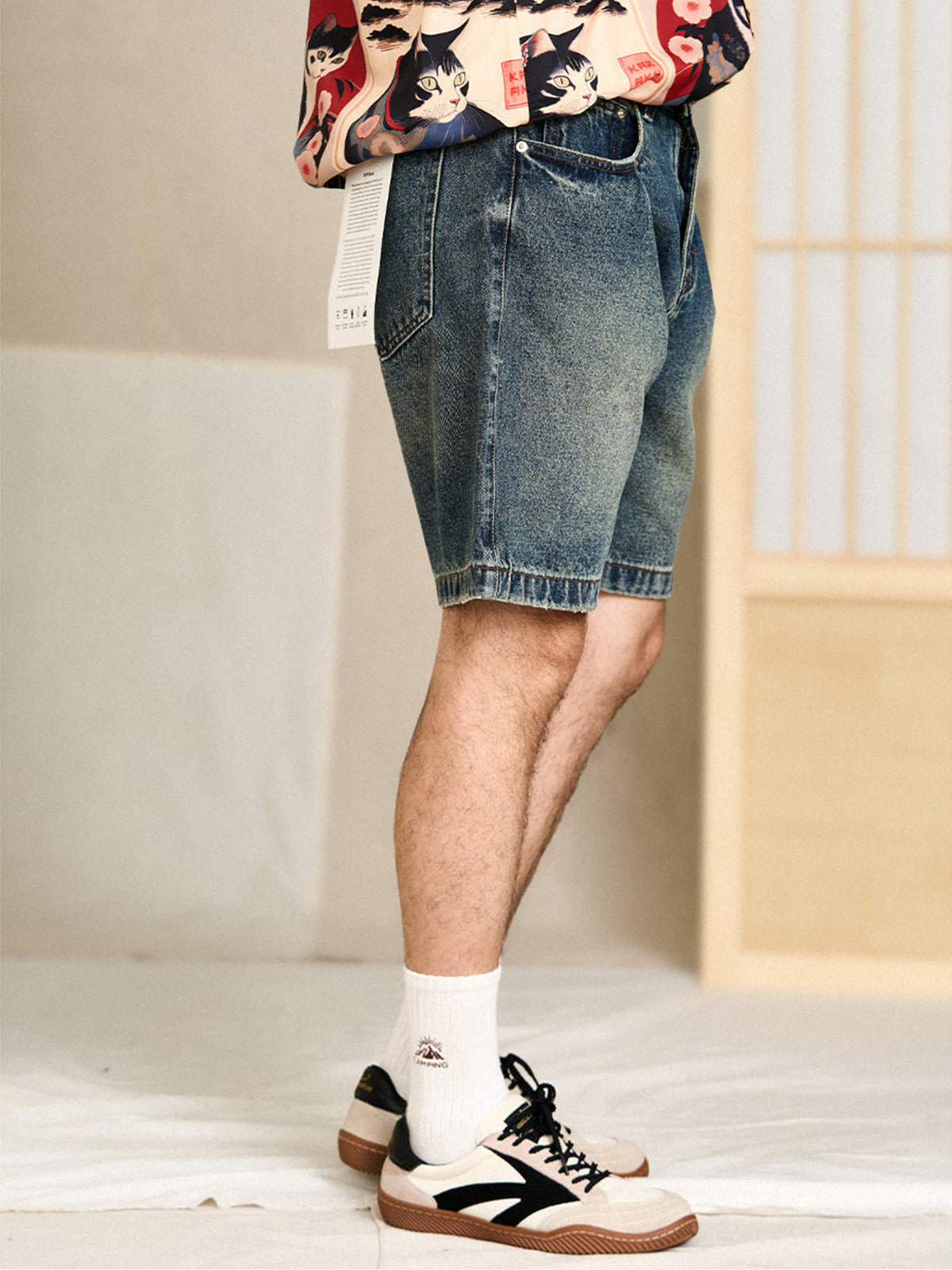 Designed with slightly deep front pockets for functionality, and minimalist square back pockets that blend seamlessly with the overall clean design. Durable, simple stitchwork enhances both strength and subtle detail.Cut just above the knees, the fit is straight and relaxed—not too slim, not too baggy—making it easy to wear for a wide range of body types.